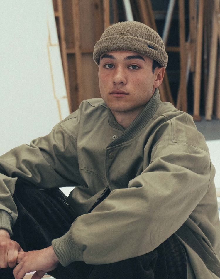 FLUKE UP POLO SS also uses moss stitch cotton, white trim on the collar, and arm openings with an embroidered whale’s tail fin motif logo. Only available in a navy body with white trim.
