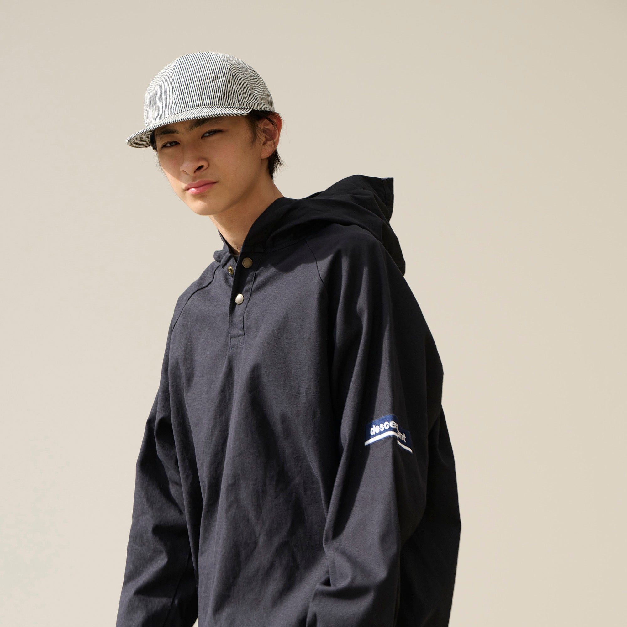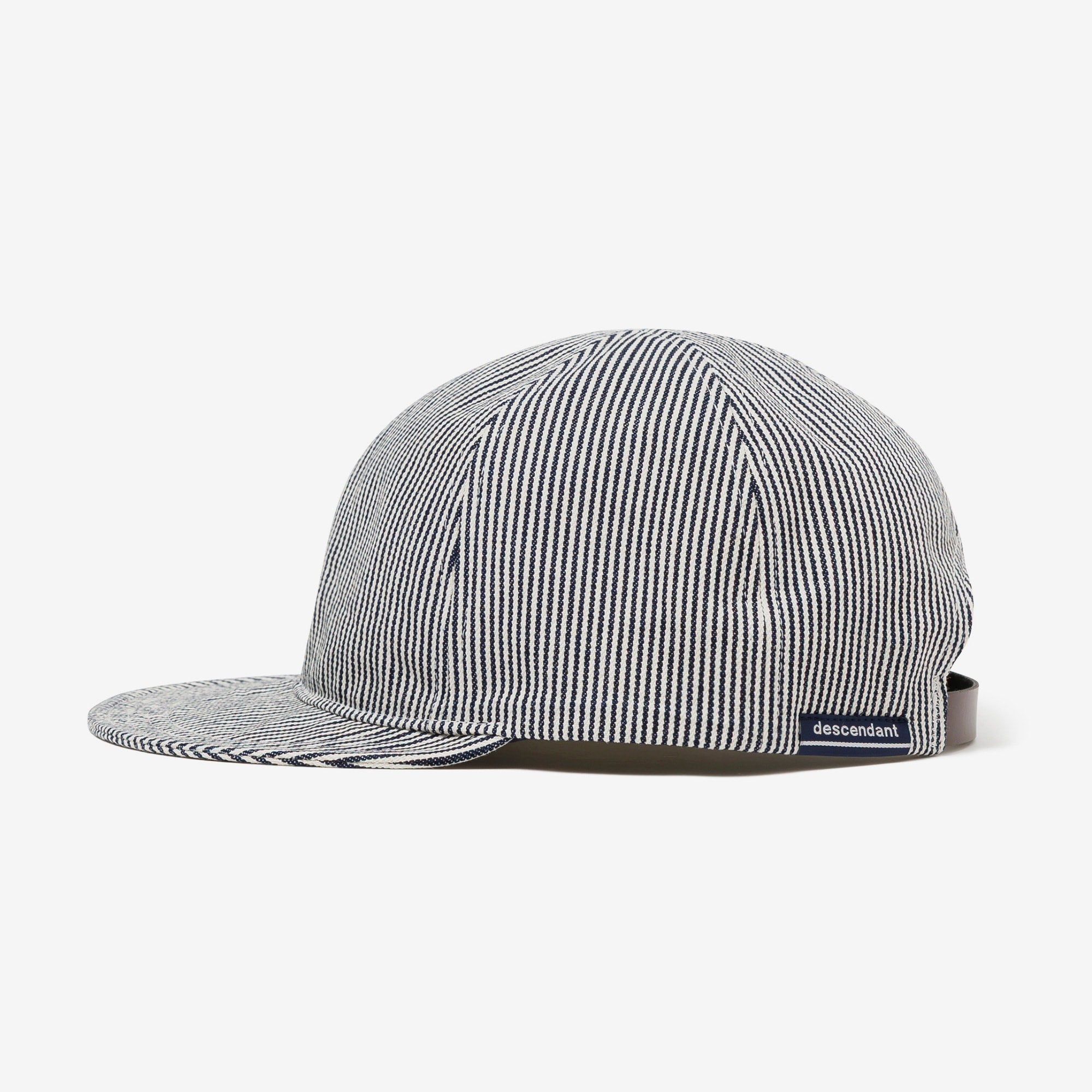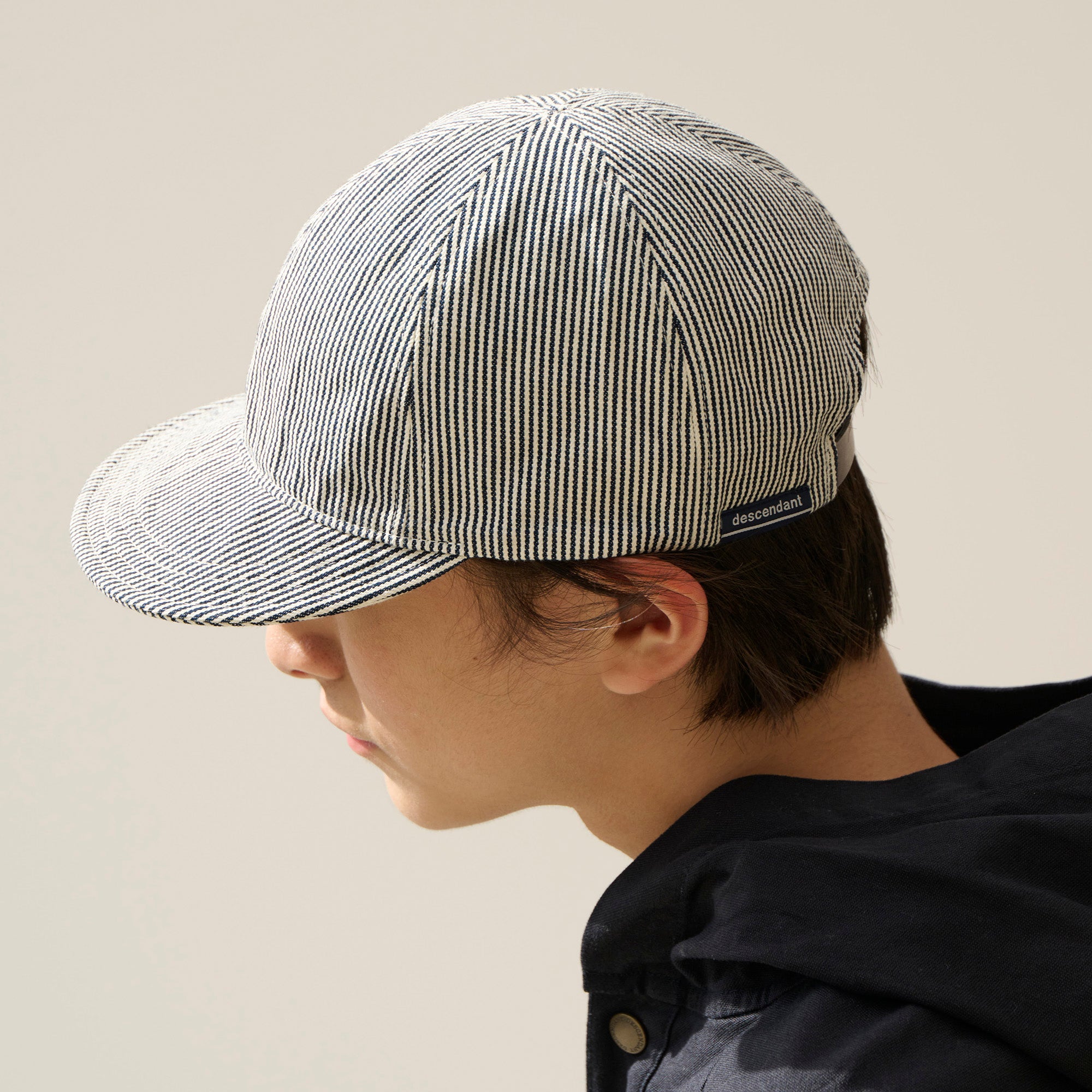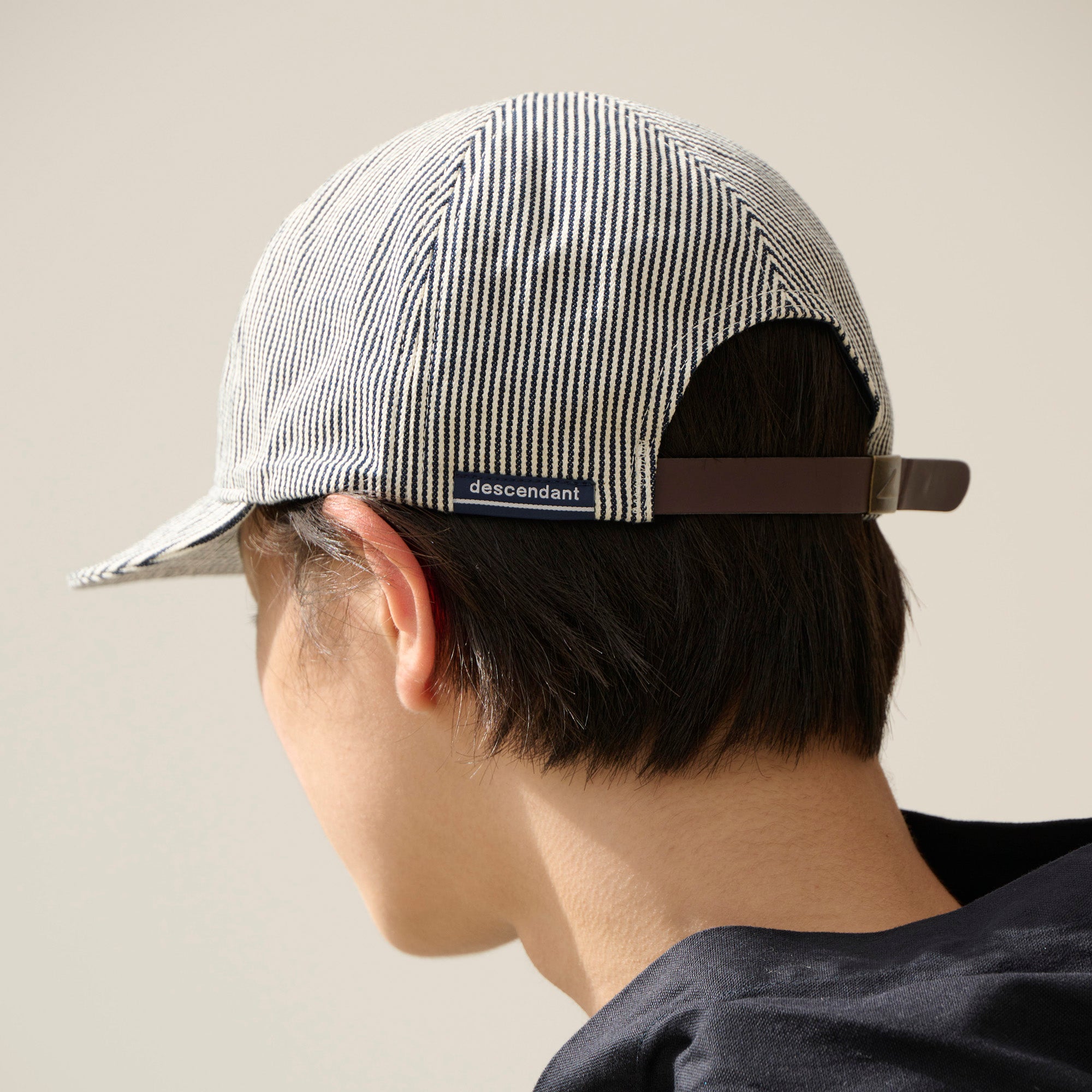 A collaboration between Post O’Alls and DESCENDANT. A retro-looking engineer cap made from cotton hickory stripe fabric. The Post O’Alls and HORIZON woven logo labels are placed on the side panels. A synthetic leather adjustable strap on the back.