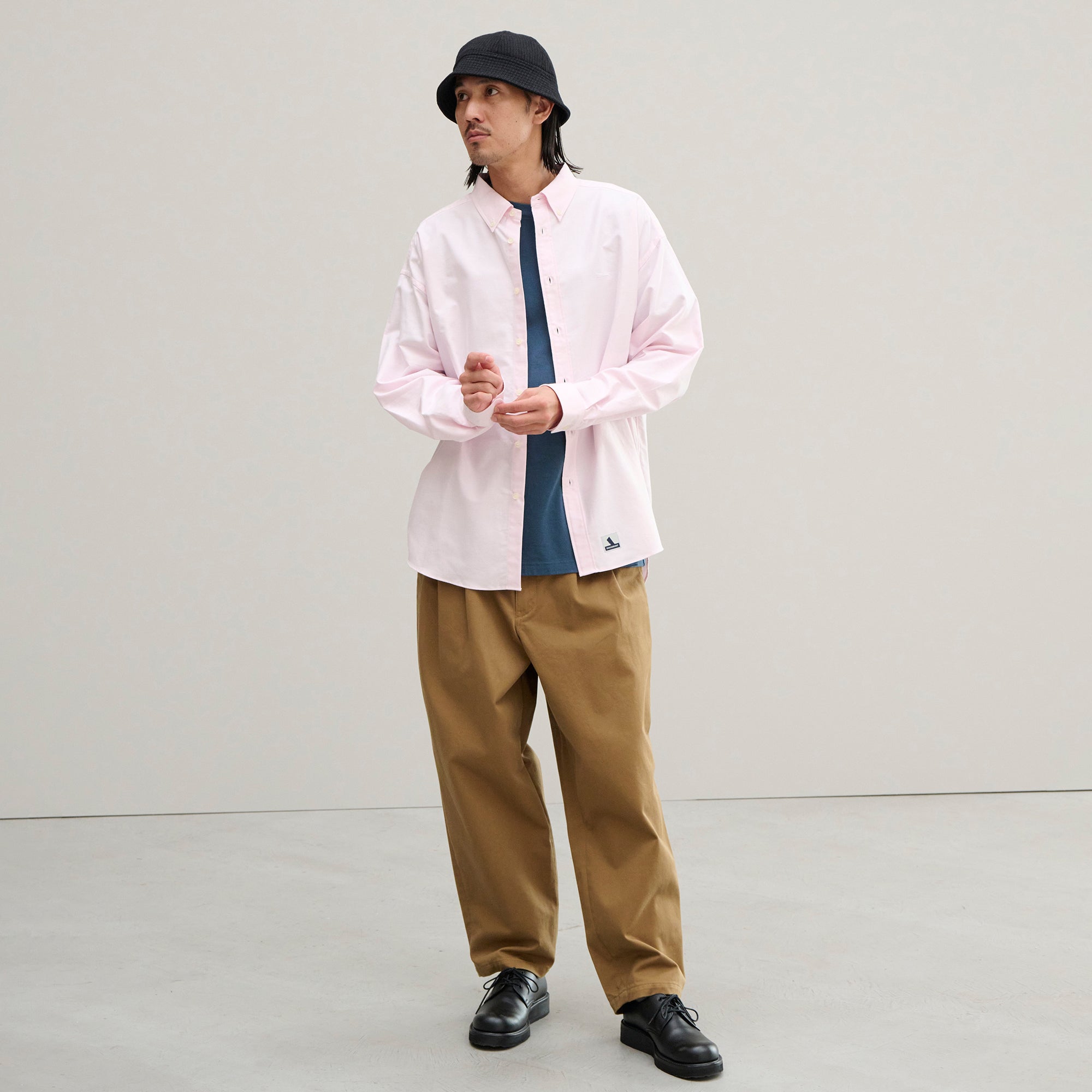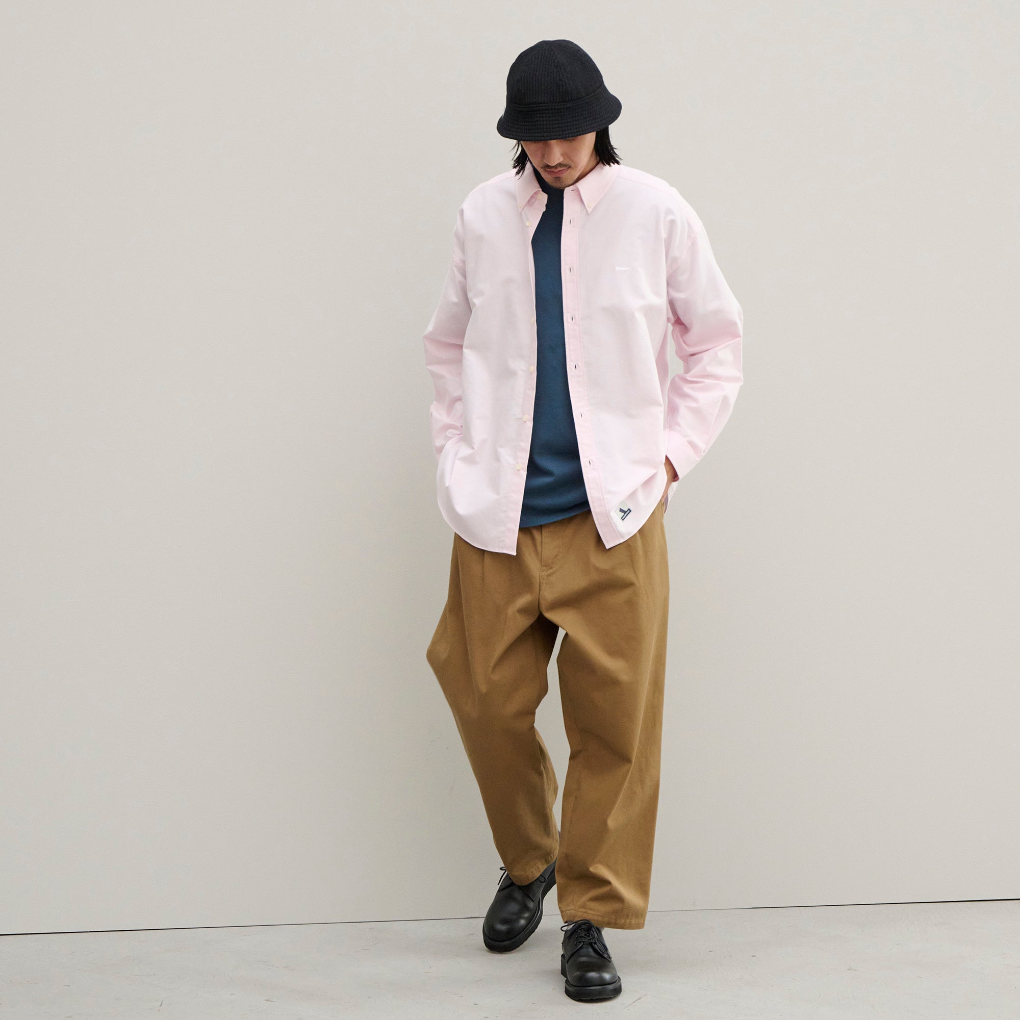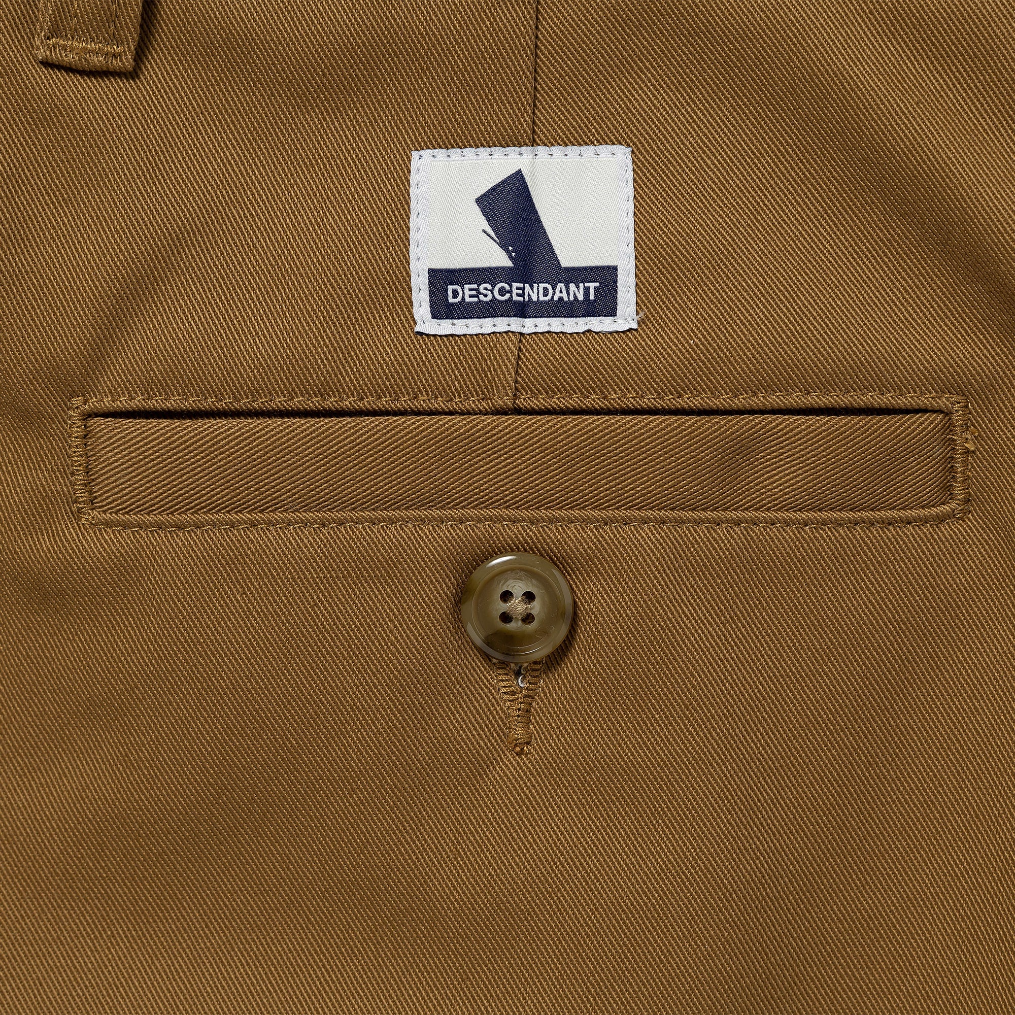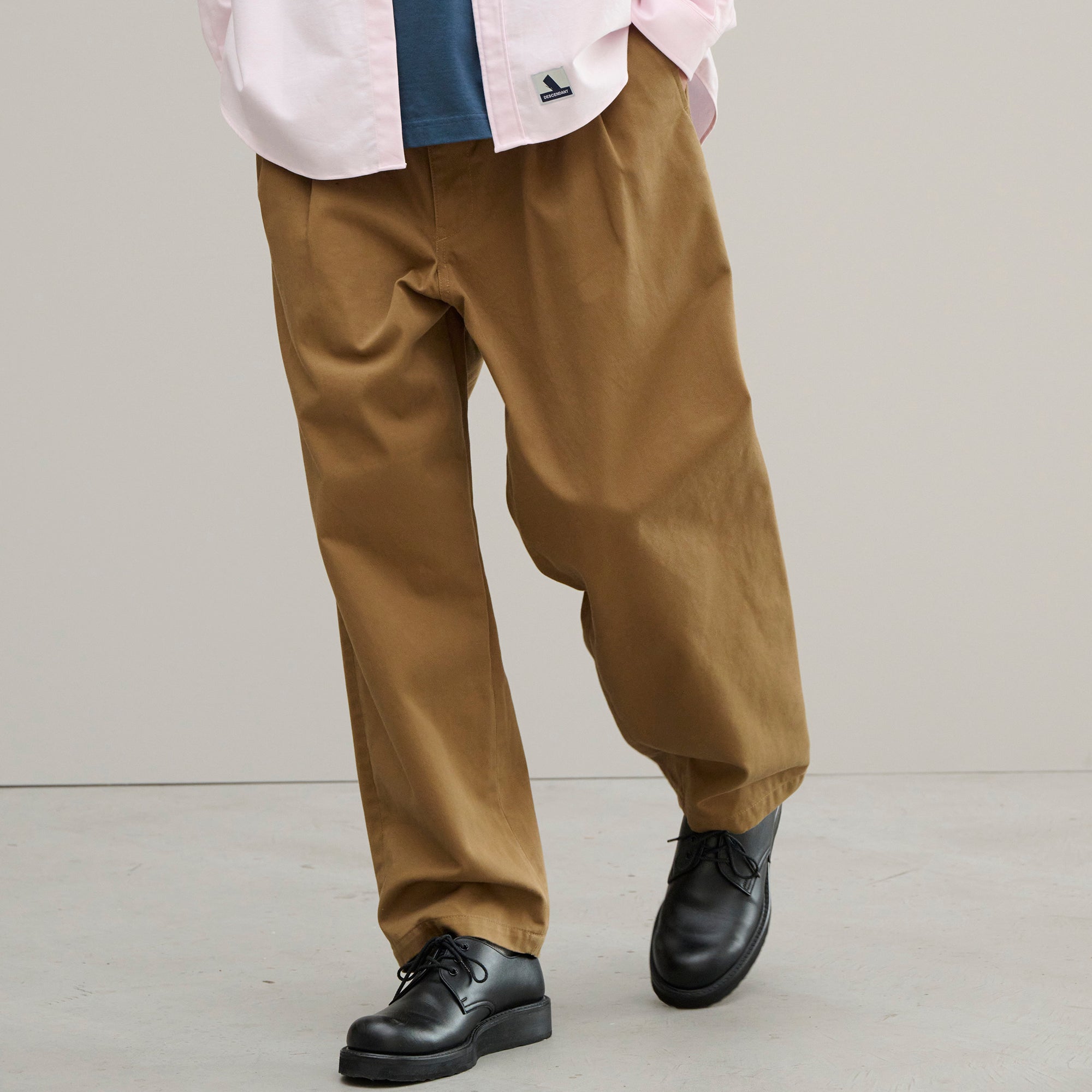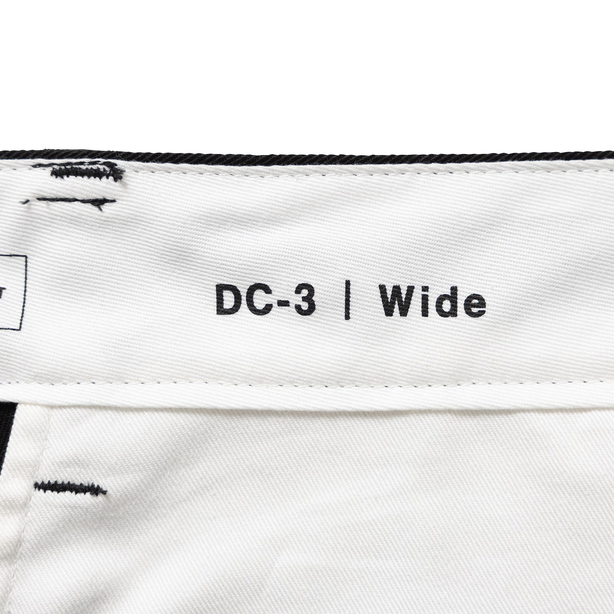 DC-3 twill trousers made from tightly woven organic cotton drill fabric. Two-tuck waist and a relaxed, tapered silhouette from waist to hem. Slanted side pockets, single-welt back pockets, and a Box logo patch on the back. “DC-3 | Wide” is printed on the inner waistband. The beige version exclusively includes a Khakee brand tab and a “Khakee” print on the inner waistband.