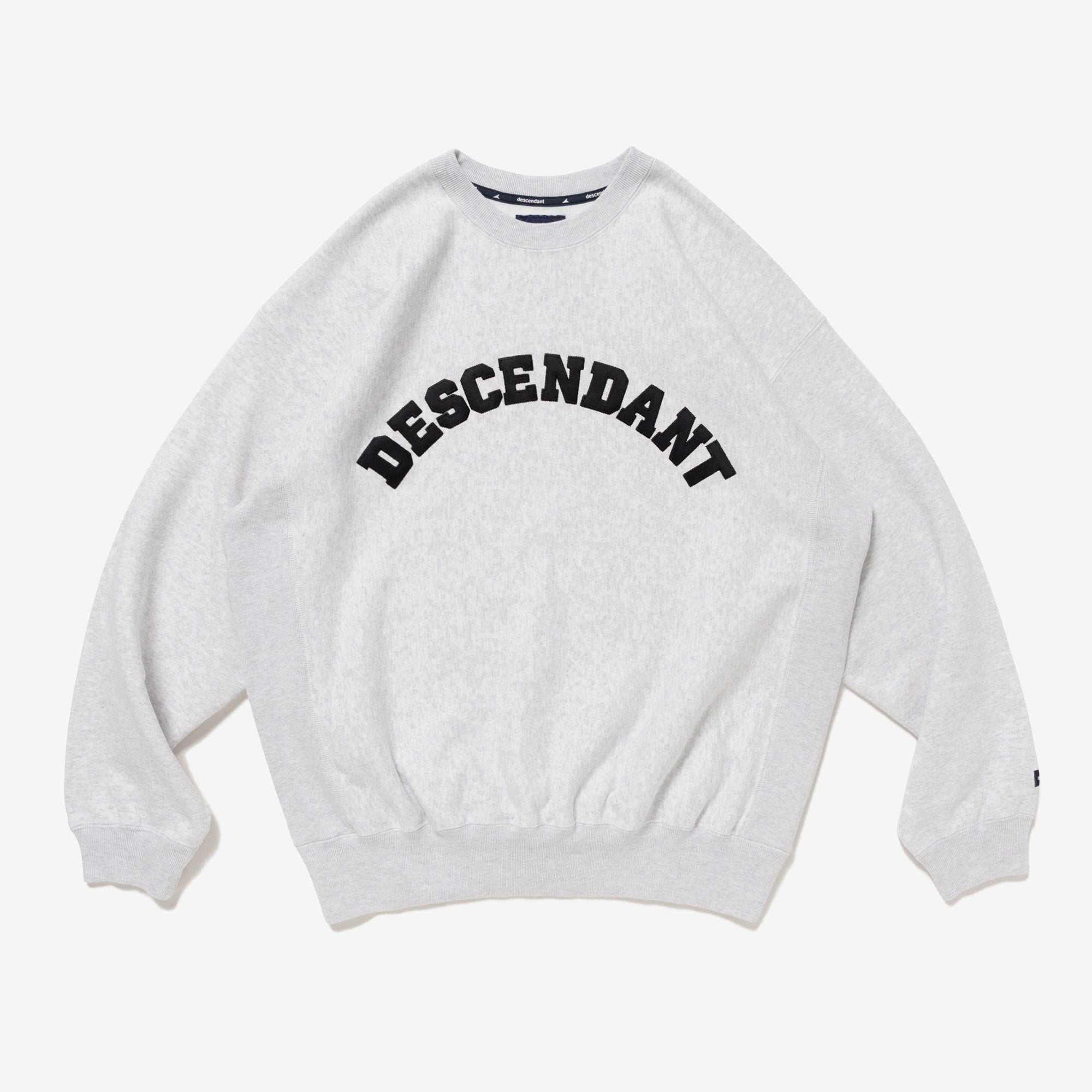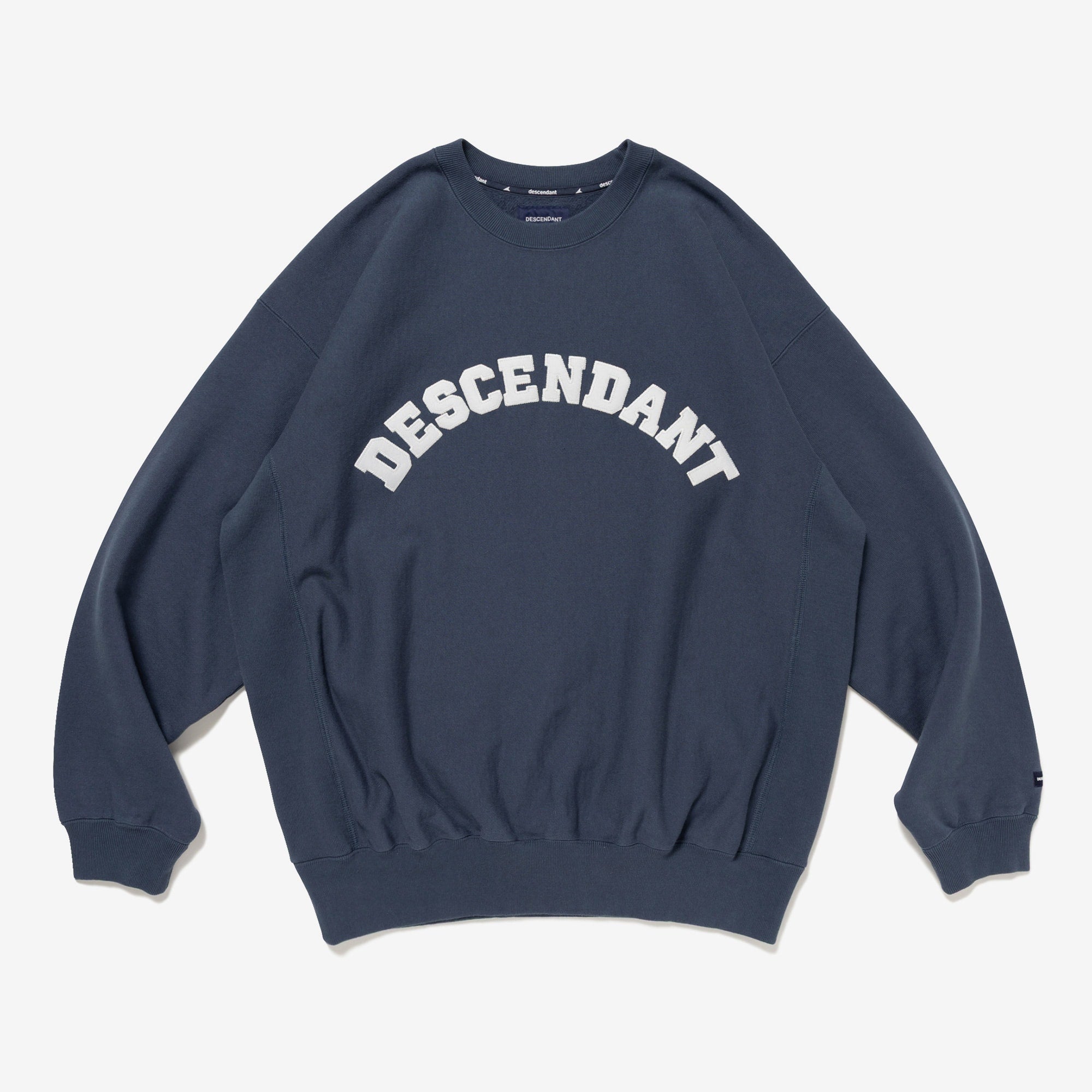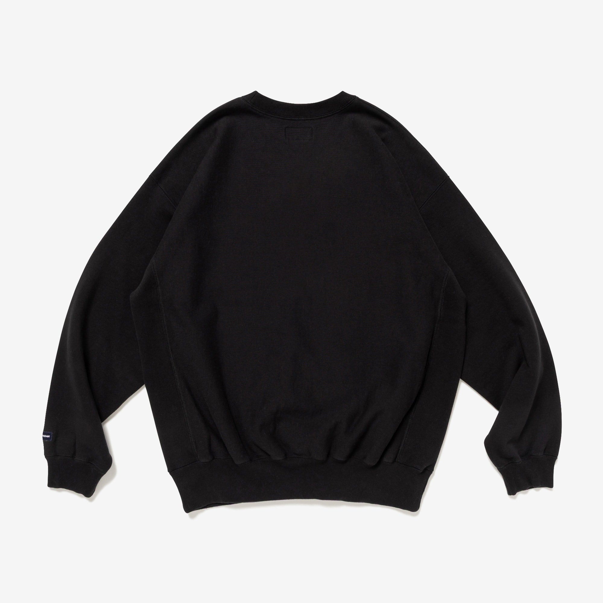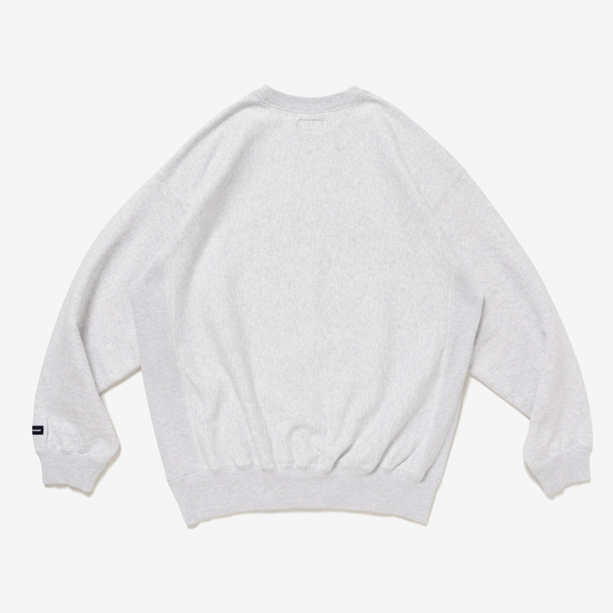 Crewneck sweatshirt made from heavyweight cotton Terry, with the fabric grain laid horizontally and ribbed panels inserted at the side seams. Satin patch sewn onto the front body. Loose, wide-body silhouette with a tapered hem. Original brand taping along the seam of the neckline. Box logo embroidered on the left cuff.