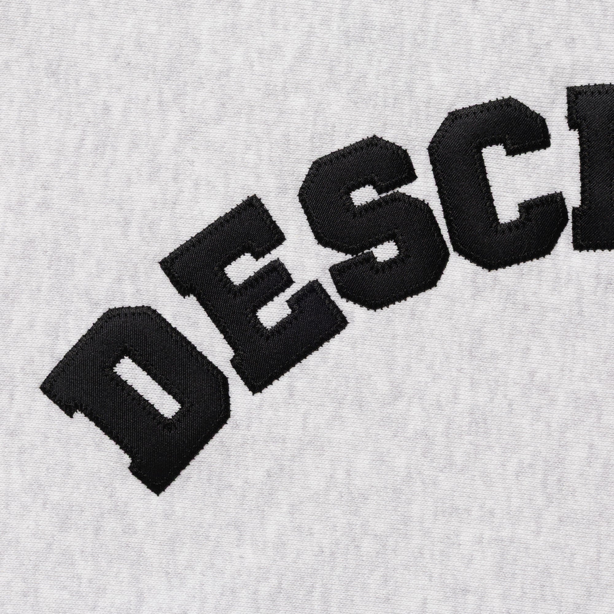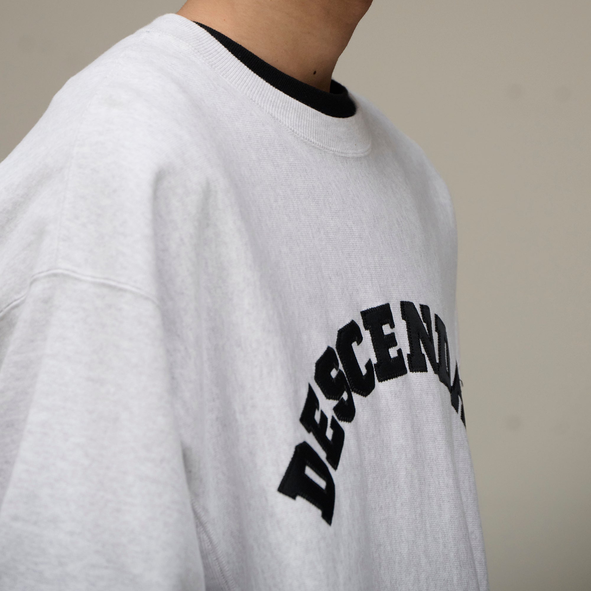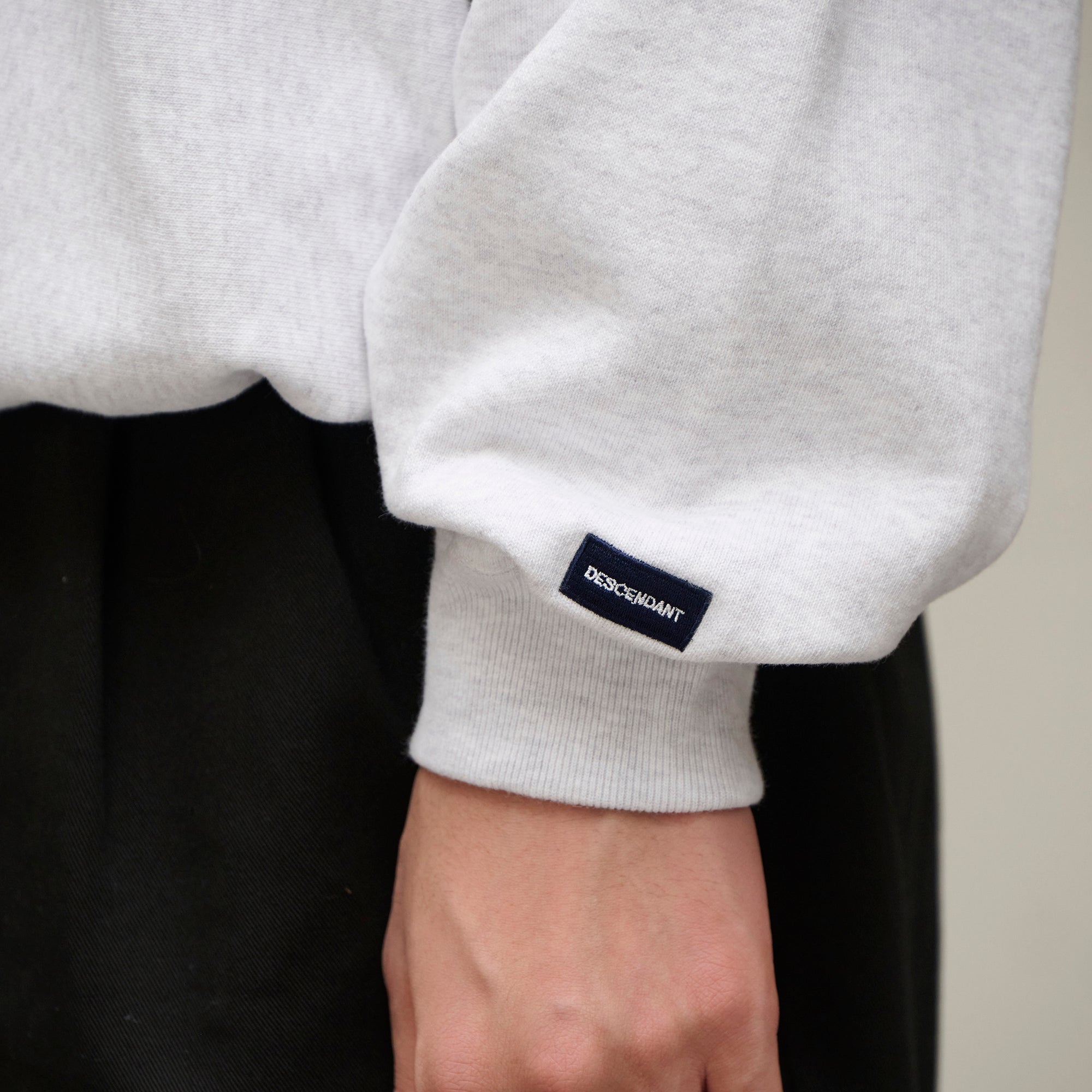 Crewneck sweatshirt made from heavyweight cotton Terry, with the fabric grain laid horizontally and ribbed panels inserted at the side seams. Satin patch sewn onto the front body. Loose, wide-body silhouette with a tapered hem. Original brand taping along the seam of the neckline. Box logo embroidered on the left cuff.
