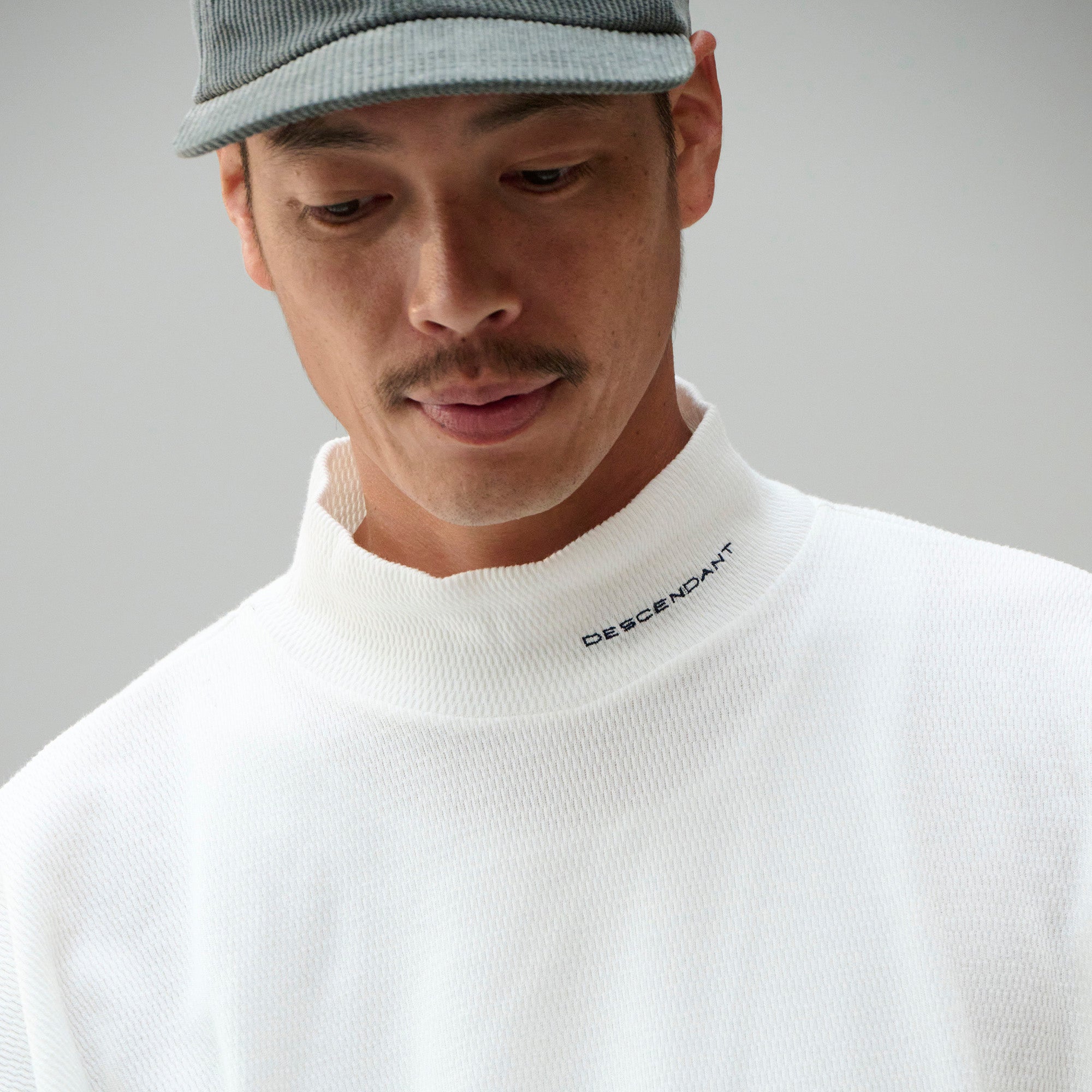 Long-sleeve cut-and-sewn made from insulating waffle-knit organic cotton, with a mock neck crafted from the same fabric. SPUR logo embroidered on the mock neck. Original brand taping along the seam of the neckline. A woven CETUS size label is attached to the right front hem.MODEL :183cm / SIZE3 (LARGE)
