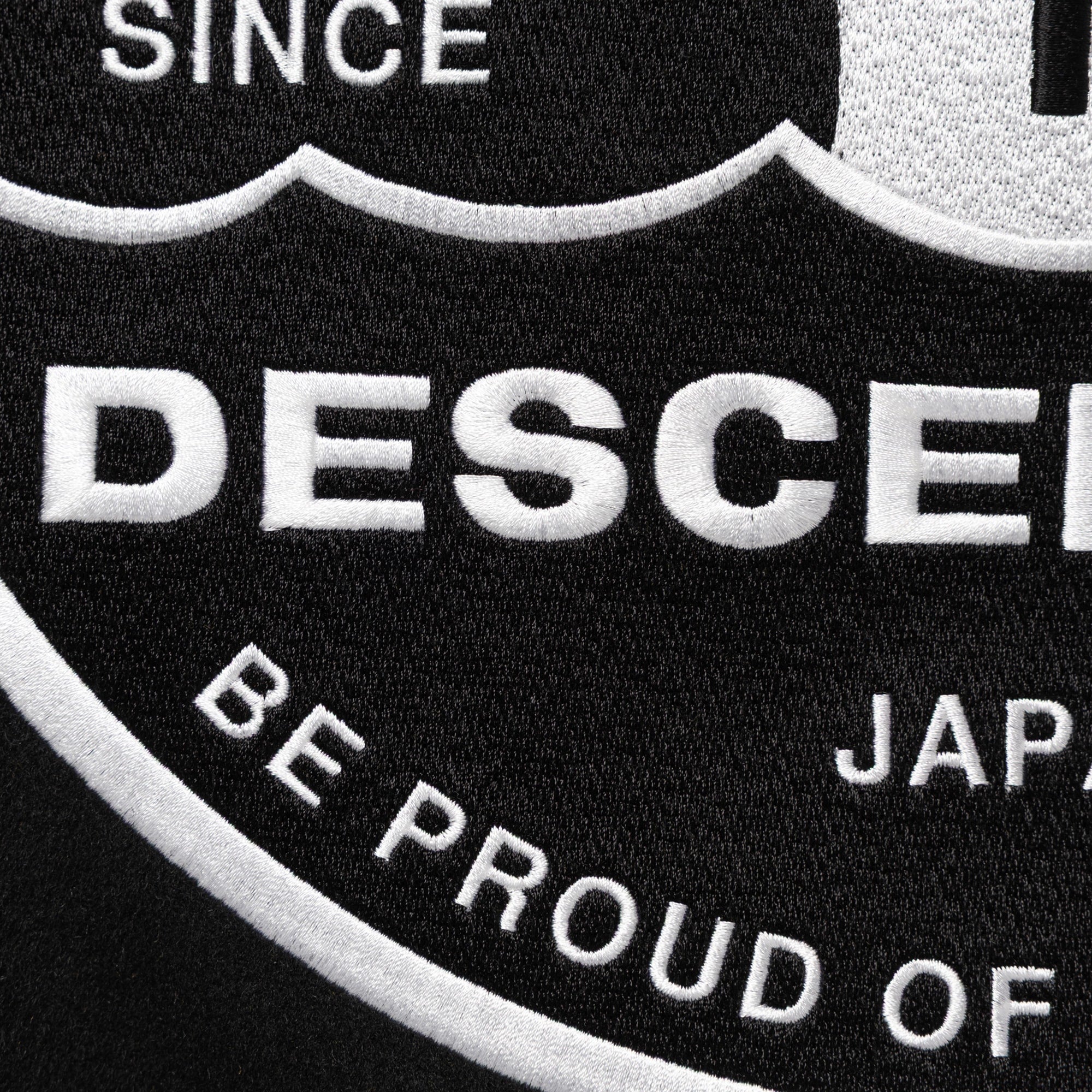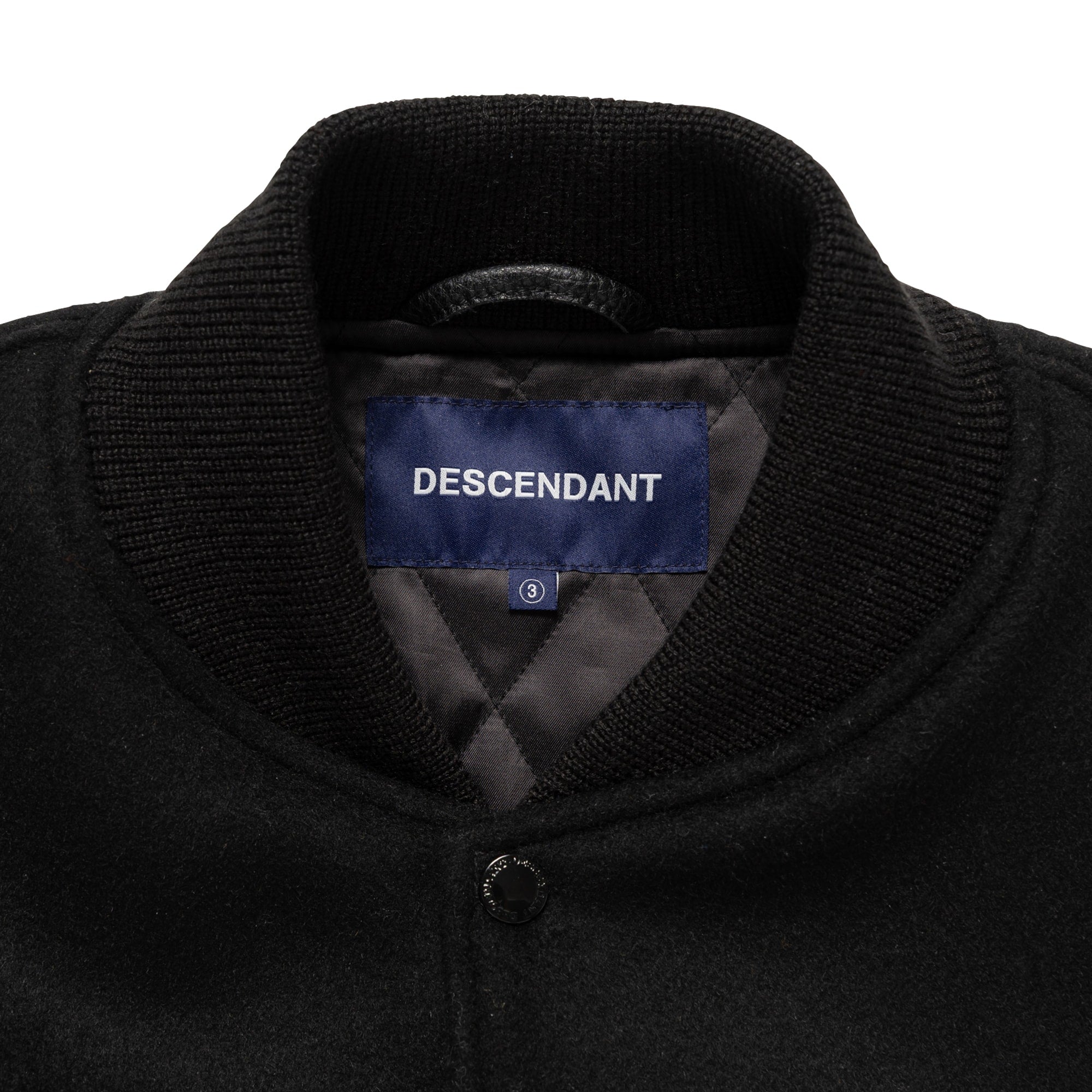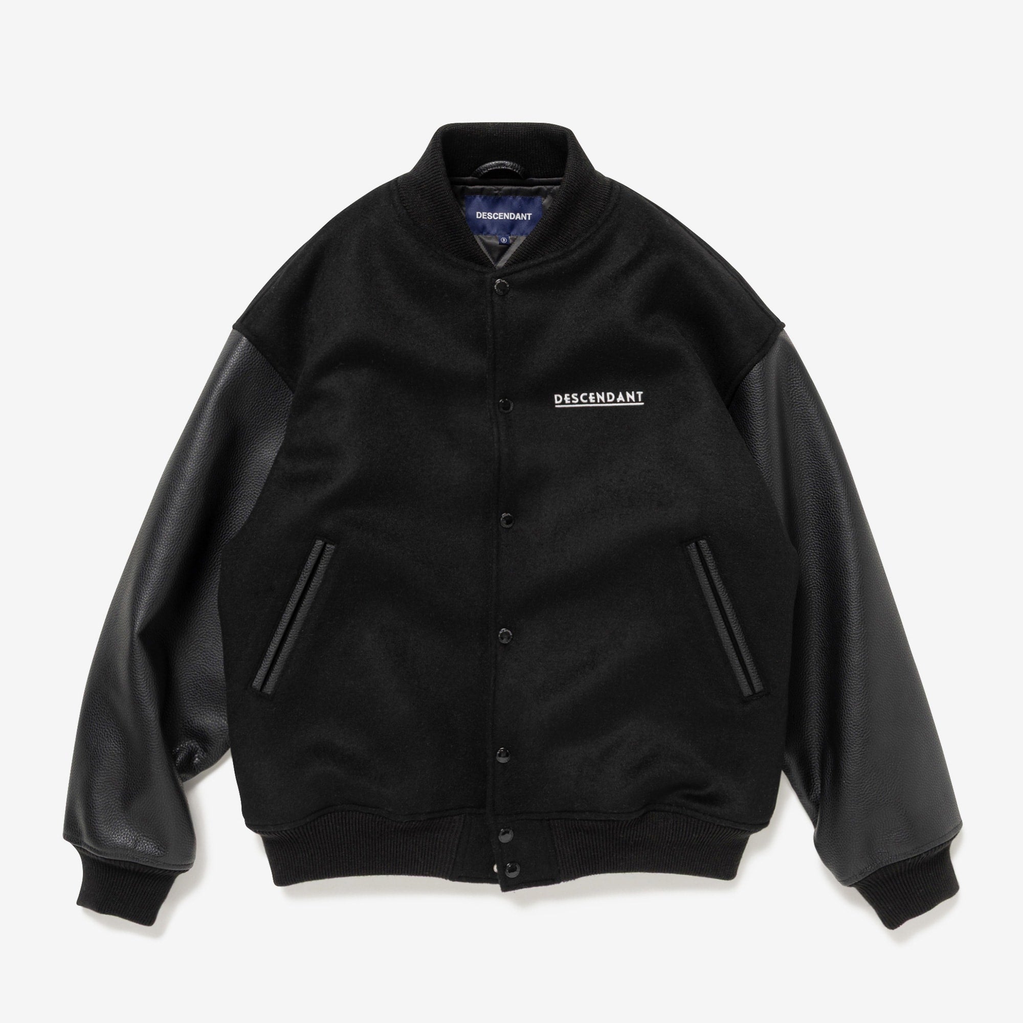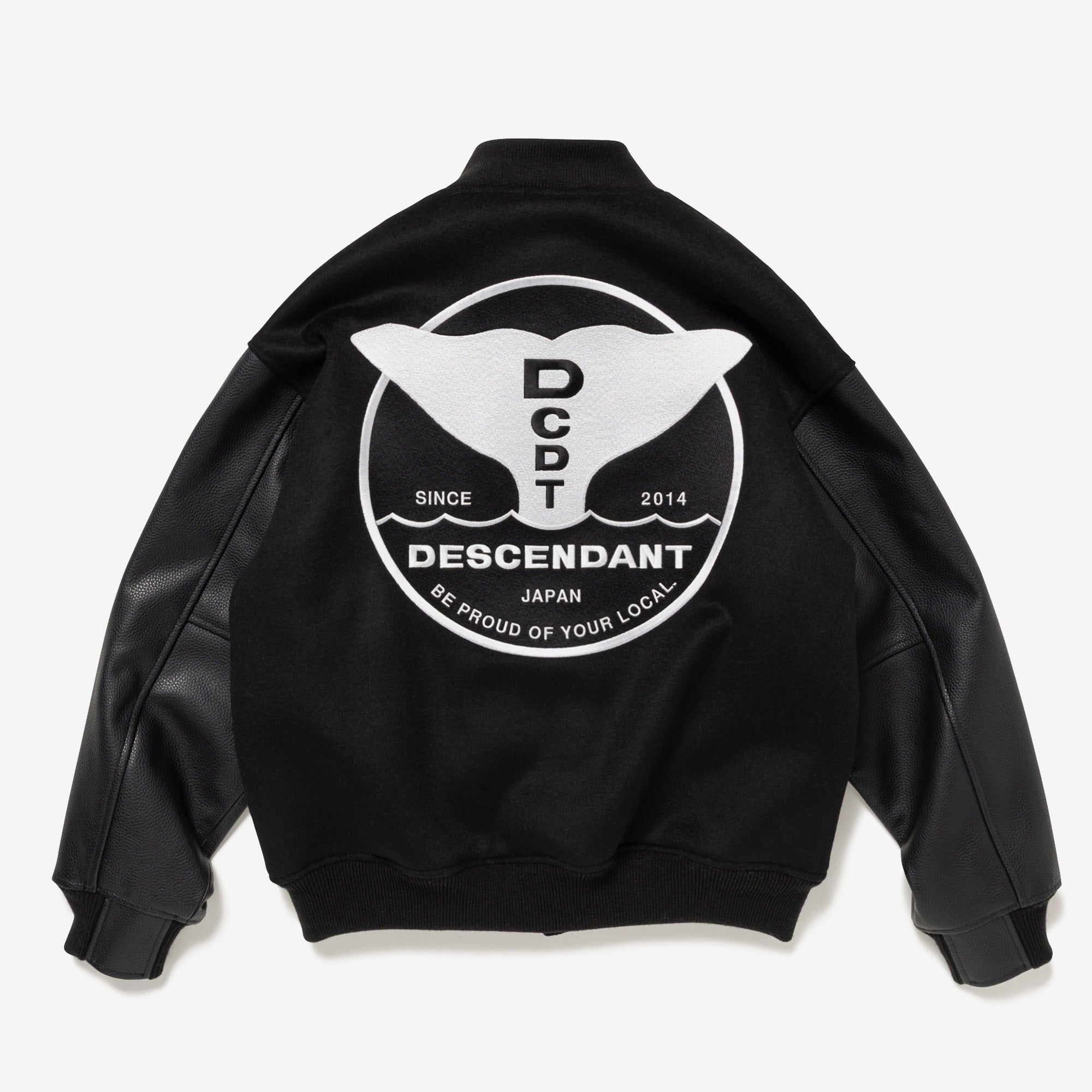A varsity jacket made with a wool melton body, featuring sleeves that switch to an eco-friendly recycled leather. The OTL logo is embroidered on the left chest, and the FLUKE UP graphic, inspired by a whale’s tail fin, is embroidered on the back. Hand-warmer pockets on both sides of the front are trimmed with recycled leather, and a quilted lining with an interior pocket. A SPOT item from the DESCENDANT 2025 Autumn/Winter season.