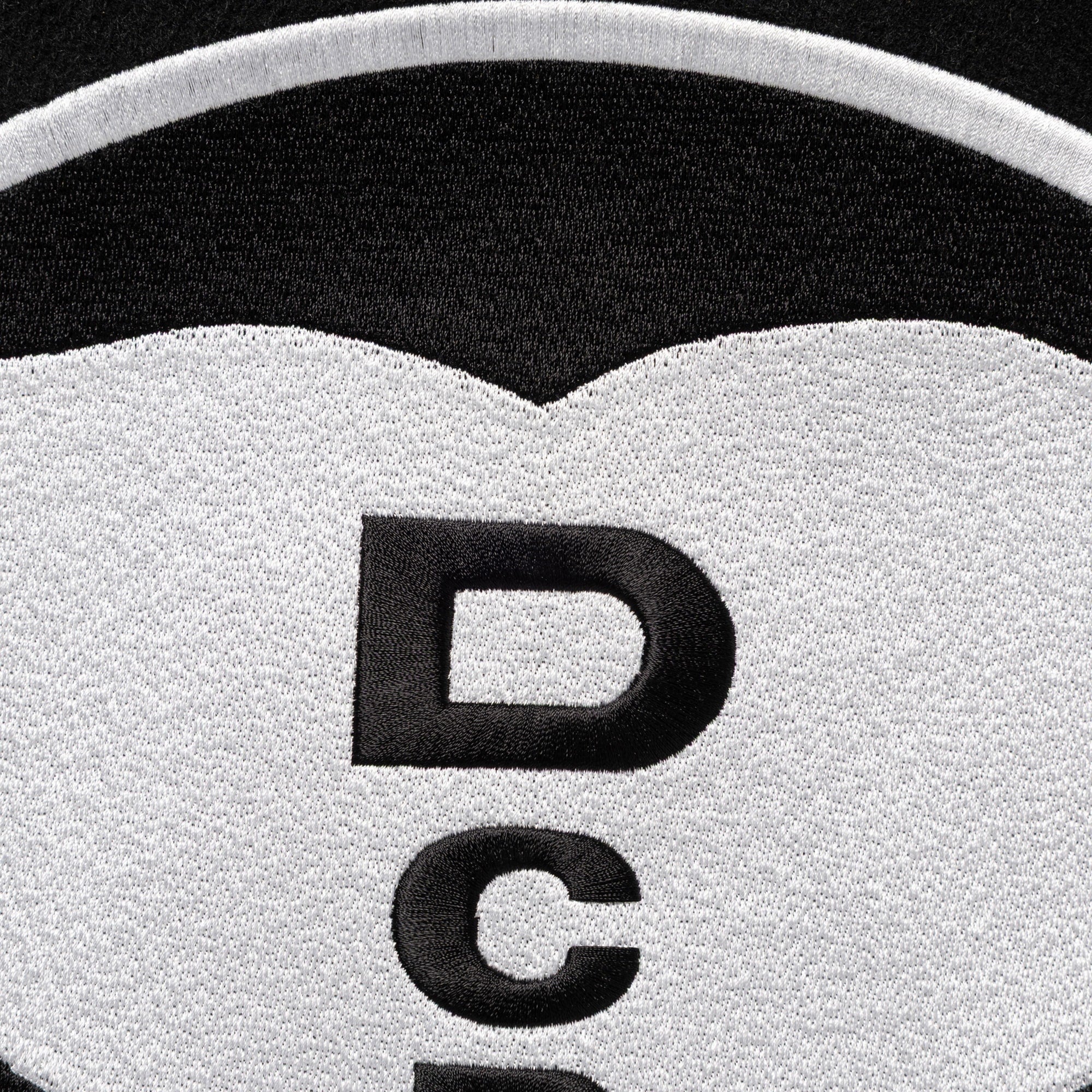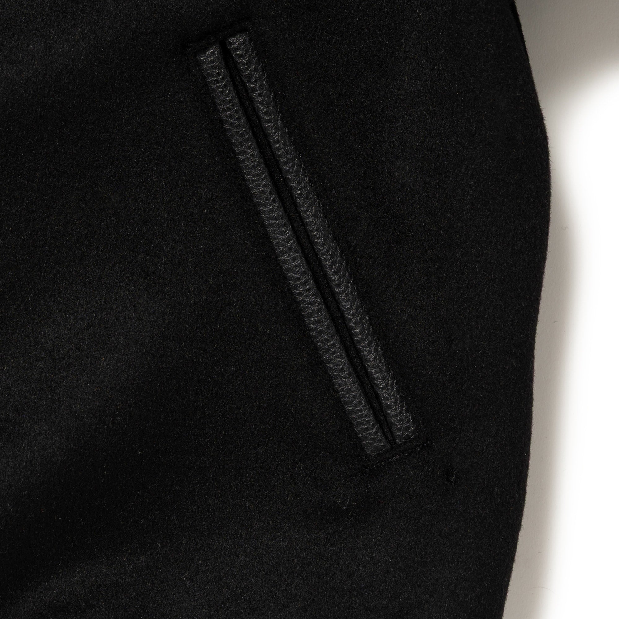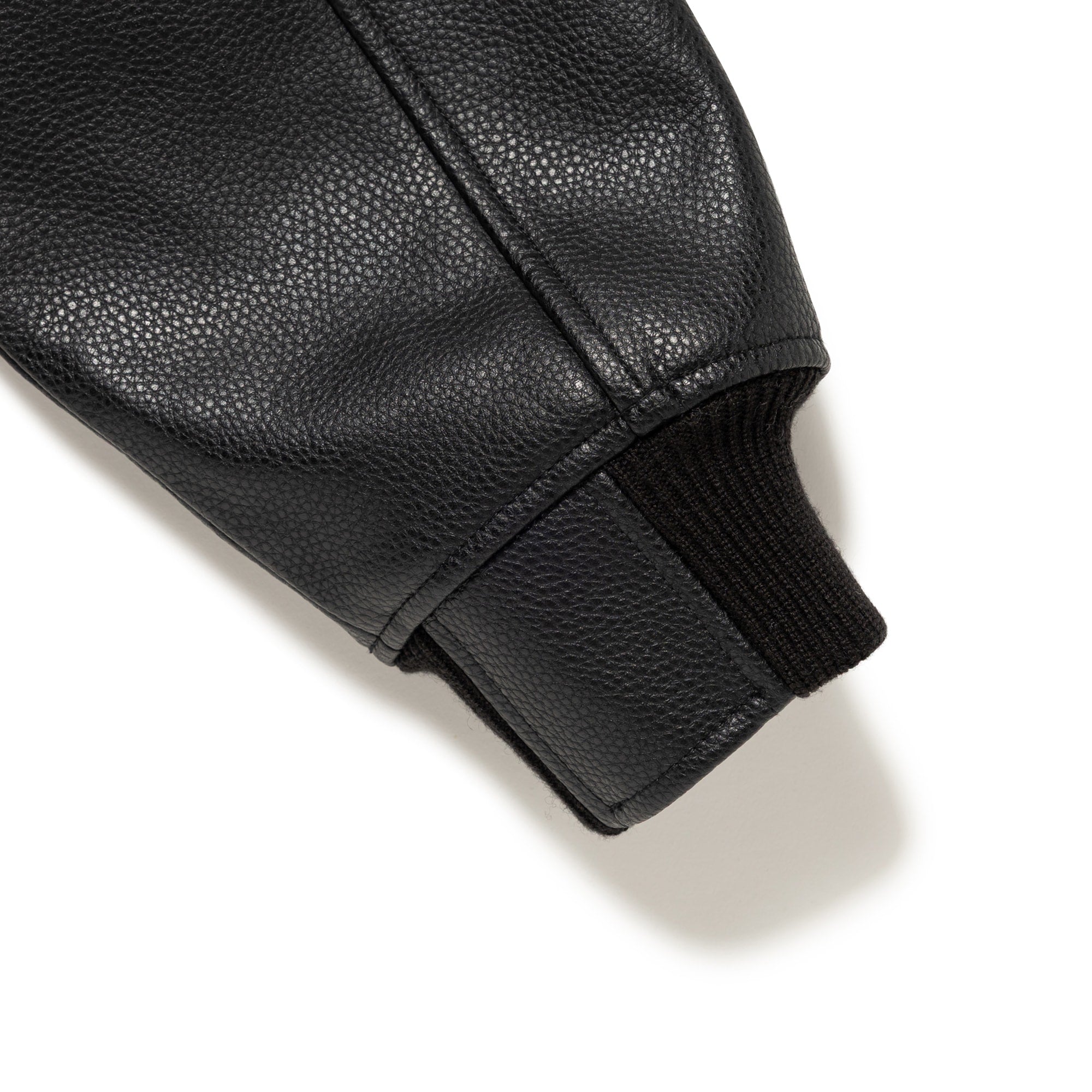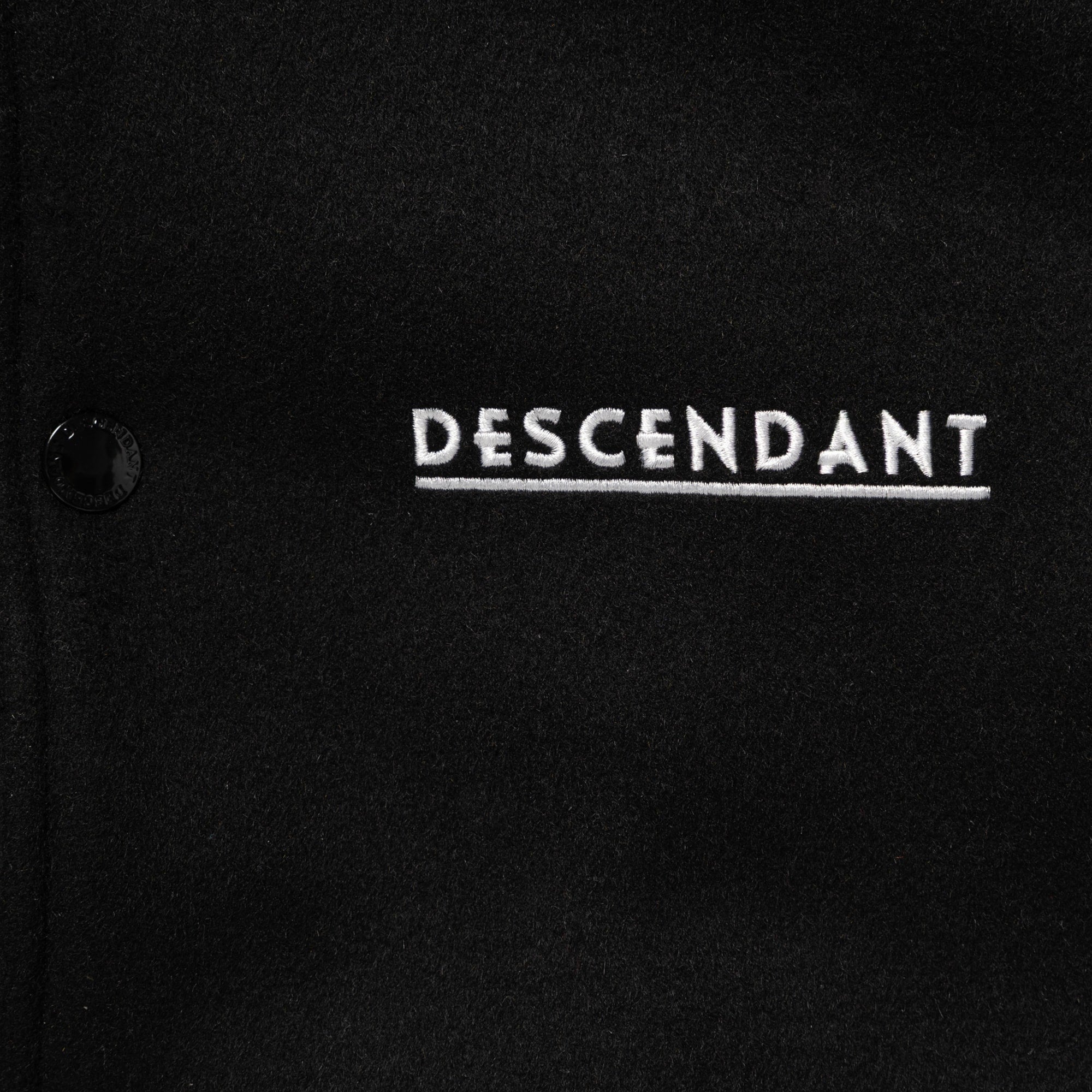 A varsity jacket made with a wool melton body, featuring sleeves that switch to an eco-friendly recycled leather. The OTL logo is embroidered on the left chest, and the FLUKE UP graphic, inspired by a whale’s tail fin, is embroidered on the back. Hand-warmer pockets on both sides of the front are trimmed with recycled leather, and a quilted lining with an interior pocket. A SPOT item from the DESCENDANT 2025 Autumn/Winter season.