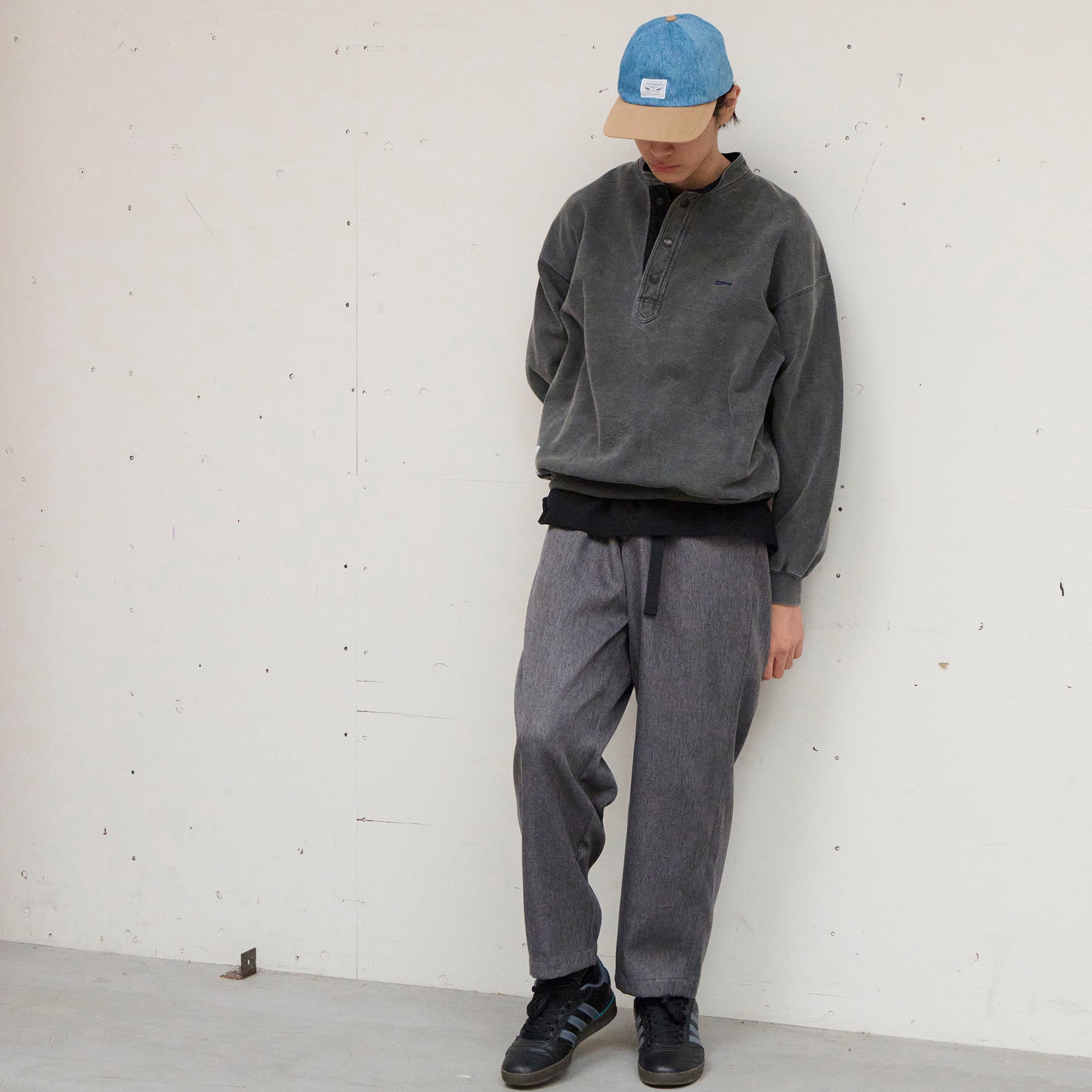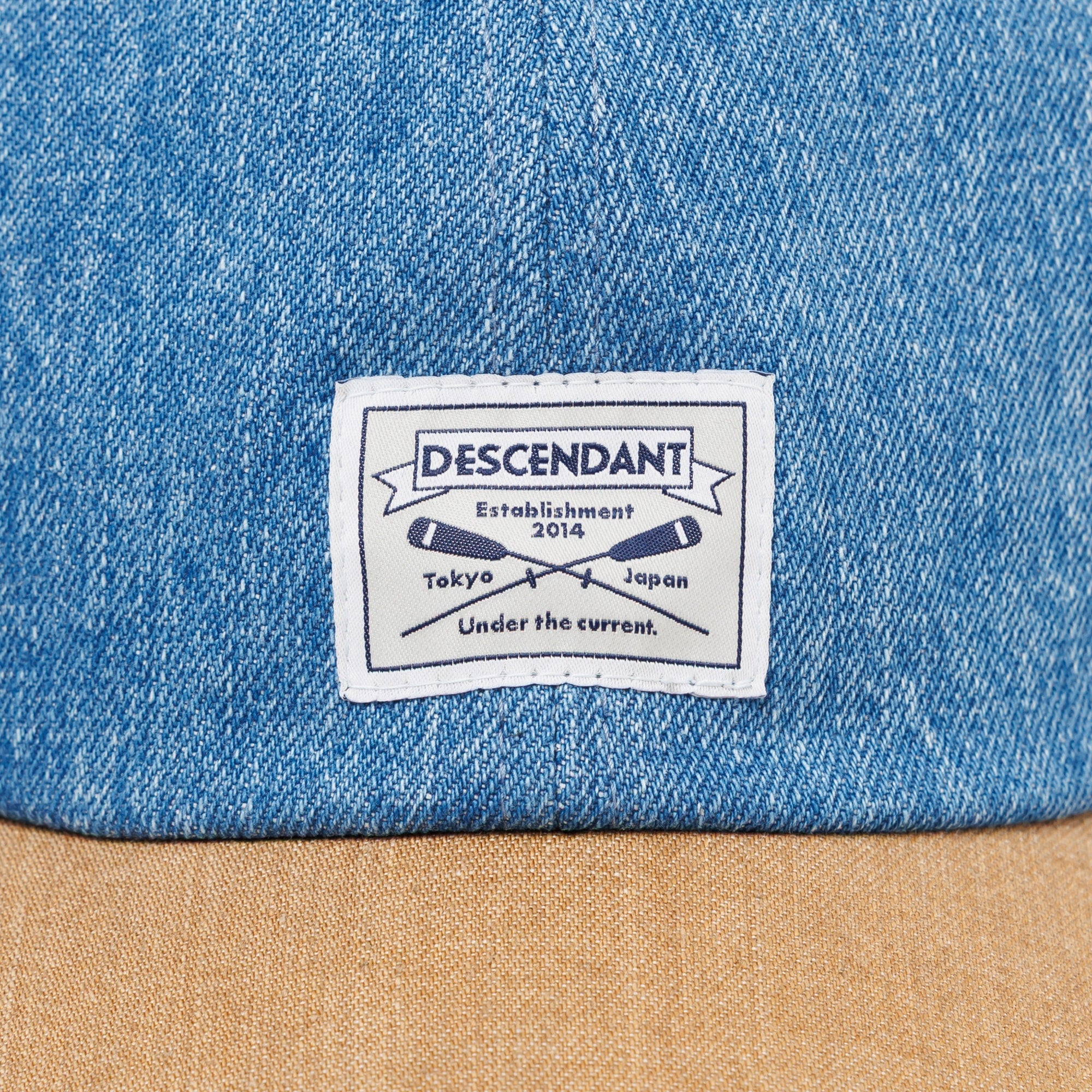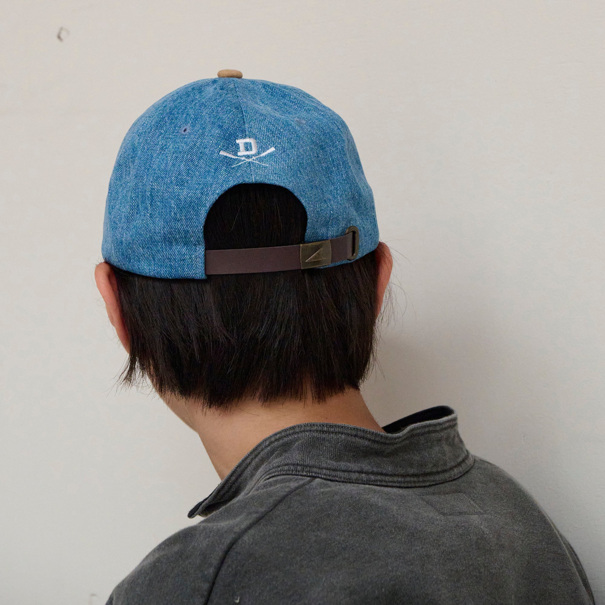 Six-panel cap made from 13.5oz indigo denim that switches to a beige-colored denim visor for contrast. CROSS PADDLE woven label on the front and a CROSS PADDLE logo embroidery on the back. A synthetic leather adjustable strap on the back.