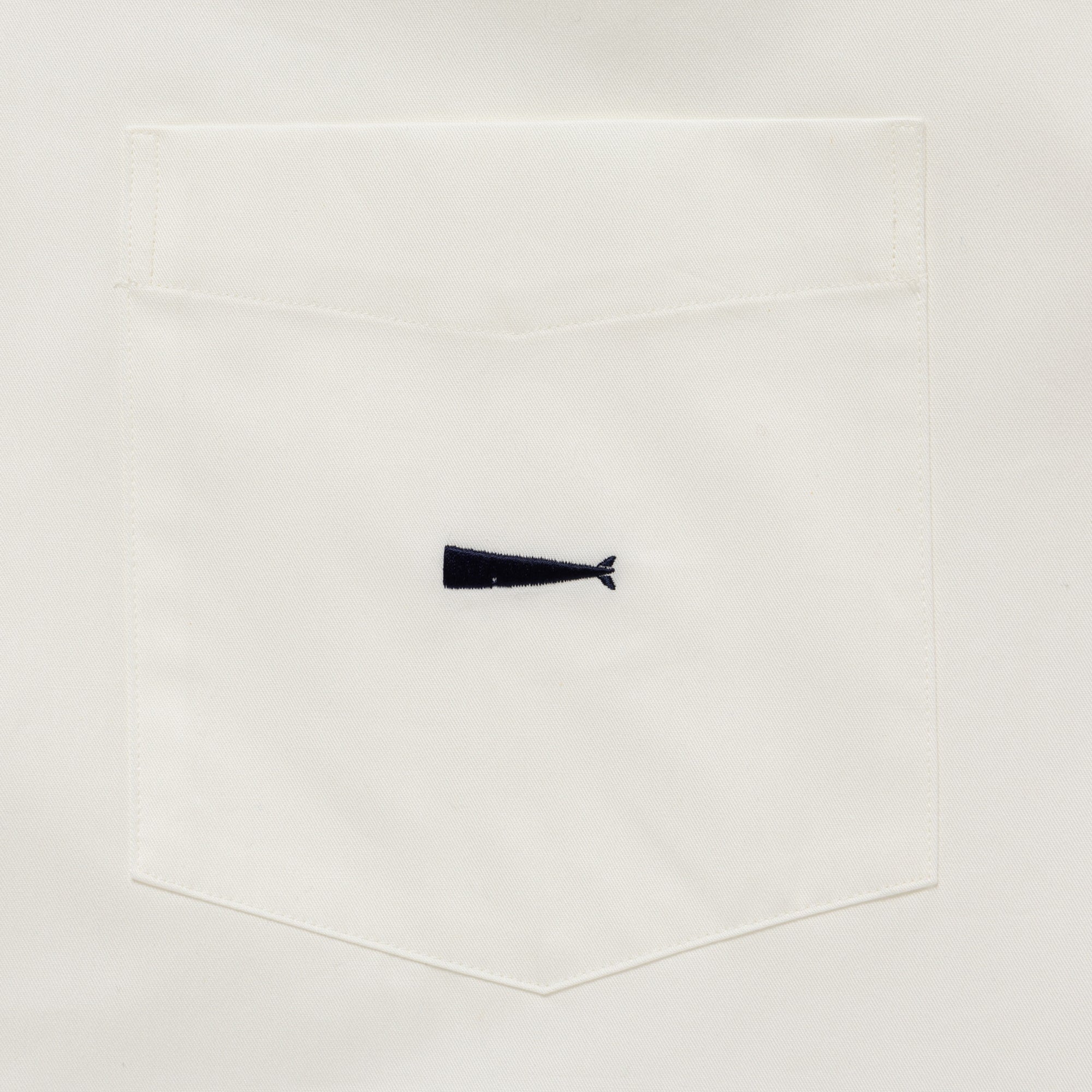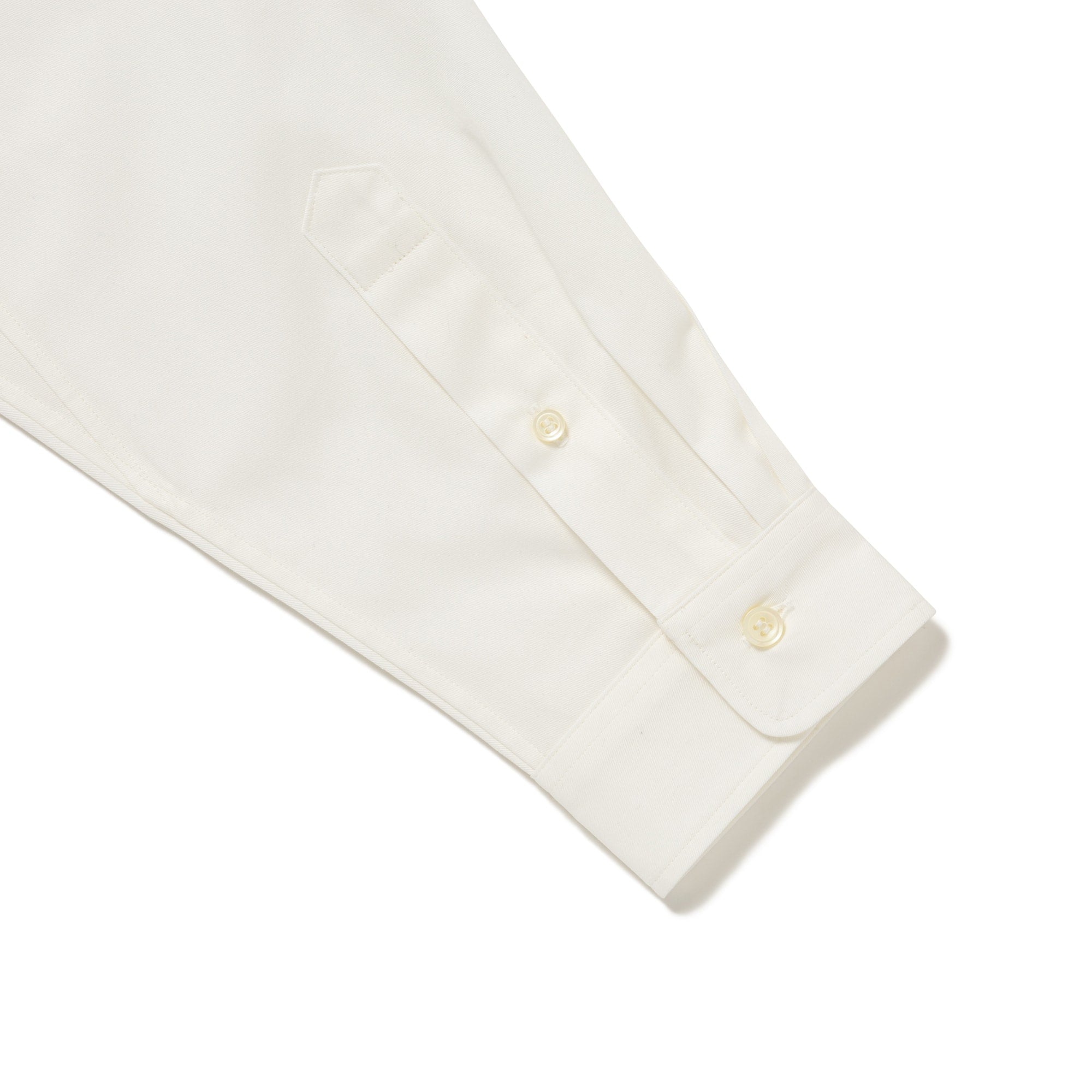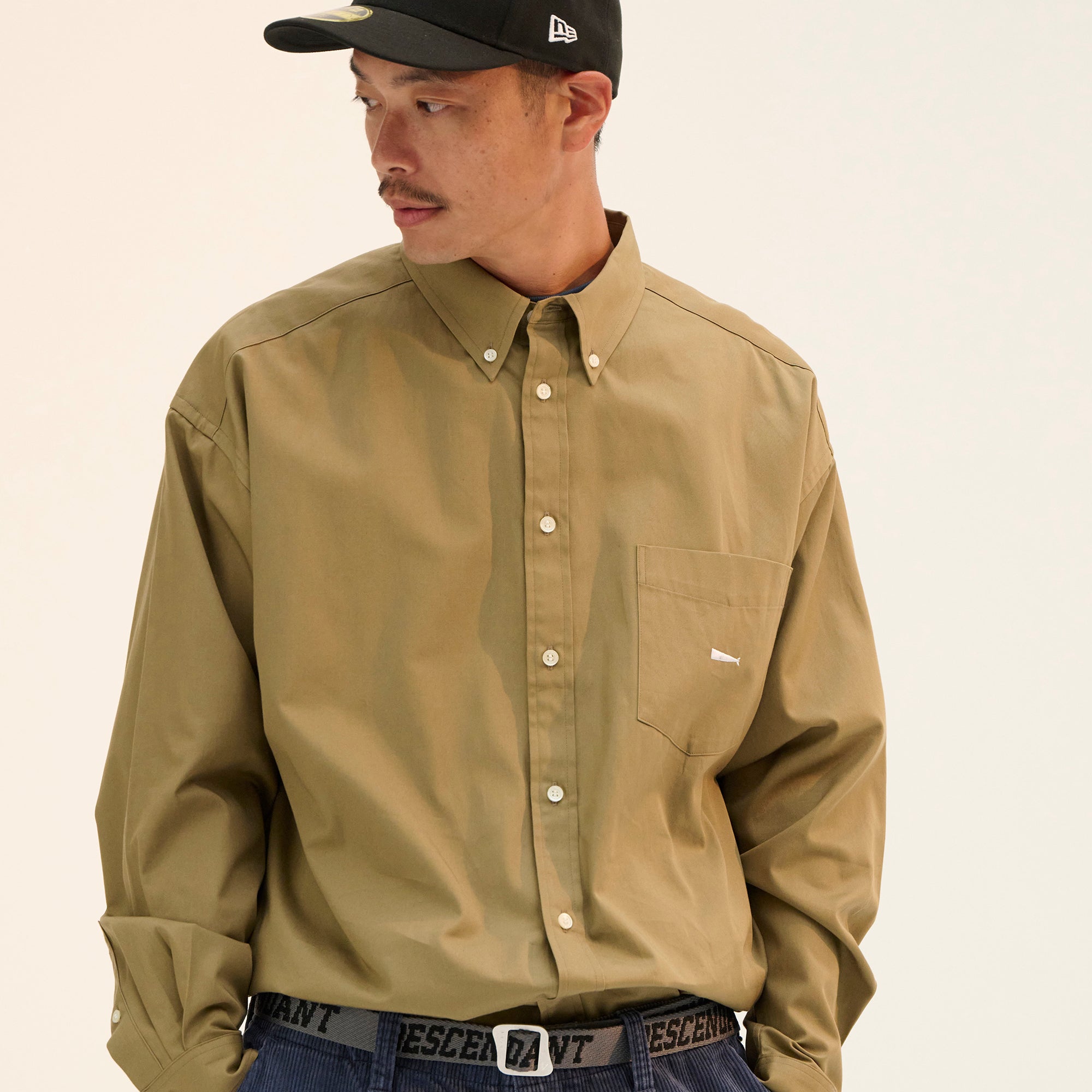Button-down shirt made from a crisp cotton twill with a subtle sheen. Relaxed silhouette, button-down collar, a center box pleat with loop, and gauntlet button placket closure. The CACHALOT logo embroidered on the left chest pocket.