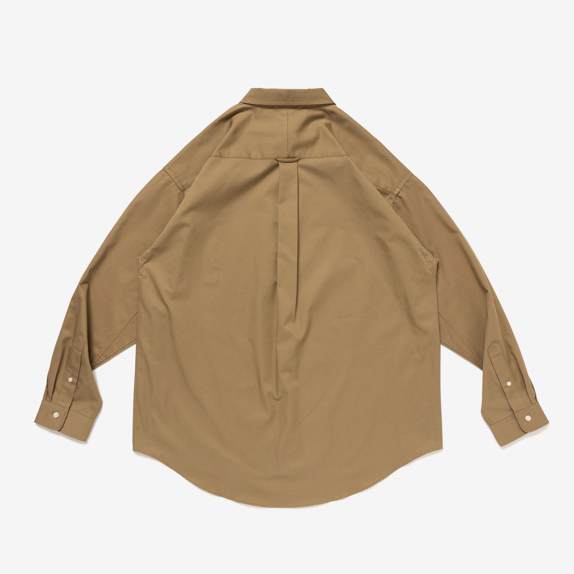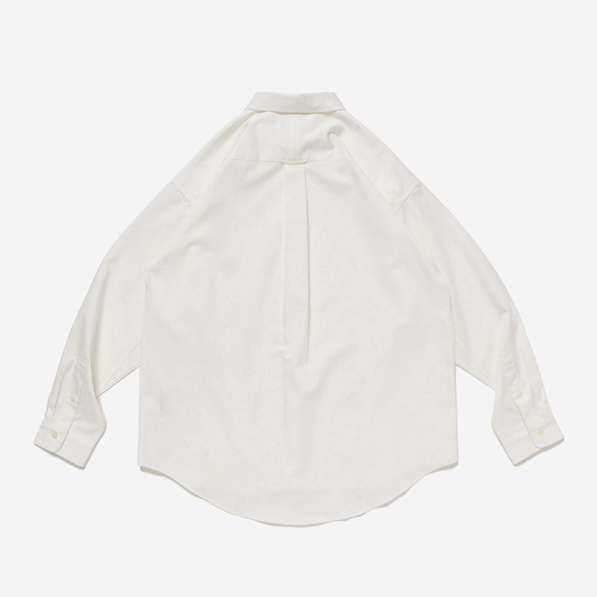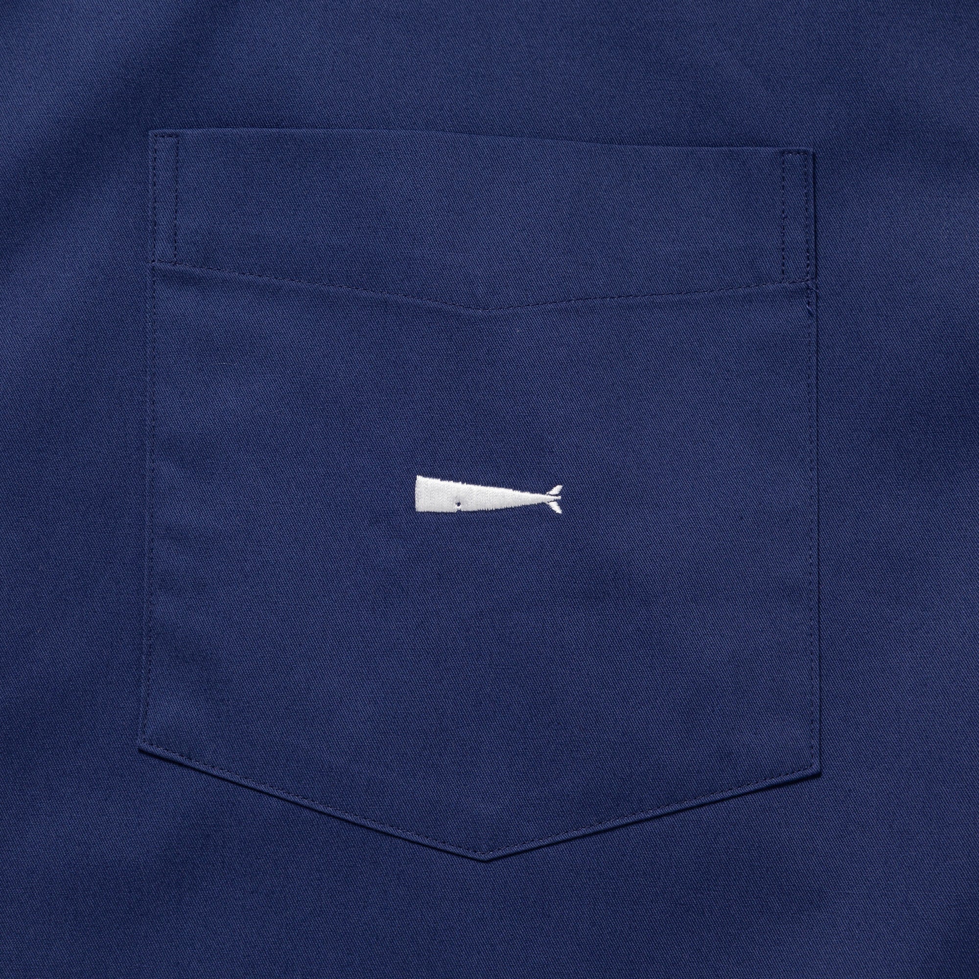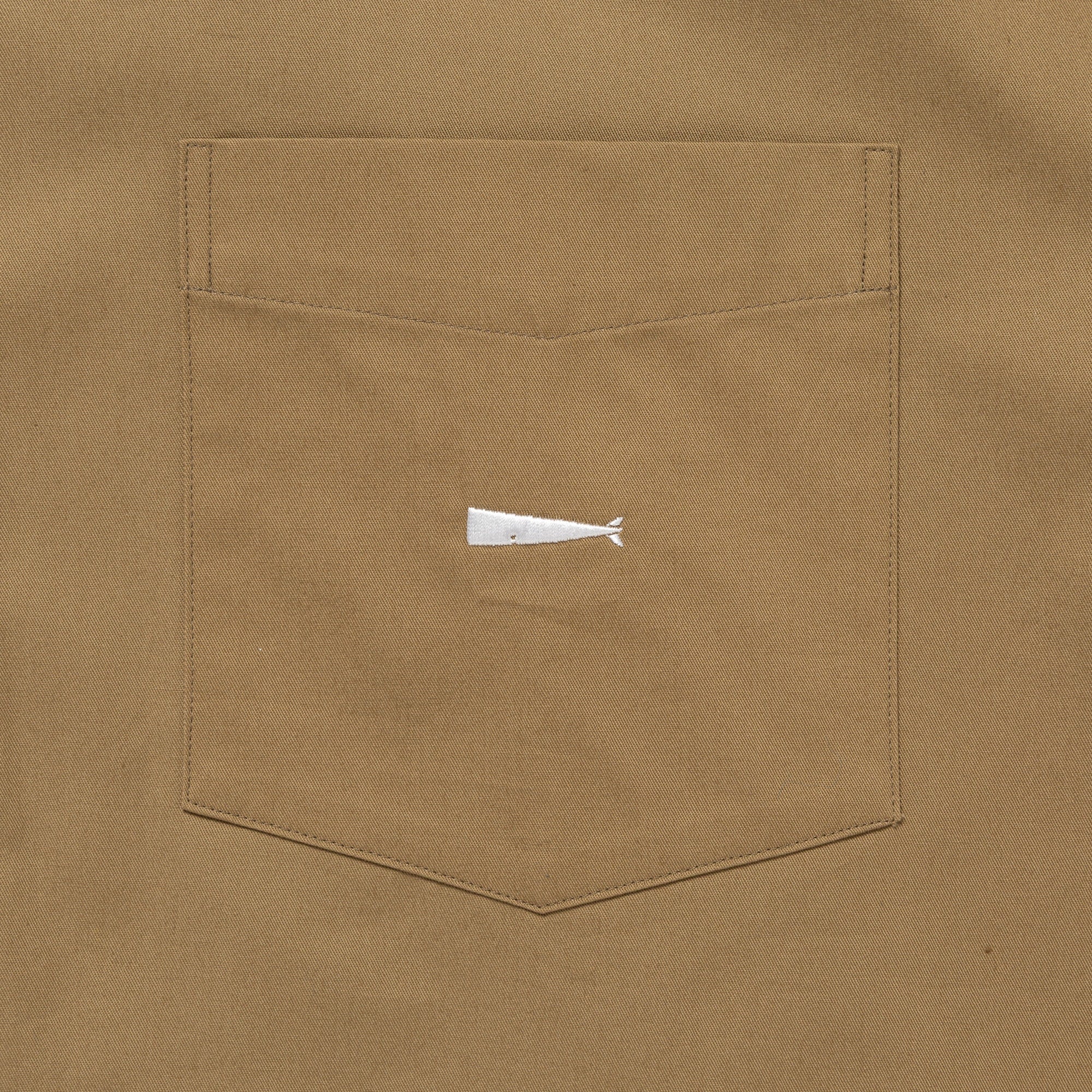 Button-down shirt made from a crisp cotton twill with a subtle sheen. Relaxed silhouette, button-down collar, a center box pleat with loop, and gauntlet button placket closure. The CACHALOT logo embroidered on the left chest pocket.