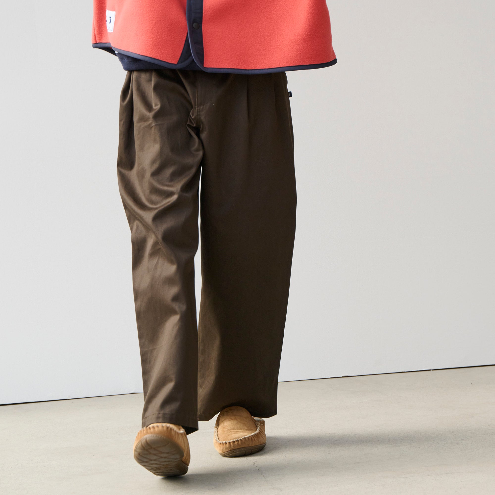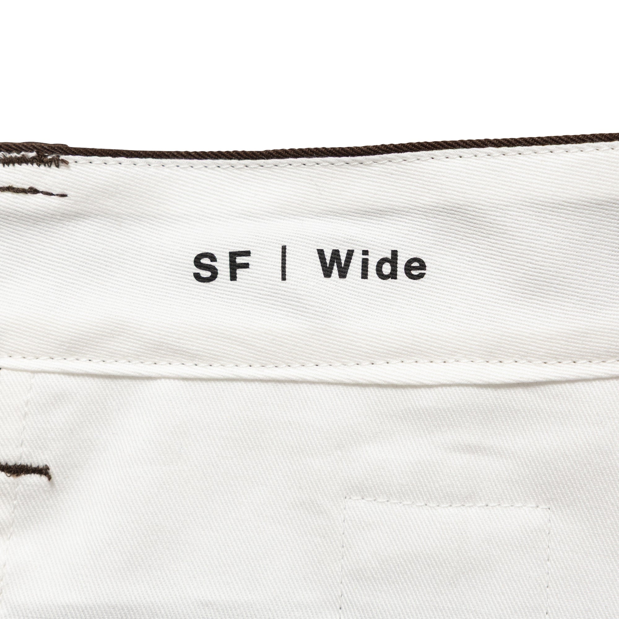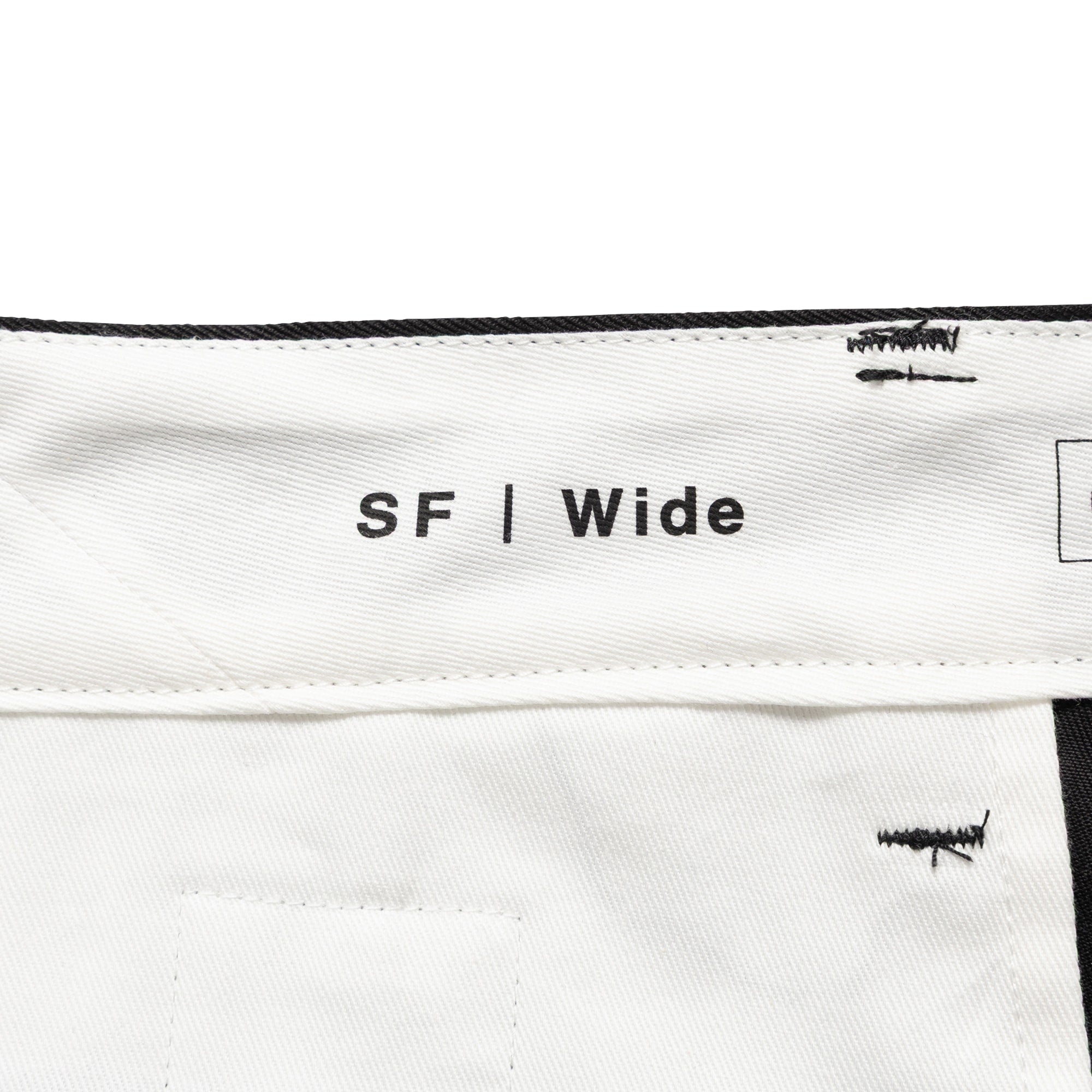 SF wide trousers made from high-density, tightly woven cotton chino fabric. Two-tuck waist and a wide, straight silhouette that extends cleanly from waist to hem. Slanted side pockets, single-welt back pockets, and a woven CROSS PADDLE label on the back. “SF | Wide” is printed on the inner waistband.