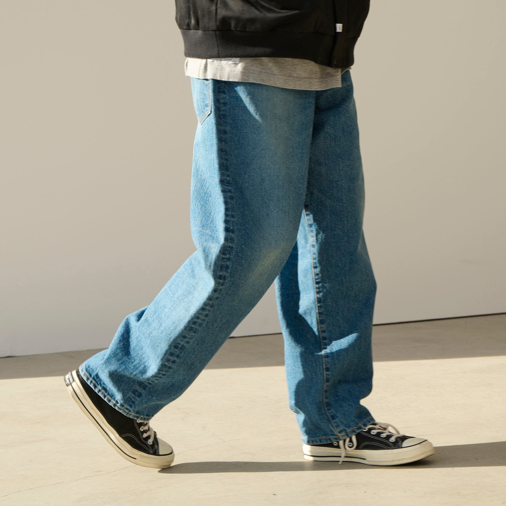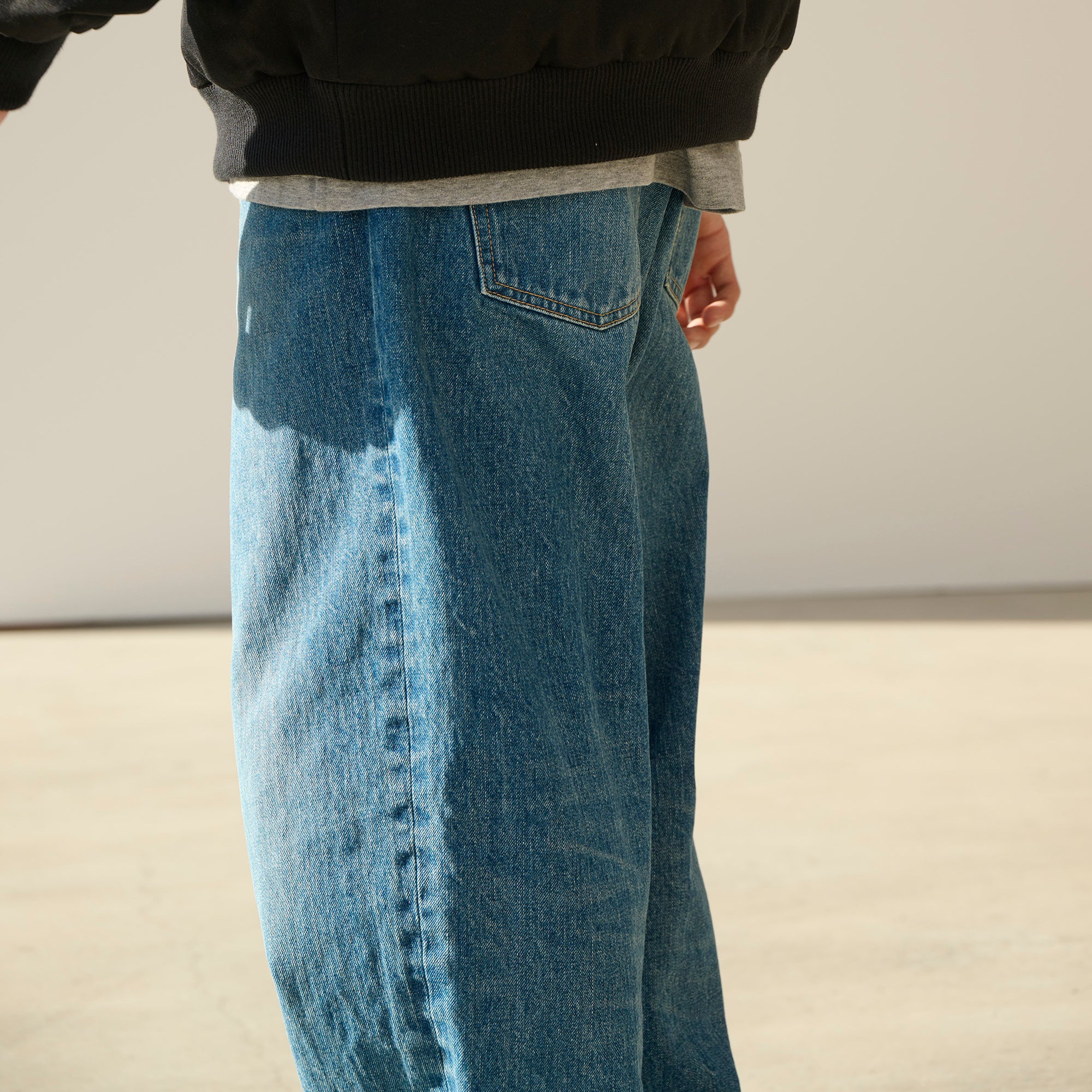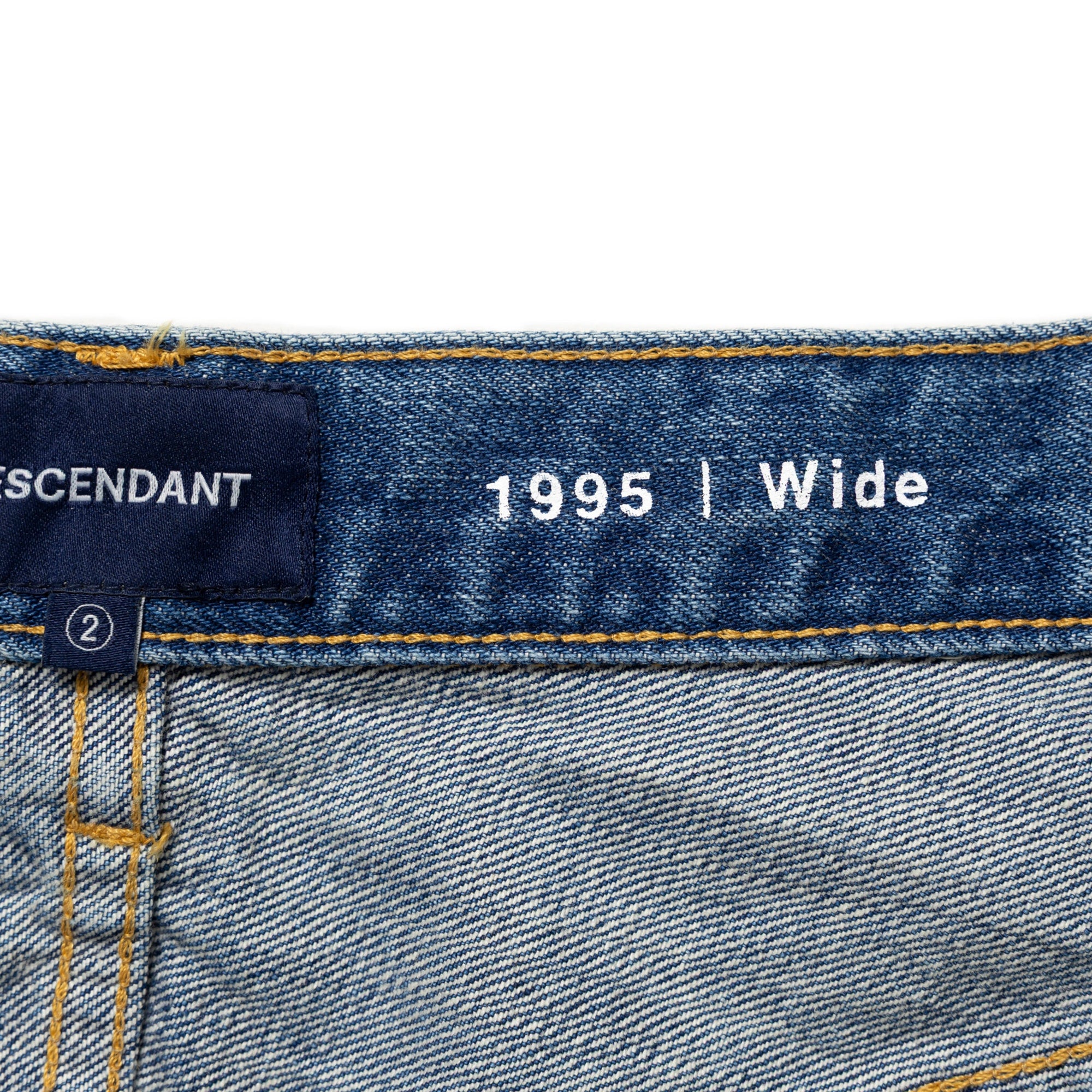 1995 denim baggy trousers made from 13oz slub cotton denim with a bio-bleach wash, giving them a light, vintage-like finish. Relaxed, tapered baggy silhouette. L-shaped front pockets that include a coin pocket and patch pockets at the back. “1995 | Wide” is printed on the inner waistband. A paper patch is attached to the back right side of the waistband.