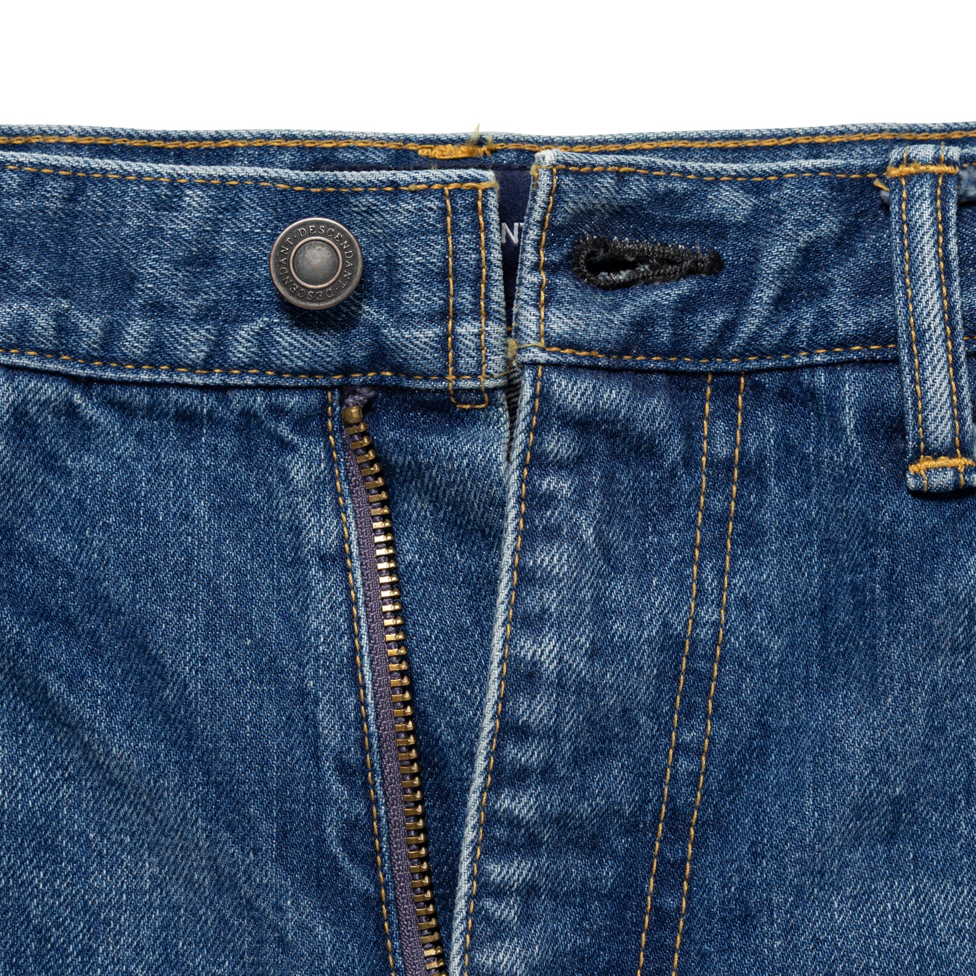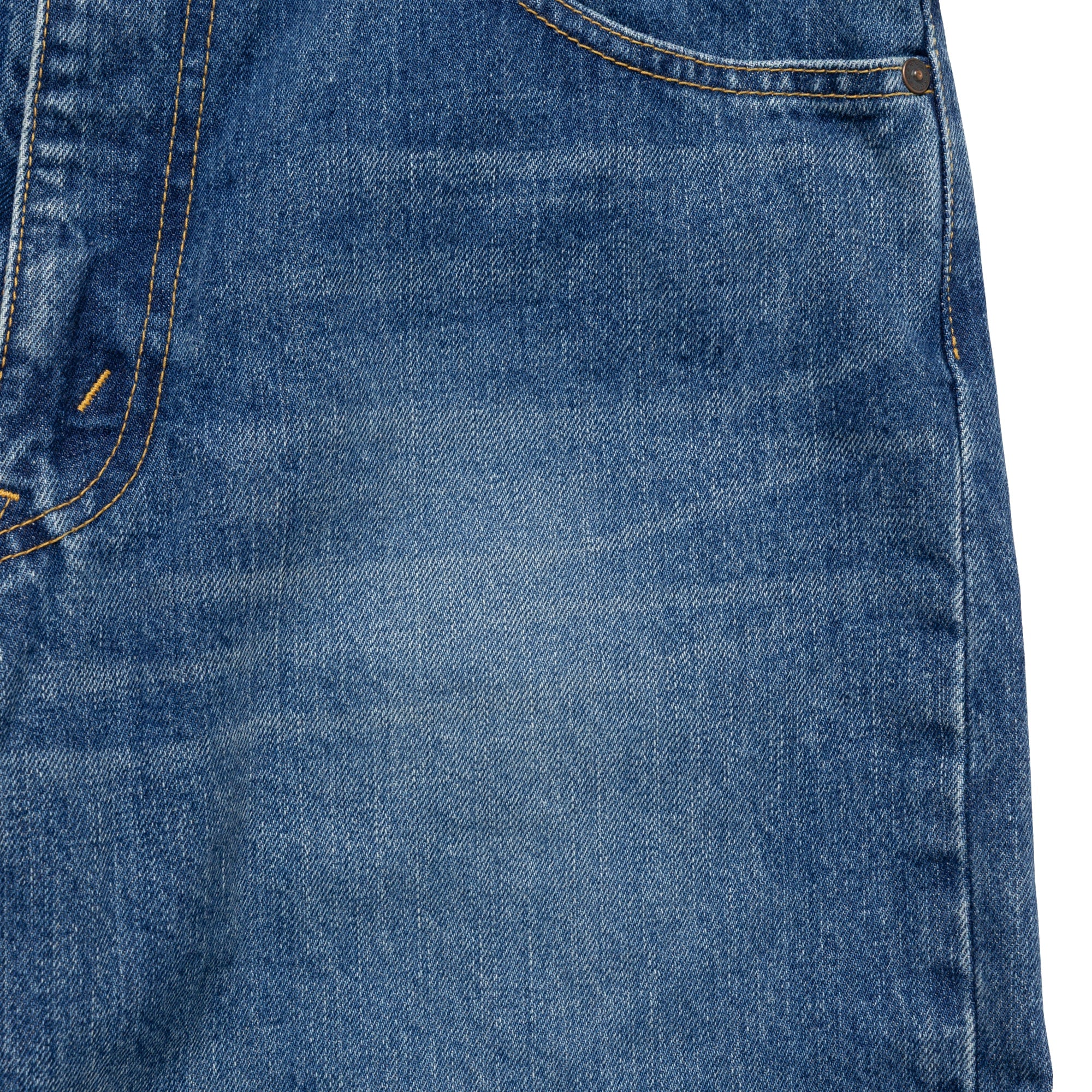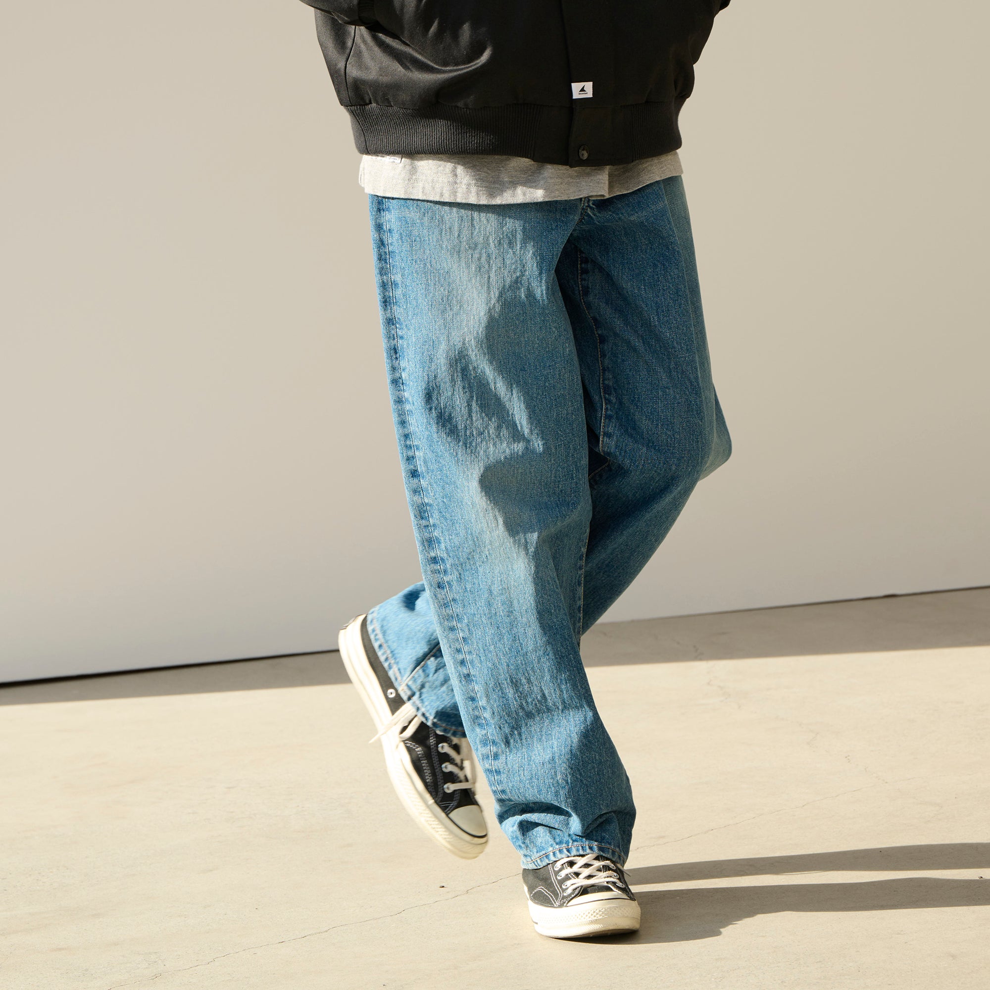1995 denim baggy trousers made from 13oz slub cotton denim with a bio-bleach wash, giving them a light, vintage-like finish. Relaxed, tapered baggy silhouette. L-shaped front pockets that include a coin pocket and patch pockets at the back. “1995 | Wide” is printed on the inner waistband. A paper patch is attached to the back right side of the waistband.