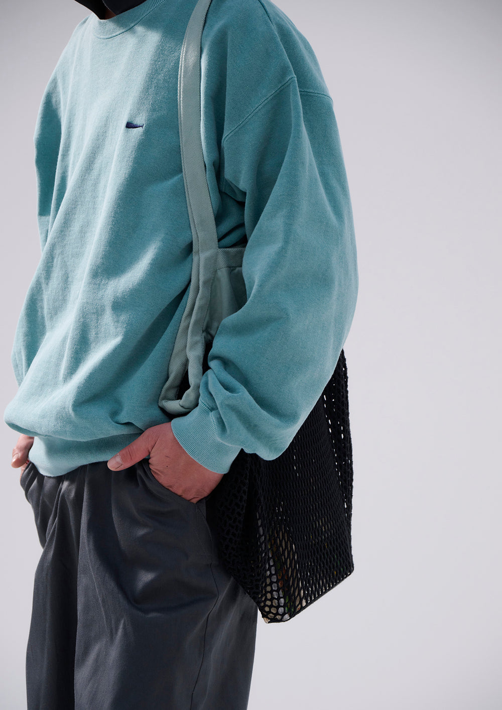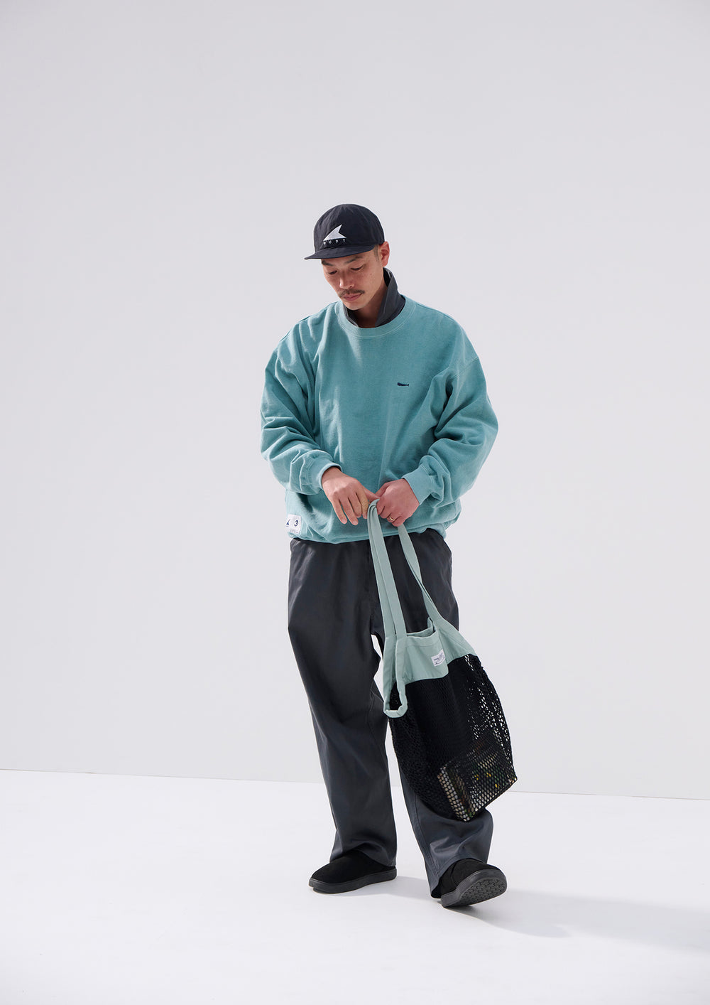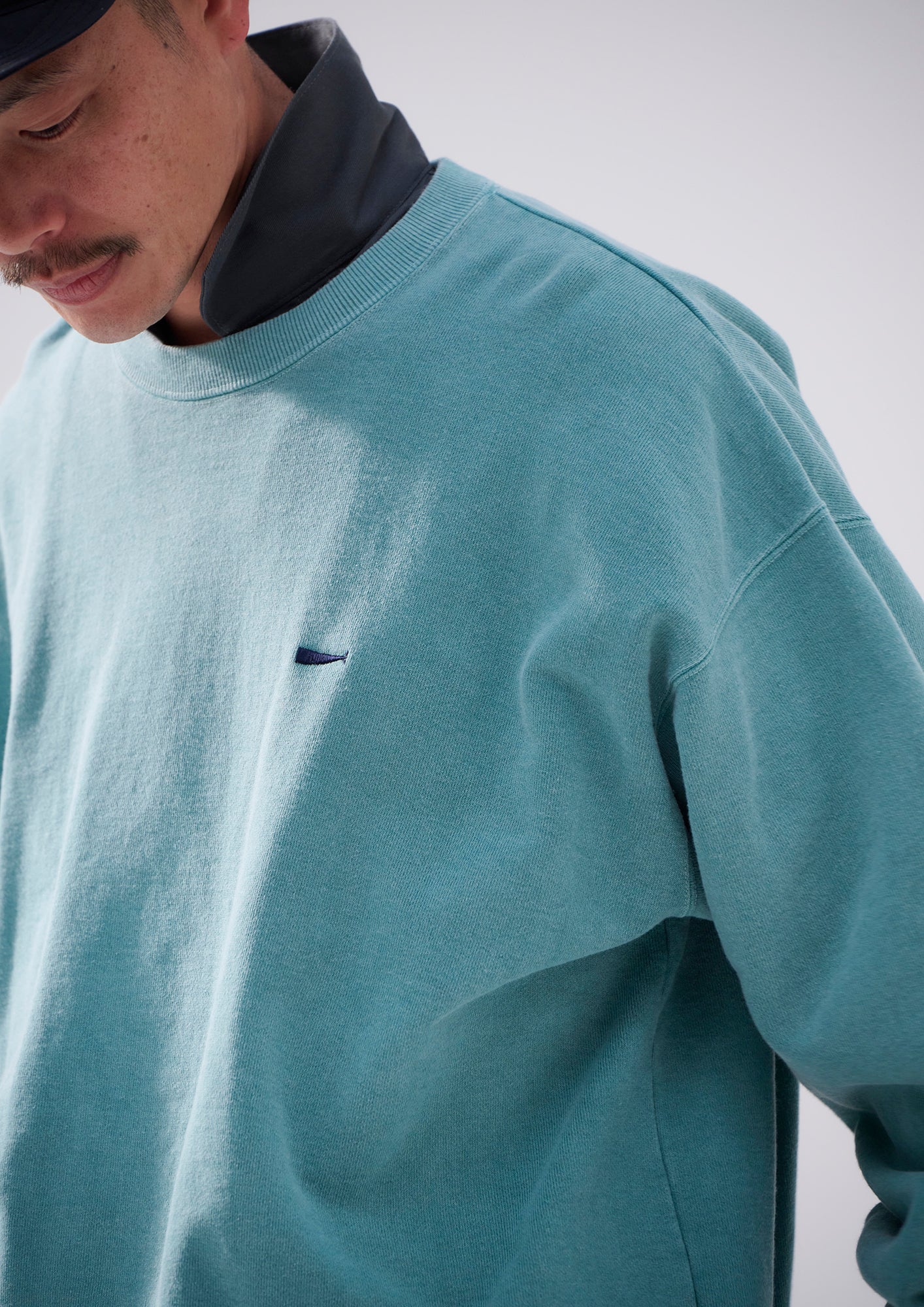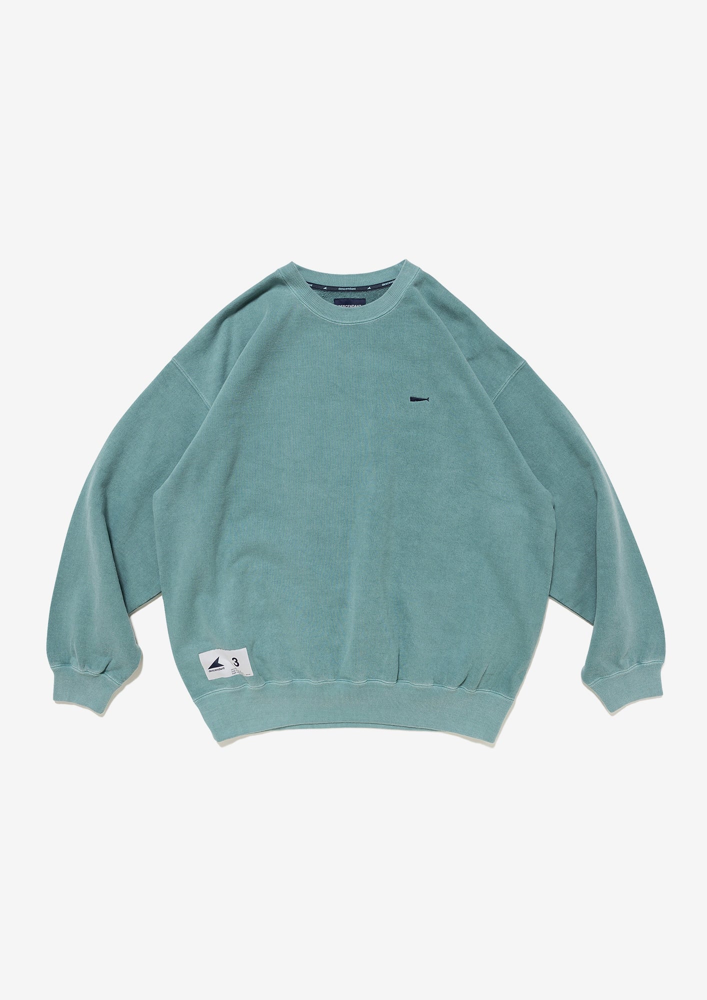Crewneck sweatshirt made of middleweight cotton Terry, with a pigment-dyed finish. Loose, wide-body silhouette with a tapered hem, and the CACHALOT logo embroidered on the left chest. Original brand taping along the seam of the neckline. A woven CETUS size label is attached to the right front hem. Available in two colors: black and green.