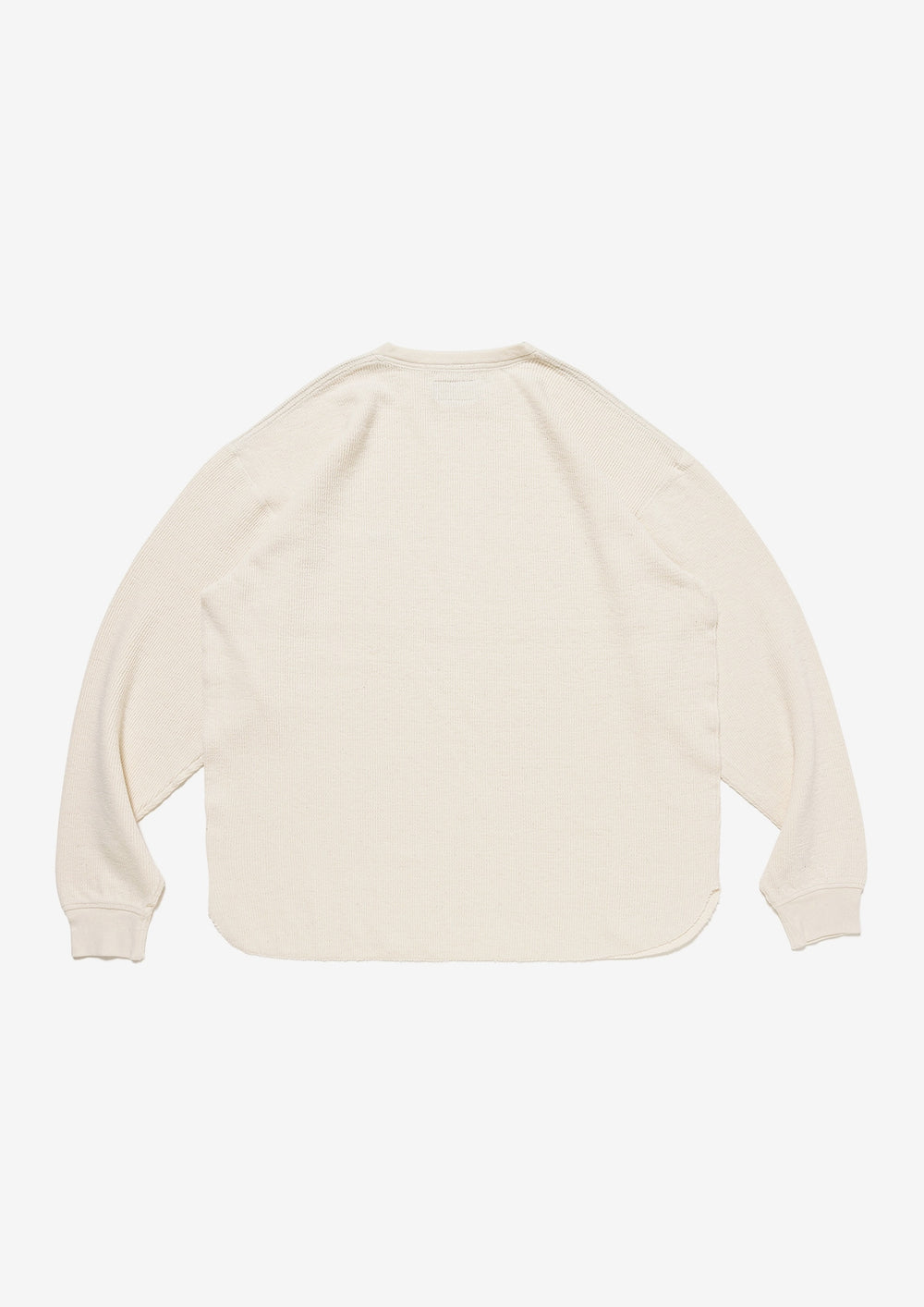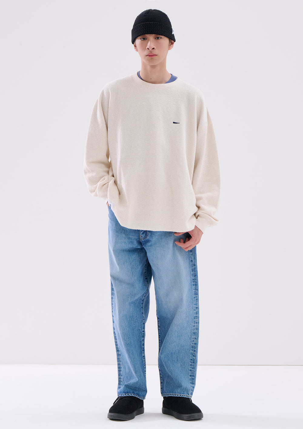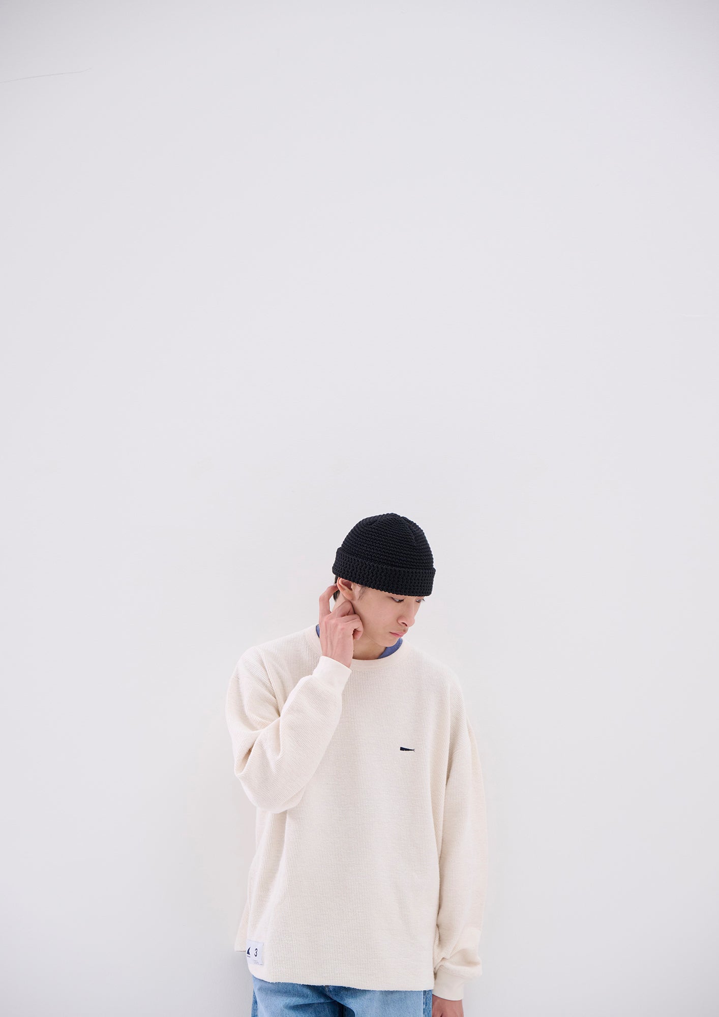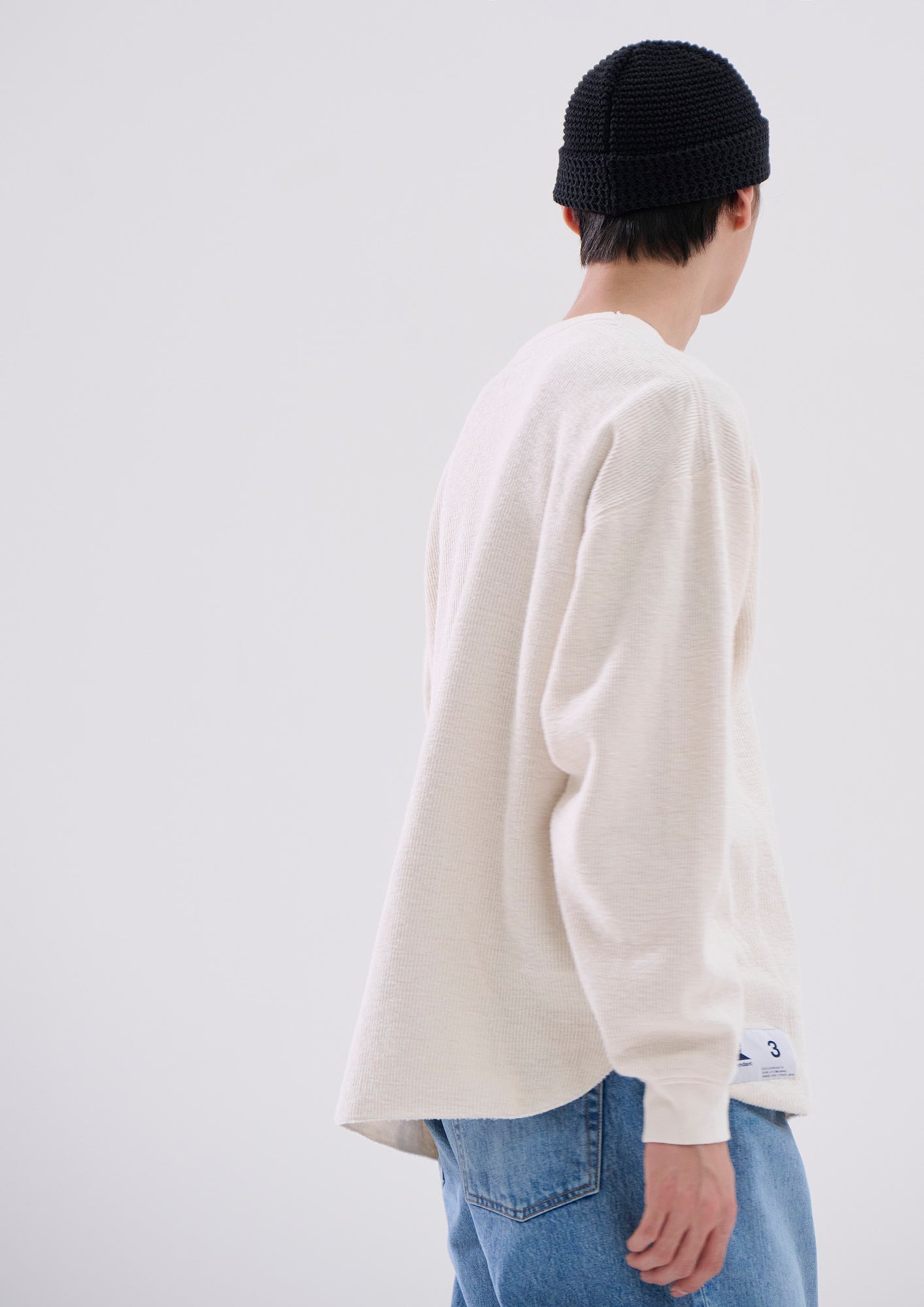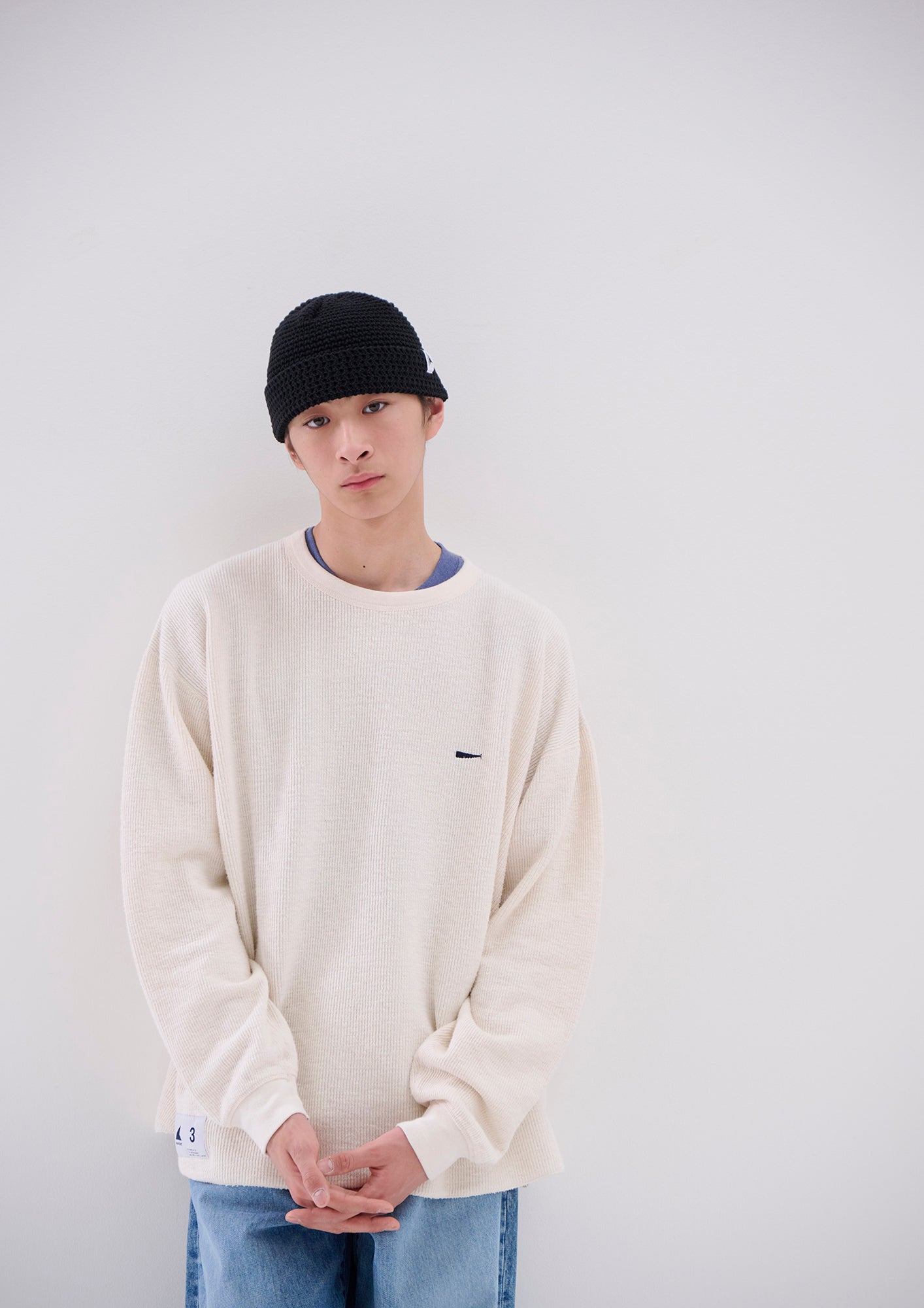 Long-sleeve waffle cut-and-sewn made of cotton gauze. Loose, wide-body silhouette, rounded hem with lock stitching. A binding neck collar and original brand taping along the seam of the neckline. A woven CETUS size label is attached to the right front hem. Available in two colors: navy and white.
