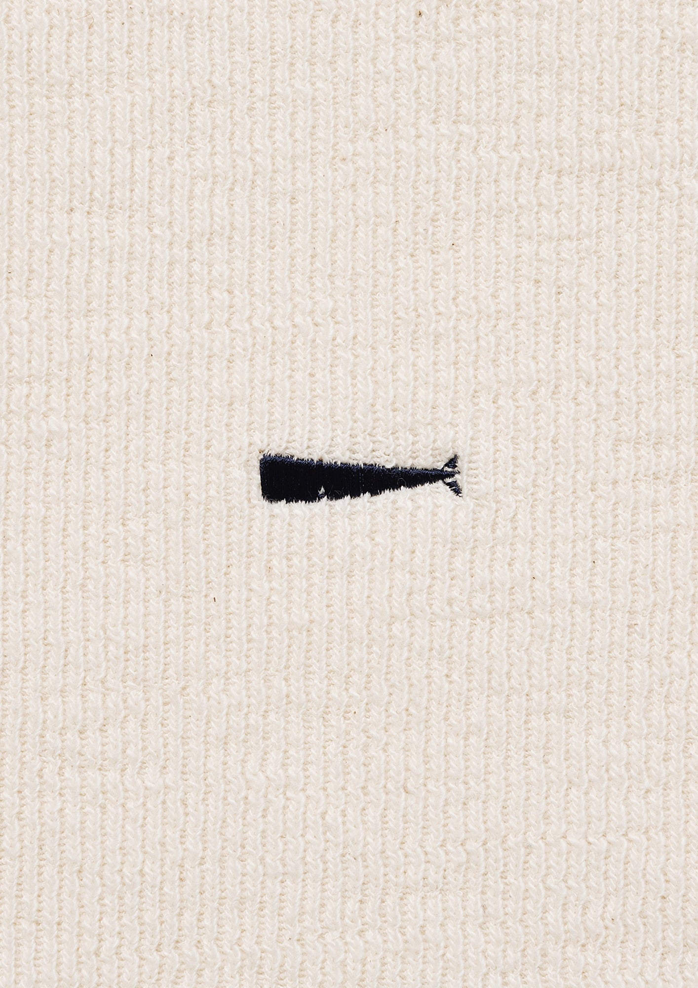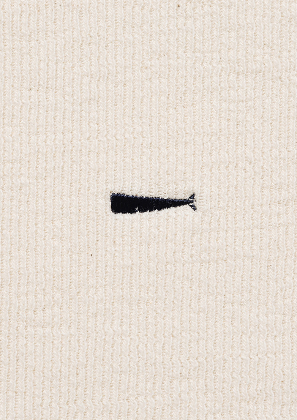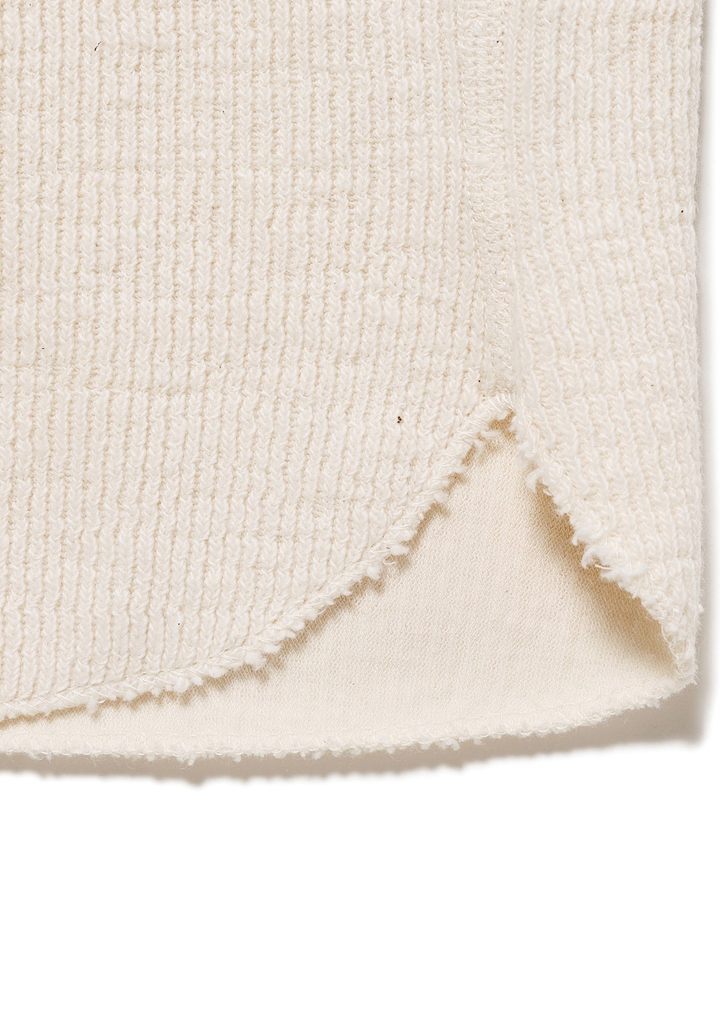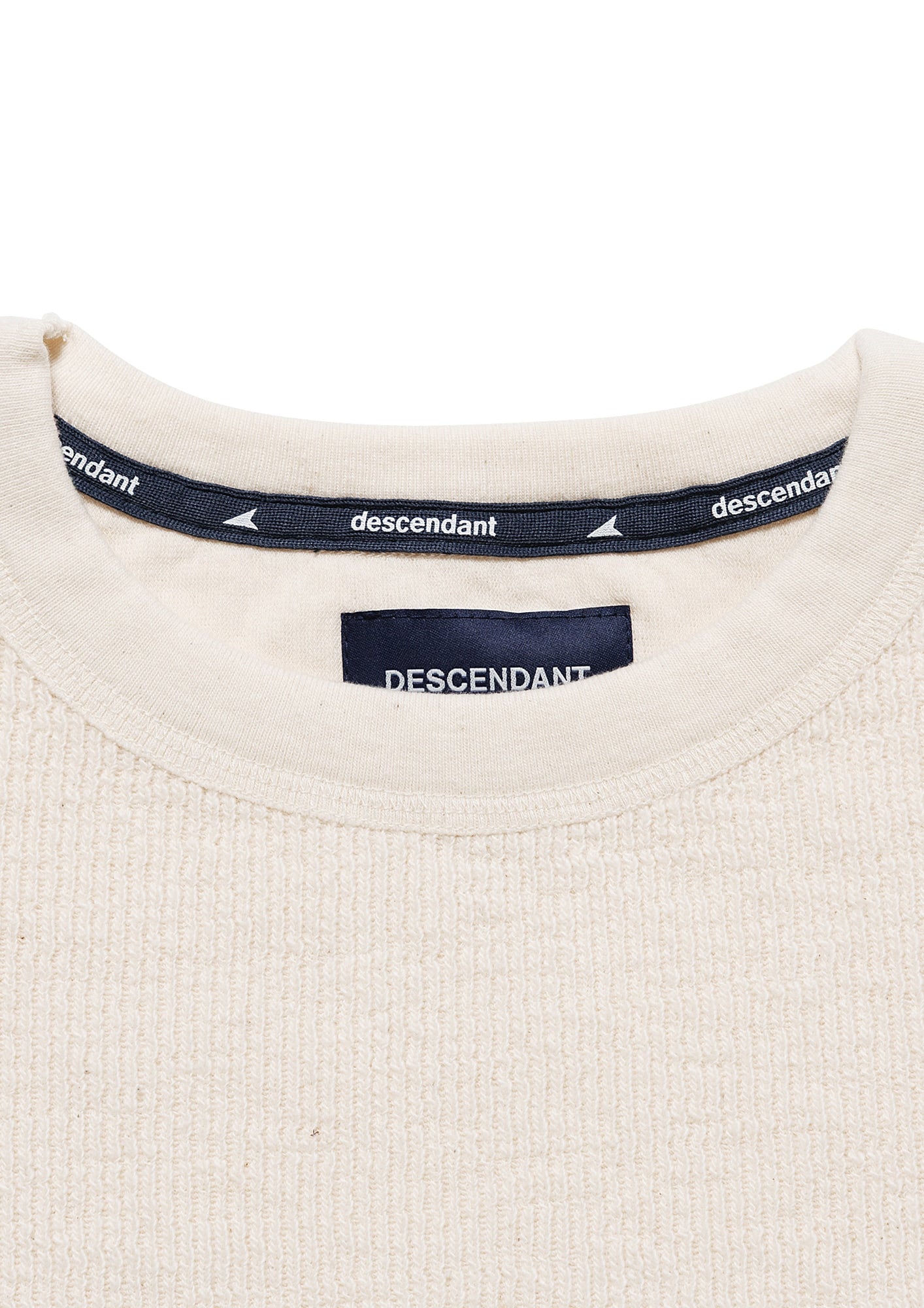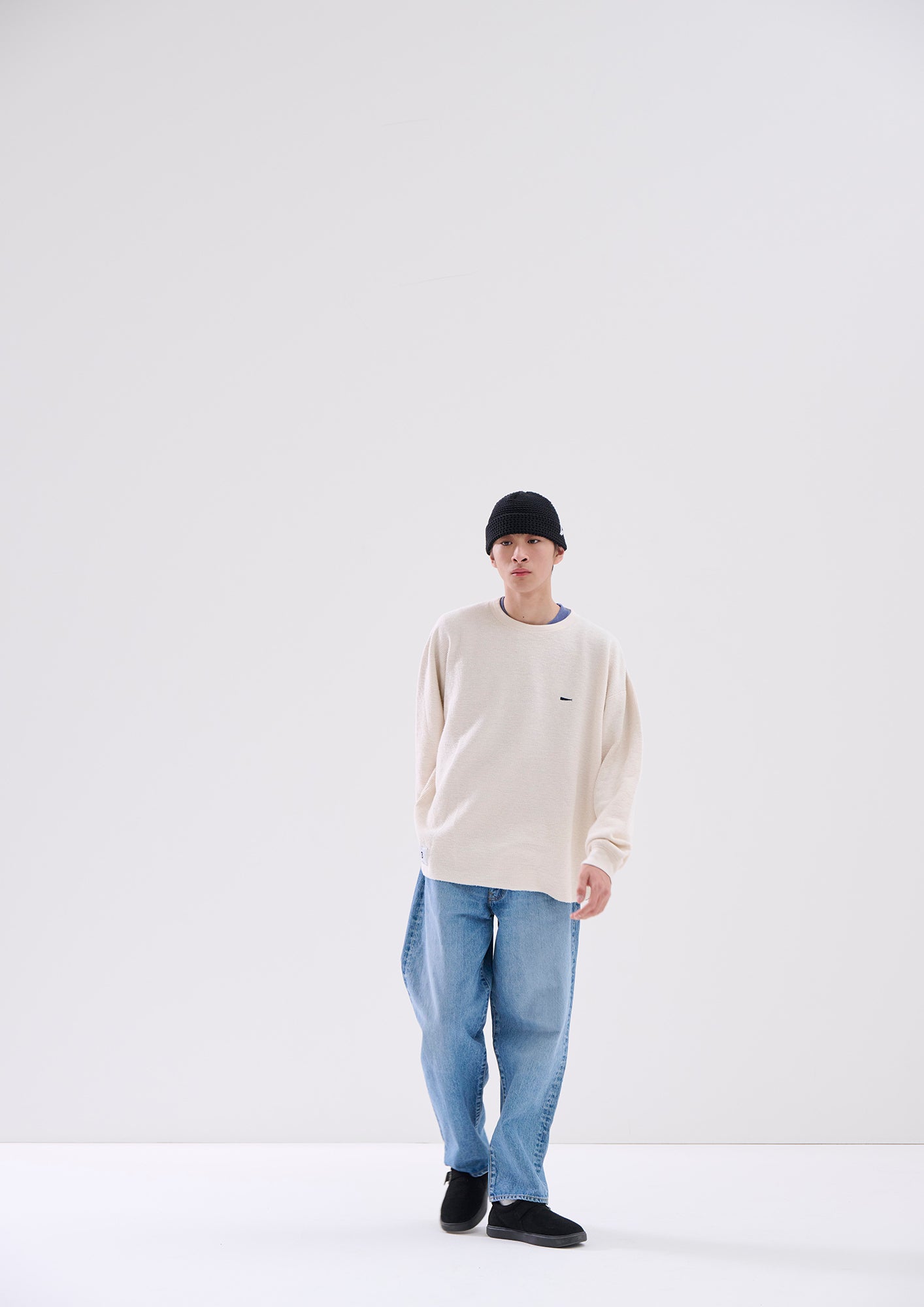 Long-sleeve waffle cut-and-sewn made of cotton gauze. Loose, wide-body silhouette, rounded hem with lock stitching. A binding neck collar and original brand taping along the seam of the neckline. A woven CETUS size label is attached to the right front hem. Available in two colors: navy and white.