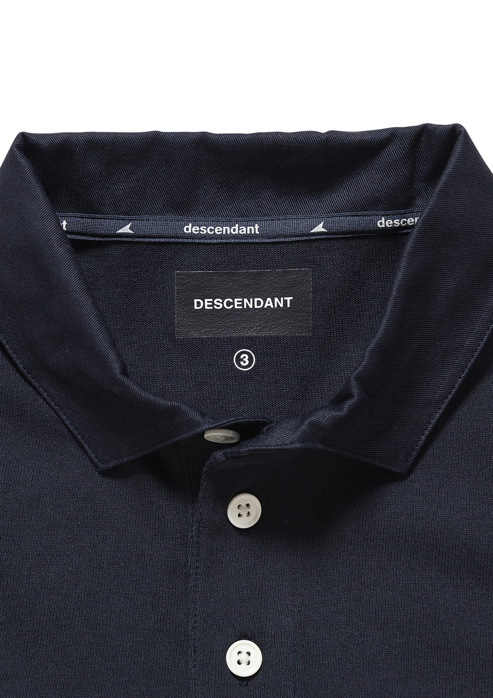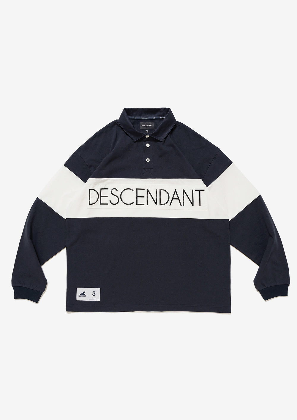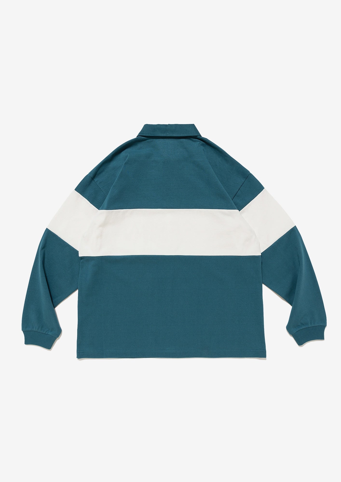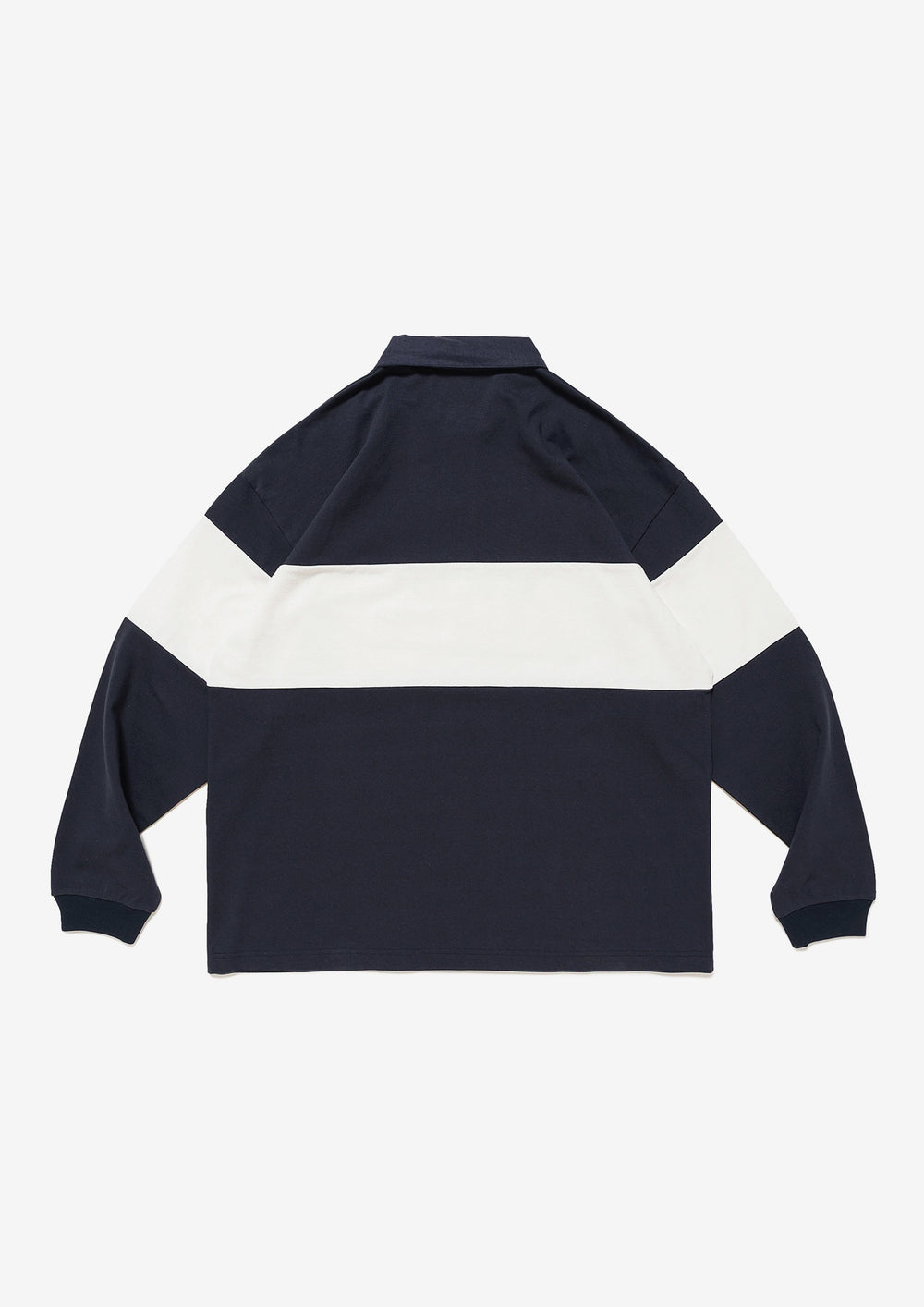 Long-sleeve polo, based on a rugby shirt, made from tightly knit cotton jersey using a dry-textured open-end yarn. Loose, wide-body silhouette, half placket, and a twill fabric collar in the same color. The front body and both sleeves are paneled with white self-fabric, and a STRAIN logo print patch is sewn onto the front body. Original brand taping along the seam of the neckline. A woven CETUS size label is attached to the right front hem.
