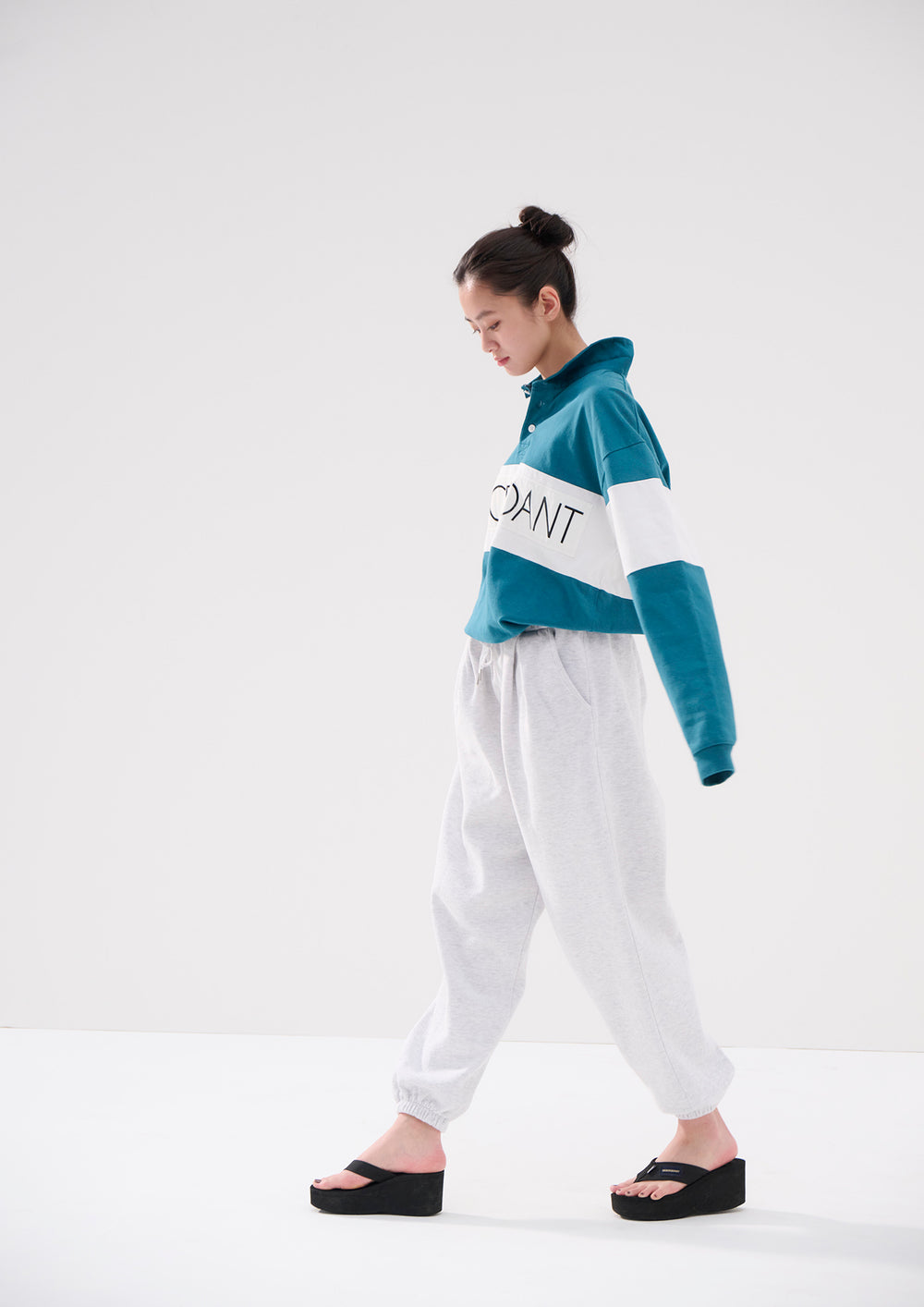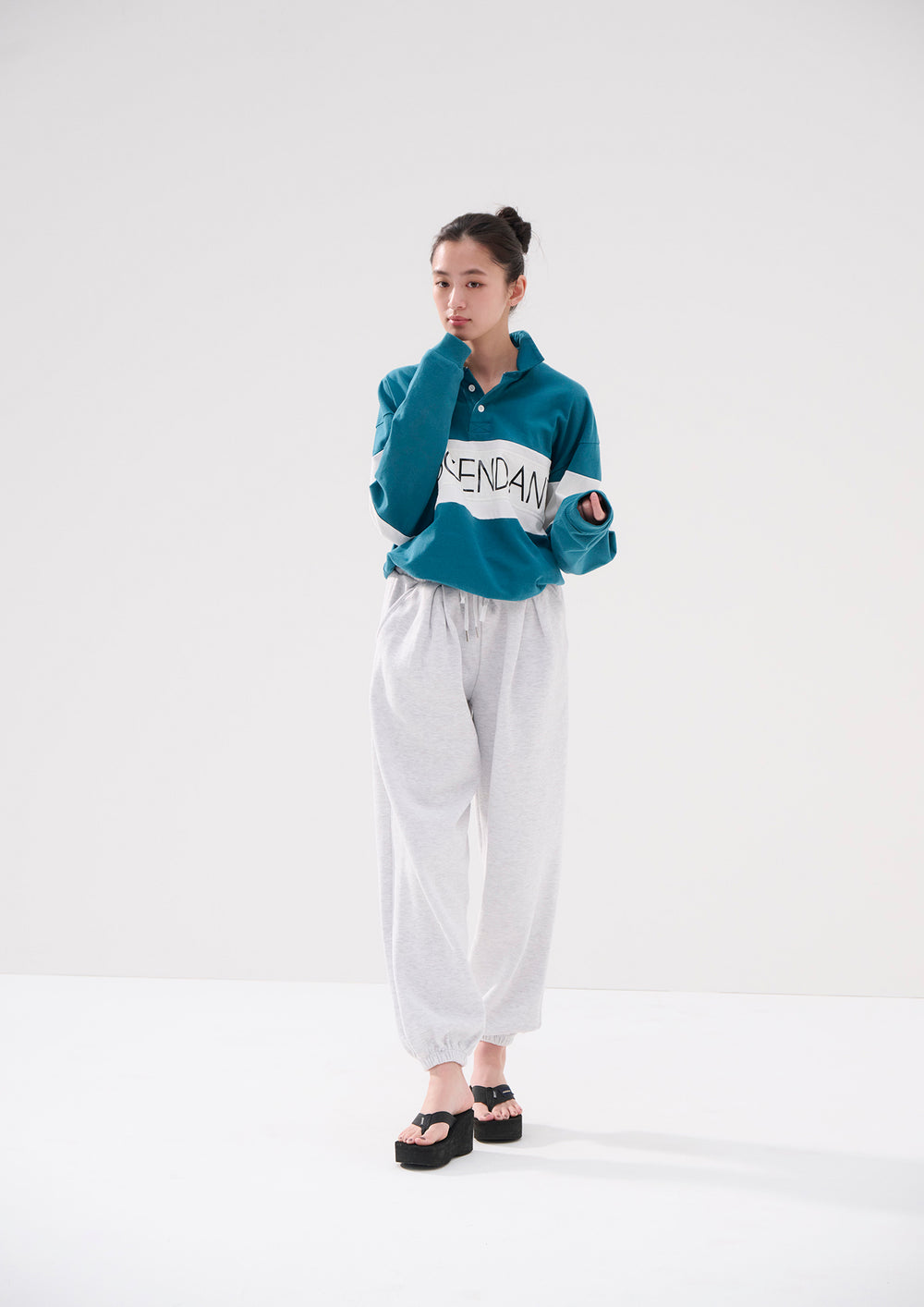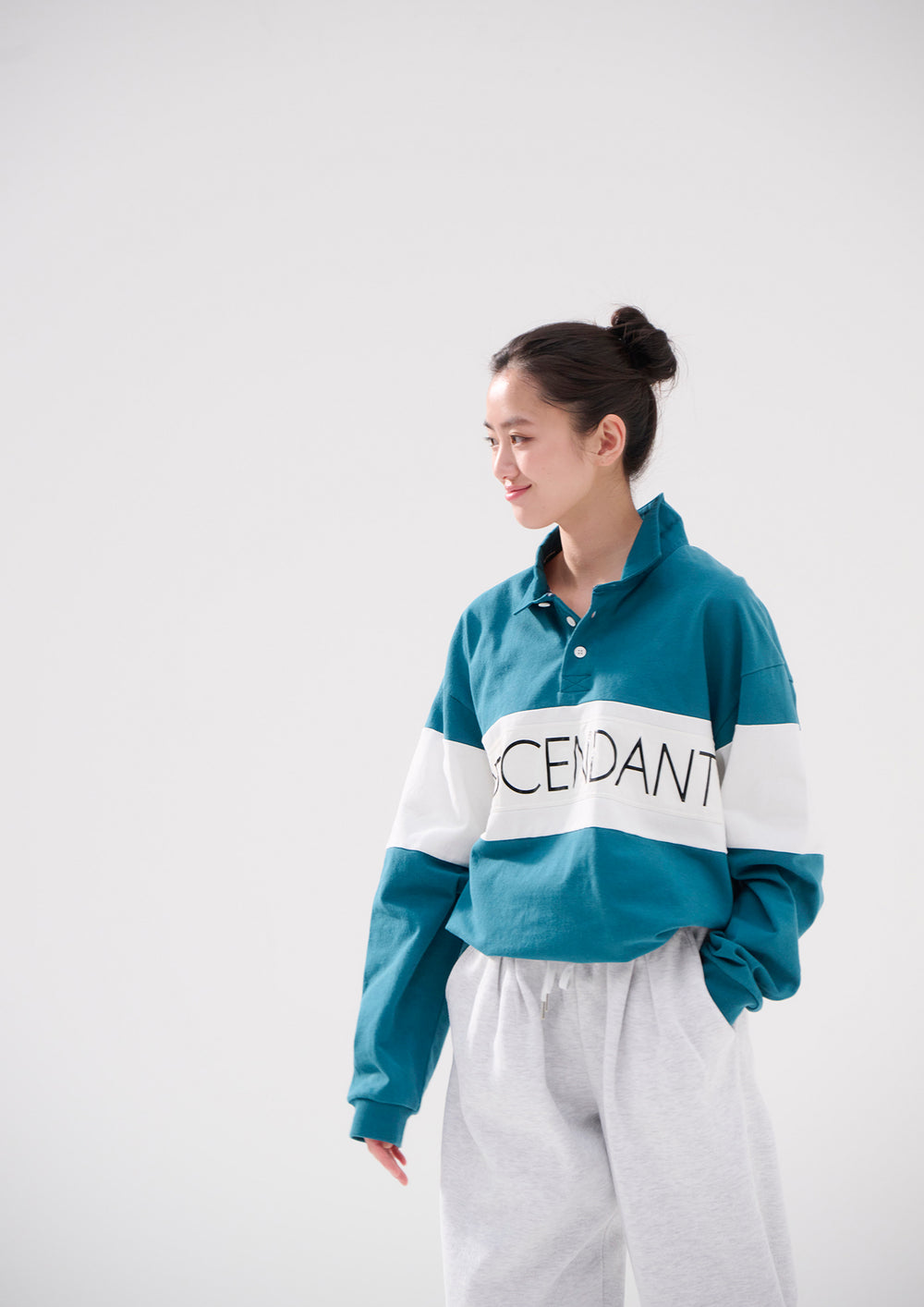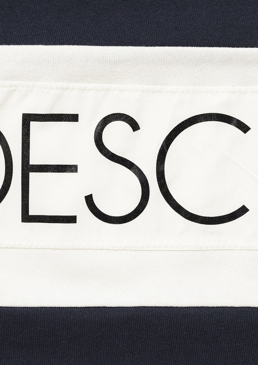 Long-sleeve polo, based on a rugby shirt, made from tightly knit cotton jersey using a dry-textured open-end yarn. Loose, wide-body silhouette, half placket, and a twill fabric collar in the same color. The front body and both sleeves are paneled with white self-fabric, and a STRAIN logo print patch is sewn onto the front body. Original brand taping along the seam of the neckline. A woven CETUS size label is attached to the right front hem.