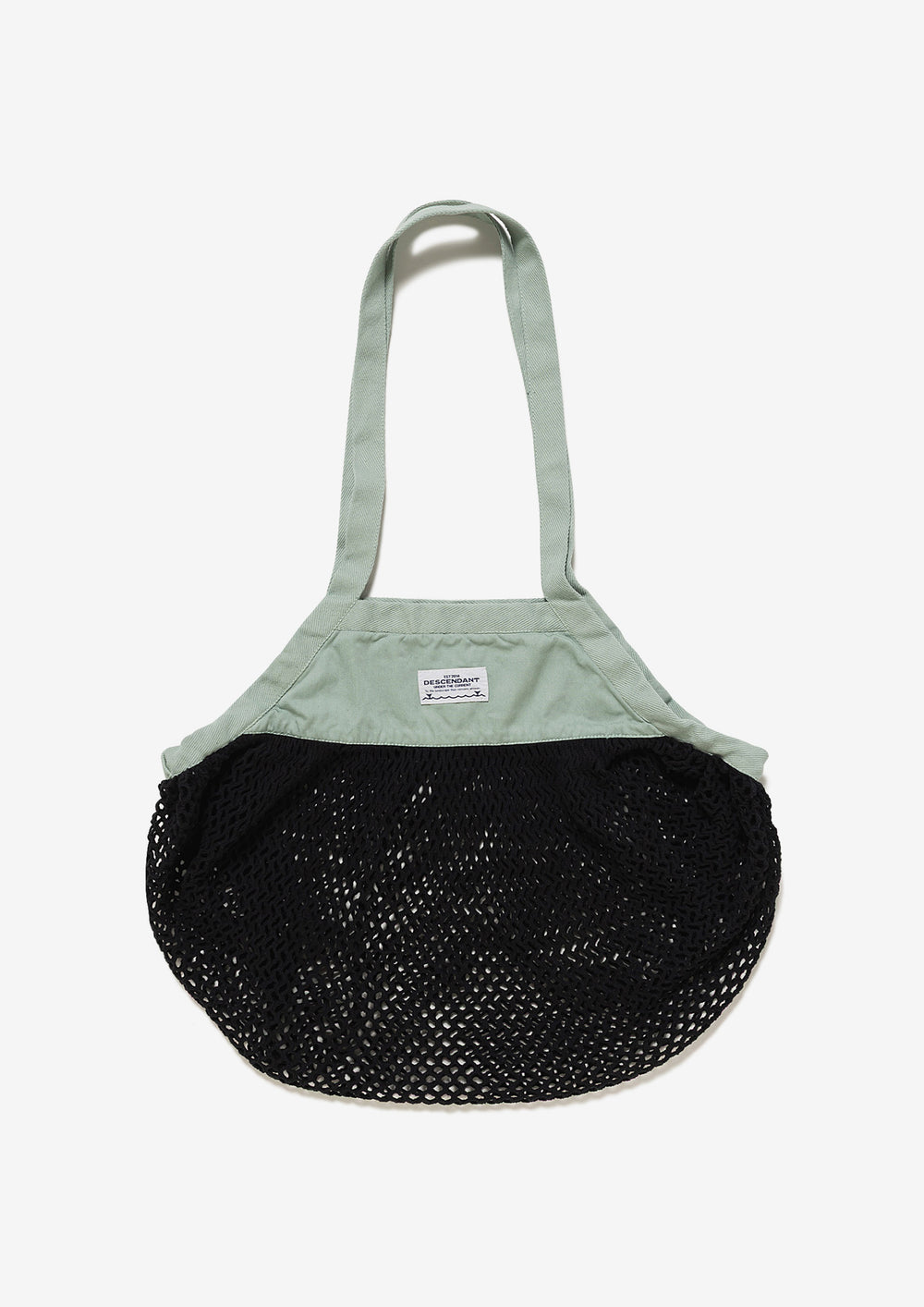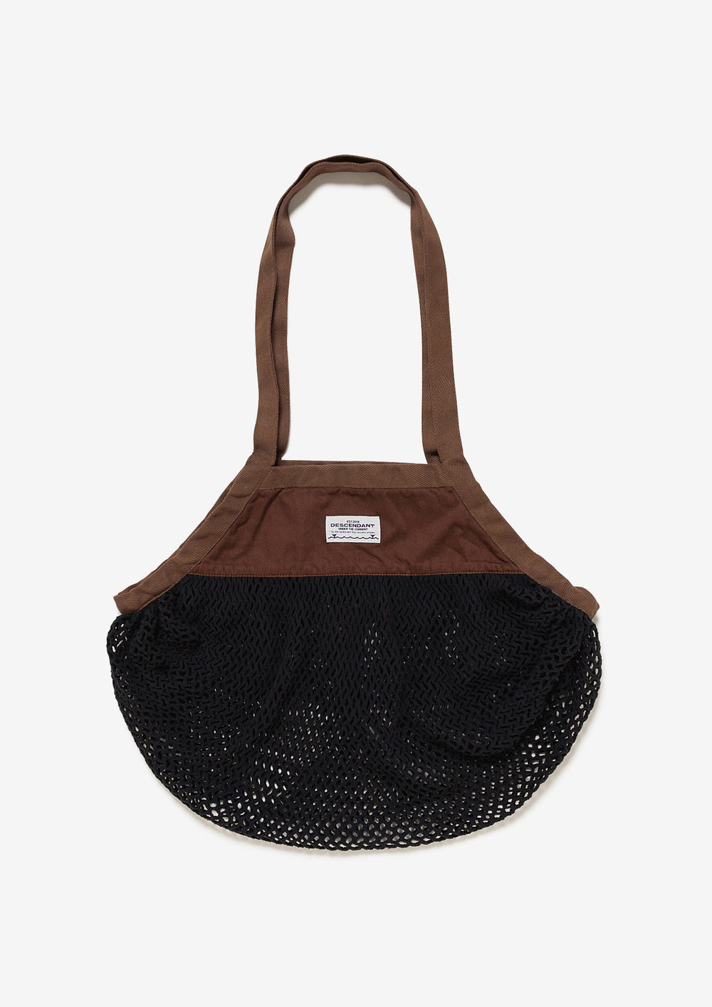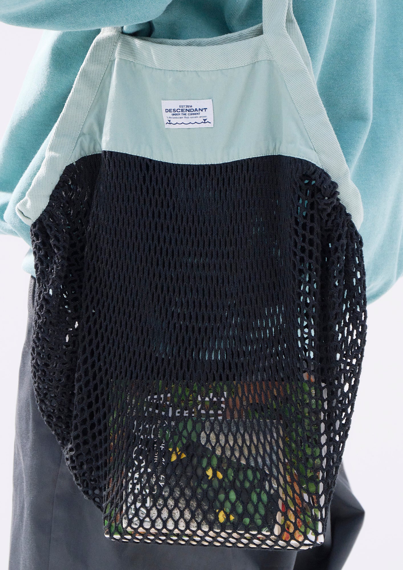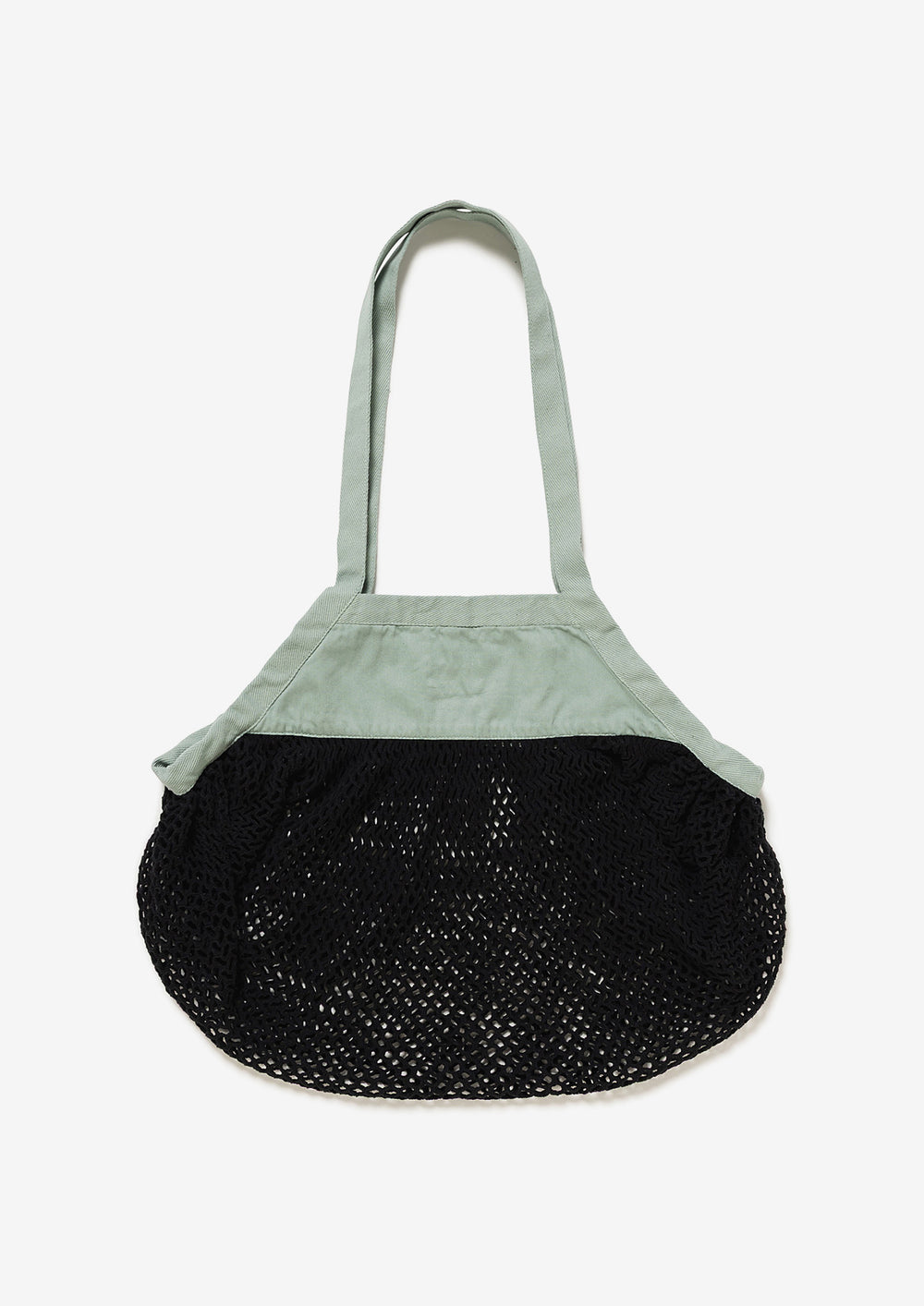A shoulder bag made from cotton twill with mesh panel accents. Designed with grosgrain tape handles and trim. Features a woven label depicting a whale’s tail fin emerging from the waves. Available in two colors: brown and mint.