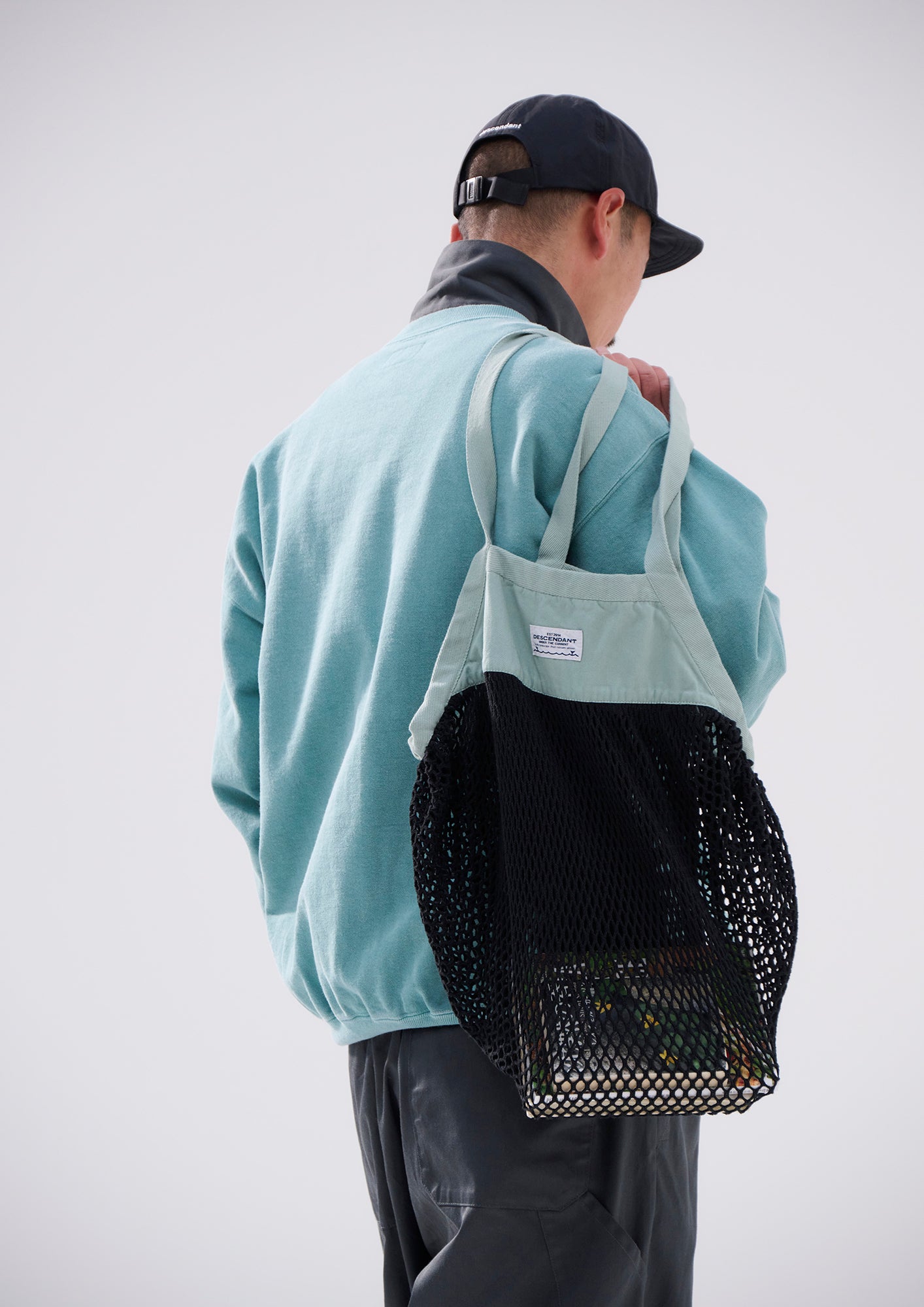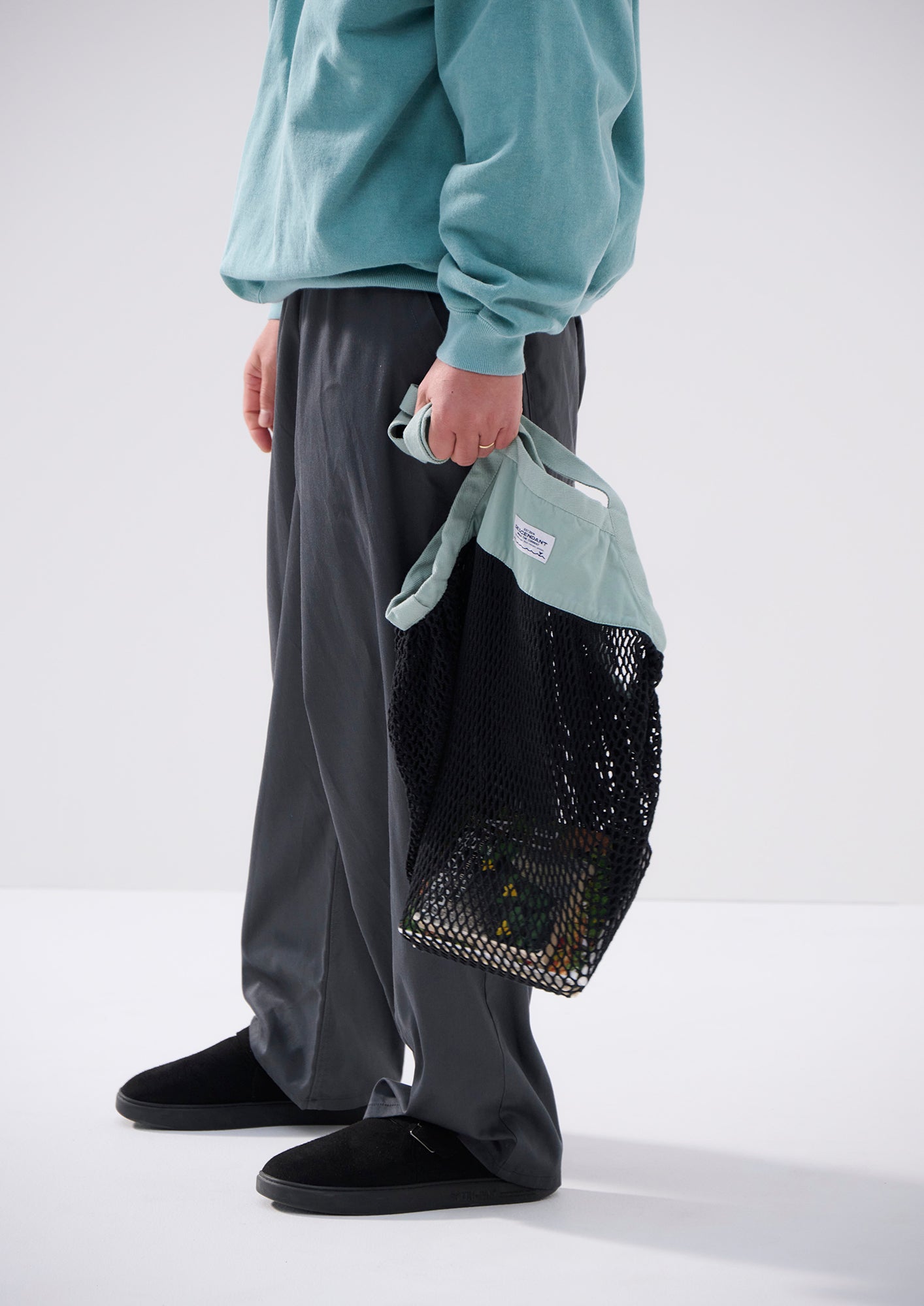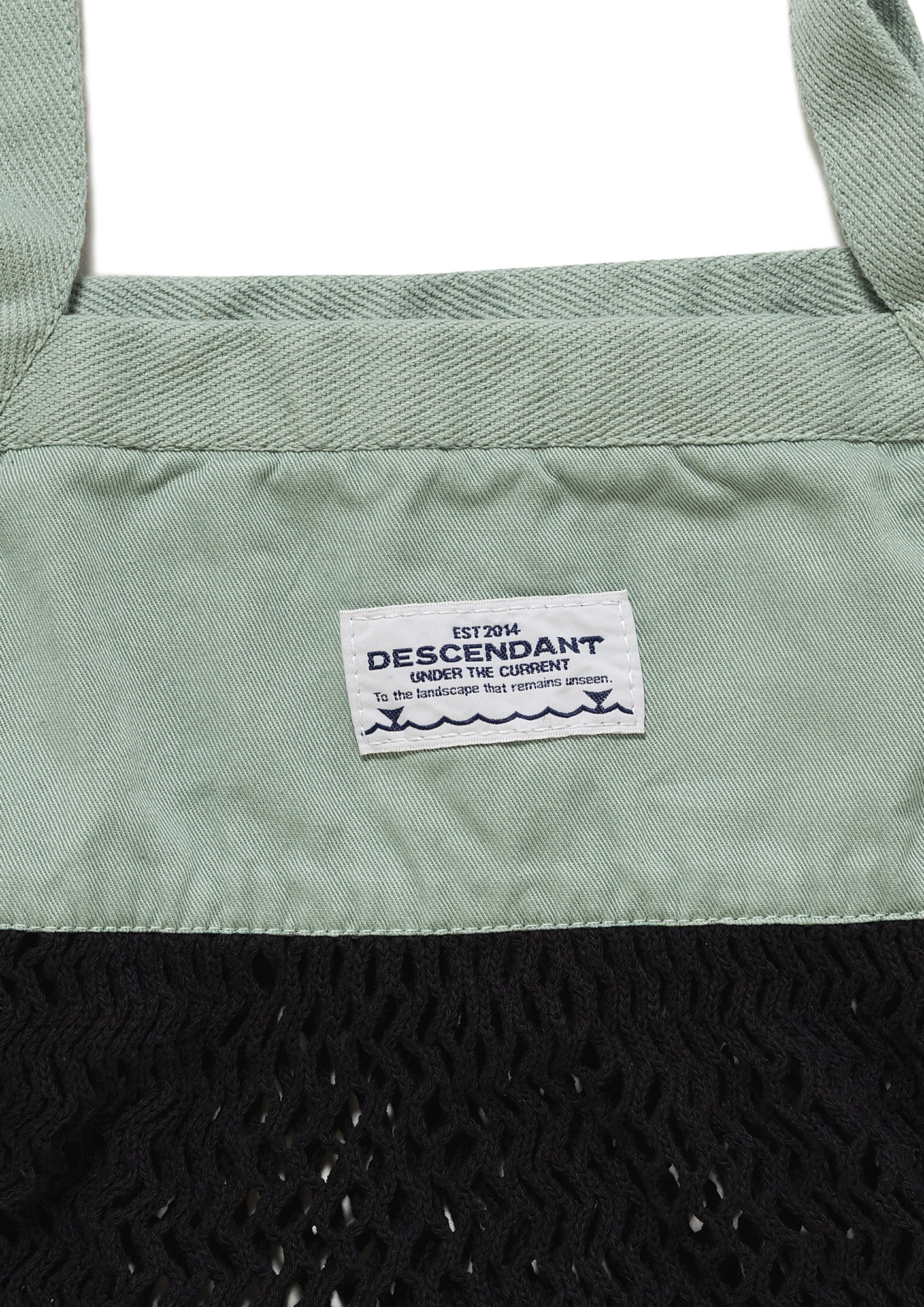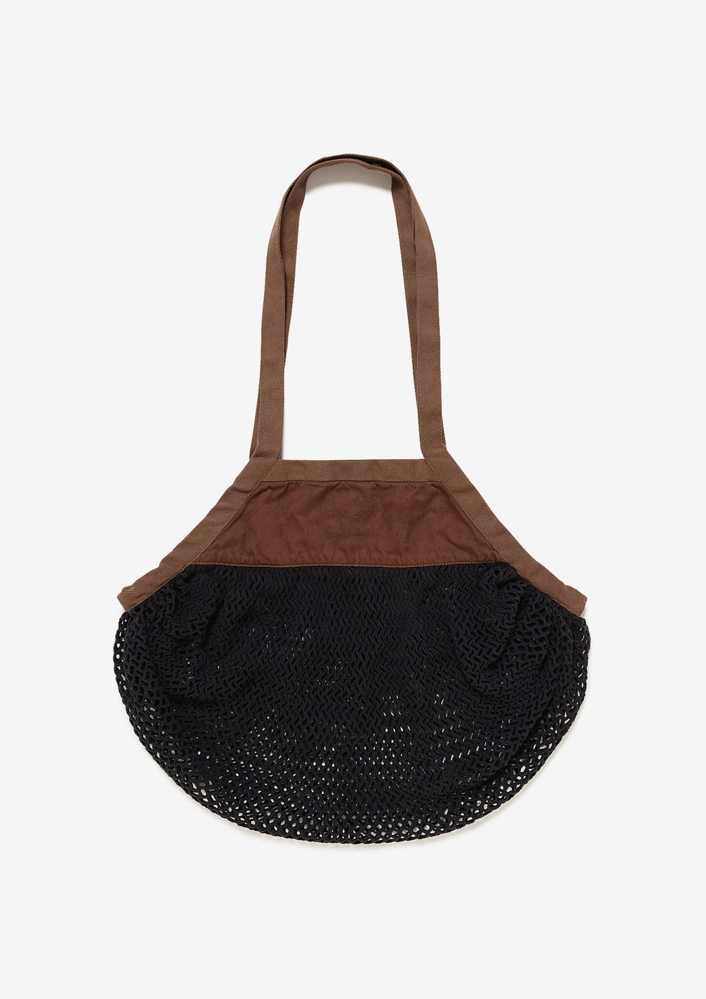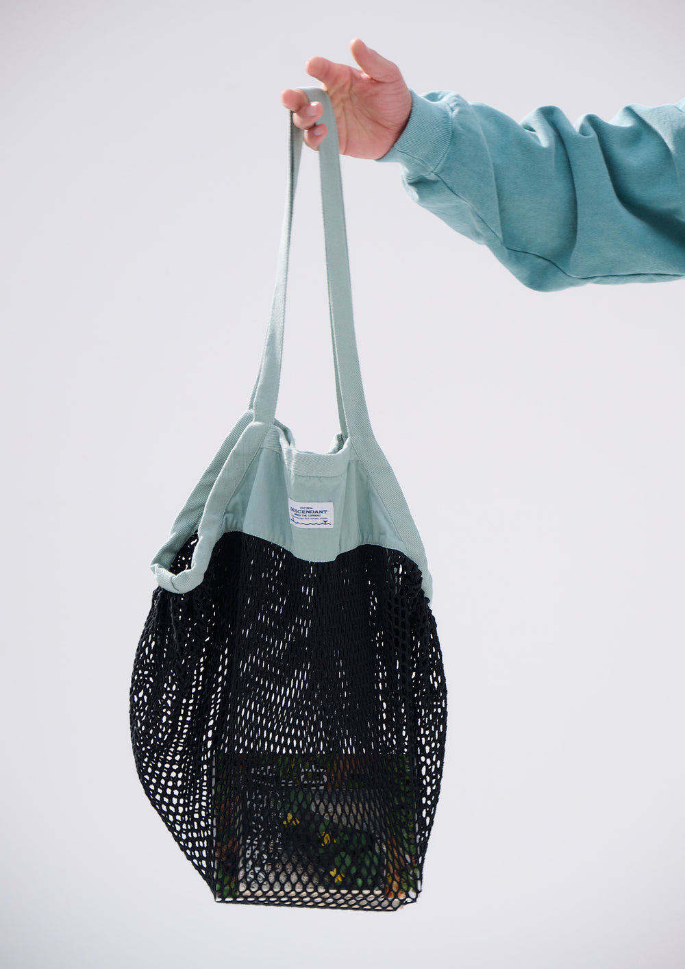 A shoulder bag made from cotton twill with mesh panel accents. Designed with grosgrain tape handles and trim. Features a woven label depicting a whale’s tail fin emerging from the waves. Available in two colors: brown and mint.