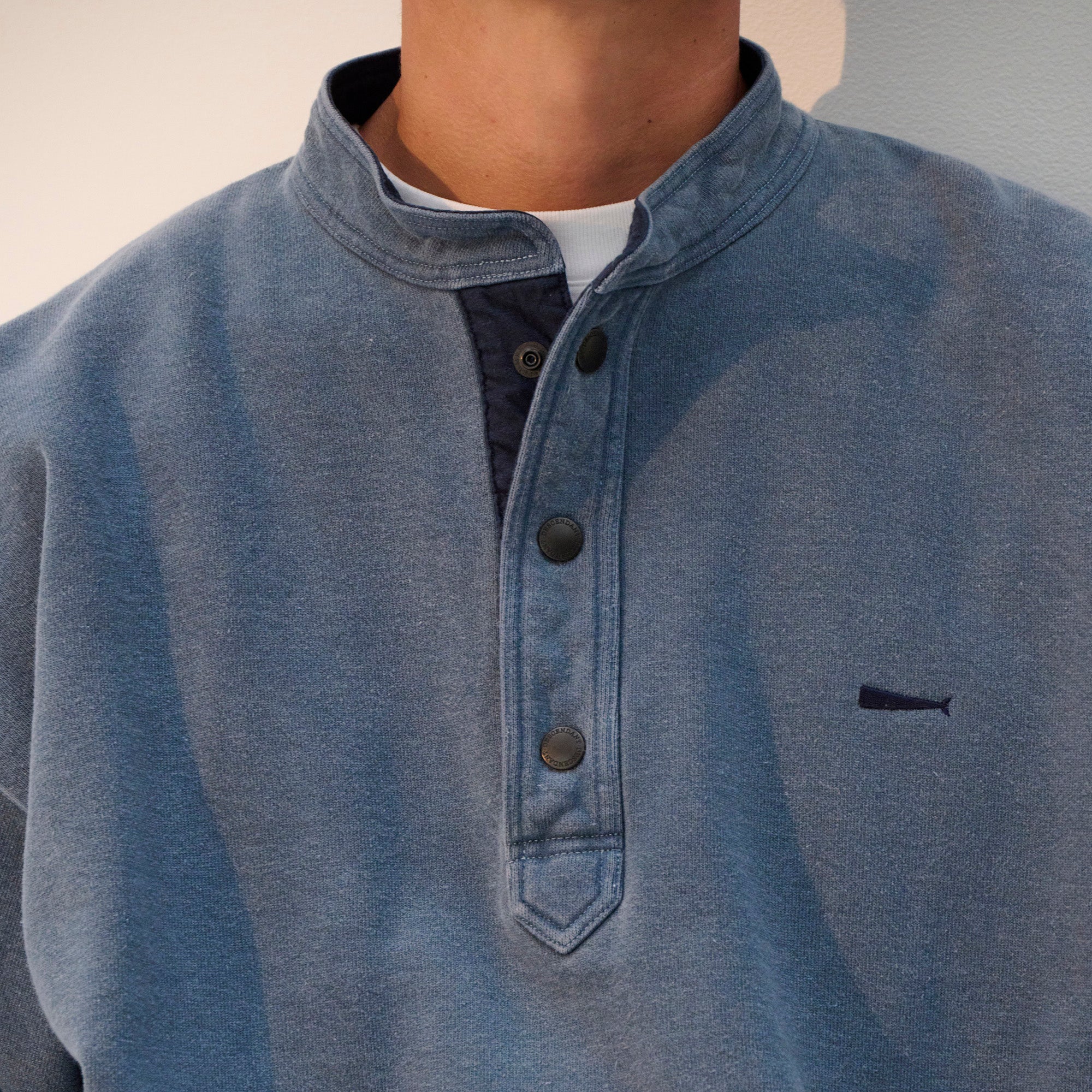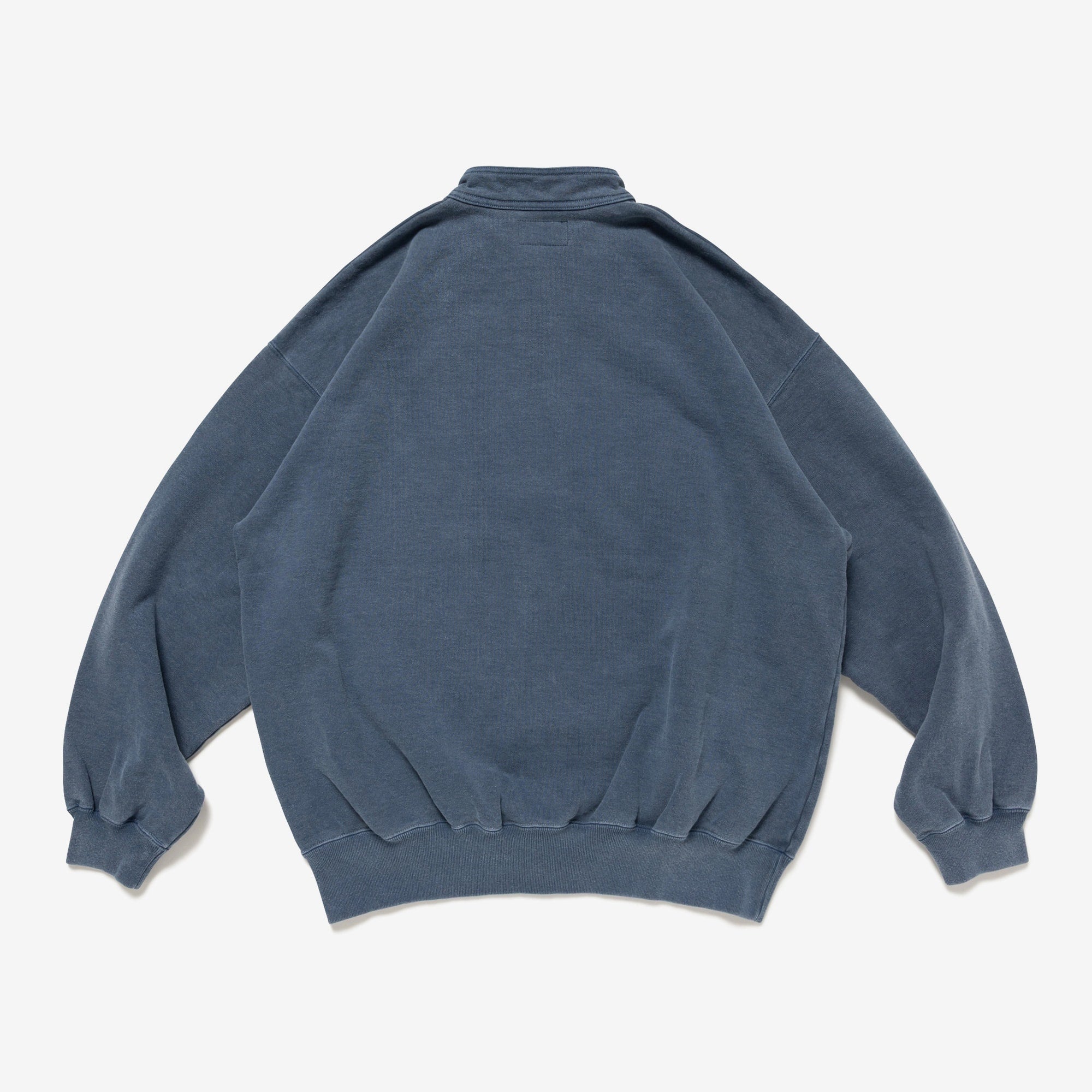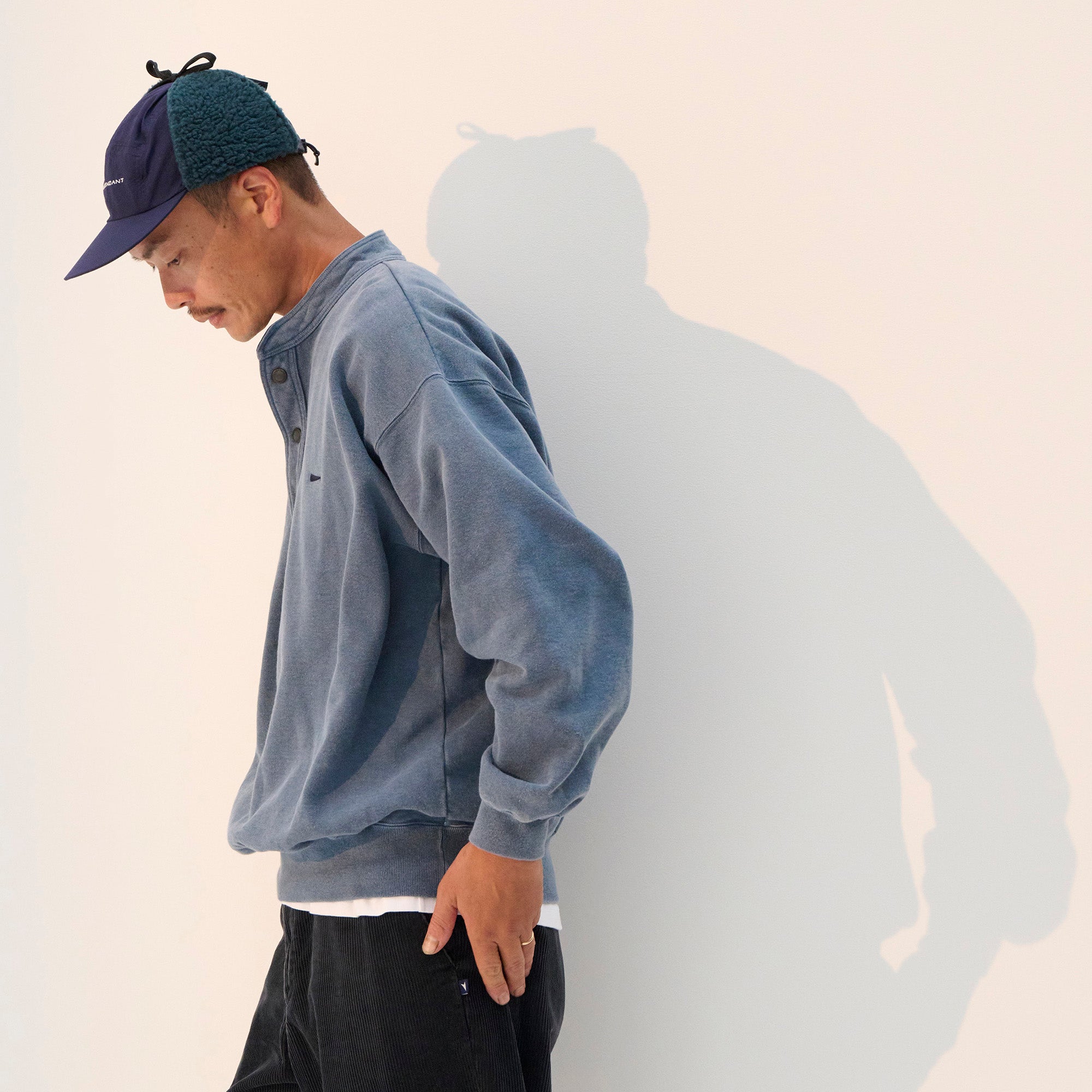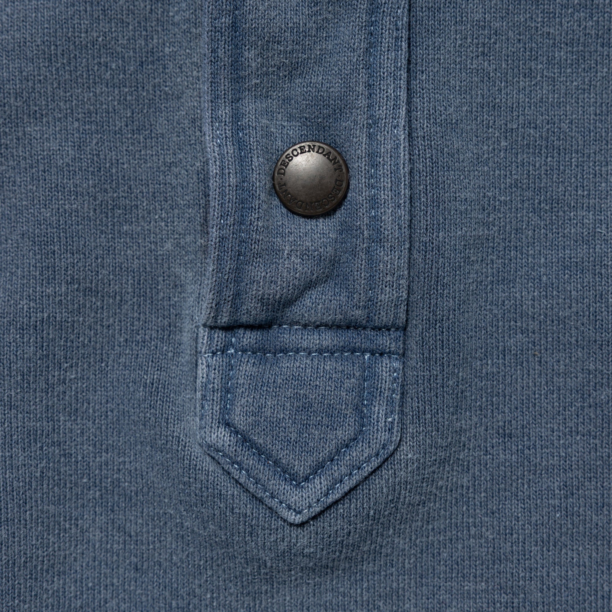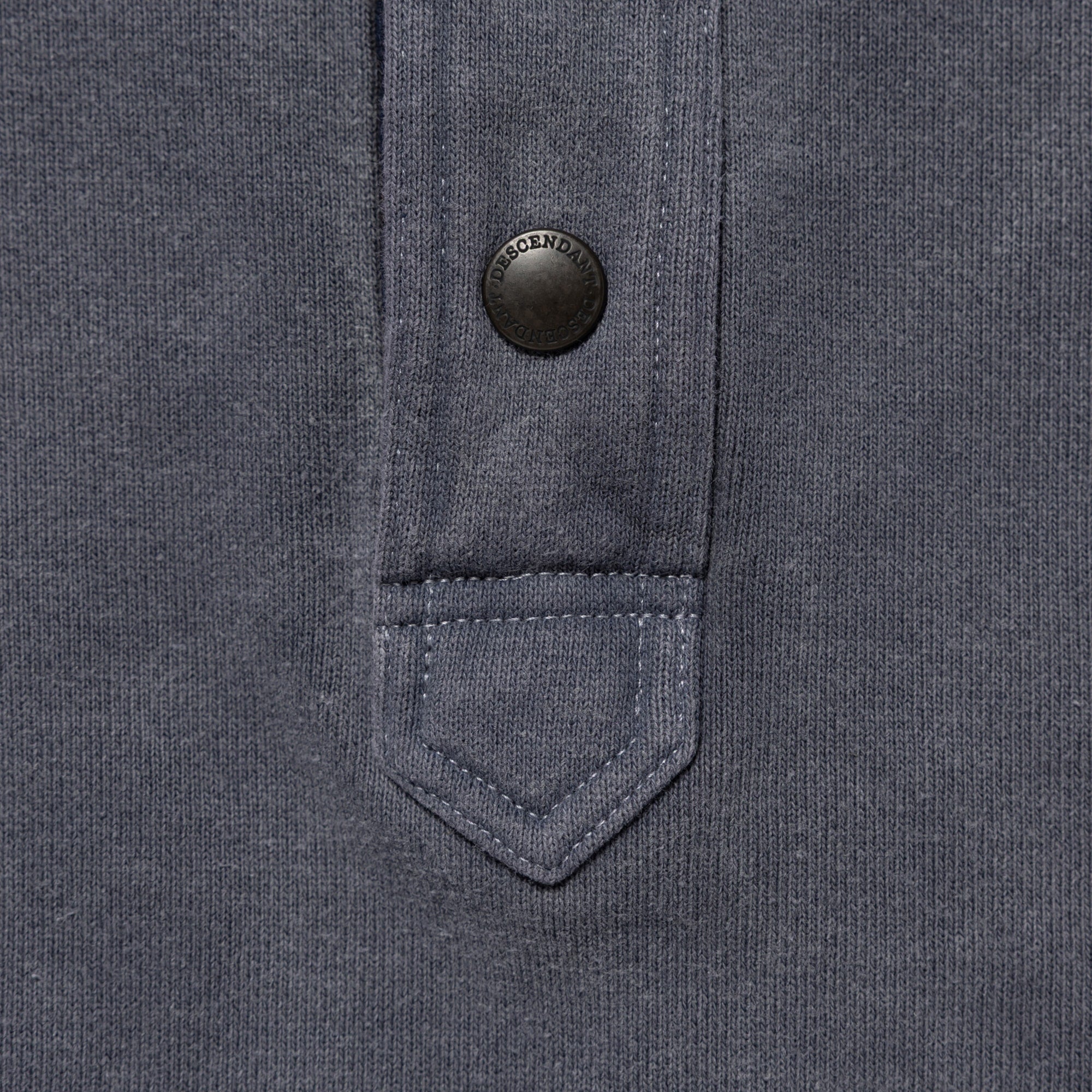厚手のコットン裏毛を使用し、前襟にスナップボタン留めのハーフプラケットを設えたDESCENDANT定番のプルオーバースウェットシャツ。襟裏の当て布はそれぞれ濃い同系色、ピグメントダイ加工によるくすんだブラック、ネイビー、ブルーを3色展開。右前裾にサイズを表示したCETUSの織りネーム付き。
