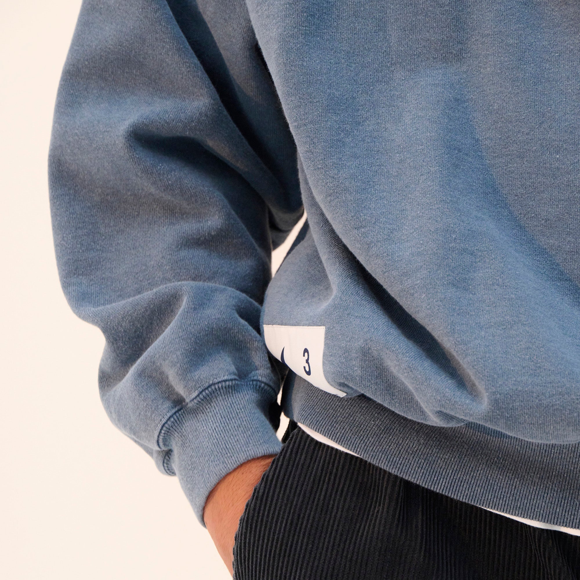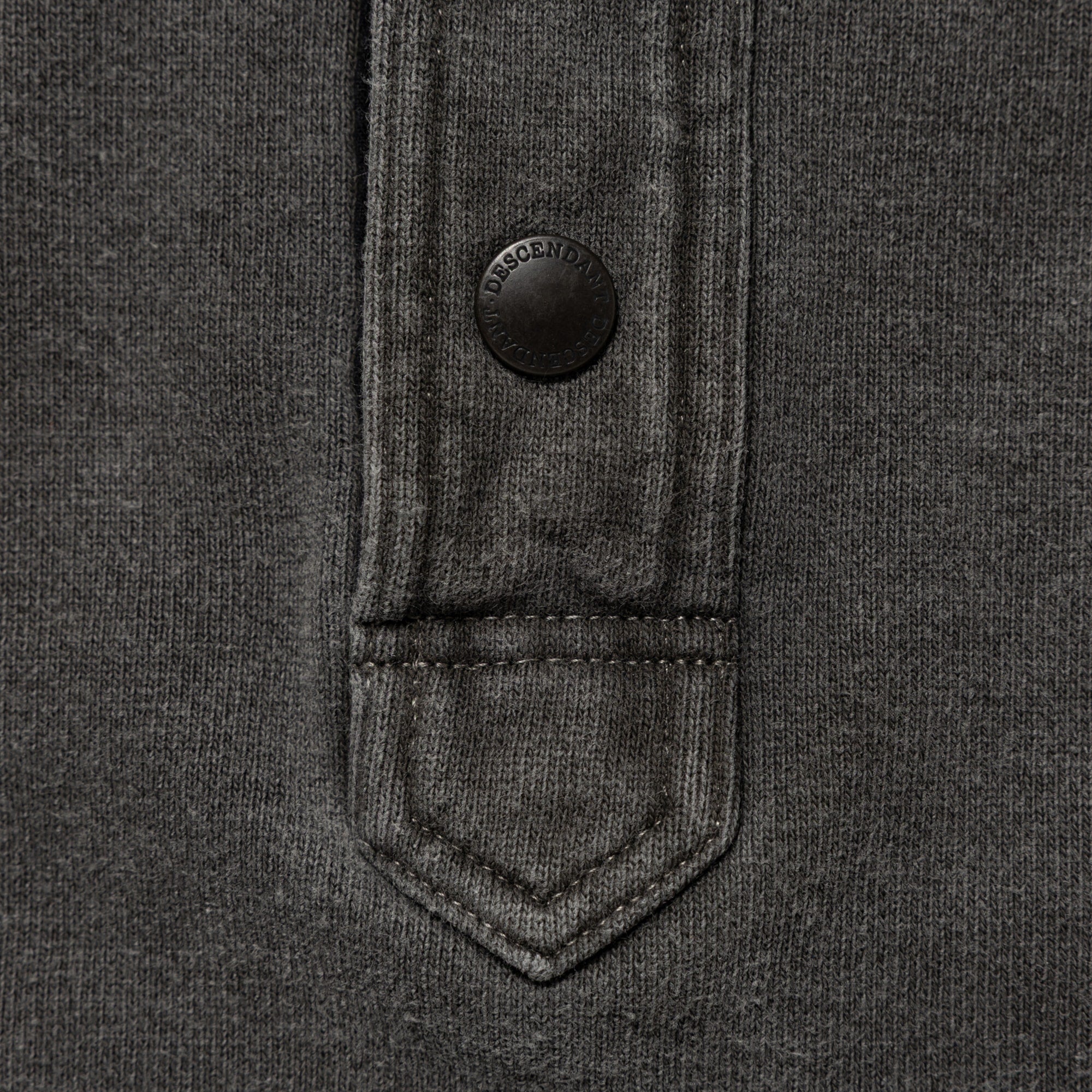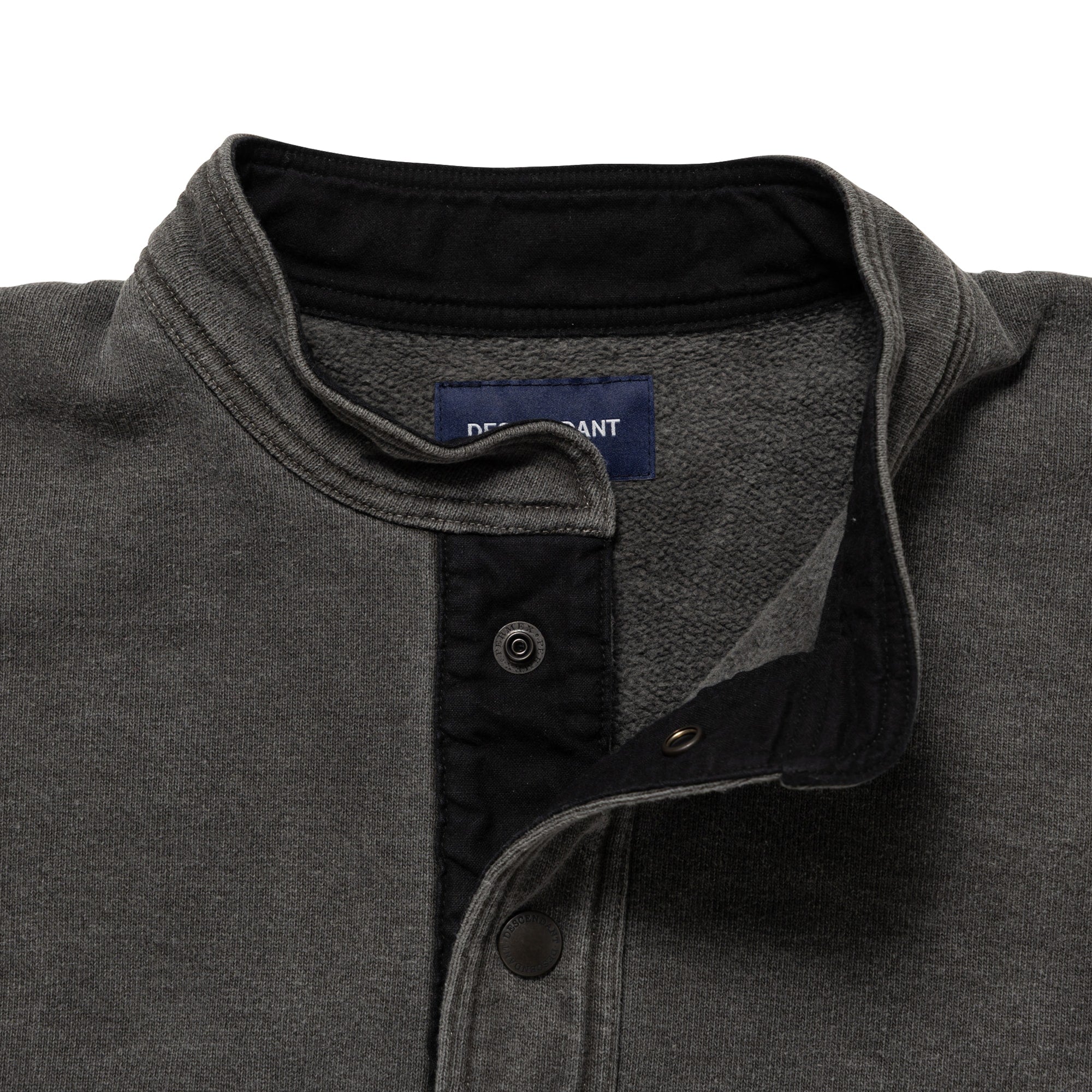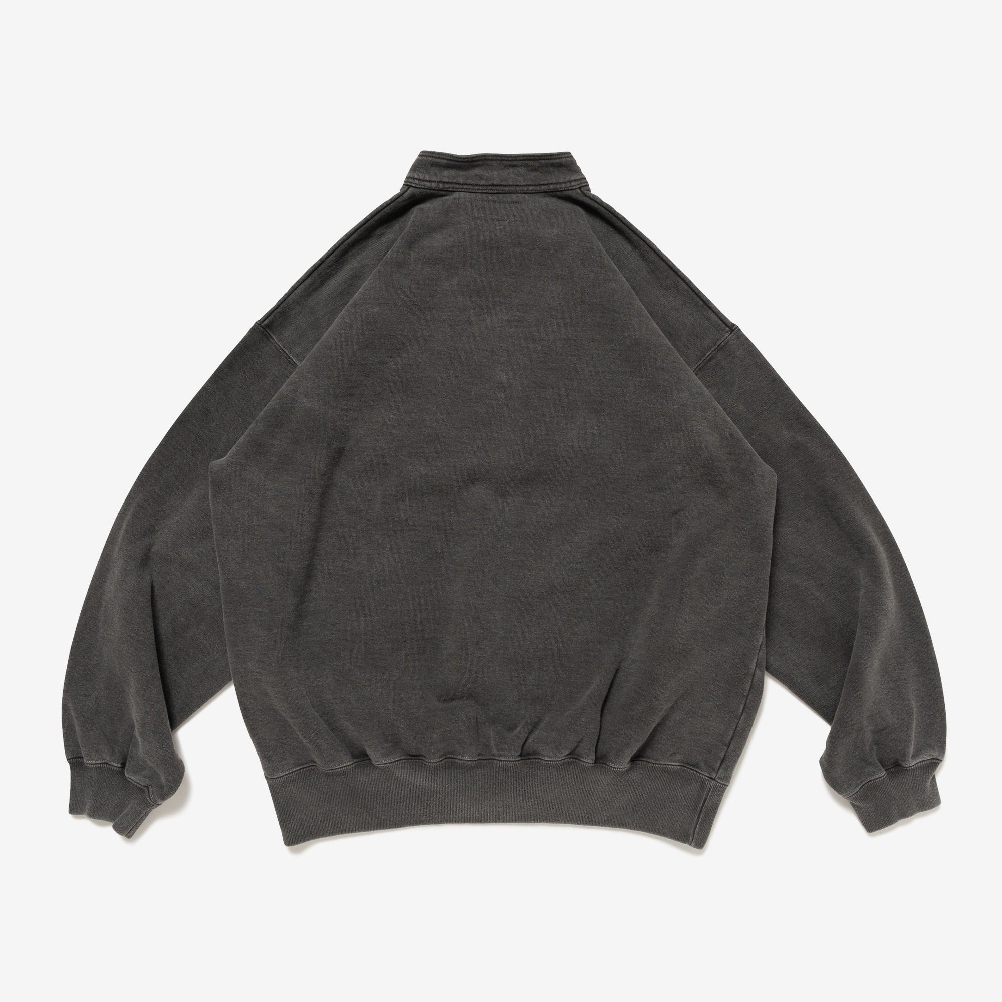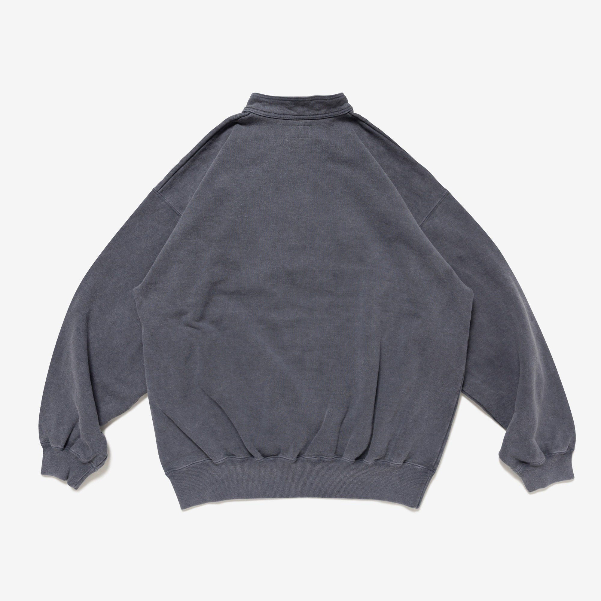 厚手のコットン裏毛を使用し、前襟にスナップボタン留めのハーフプラケットを設えたDESCENDANT定番のプルオーバースウェットシャツ。襟裏の当て布はそれぞれ濃い同系色、ピグメントダイ加工によるくすんだブラック、ネイビー、ブルーを3色展開。右前裾にサイズを表示したCETUSの織りネーム付き。