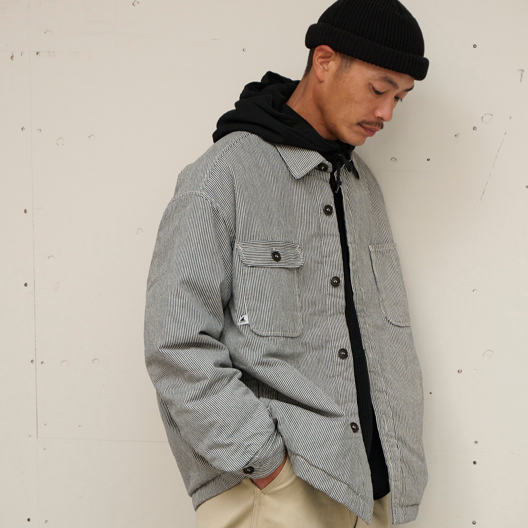 アメリカで創業した日本のヴィンテージワークウェアブランド、Post O’Alls(ポストオーバーオールズ)とのコラボレーション。コットン製のヒッコリーストライプ生地を使用したライニング仕様のシャツジャケット。身幅のゆったりしたボックスシルエットの裏地にキルティング加工を施し、前身頃の左右にフラップ有り無しのバストポケットを配したガチャポケ仕様。