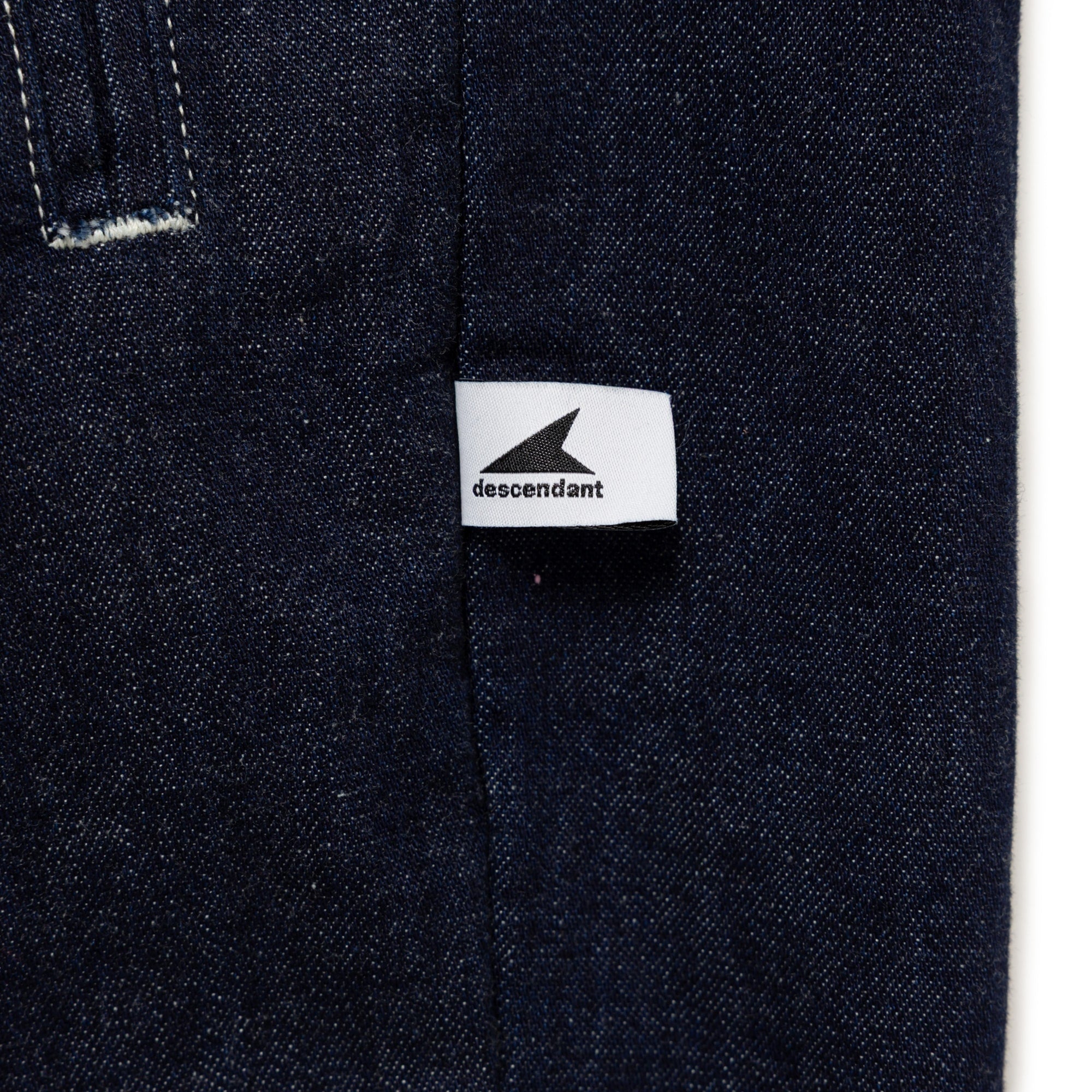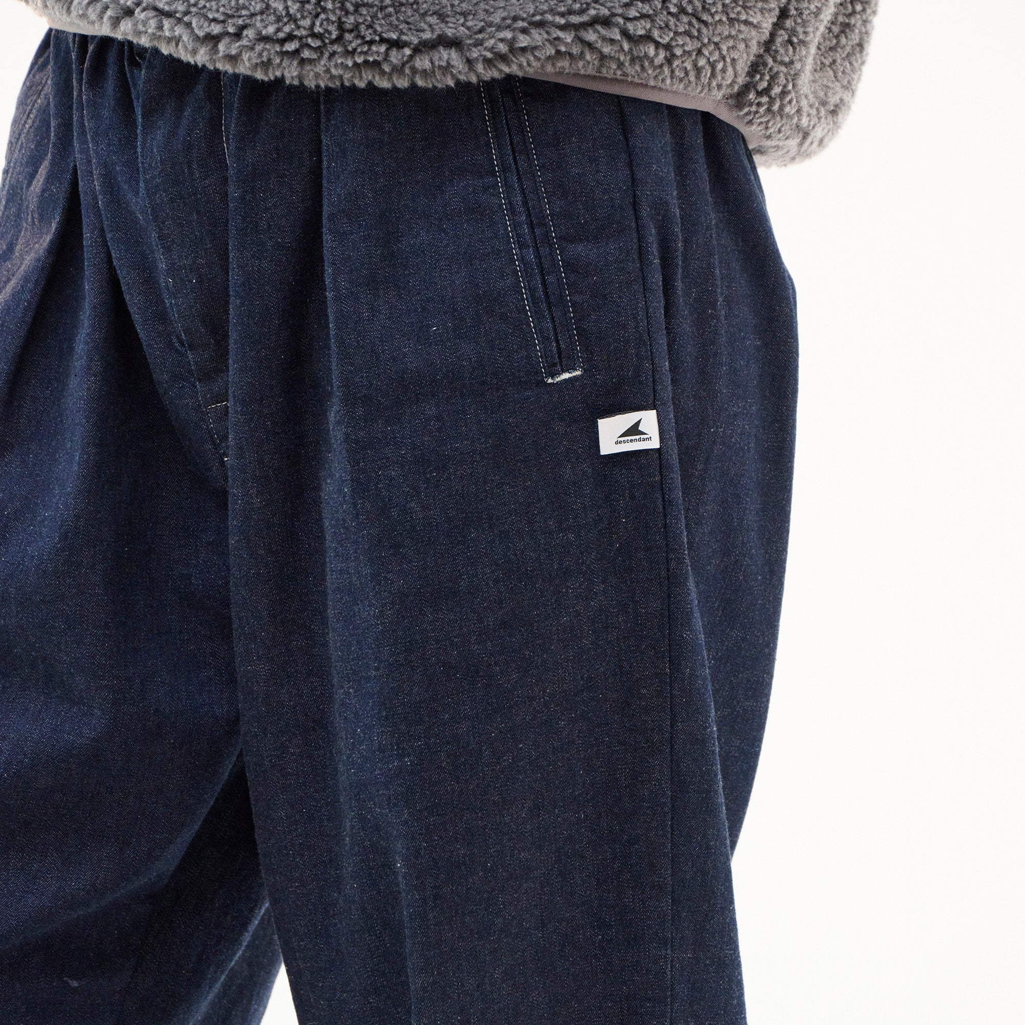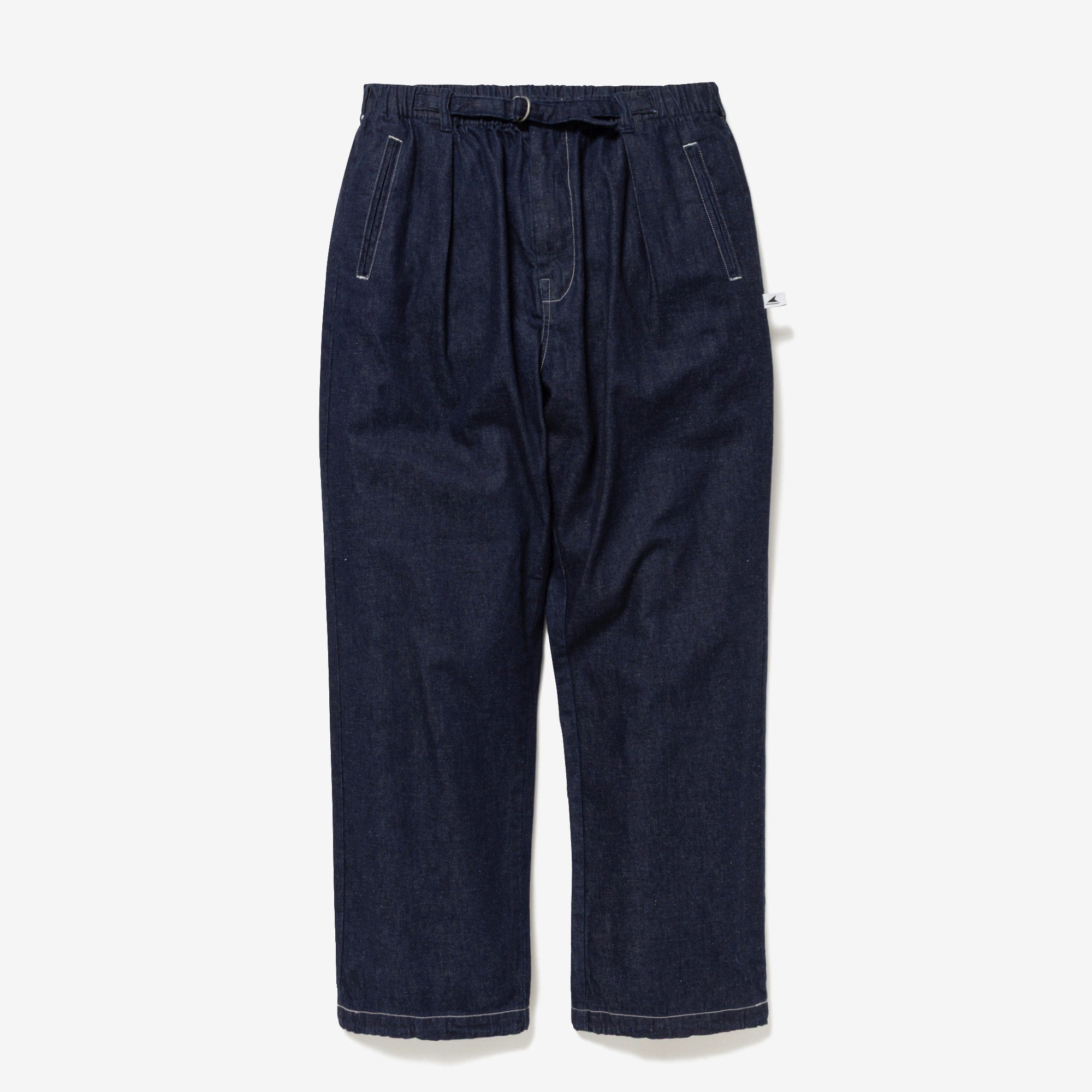 アメリカで創業した日本のヴィンテージワークウェアブランド、Post O’Alls(ポストオーバーオールズ)とのコラボレーション。8ozデニムを使用し、白糸のステッチでアクセントを効かせたワークトラウザーズ。ワンタックの腰回りから裾口へゆったりテーパードしたシルエット、ゴム入りのウエストに共地のベルトを通し、前身頃の左右に両玉縁ポケット、背面にシンチバック付き