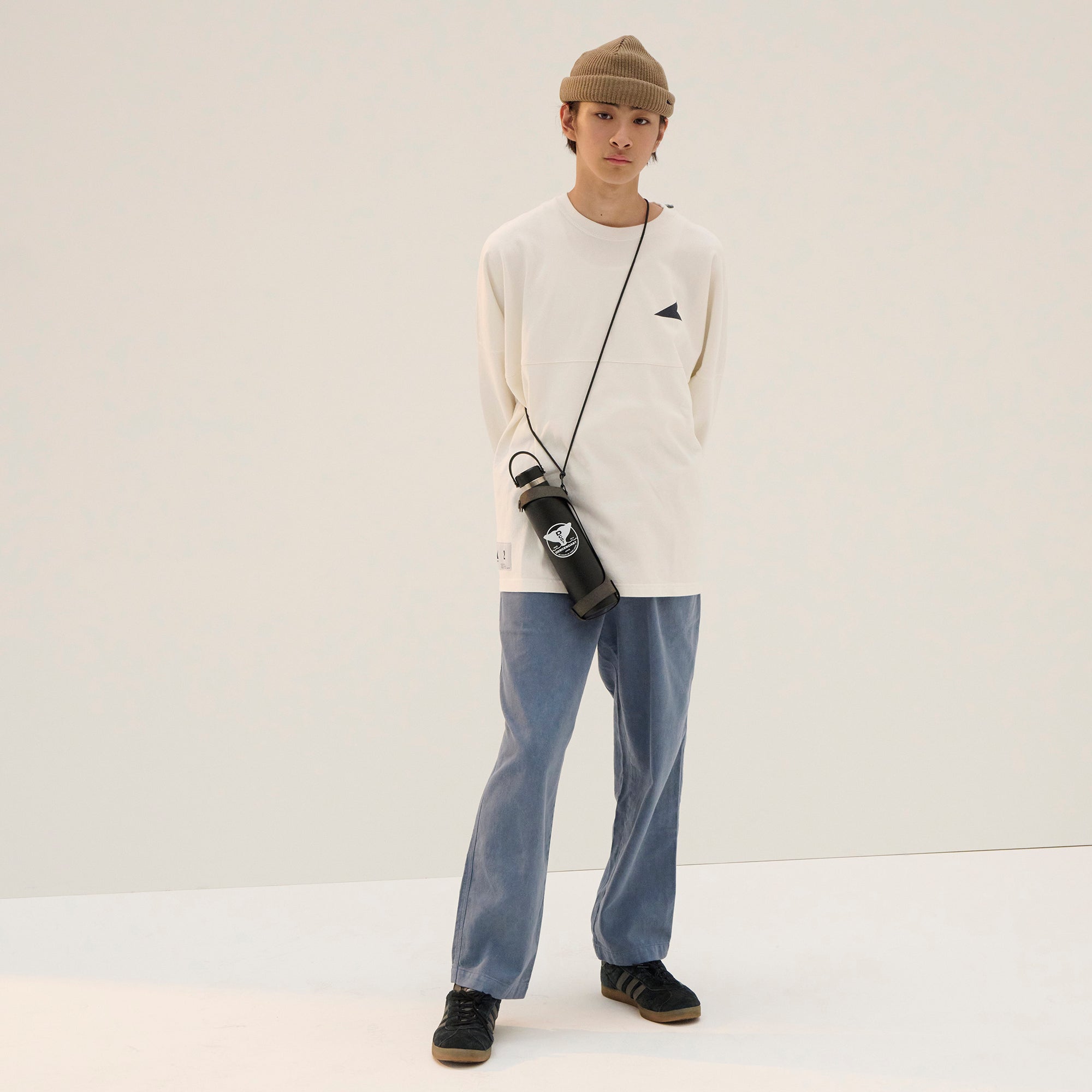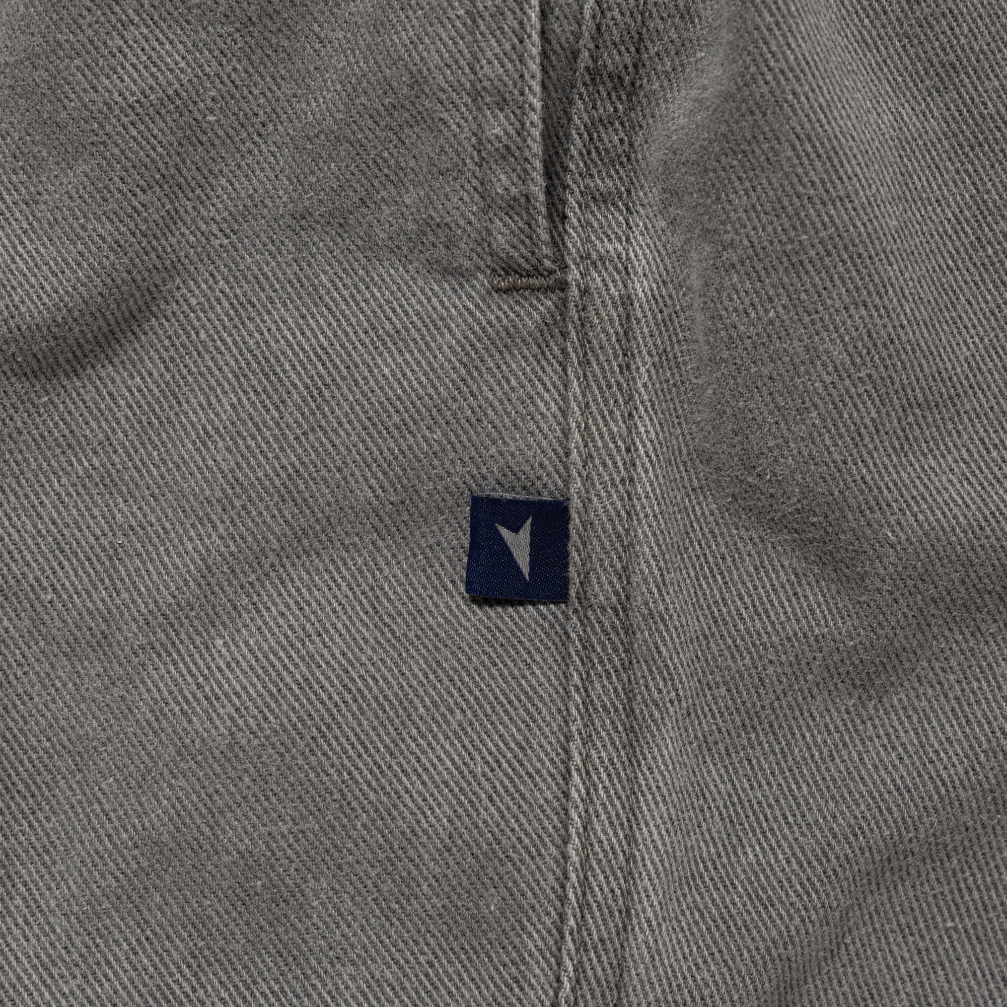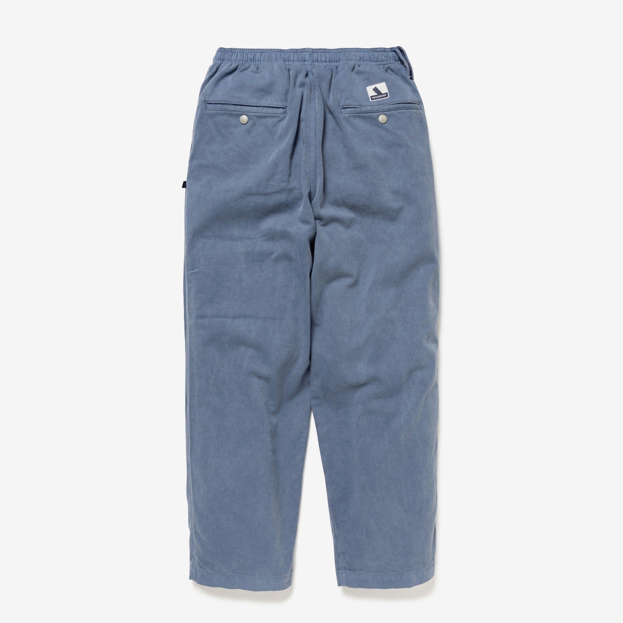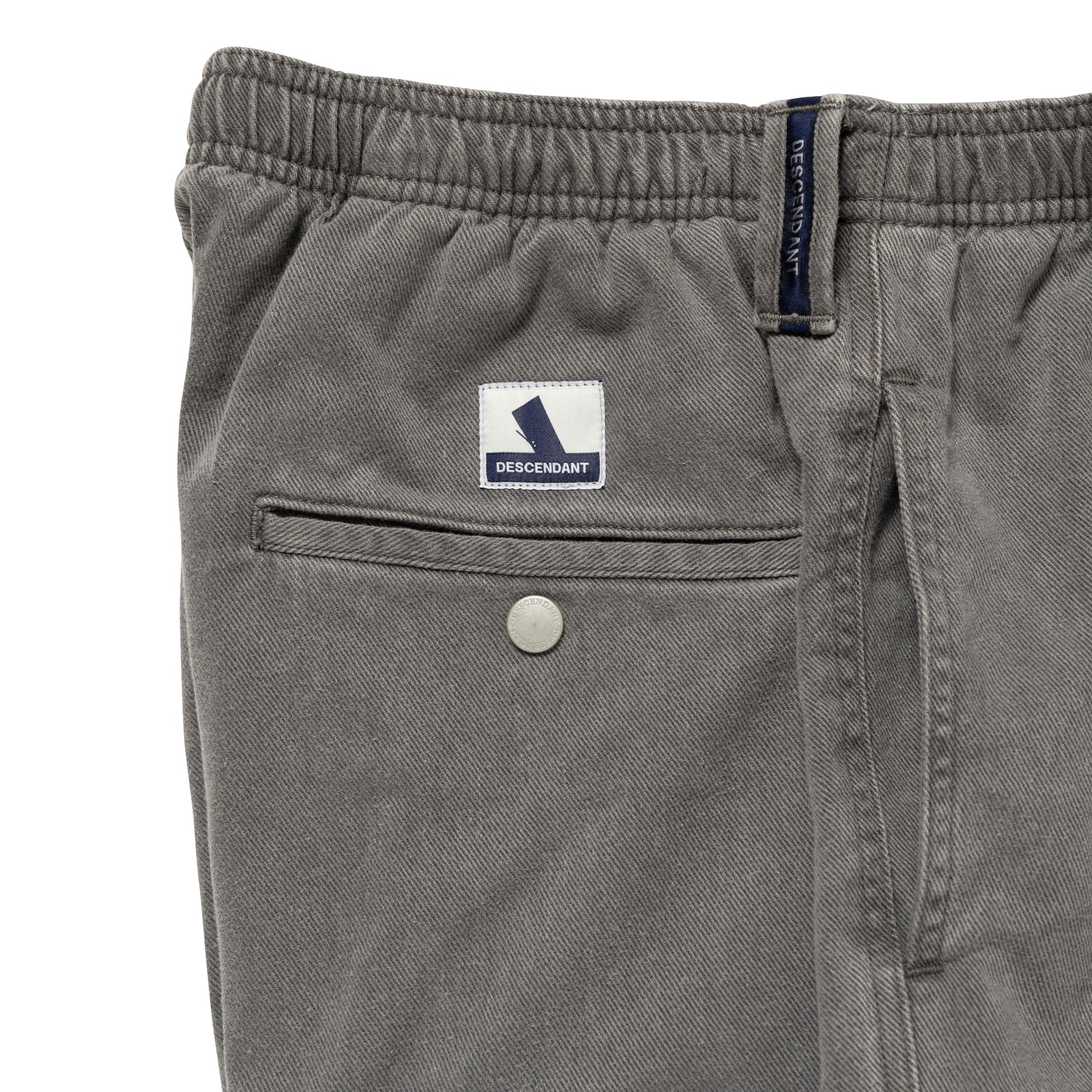 コットンツイルを使用し、ピグメントダイ加工により着古した風合いに仕上げたSHOREツイルビーチトラウザーズ。ゴム入りのウエストにスピンドルを通し、DESCENDANTのロゴ入りベルトループ付き。サイドポケット及びスナップボタン留めのヒップポケットを配し、SPYHOPの織りネーム付き。
