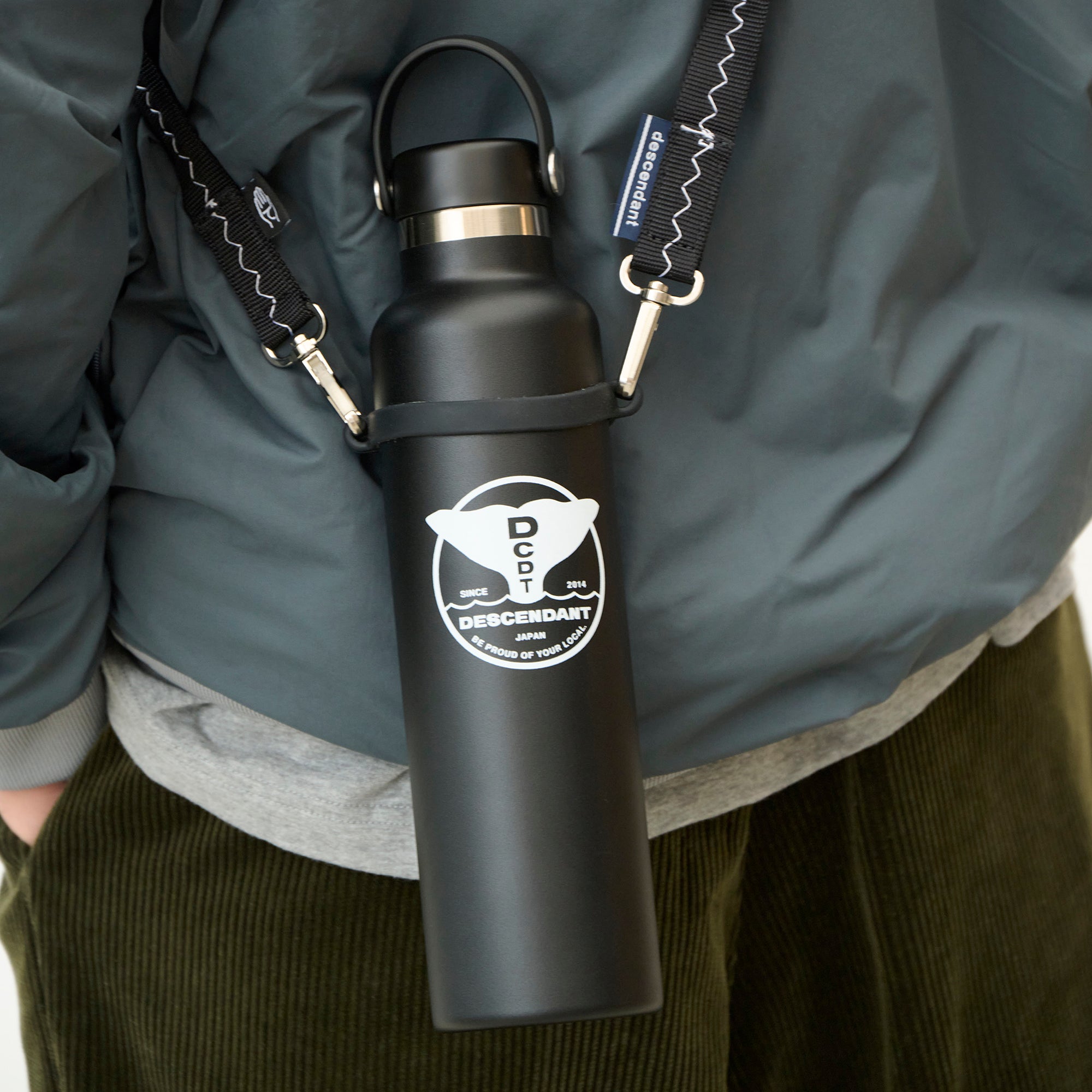 真空断熱構造による保冷24時間·保温6時間を実現したHydro Flaskのハイドレーションボトルに、FLUKE UPのグラフィックをあしらったDESCENDANT別注モデル。使い勝手の良いスタンダードな飲み口。氷たっぷりペットボトル1本分のサイズ感。容量709ml。