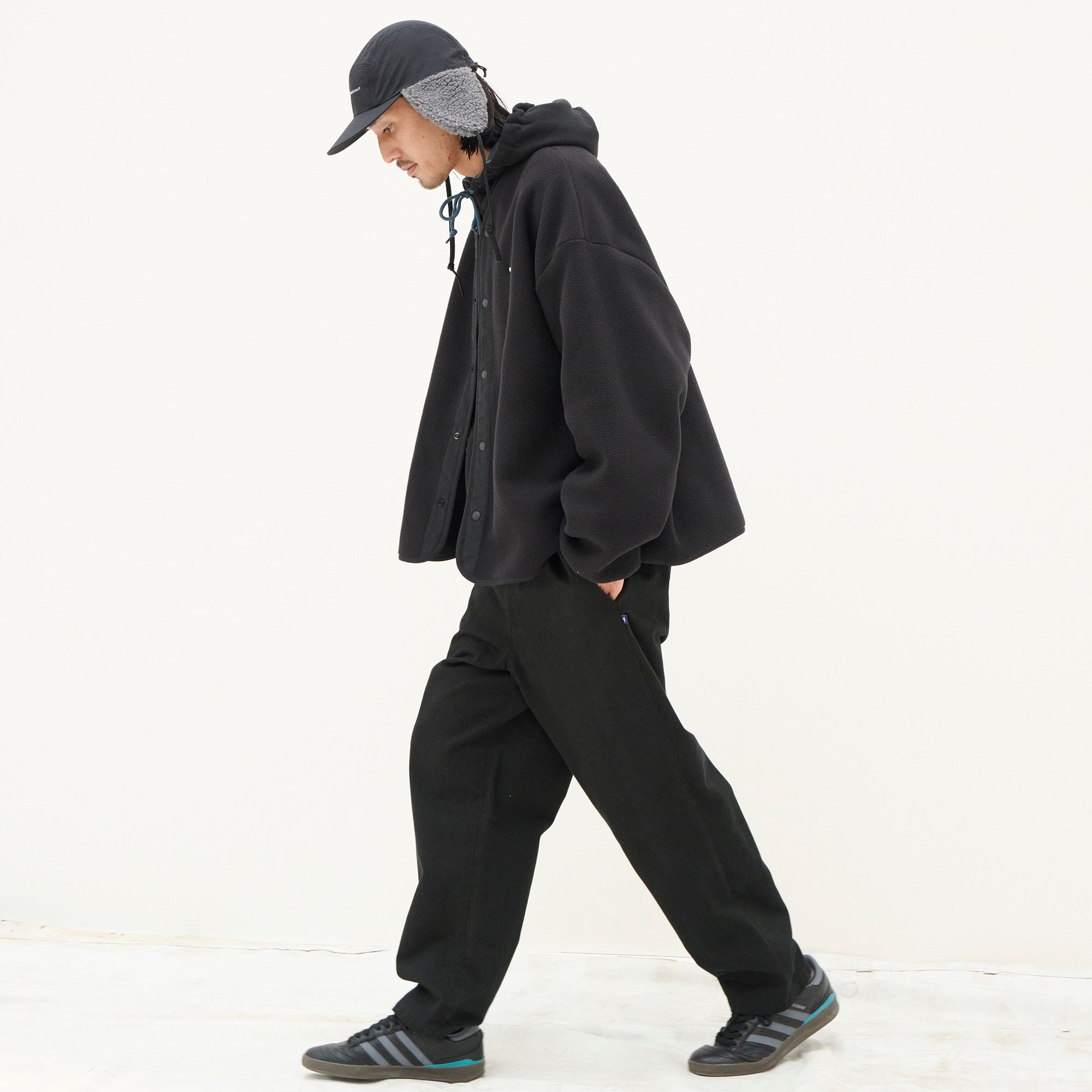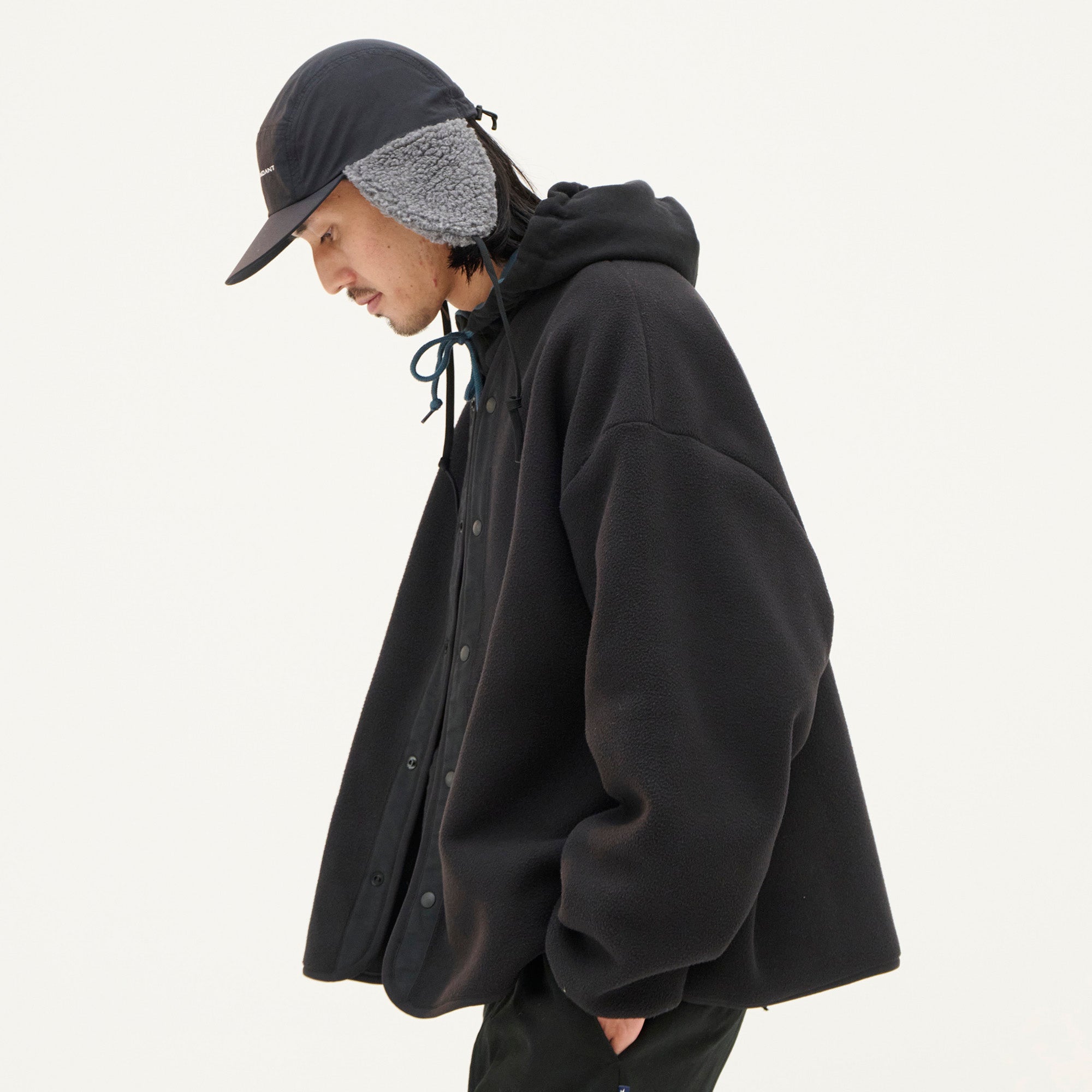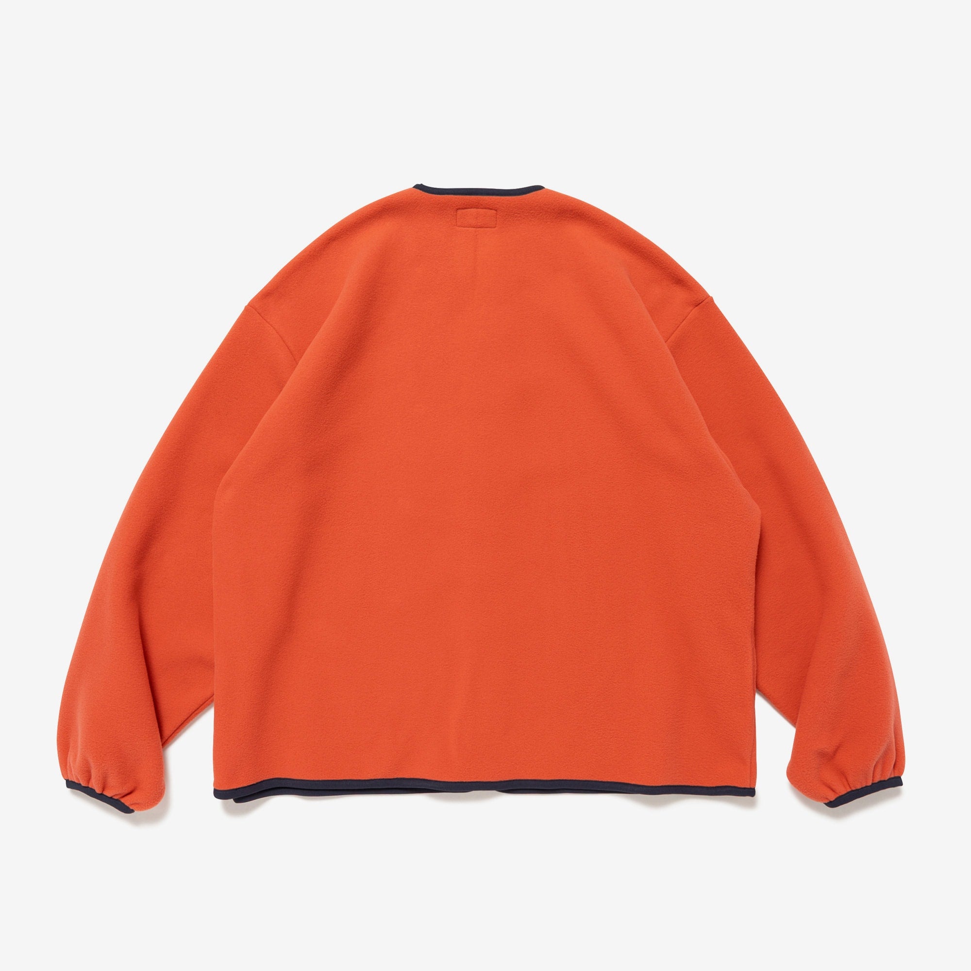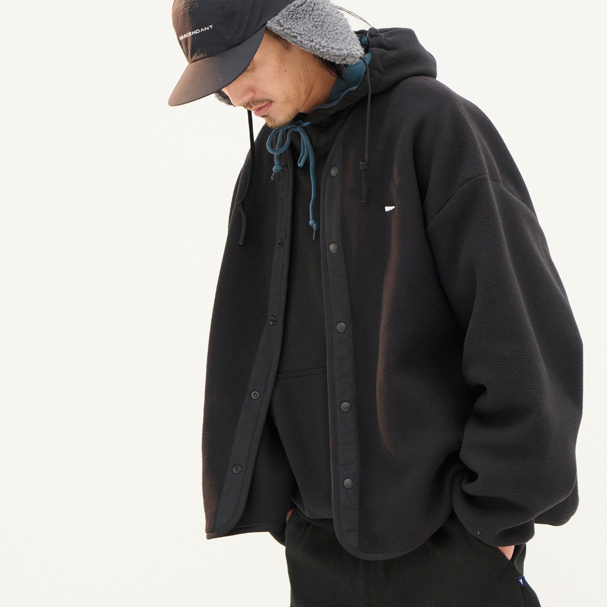 厚手のヘビーウェイトフリースを使用し、襟ぐりから前立て、袖口、裾回りを別布でパイピング処理したスナップボタン留めのフリースカーディガン。幅広い身頃のボックスシルエット襟ぐりの継ぎ目にはオリジナルテープのパイピング。右前裾にサイズを表示したCETUSの織りネーム付き。ブラック、ブラウン、オレンジの3色展開。