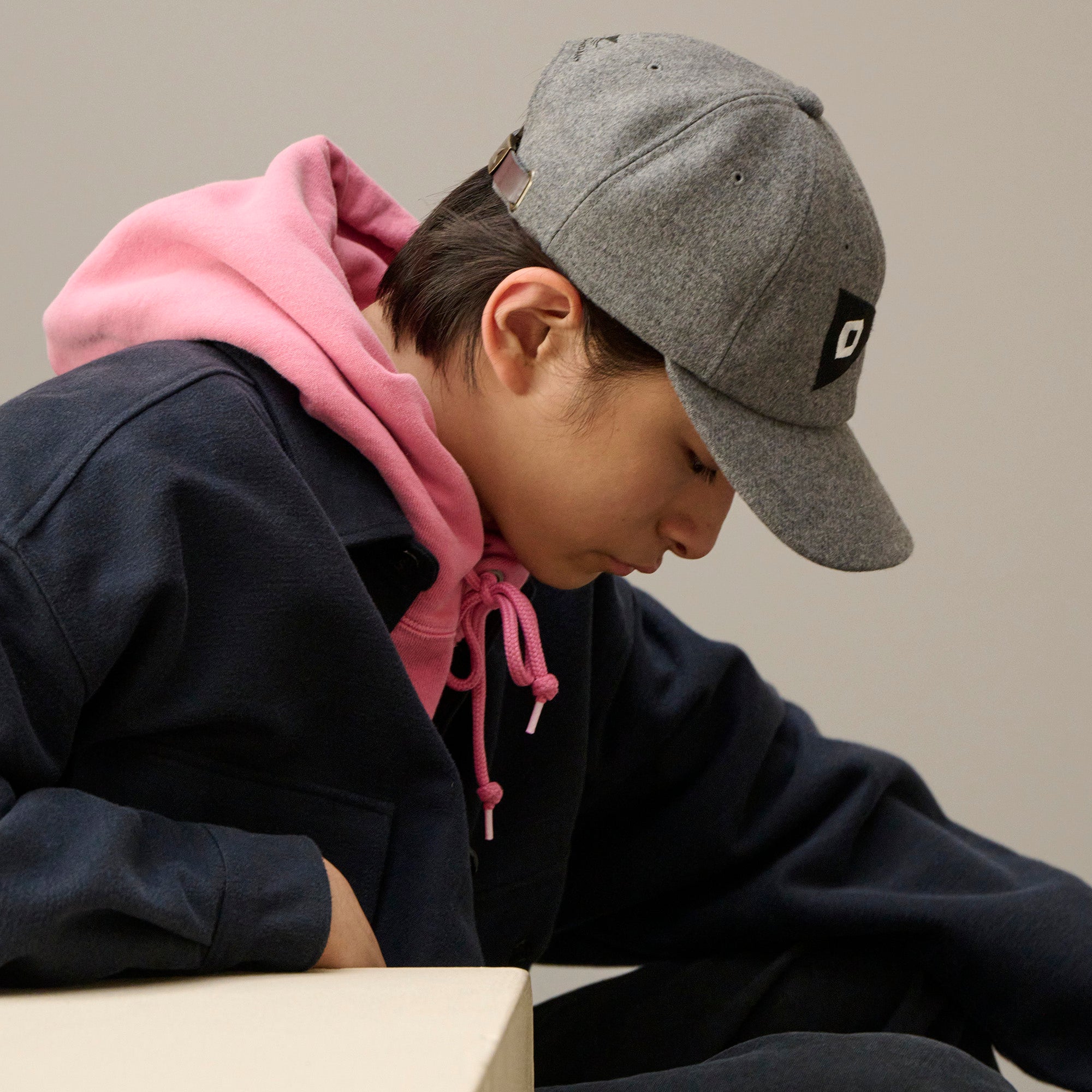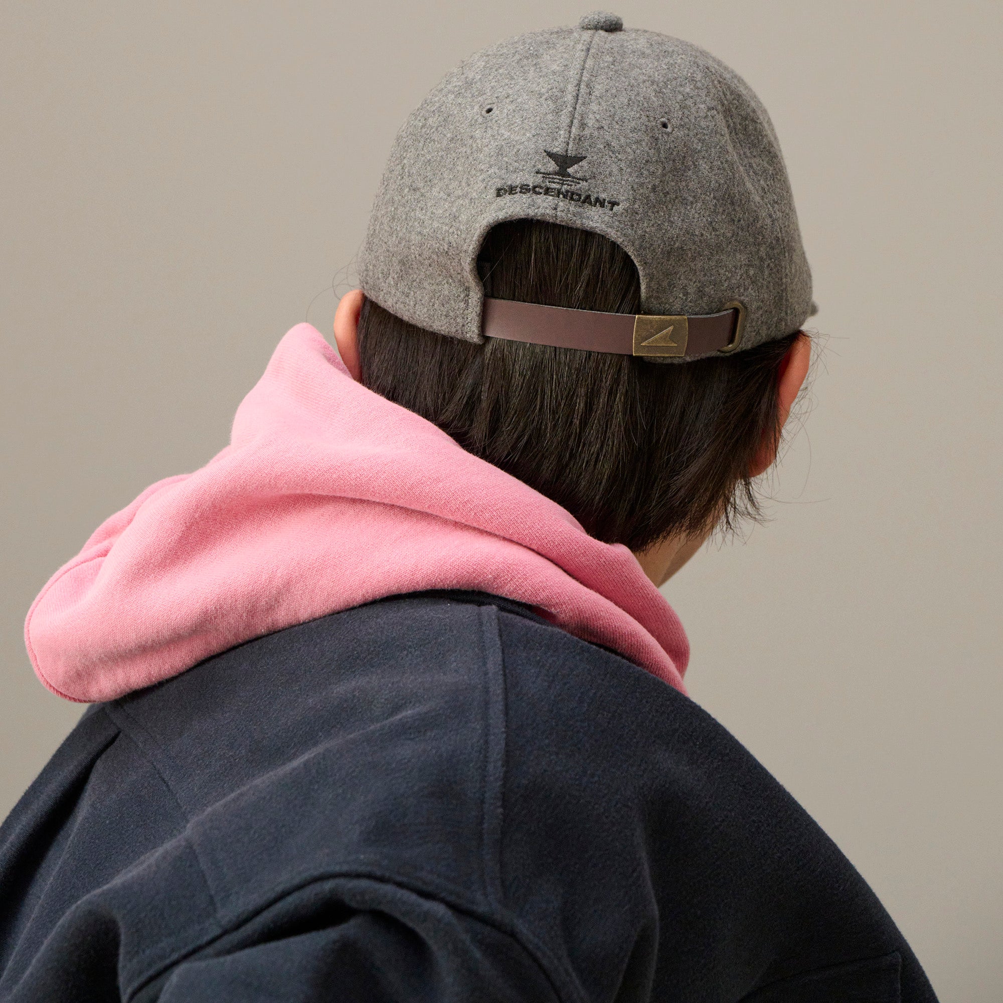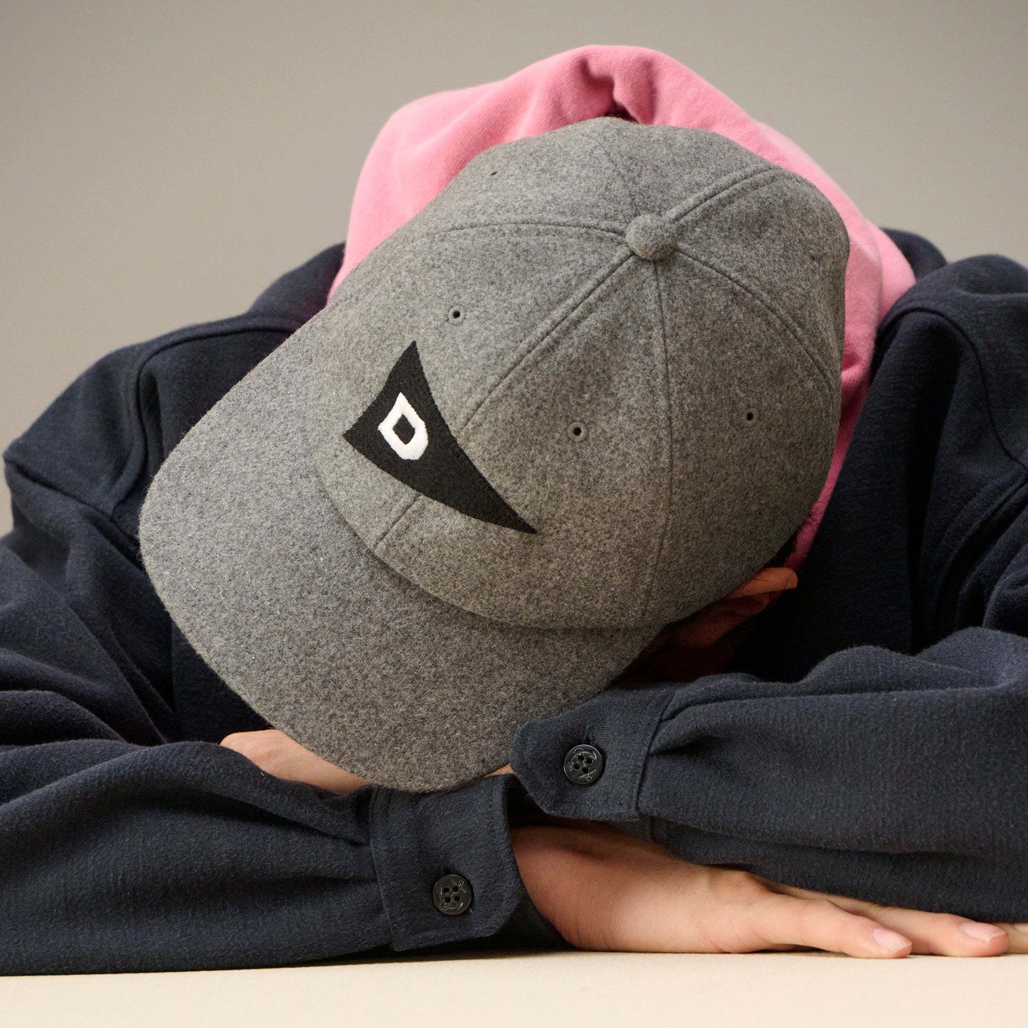 ウール/ナイロン混紡の二重織メルトンを使用した6パネルキャップ。フロントパネルにLETTEREDのフェルトアップリケを縫い付け、背面にはFLUKE UPのグラフィックを刺繍、シンセティックレザー製のアジャスターストラップ付き。