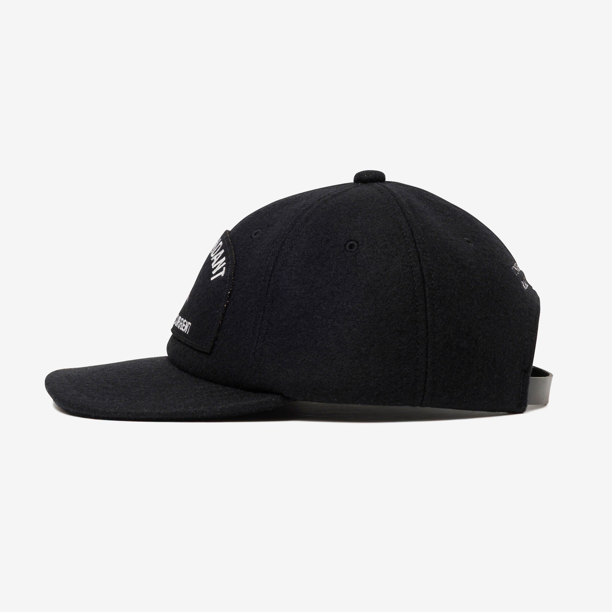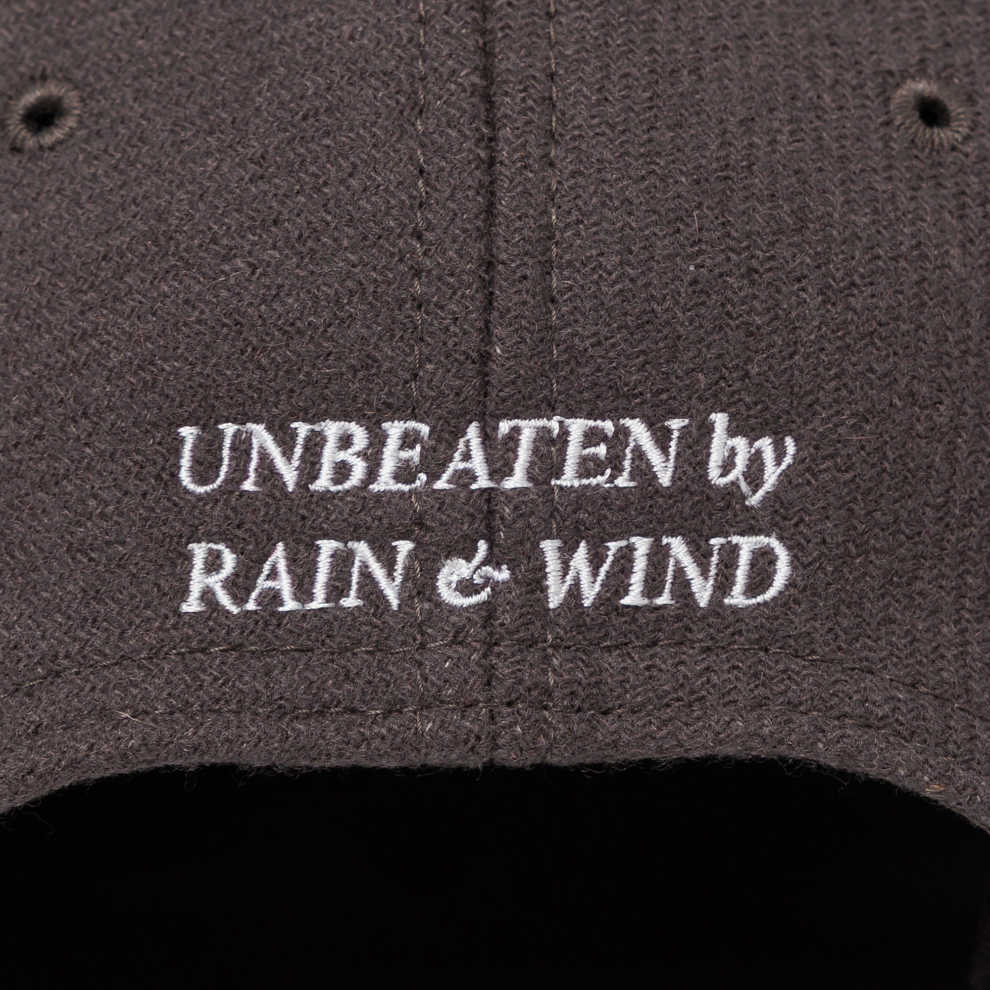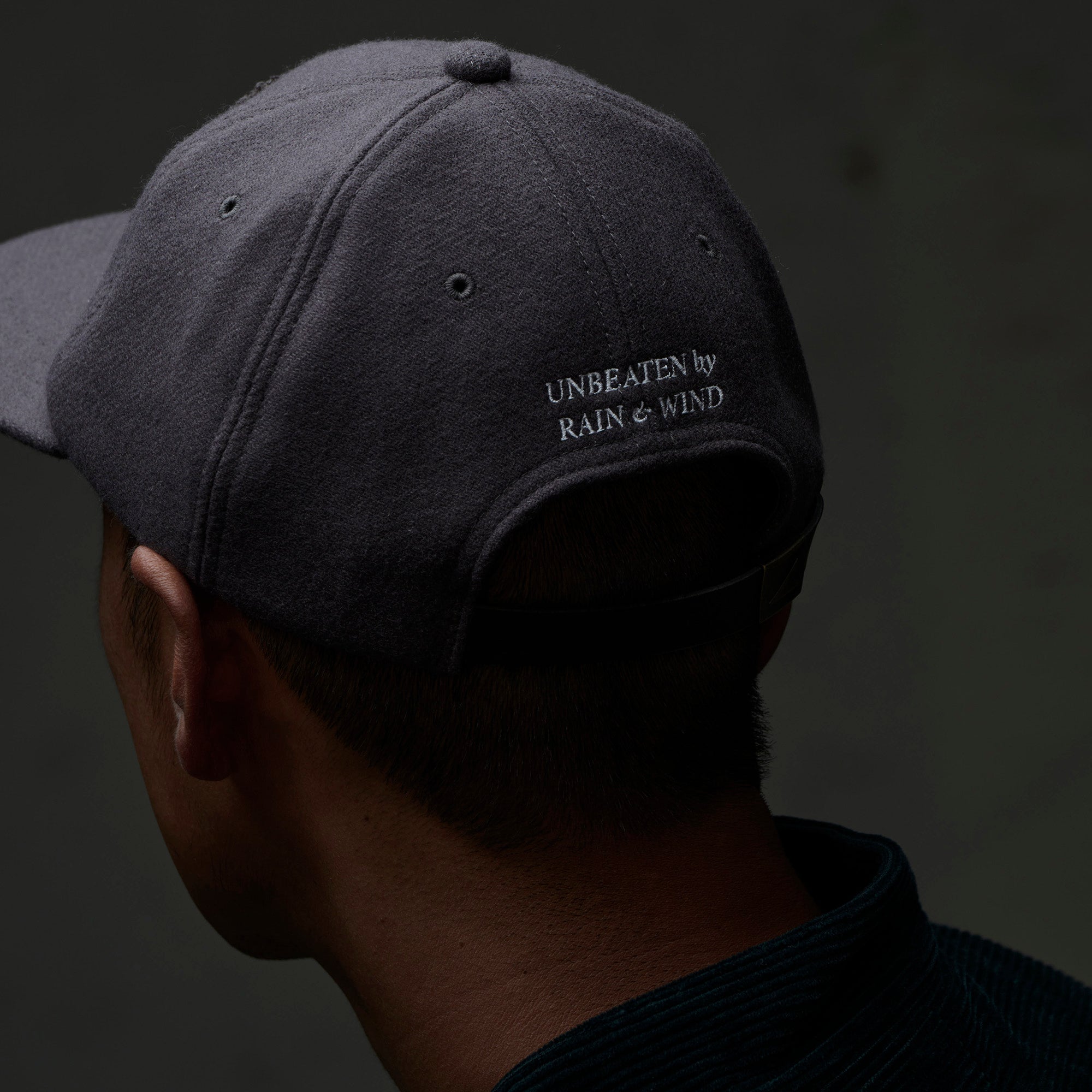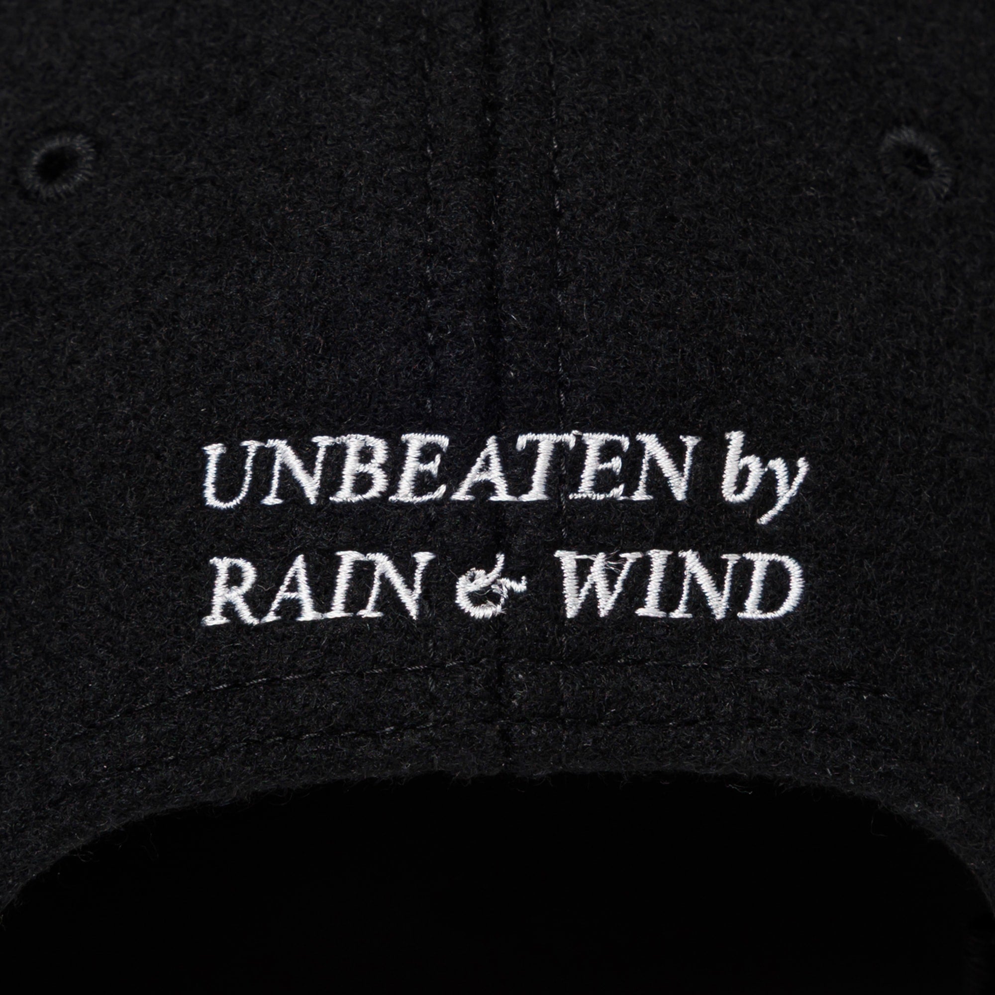 ウール/ナイロン混紡の二重織メルトンを使用したアポロキャップ。フロントパネルにTEAMの刺繍パッチをあしらい、背面にはUNBEATEN by RAIN & WINDの刺繍ロゴとシンセティックレザー製のアジャスターストラップ付き。
