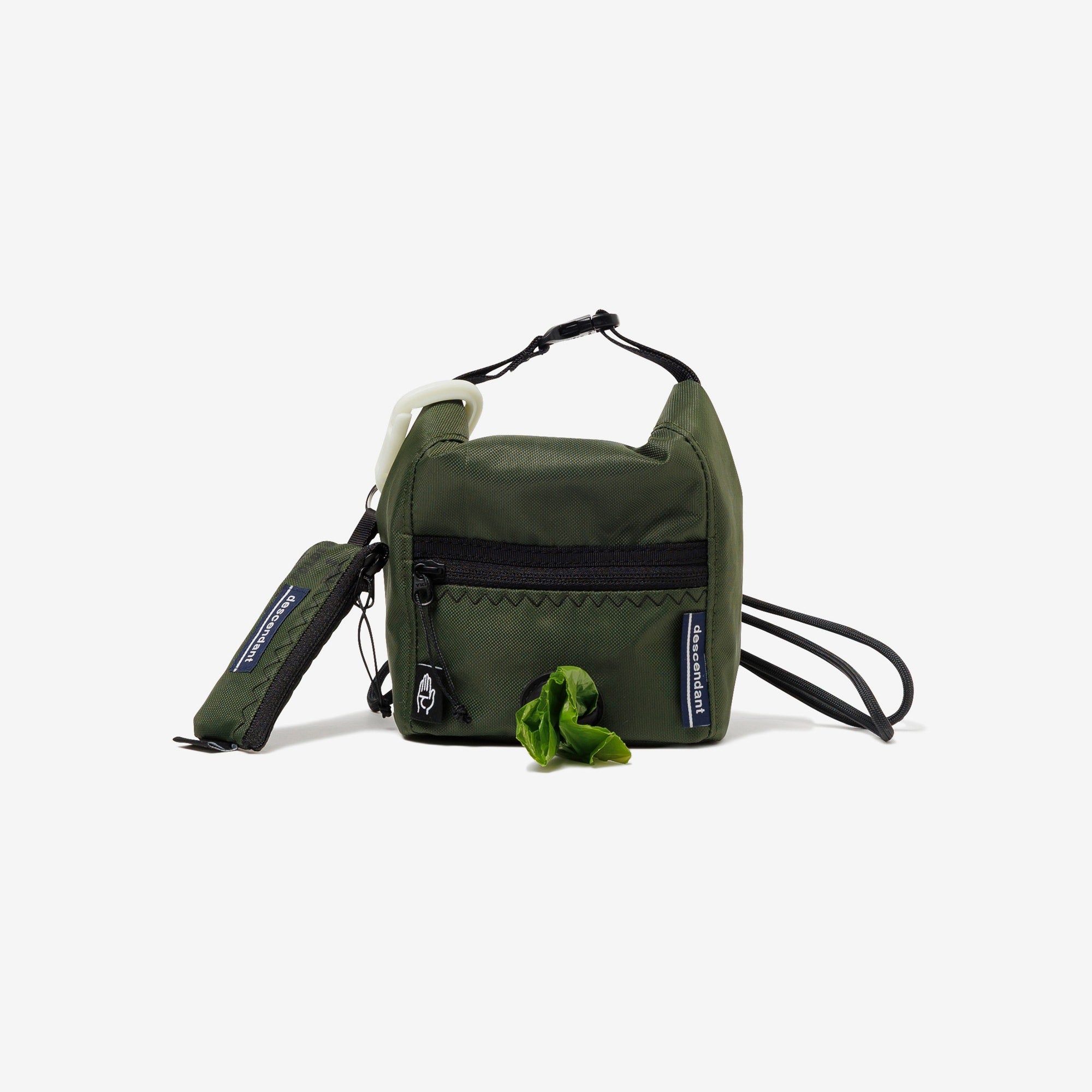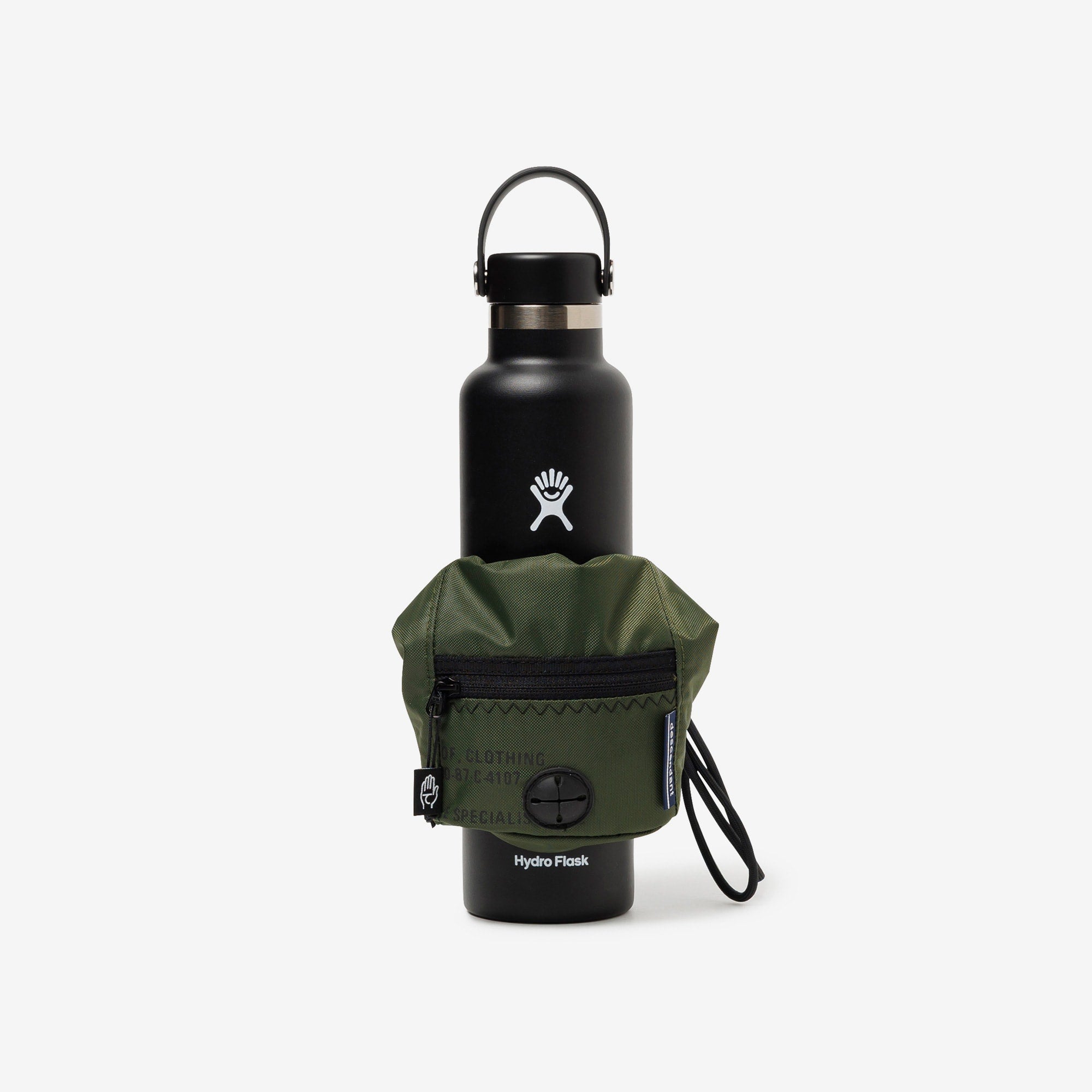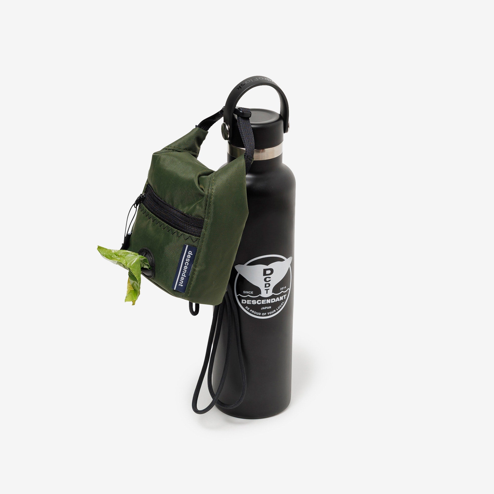 廃材のランドリーバッグを素材にしたTAKES HANDS共同製作のポーチ。Hydro Flask対応アクセサリー。犬の散歩に欠かせないエチケット袋用のポケット付き。背面のゴムを絡ませ、ハイドレーションボトルに装着可能。W120/H170mm