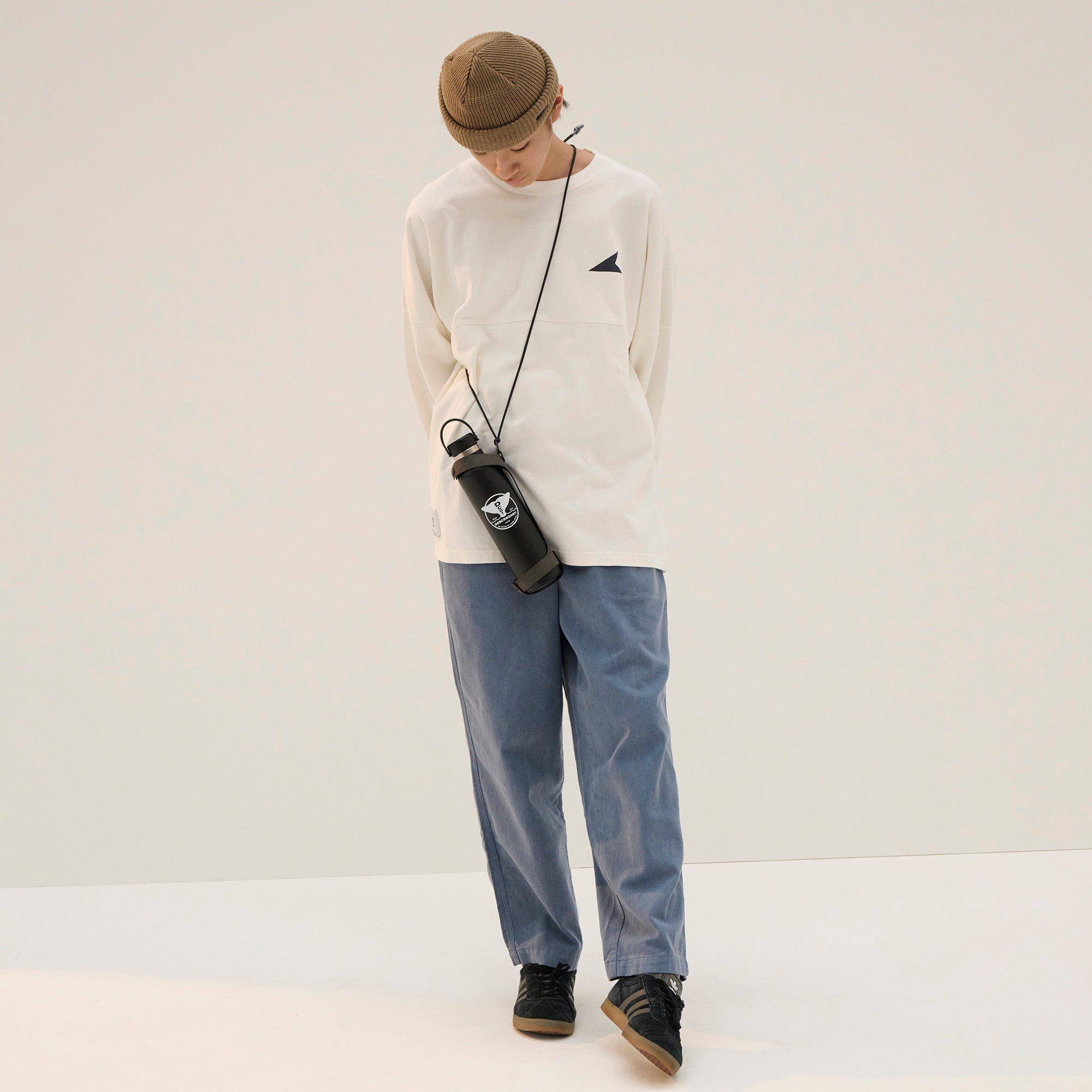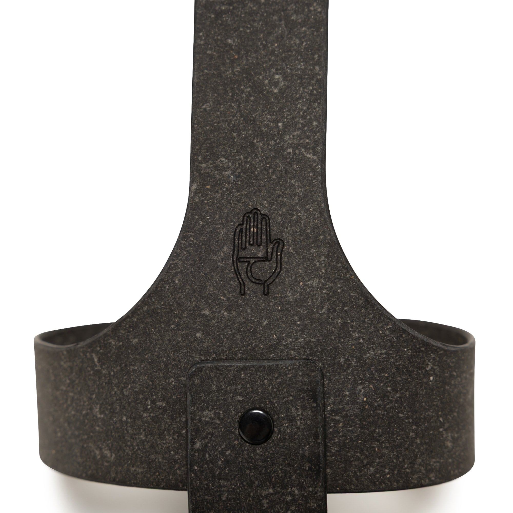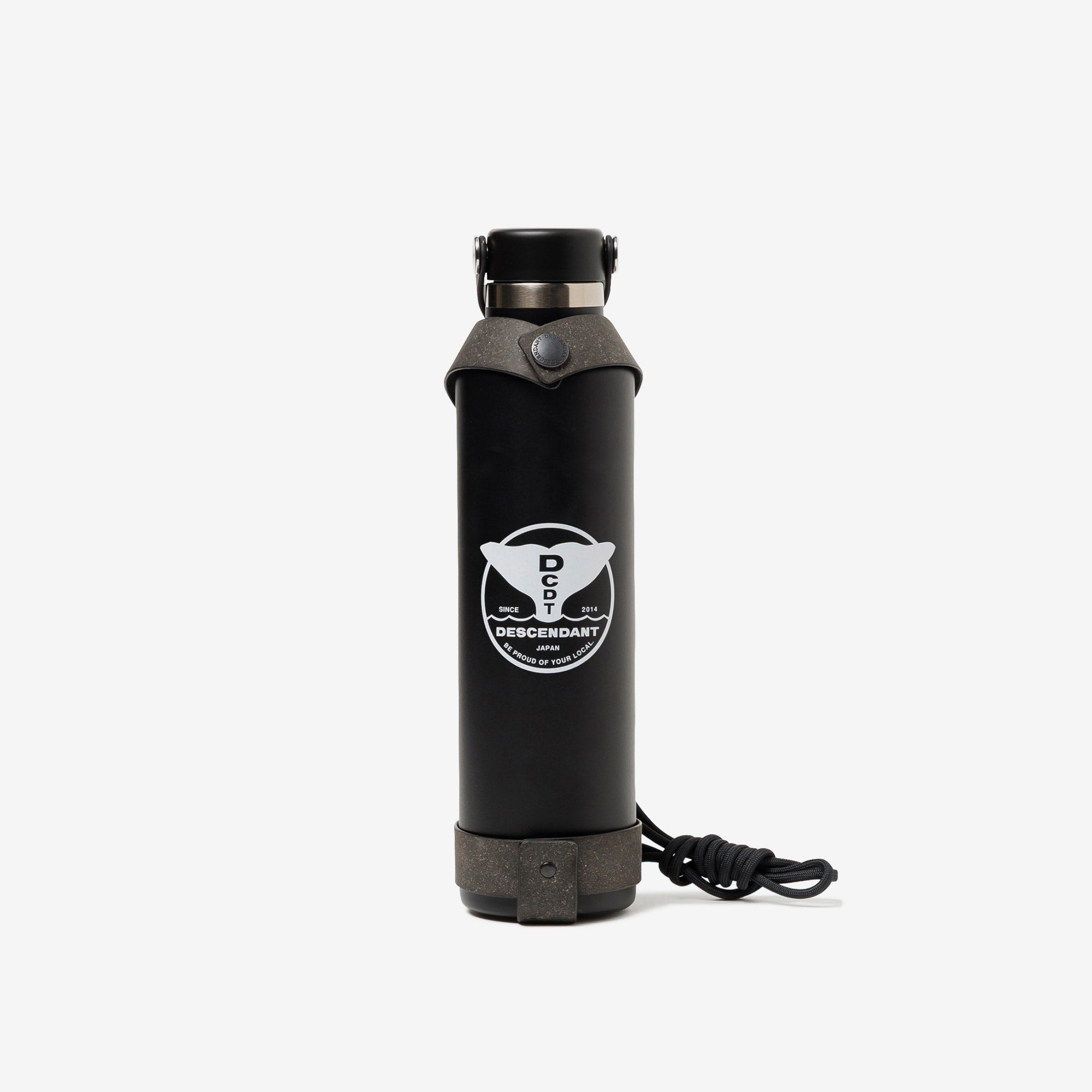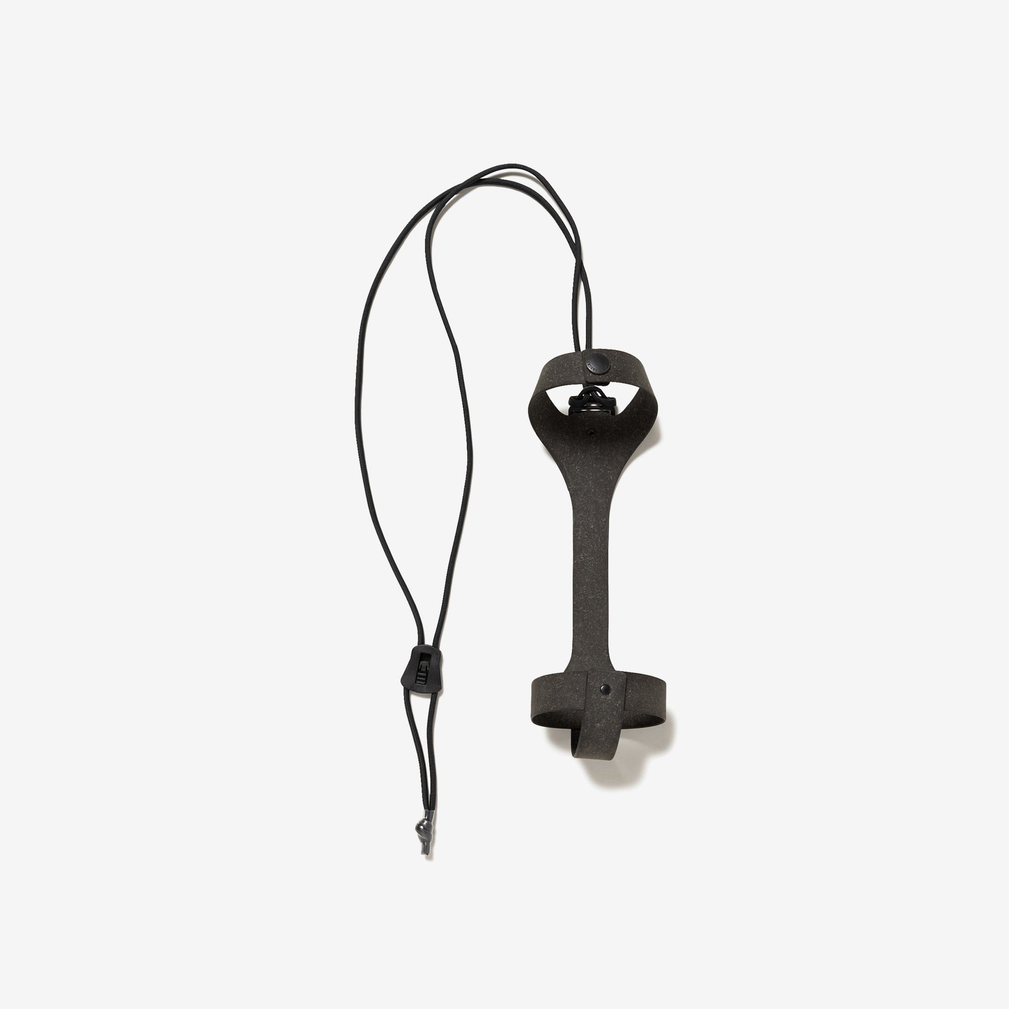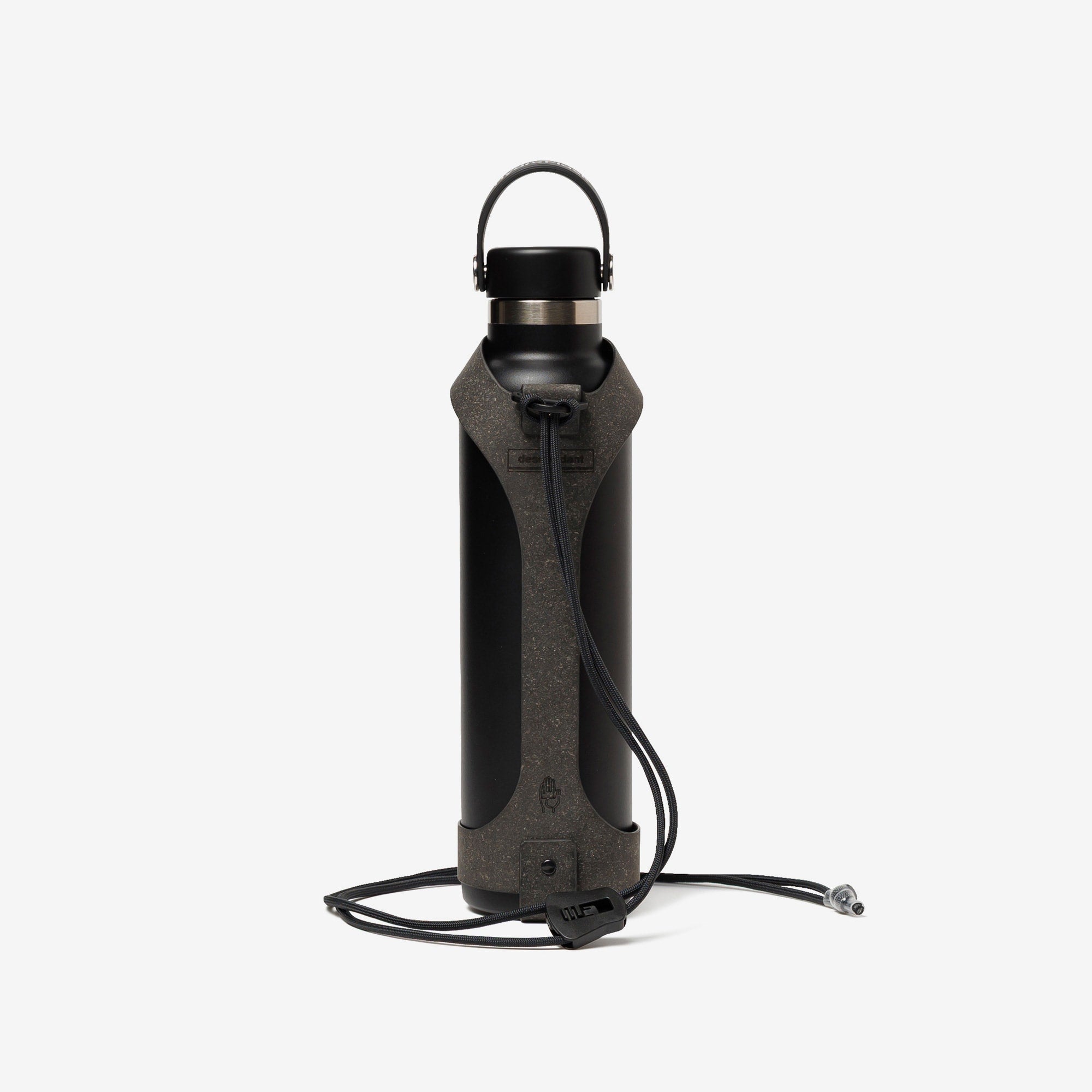 環境に優しいリサイクルレザーを使用したTAKES HANDS共同製作のボトルホルダー。Hydro Flask対応アクセサリー。TAKES HANDSの手のアイコンとHORIZONのエンボスロゴ、リサイクルレザーの刻印入り。L1400mm