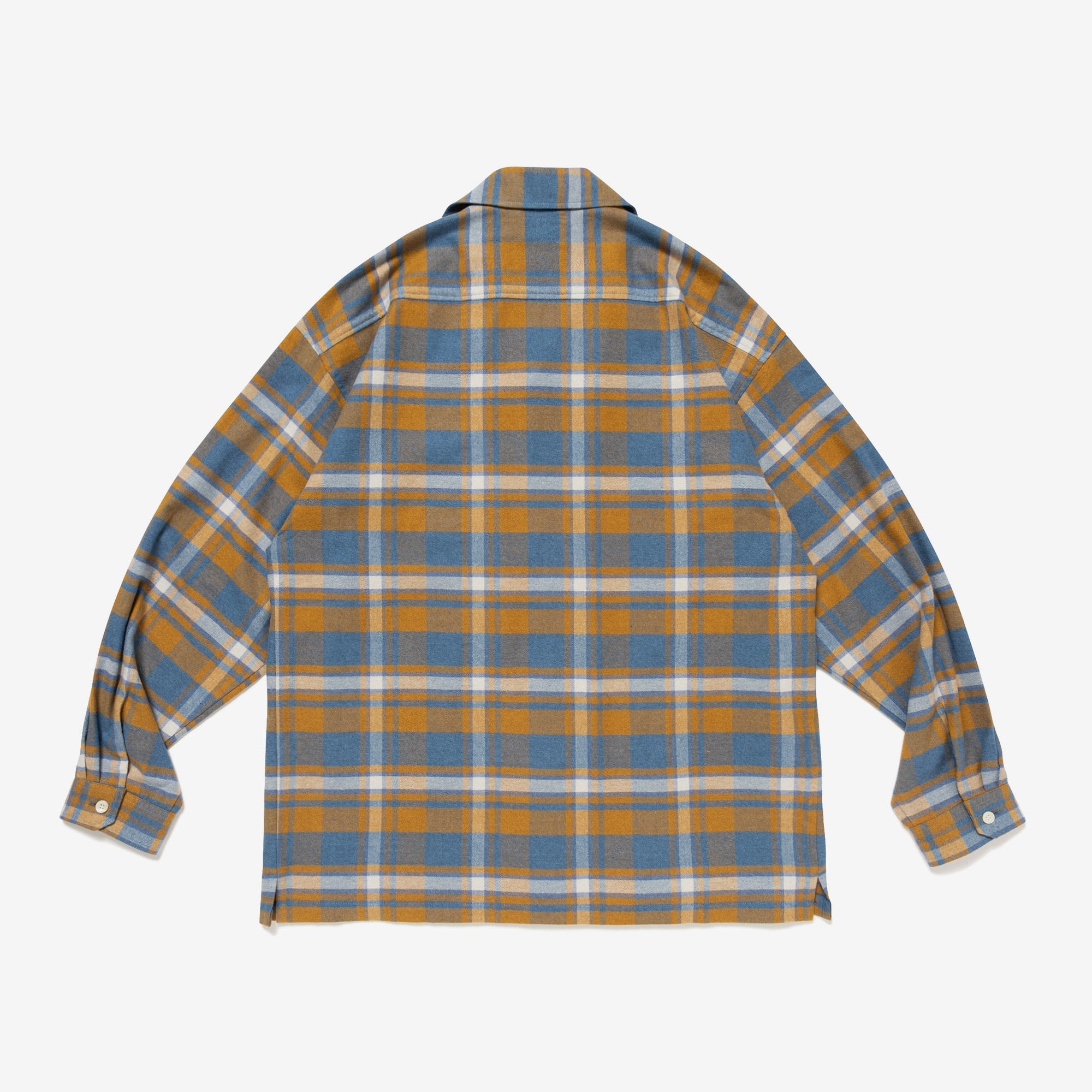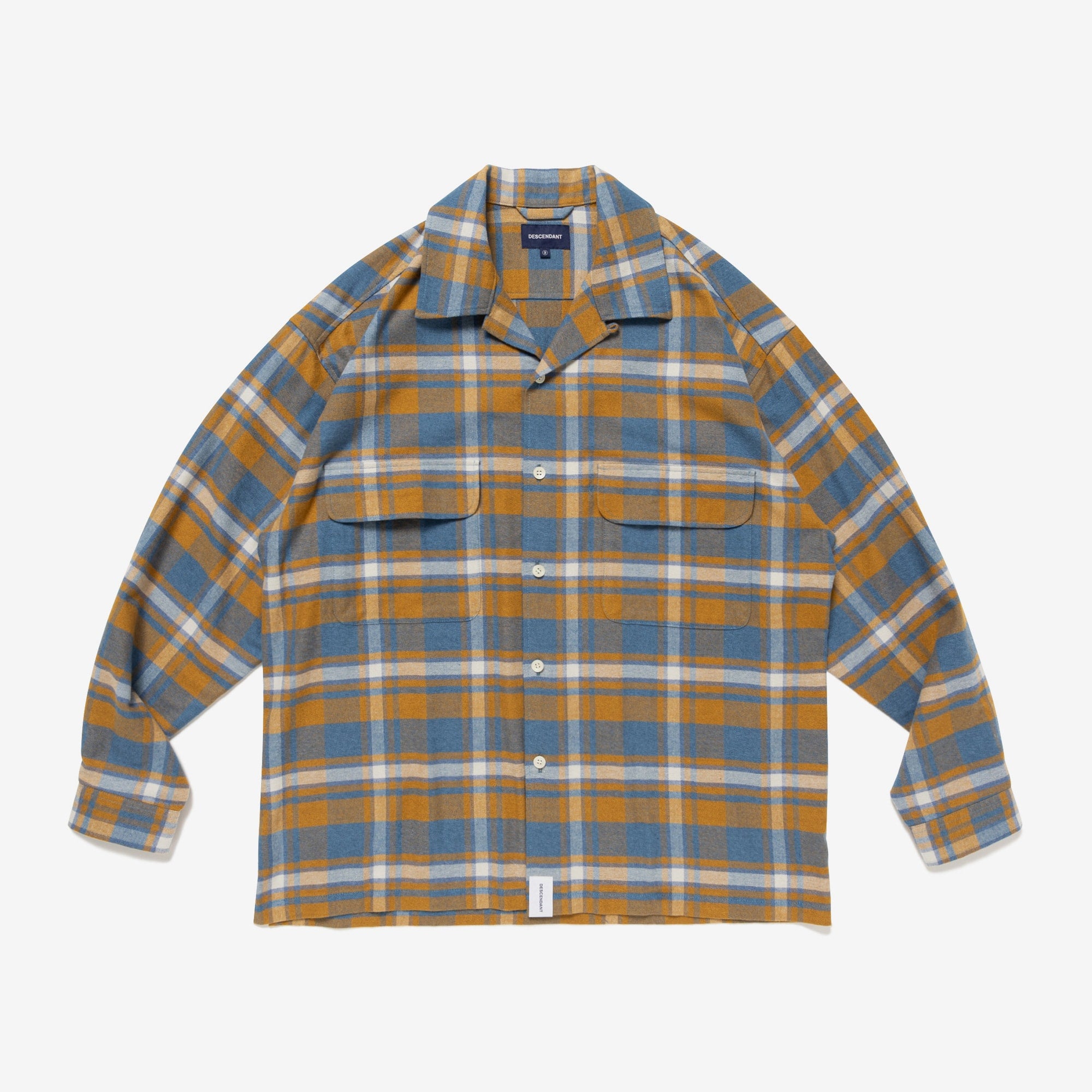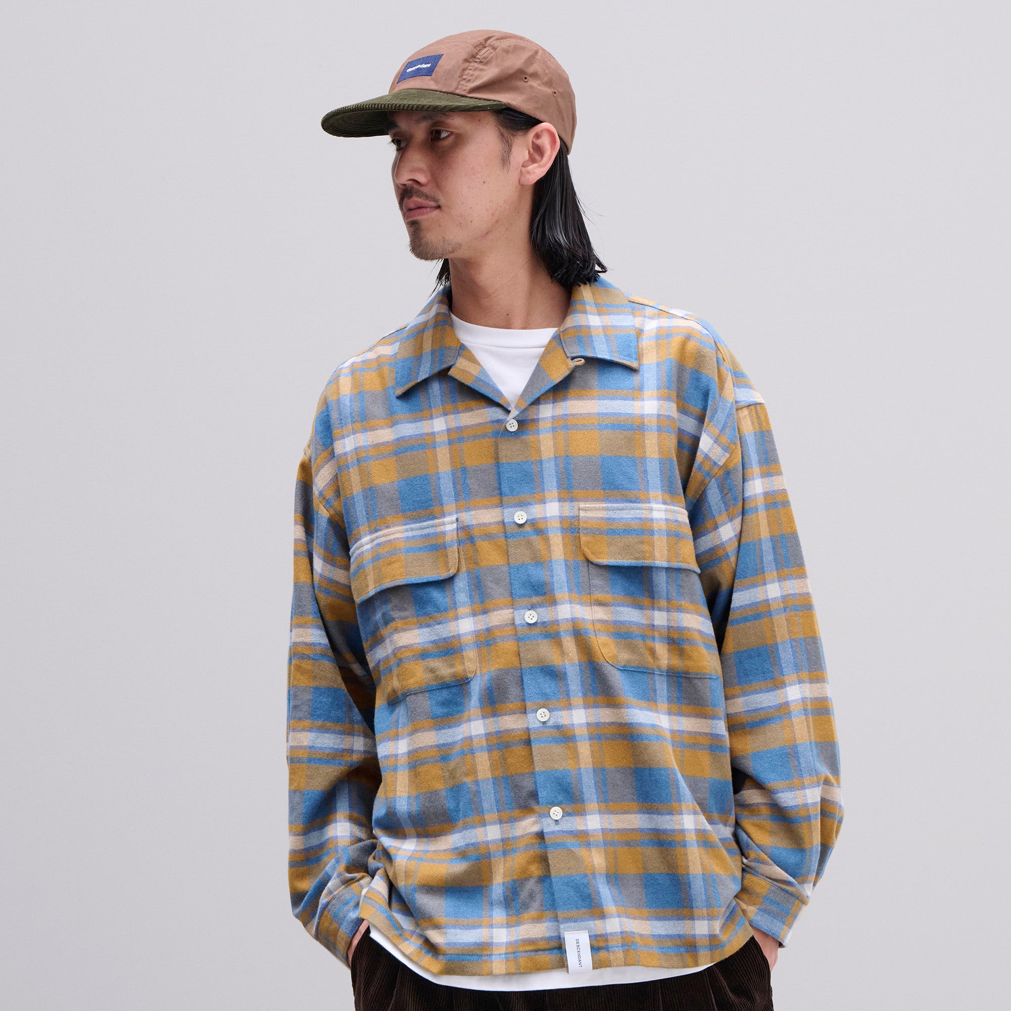 柔らかな素材感の綾織コットンビエラチェックを使用したオープンカラーシャツ。ゆったりした身幅のボックスシルエット、トップボタンにループ付き、前身頃の左右にフラップポケット。身頃の両裾にスリット入り。