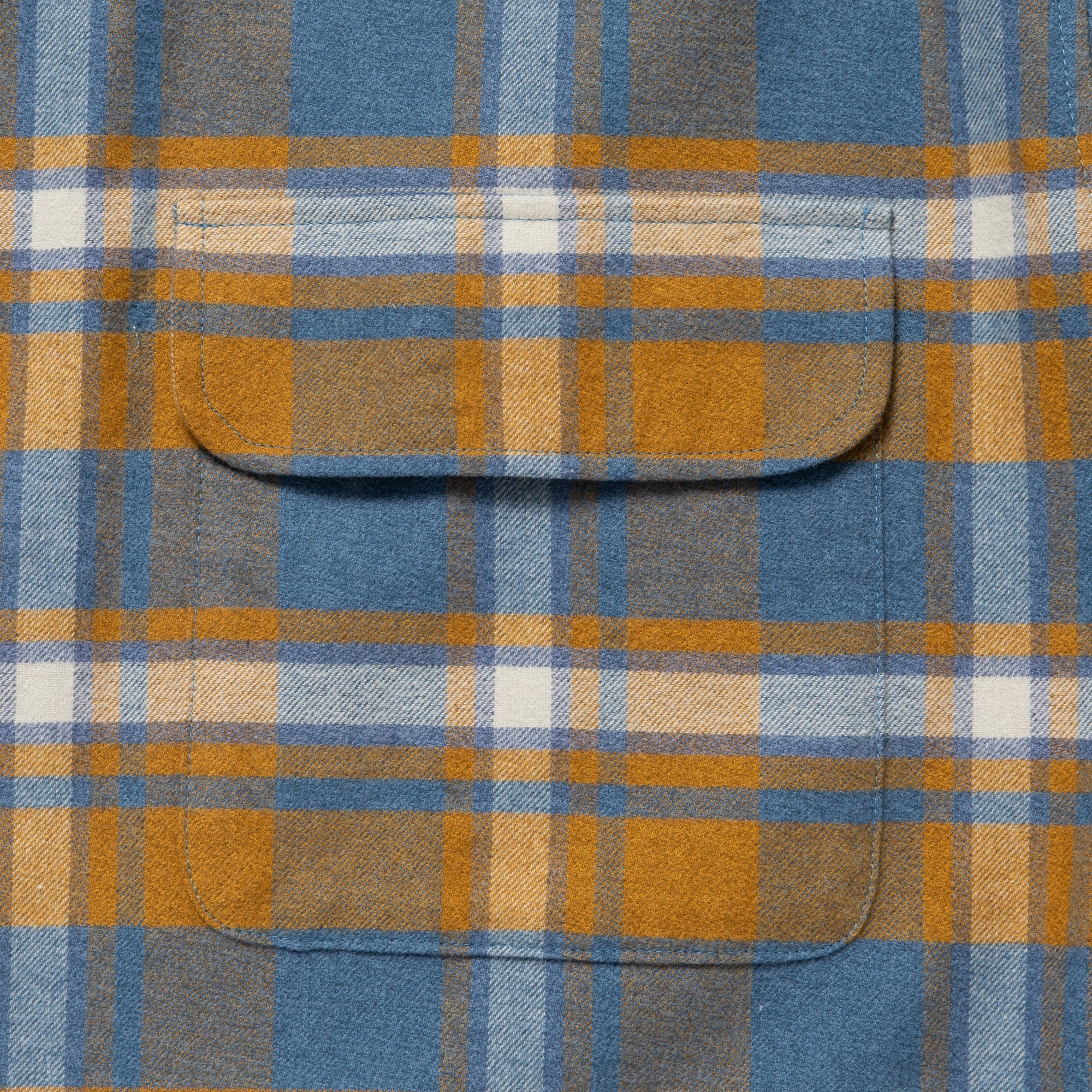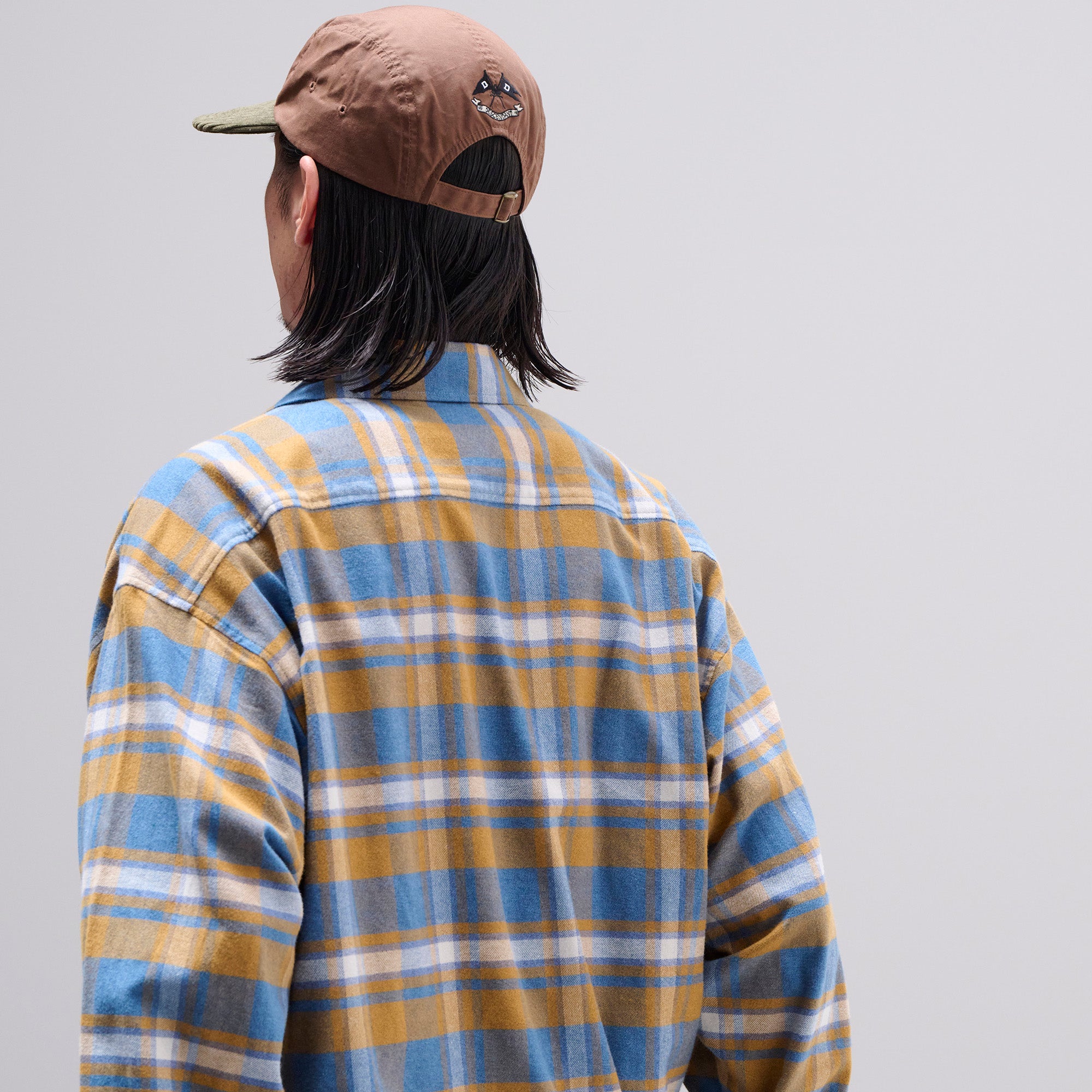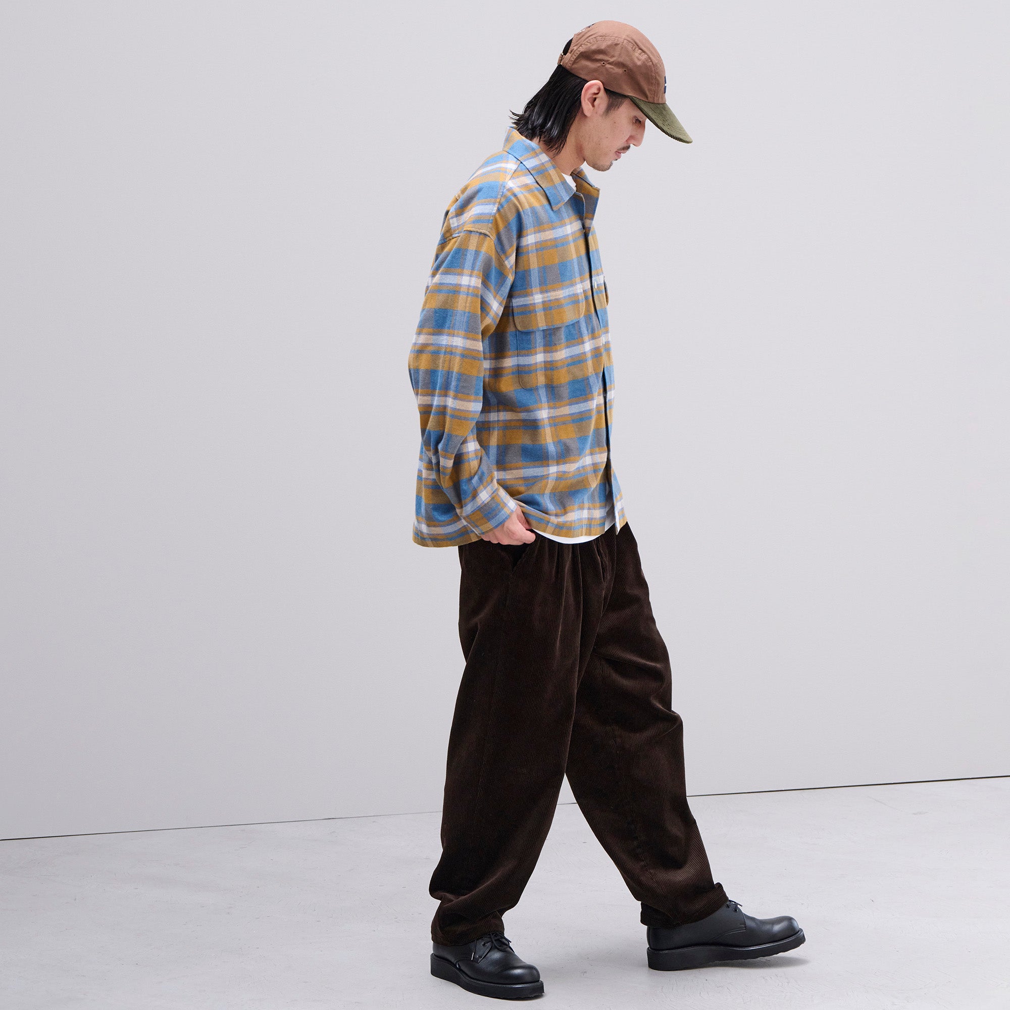 柔らかな素材感の綾織コットンビエラチェックを使用したオープンカラーシャツ。ゆったりした身幅のボックスシルエット、トップボタンにループ付き、前身頃の左右にフラップポケット。身頃の両裾にスリット入り。