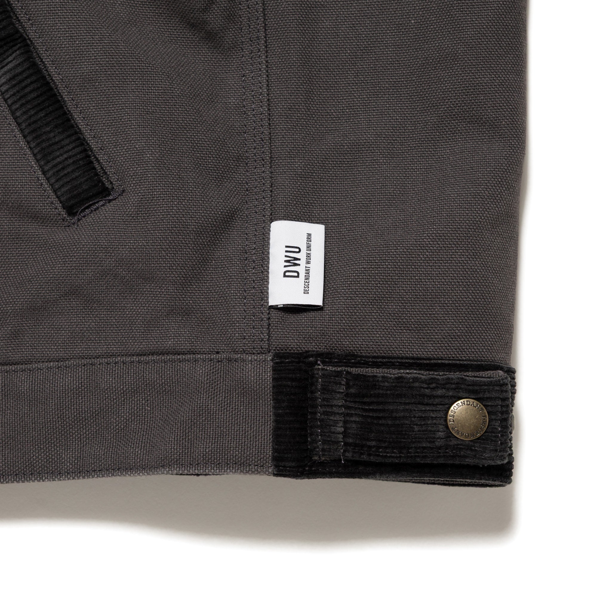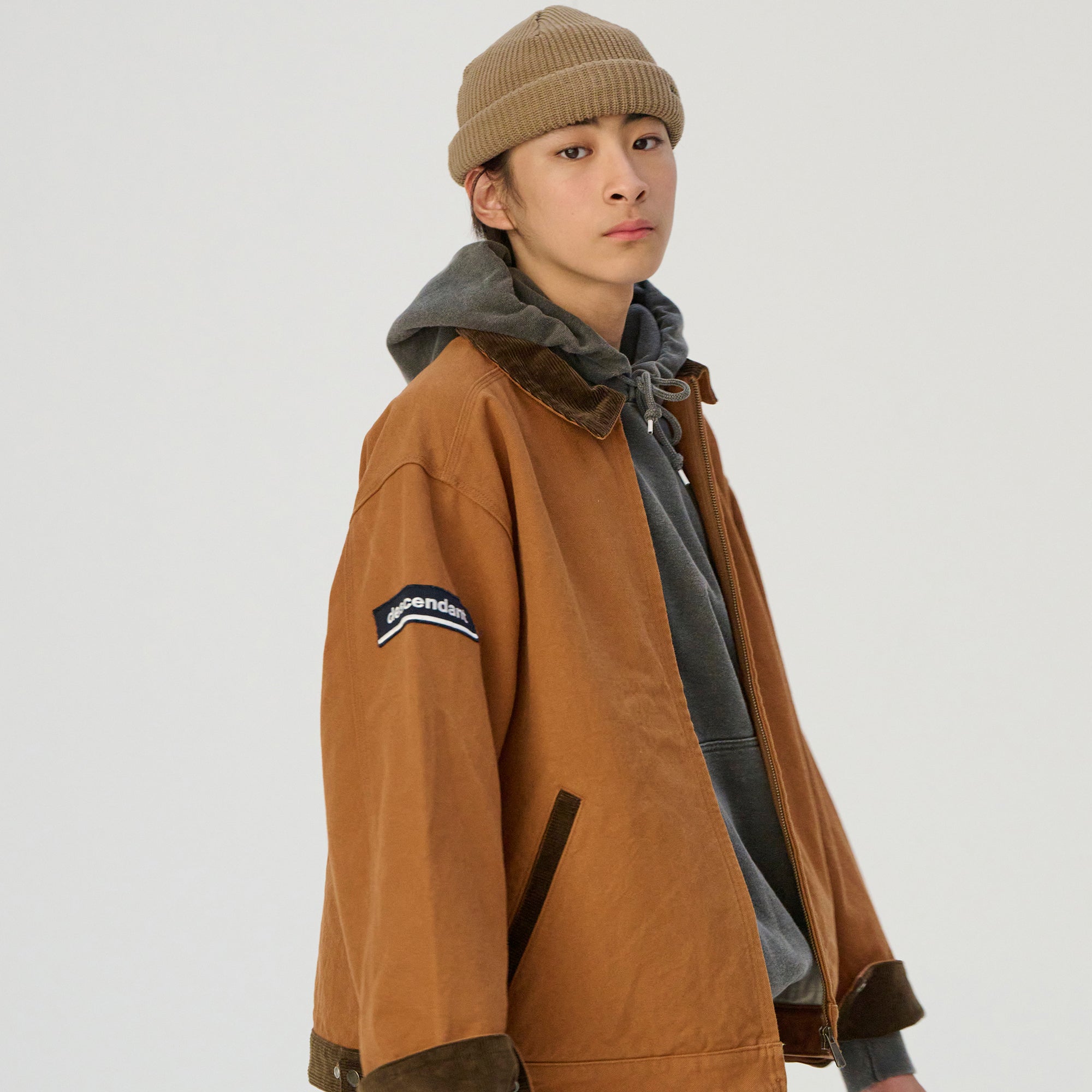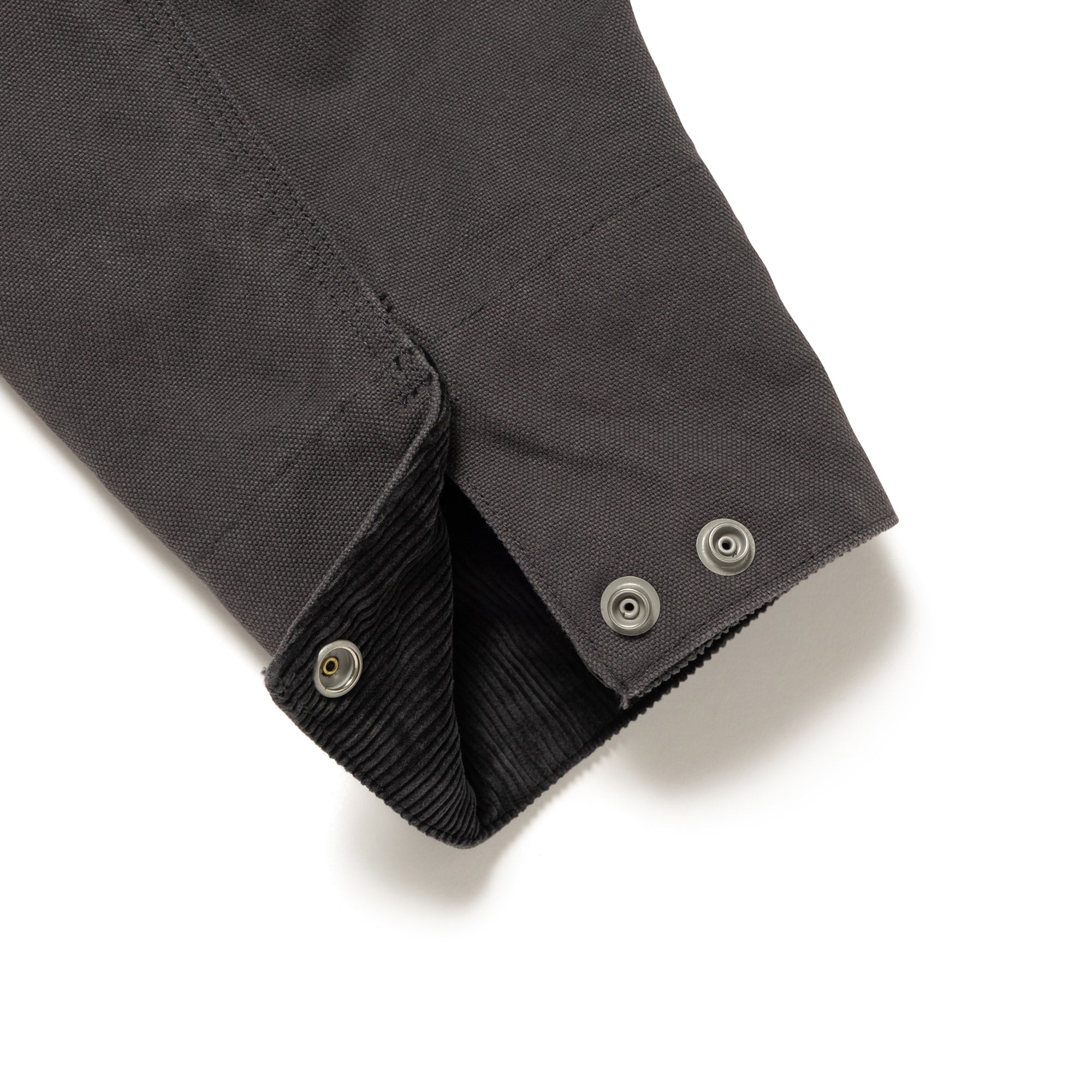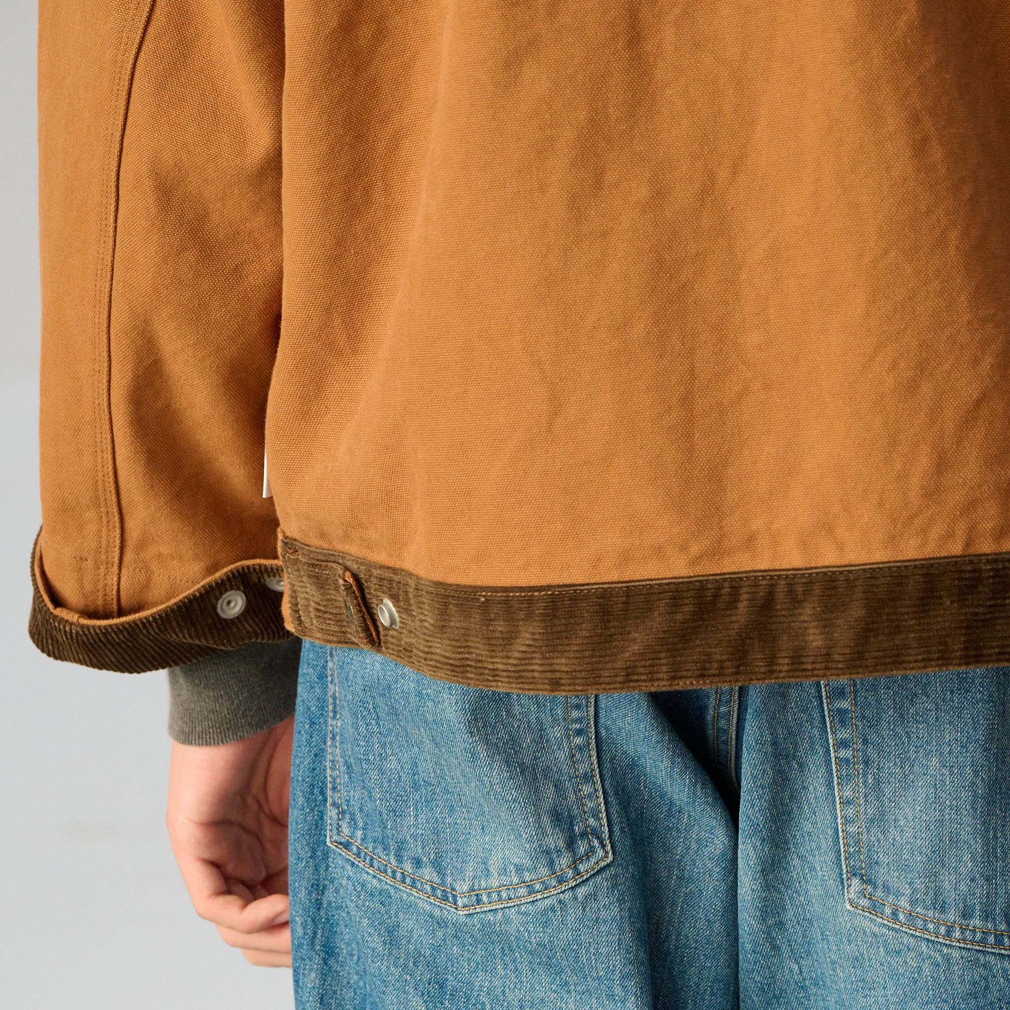 厚手の8号帆布を使用したコットンダックジャケット。襟、ポケット口布、背面の腰帯、袖口の内側にコーデュロイを切り替えた仕様。スナップボタン留めの袖口やアジャスターボタン付きの腰帯などワークウェアのディテールを踏襲。右袖にHORIZONロゴの刺繍パッチ付き。