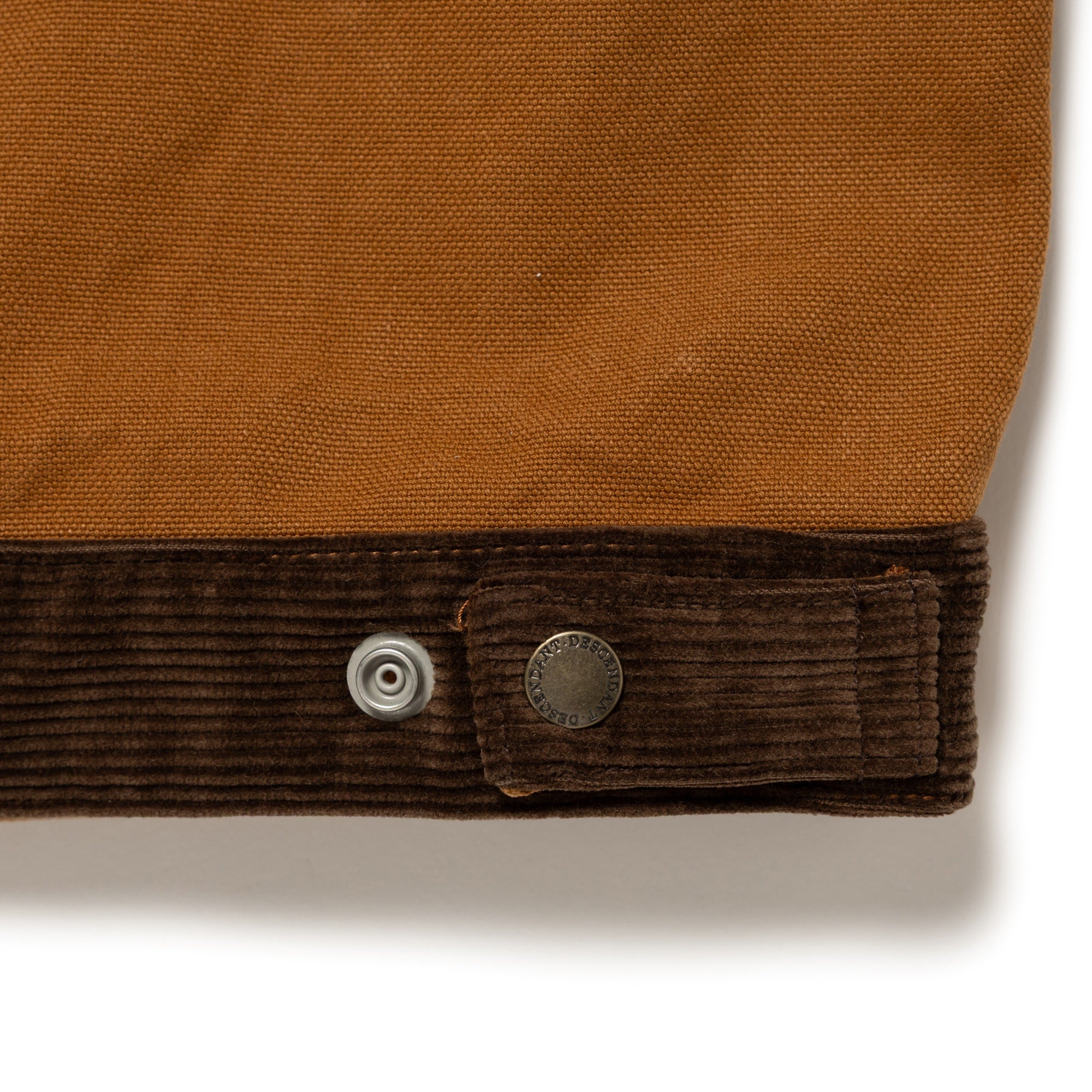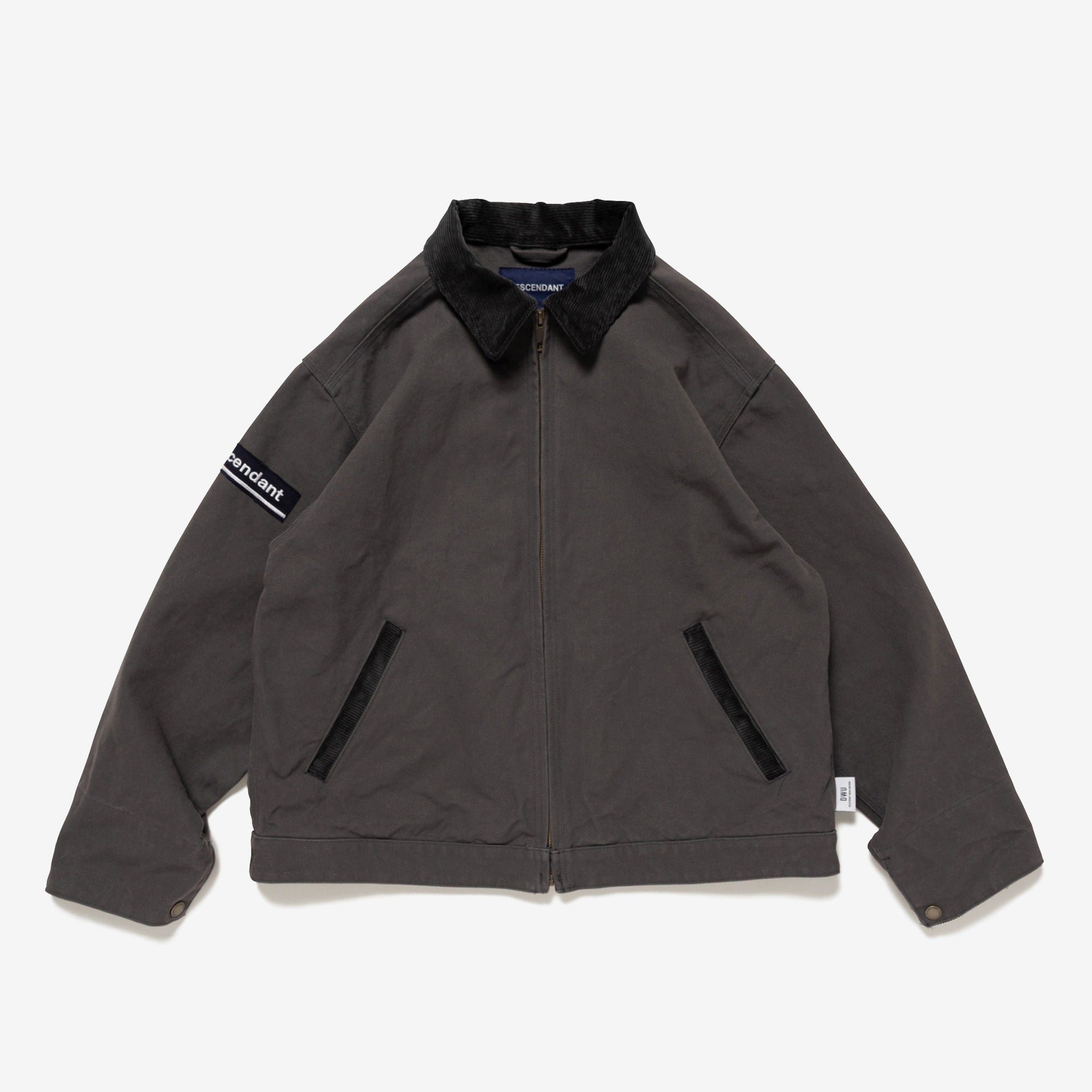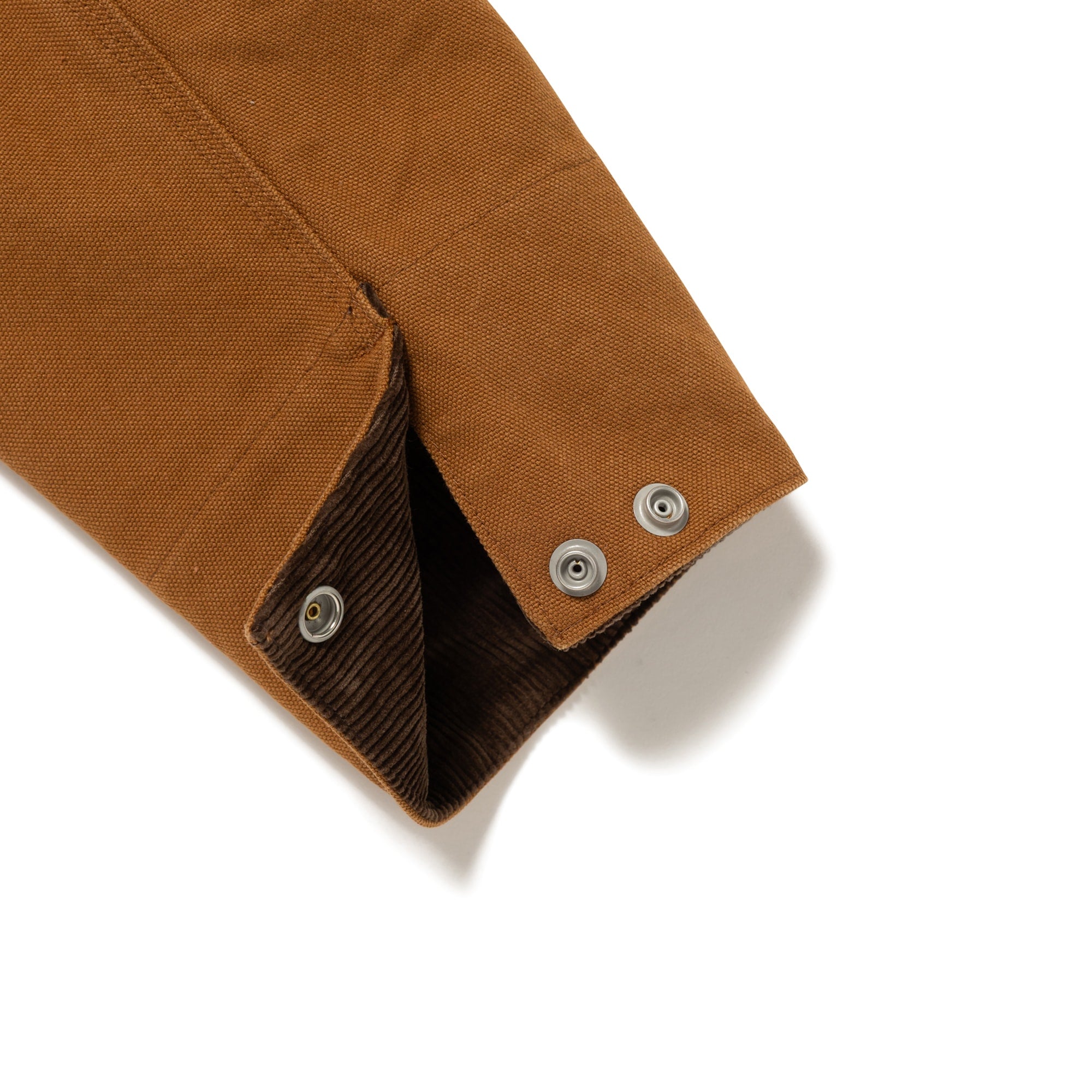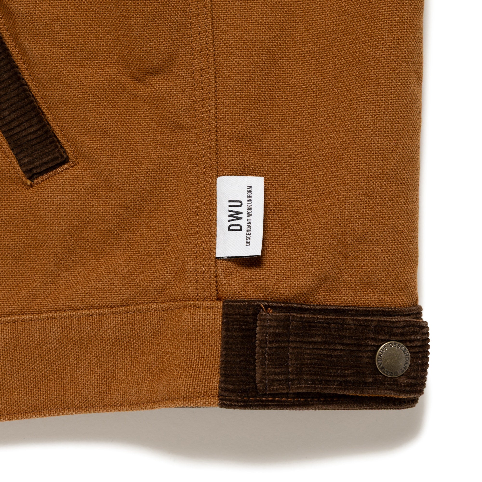 厚手の8号帆布を使用したコットンダックジャケット。襟、ポケット口布、背面の腰帯、袖口の内側にコーデュロイを切り替えた仕様。スナップボタン留めの袖口やアジャスターボタン付きの腰帯などワークウェアのディテールを踏襲。右袖にHORIZONロゴの刺繍パッチ付き。