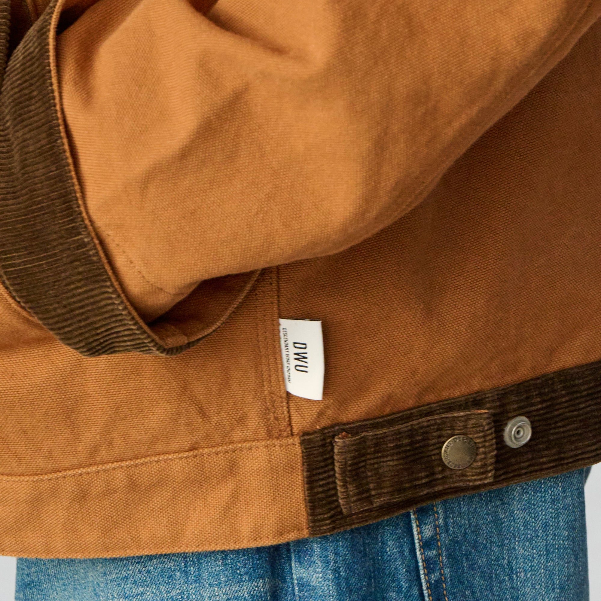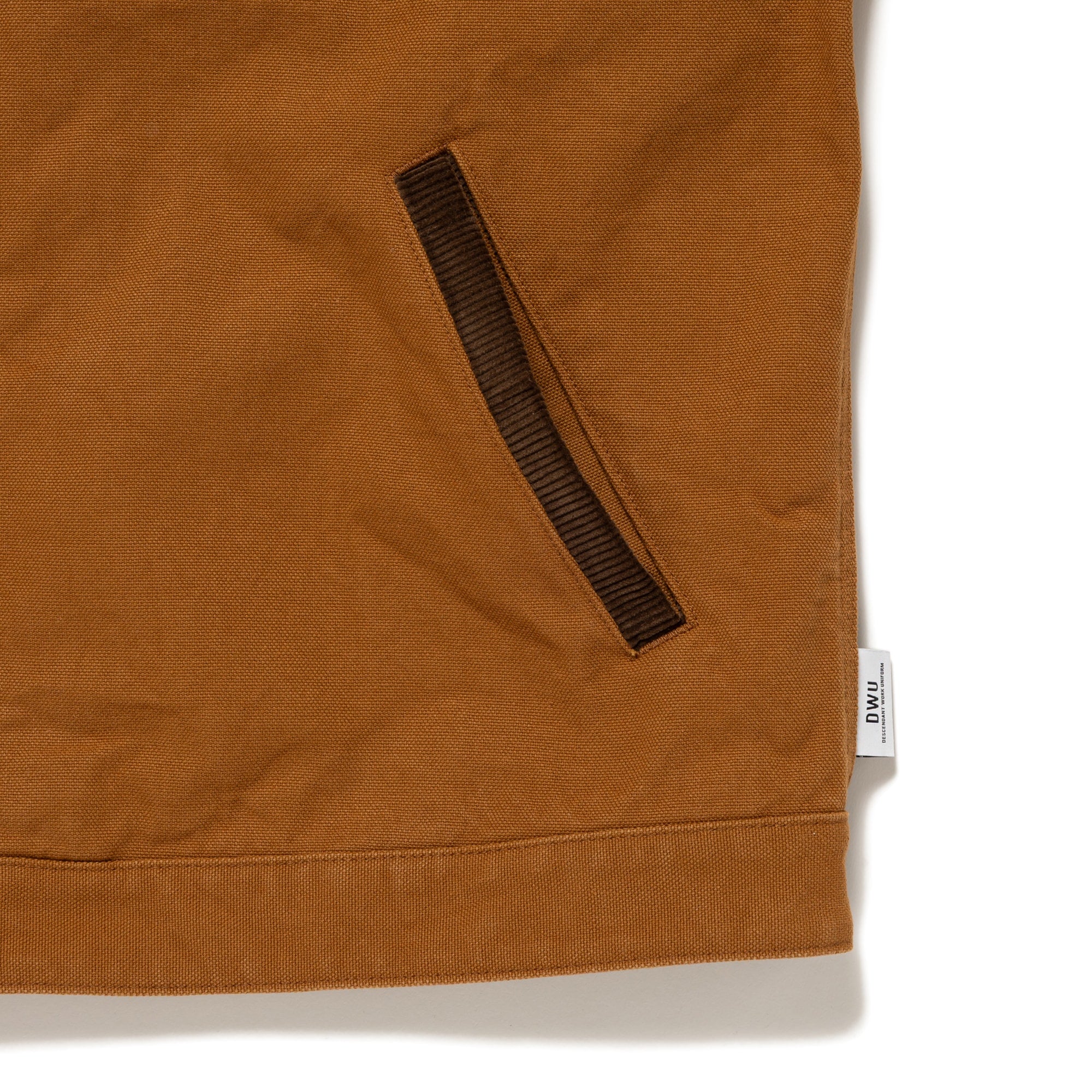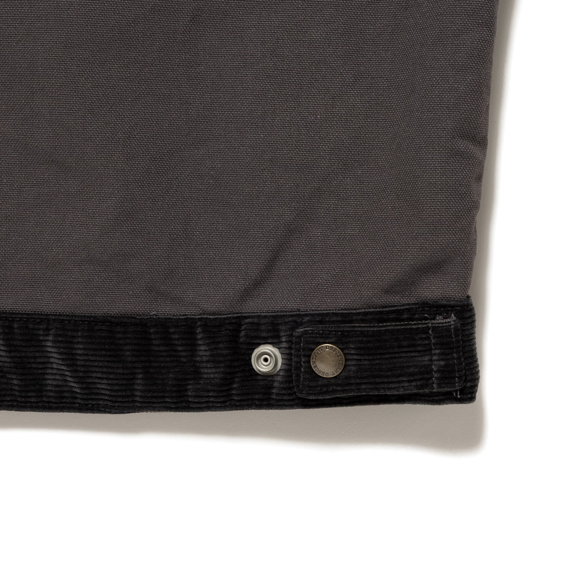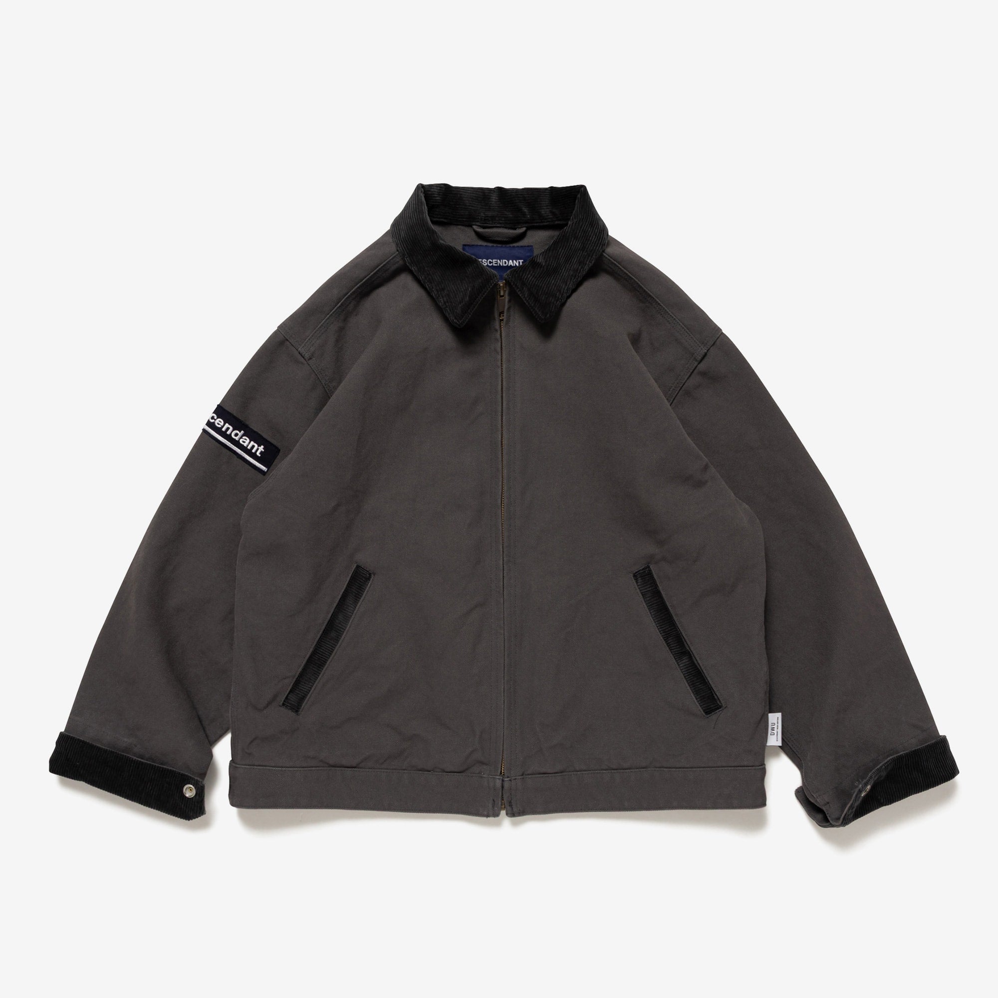 厚手の8号帆布を使用したコットンダックジャケット。襟、ポケット口布、背面の腰帯、袖口の内側にコーデュロイを切り替えた仕様。スナップボタン留めの袖口やアジャスターボタン付きの腰帯などワークウェアのディテールを踏襲。右袖にHORIZONロゴの刺繍パッチ付き。