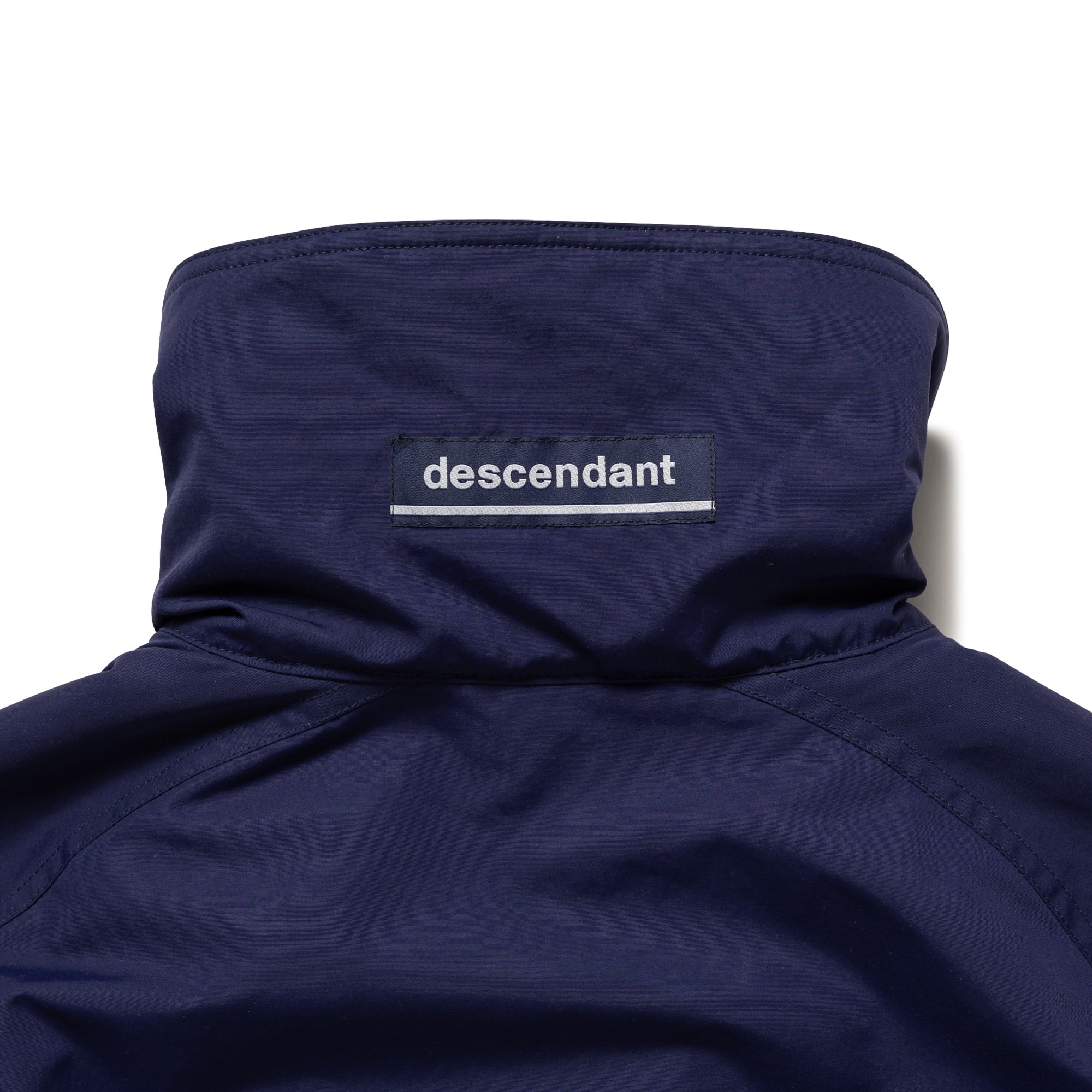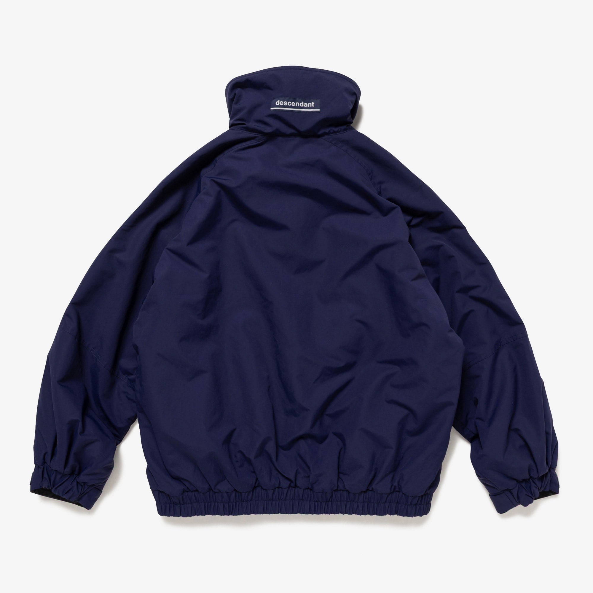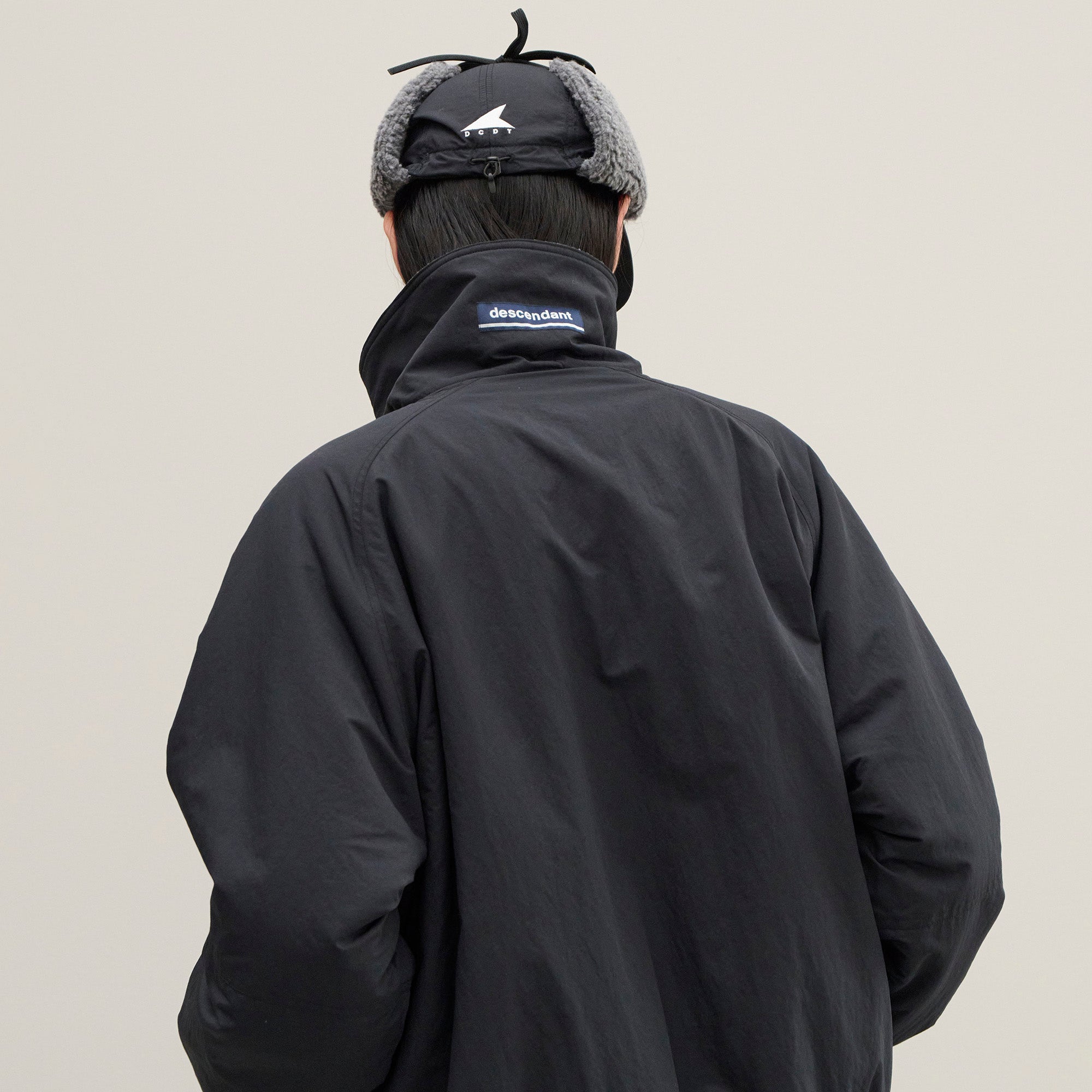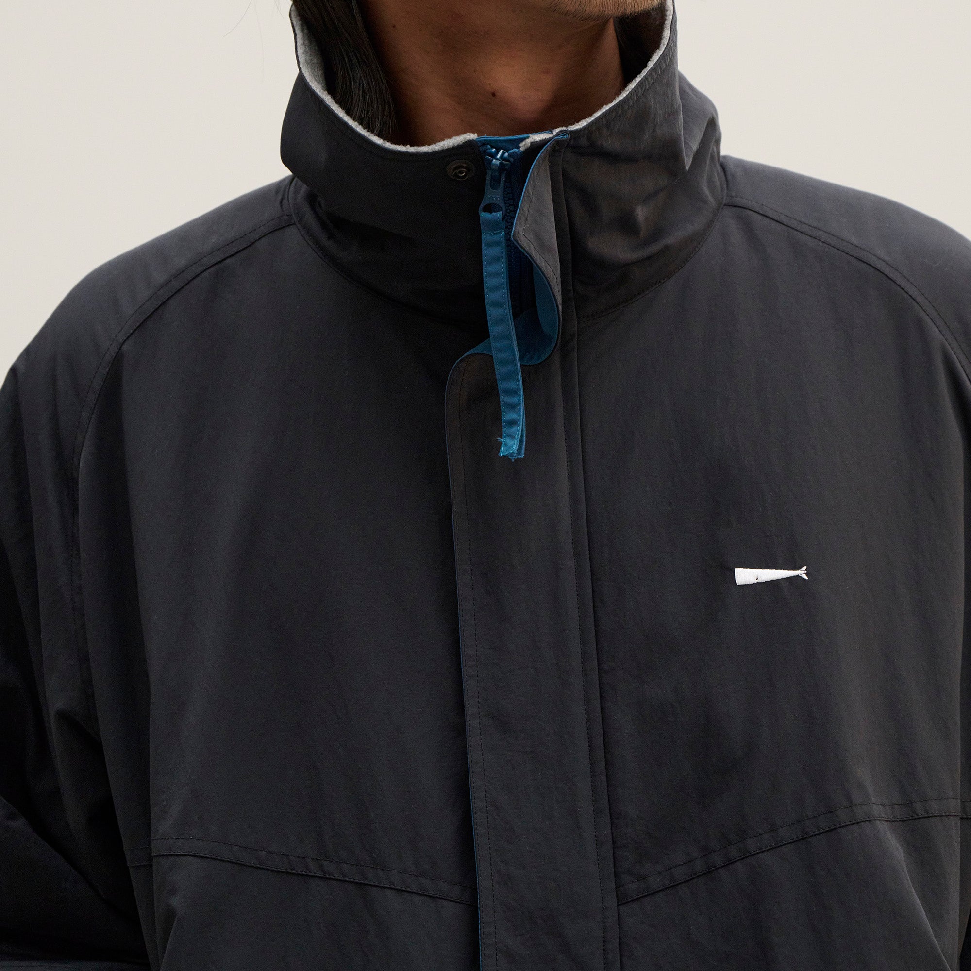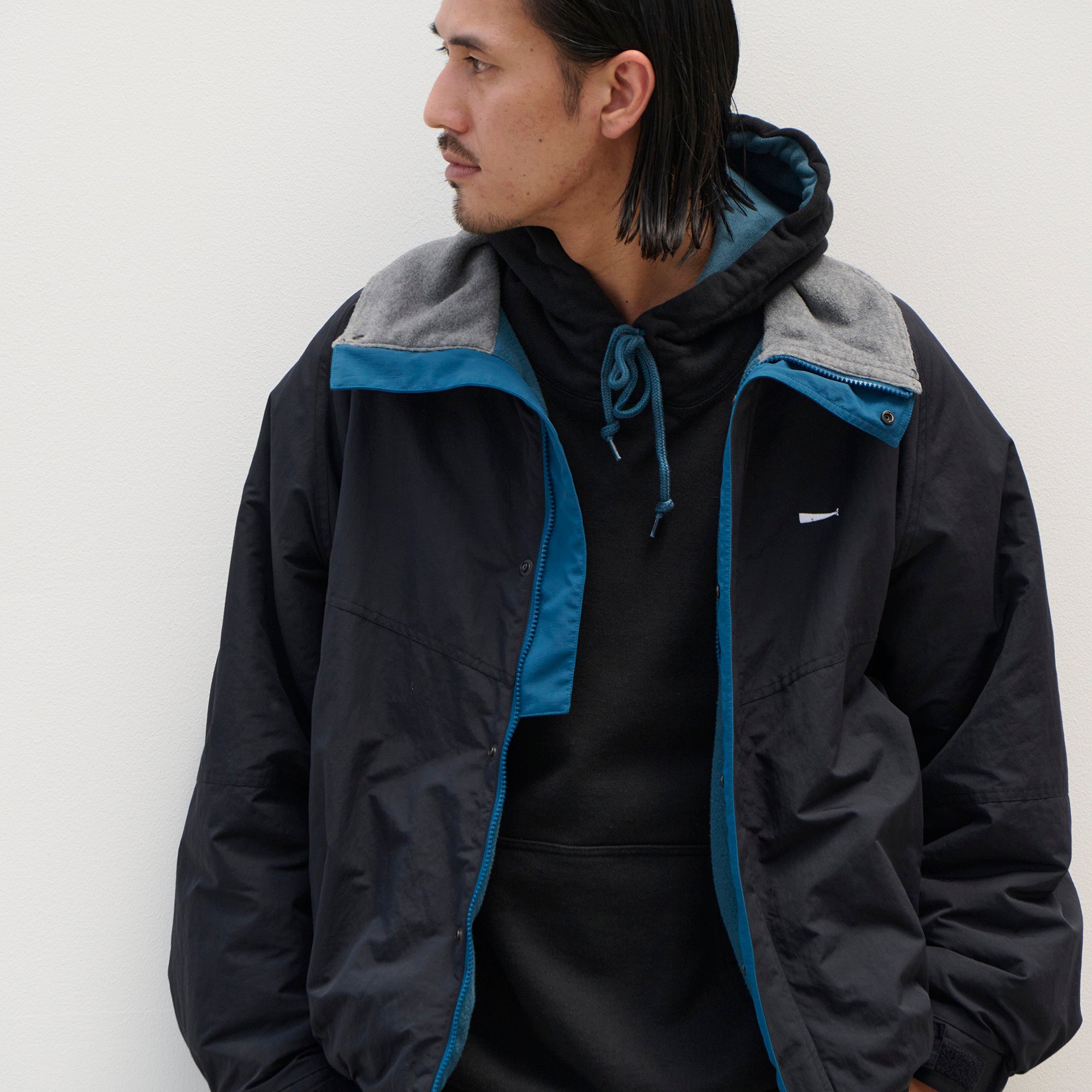ナイロンタッサーを表地に、リサイクルポリエステル製のフリースを裏地に使用したラグランスリーブのナイロンジャケット。比翼仕立ての前立て、身頃の左右にハンドウォーマーを配し、左胸にCACHALOTの刺繍、襟の背面にHORIZONロゴのネーム付き。