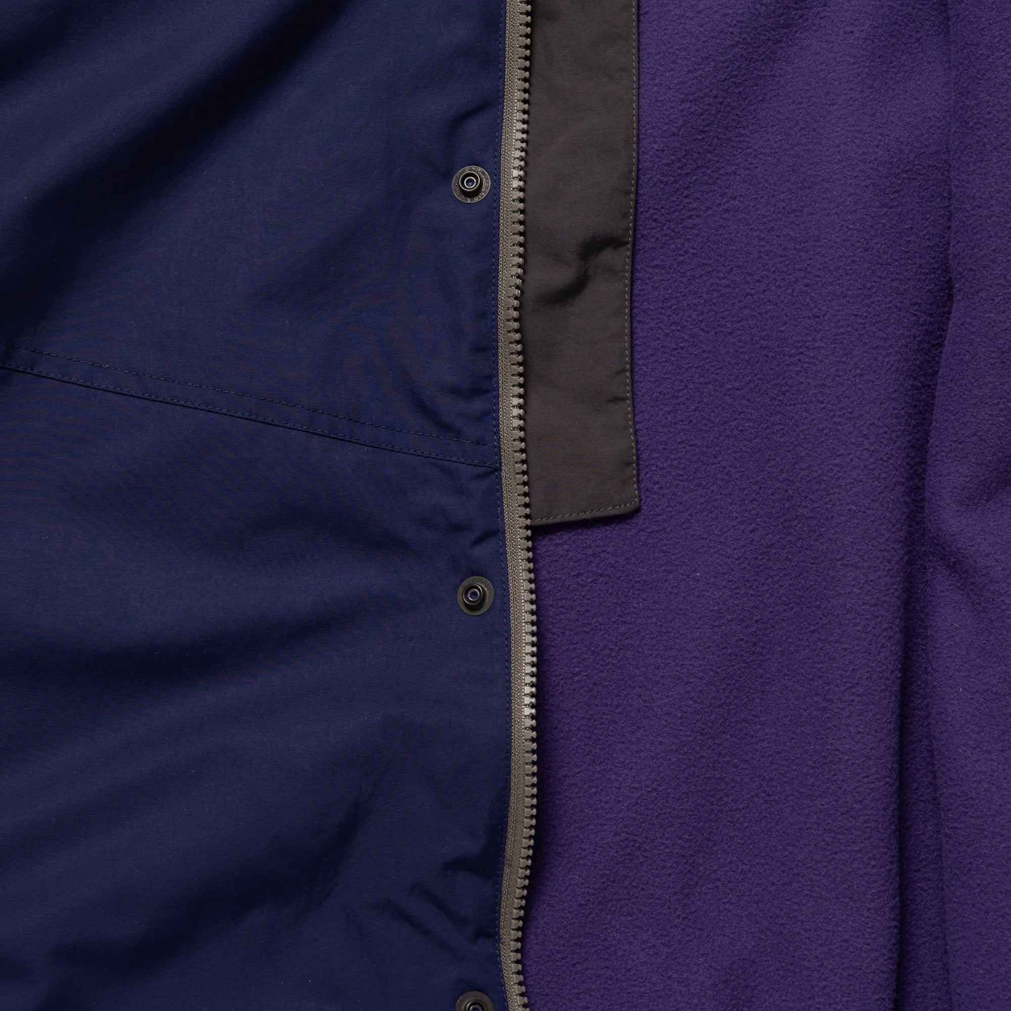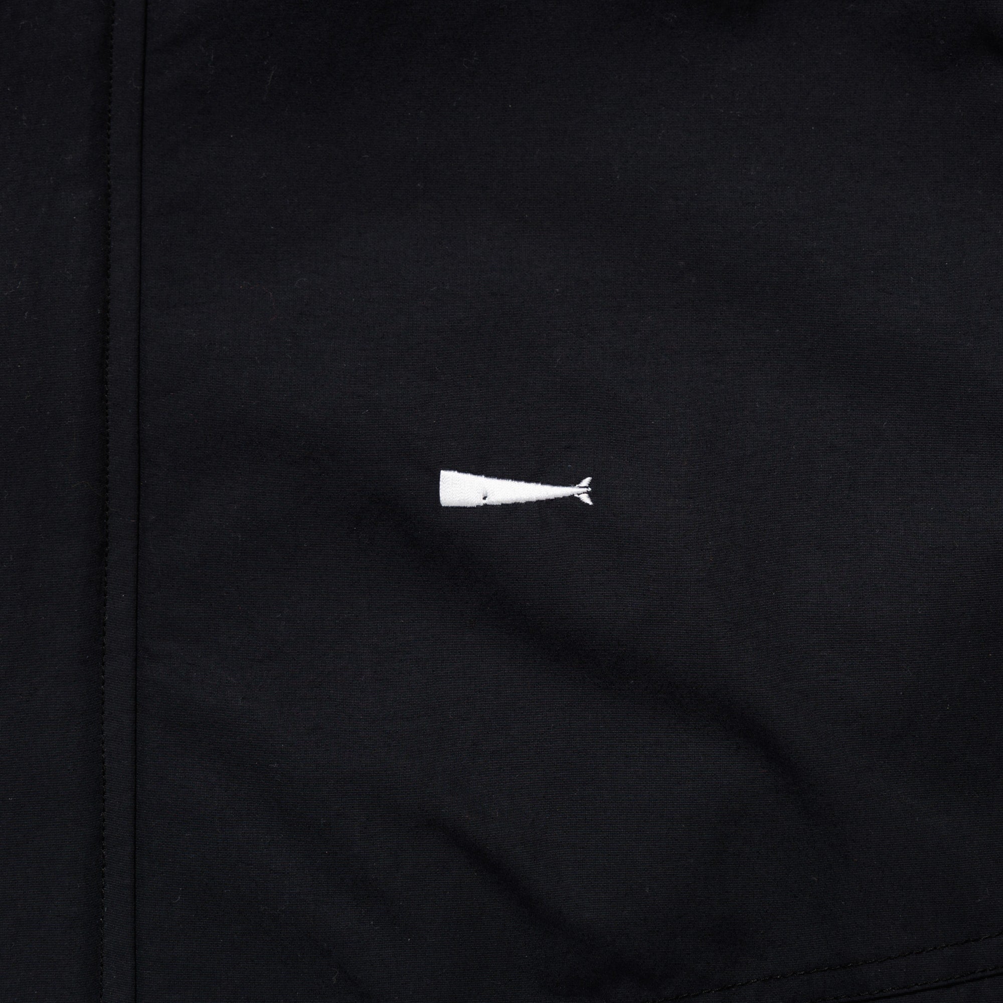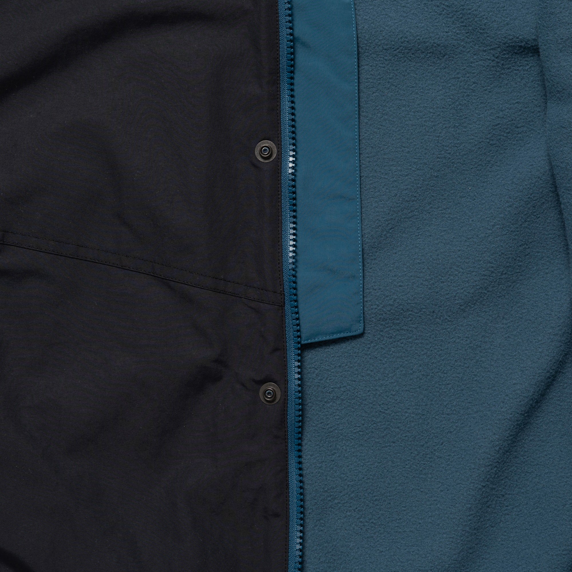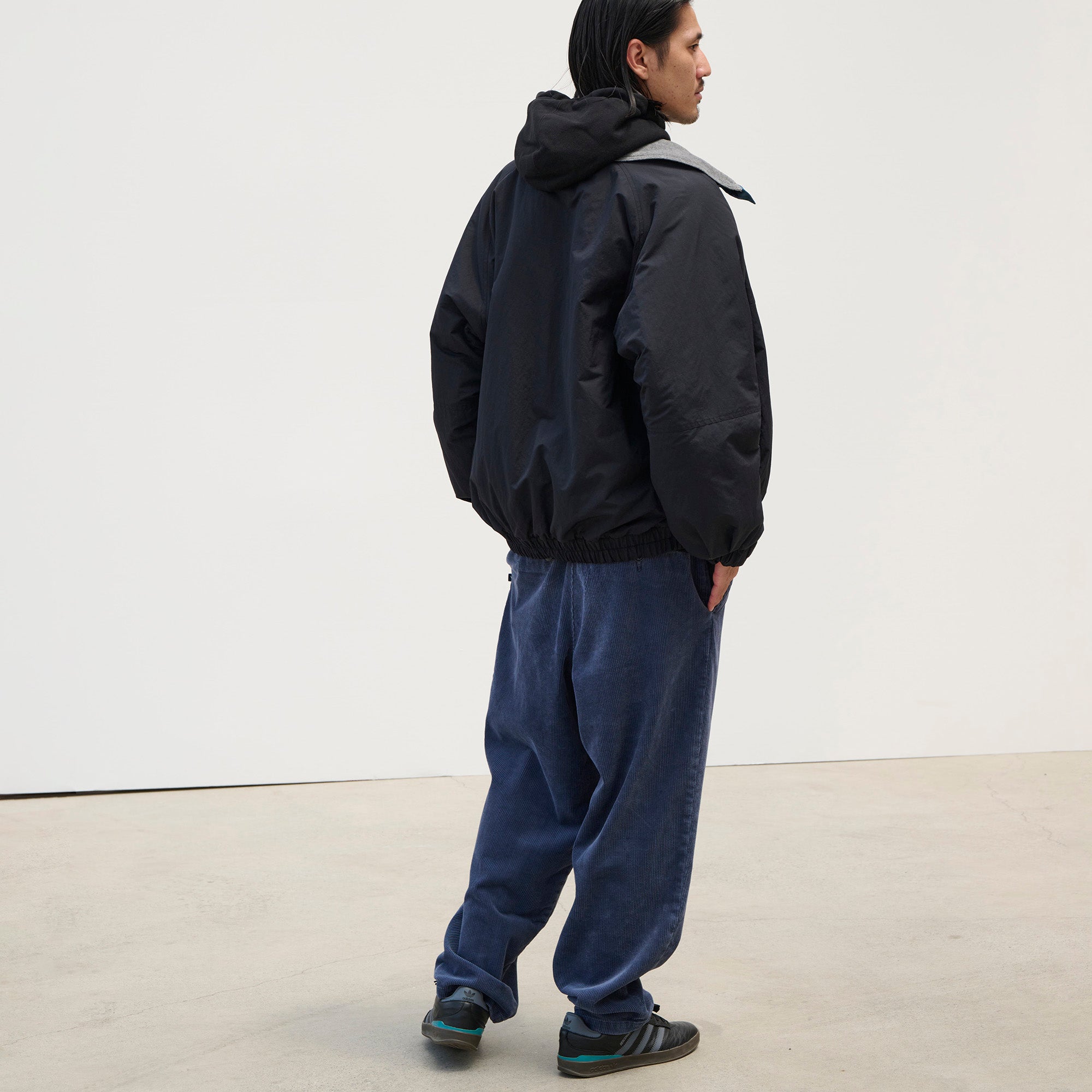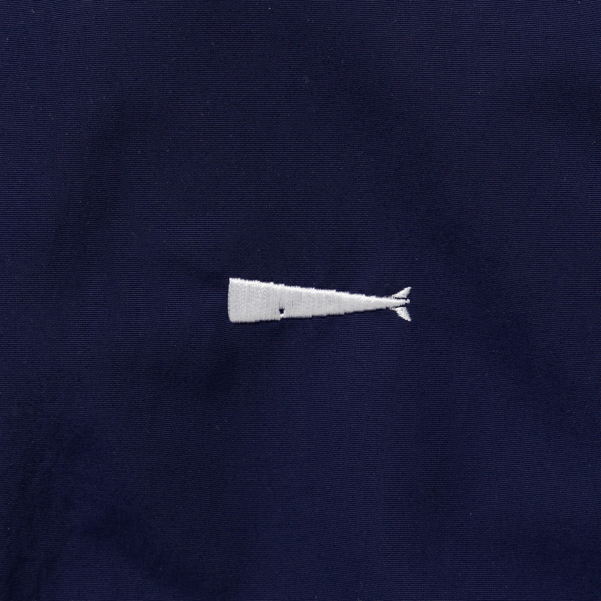 ナイロンタッサーを表地に、リサイクルポリエステル製のフリースを裏地に使用したラグランスリーブのナイロンジャケット。比翼仕立ての前立て、身頃の左右にハンドウォーマーを配し、左胸にCACHALOTの刺繍、襟の背面にHORIZONロゴのネーム付き。