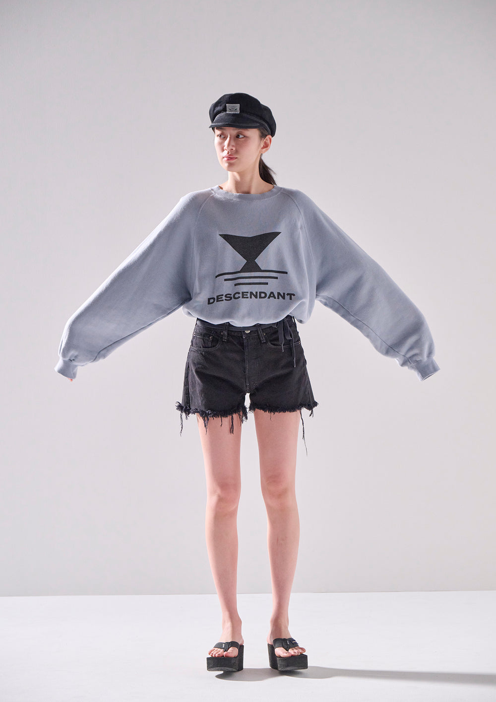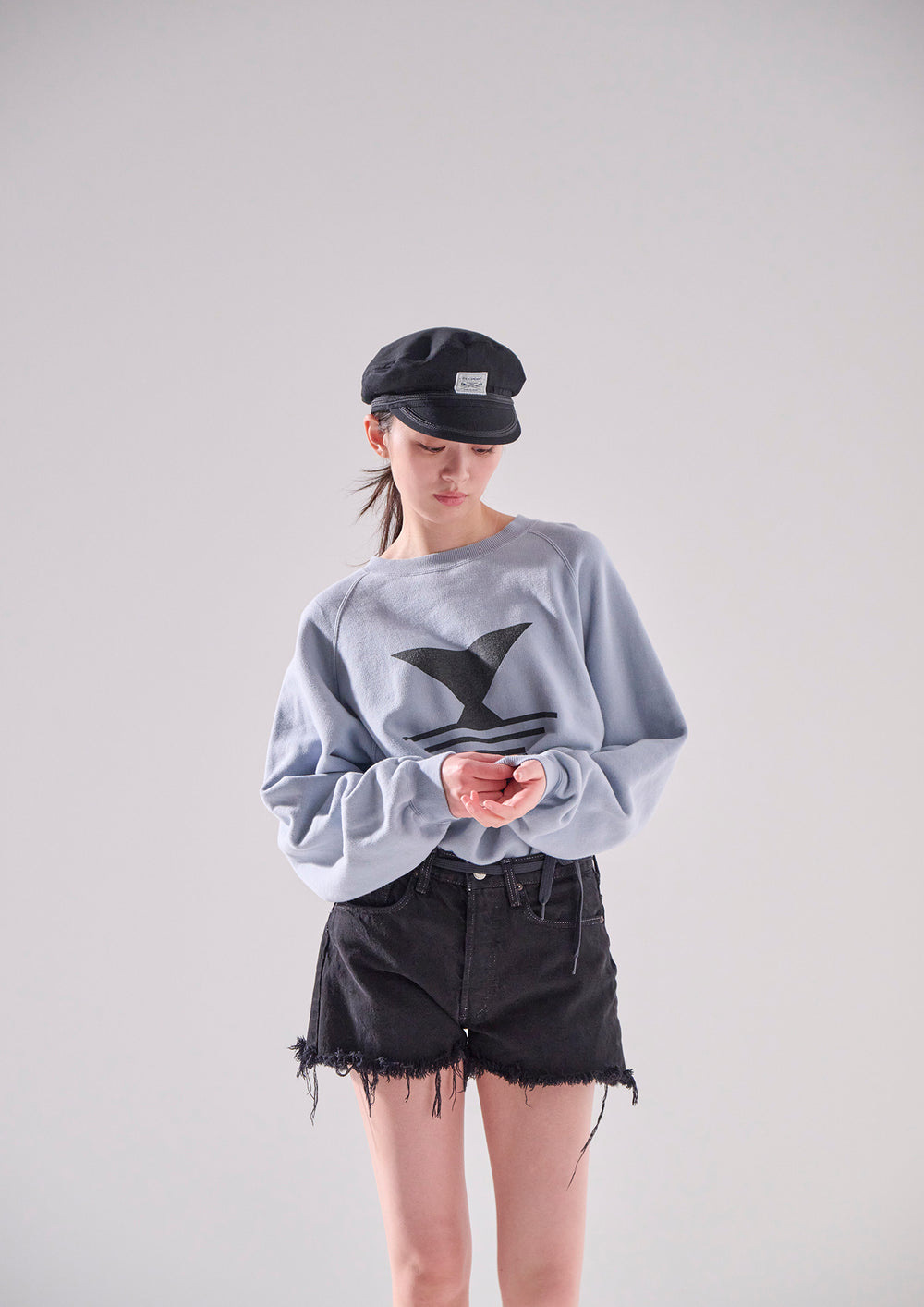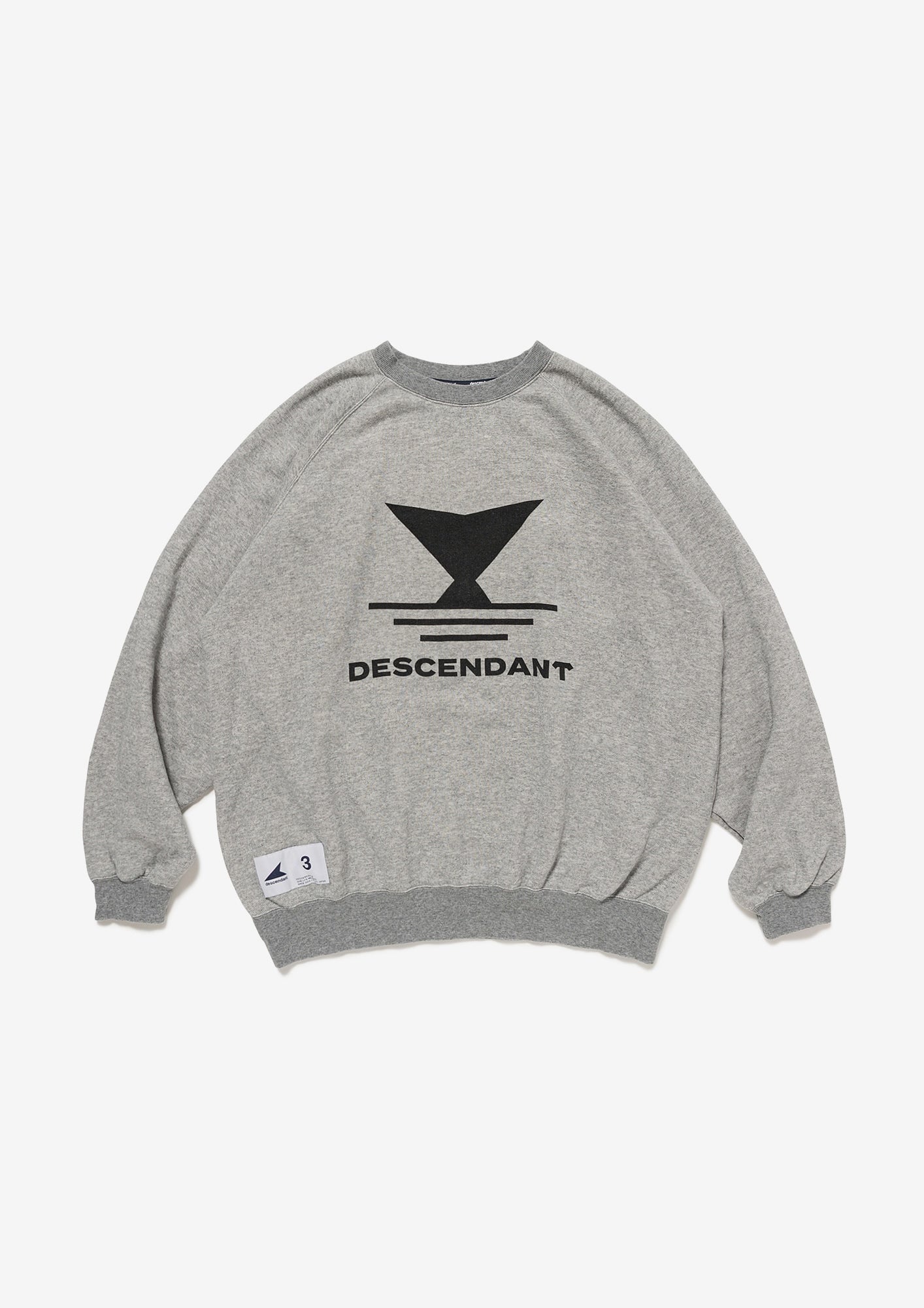 リヨセル混のコットン裏毛を使用したクルーネックスウェットシャツ。ラグランスリーブのゆったりした身幅のシルエット、前身頃にFLUKE UPのグラフィックを染み込みプリント。襟ぐりの継ぎ目にはオリジナルテープのパイピング。右前裾にサイズを表示したCETUSの織りネーム付き。グレー、ライトブルー、イエローの3色展開。