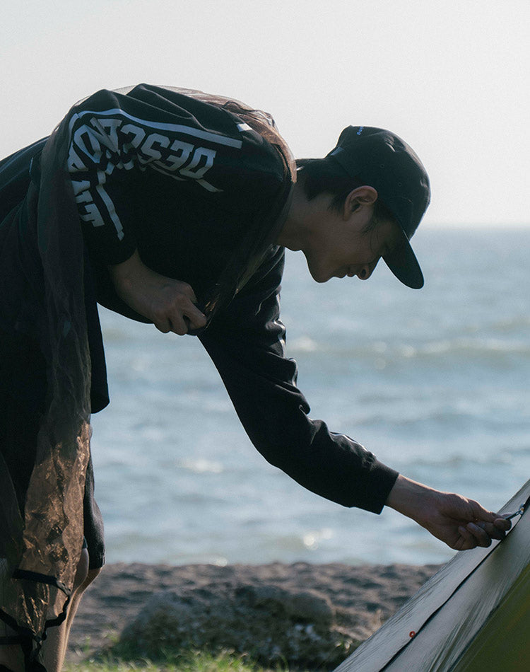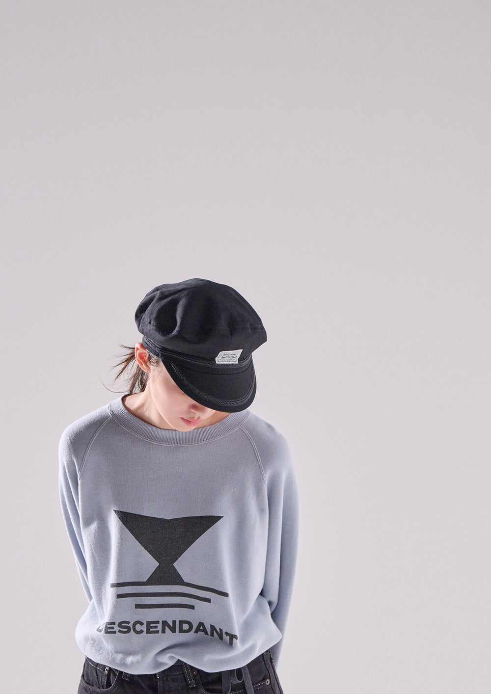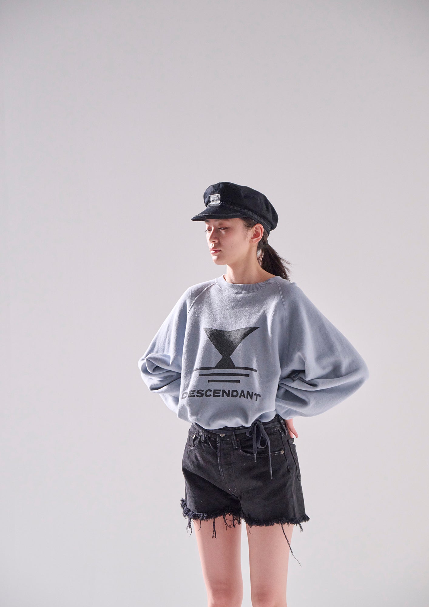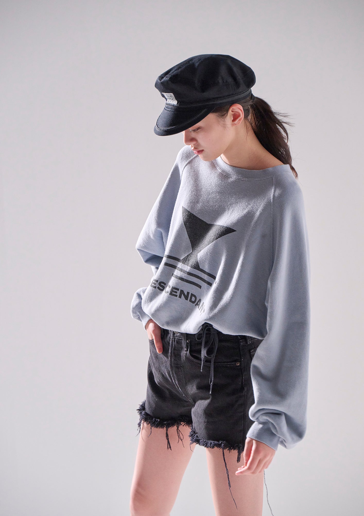 リヨセル混のコットン裏毛を使用したクルーネックスウェットシャツ。ラグランスリーブのゆったりした身幅のシルエット、前身頃にFLUKE UPのグラフィックを染み込みプリント。襟ぐりの継ぎ目にはオリジナルテープのパイピング。右前裾にサイズを表示したCETUSの織りネーム付き。グレー、ライトブルー、イエローの3色展開。