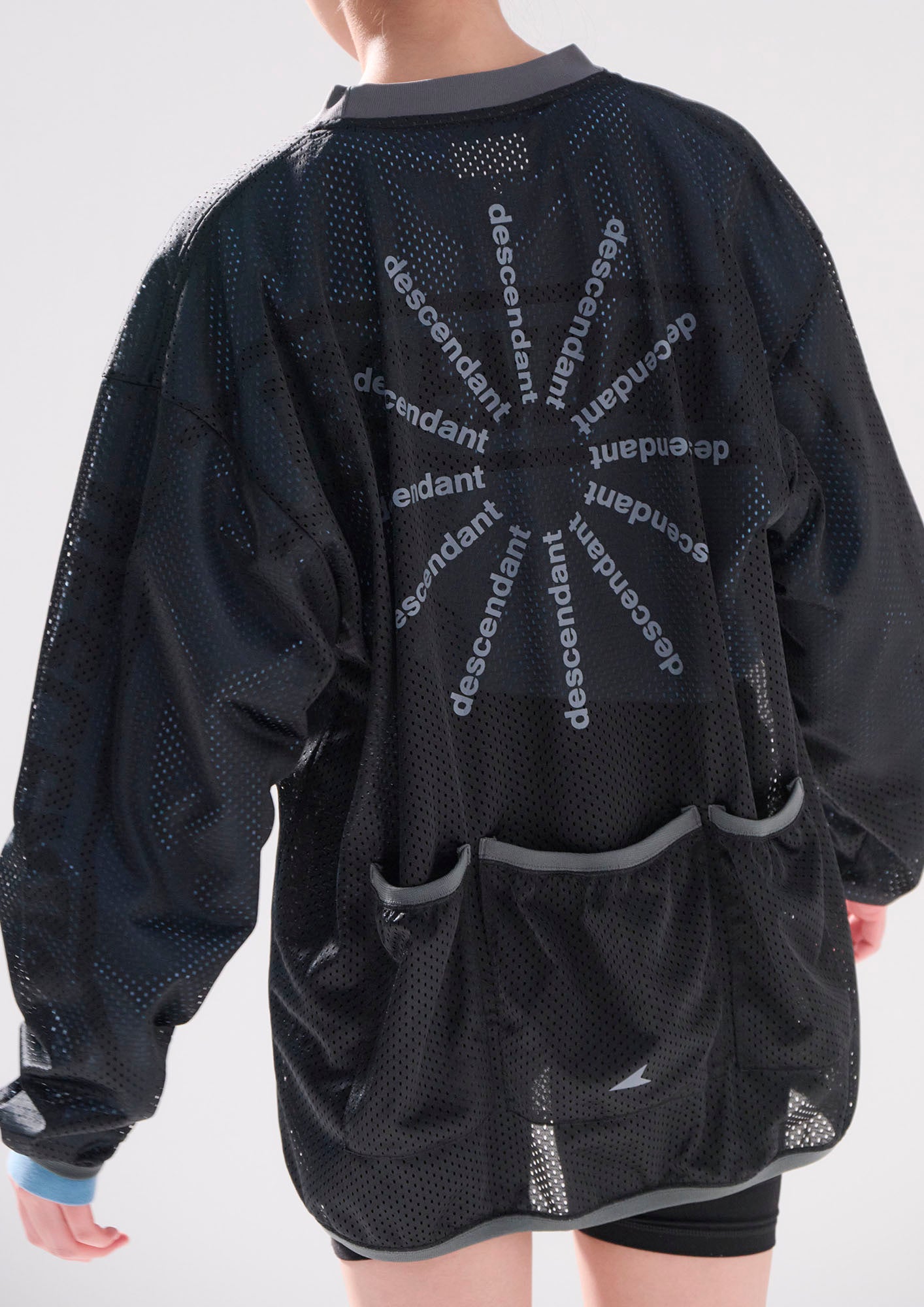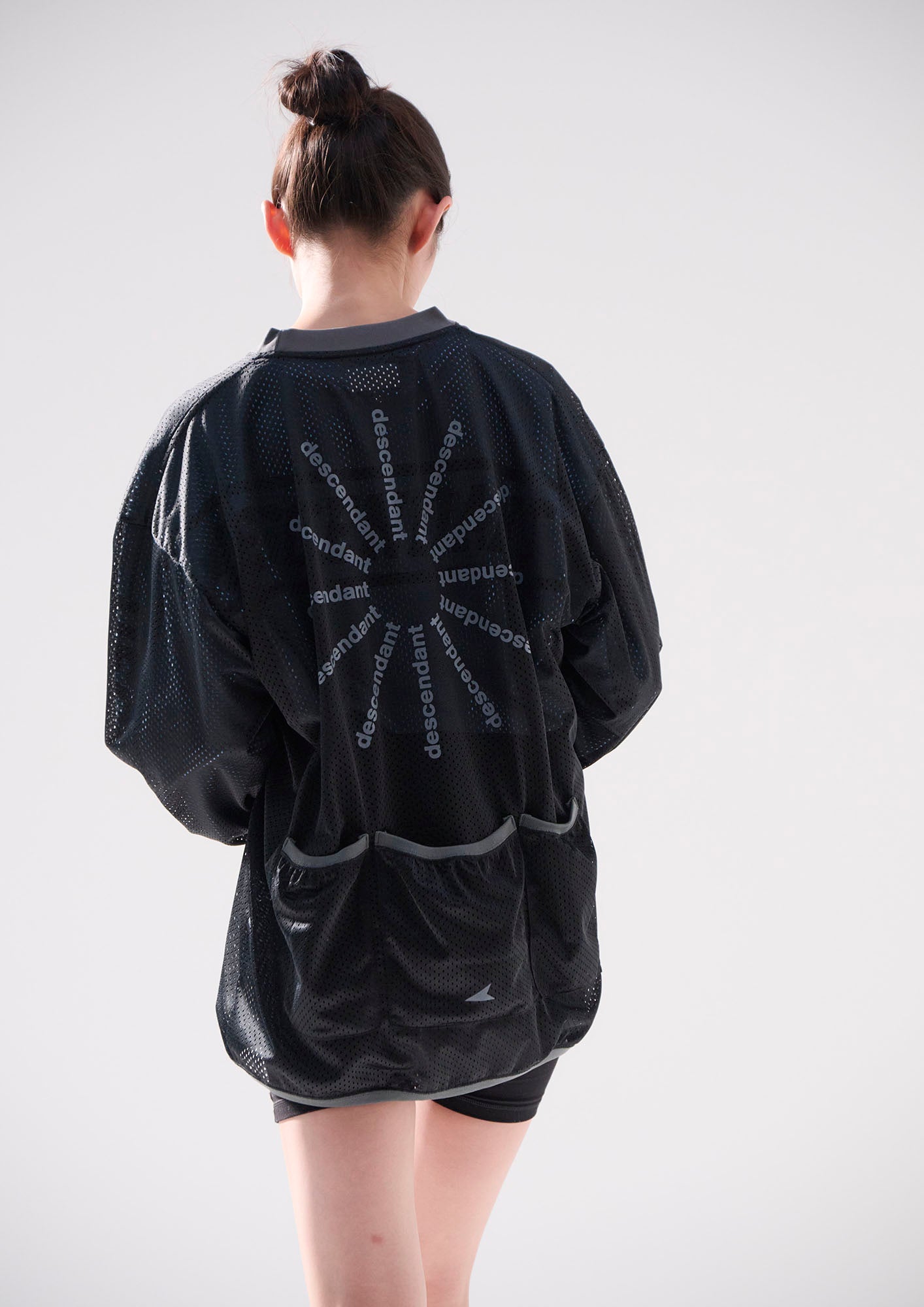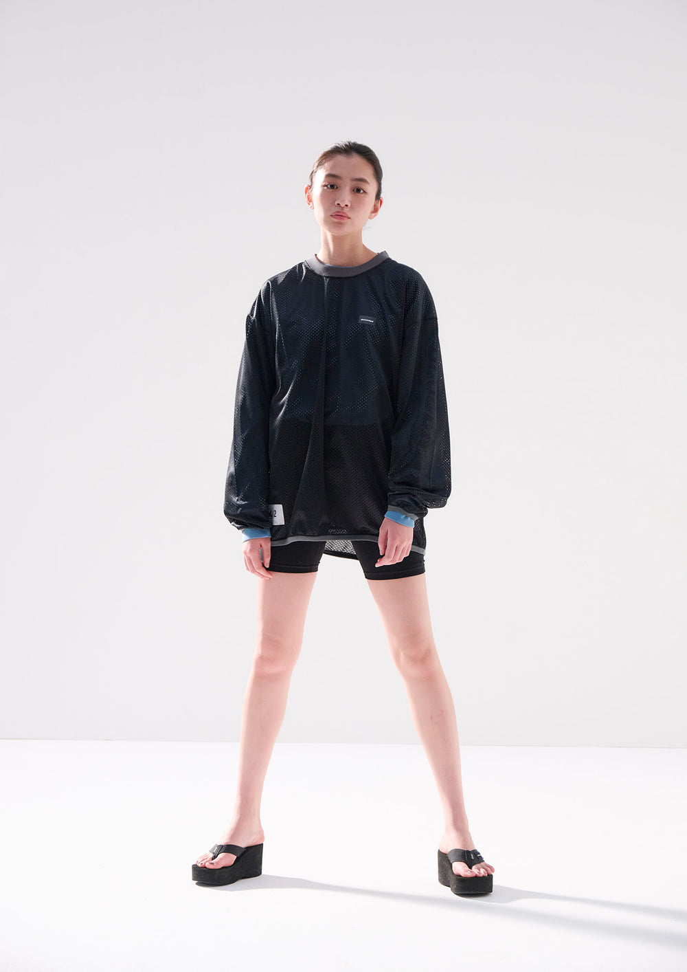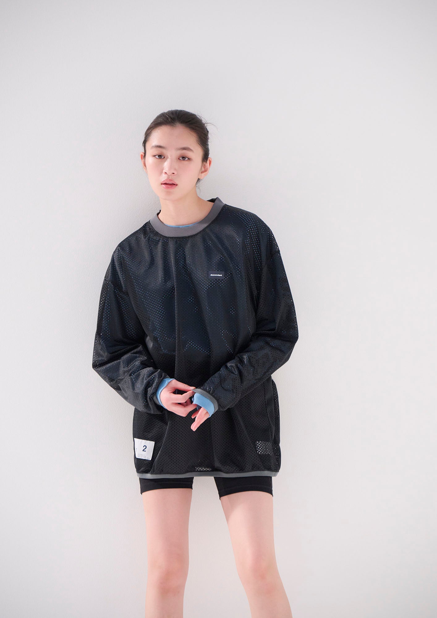 ポリエステルメッシュを使用したロングスリーブカットソー。左胸にボックスロゴのワンポイント、背面に自転車のスポーク状のグラフィックをプリント、背面の腰にはサイクルジャージーをイメージした3個間口のポケット付き。ゆったりした身幅に袖口と裾回りをパイピングで絞ったシルエット。襟ぐりの継ぎ目にはオリジナルテープのパイピング。右前裾にサイズを表示したCETUSの織りネーム付き。