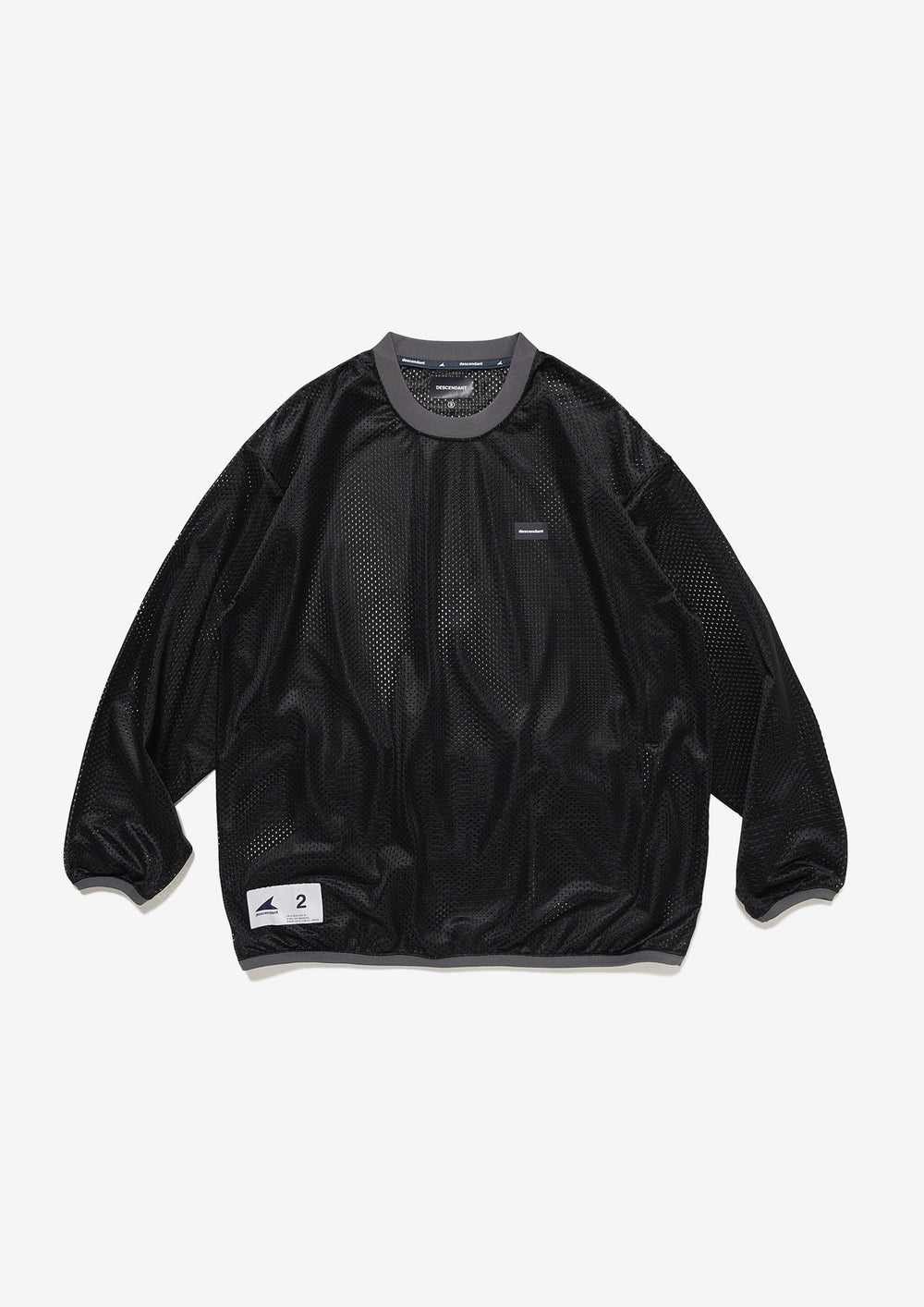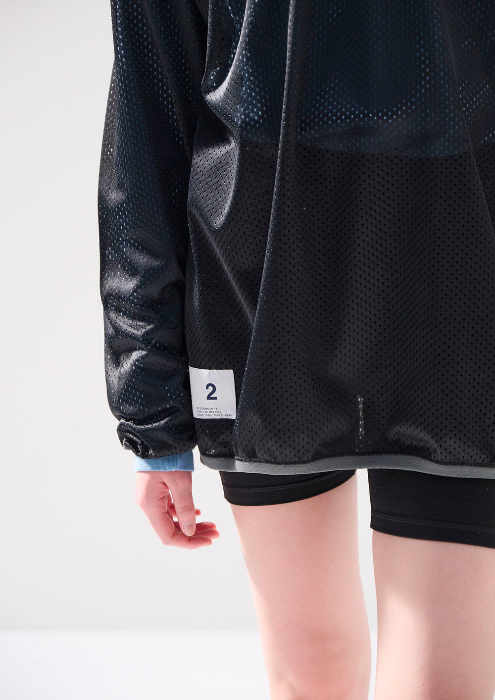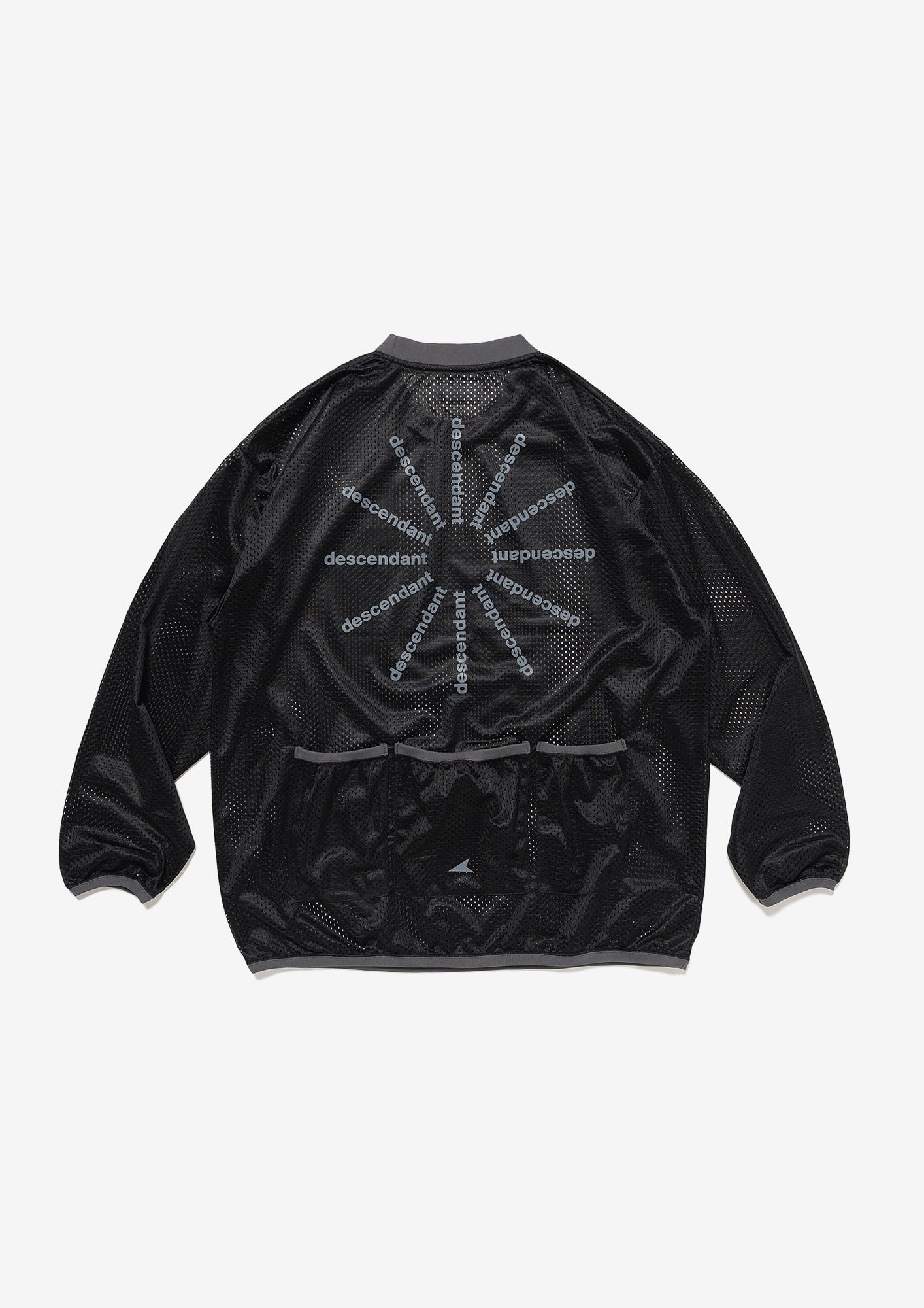 ポリエステルメッシュを使用したロングスリーブカットソー。左胸にボックスロゴのワンポイント、背面に自転車のスポーク状のグラフィックをプリント、背面の腰にはサイクルジャージーをイメージした3個間口のポケット付き。ゆったりした身幅に袖口と裾回りをパイピングで絞ったシルエット。襟ぐりの継ぎ目にはオリジナルテープのパイピング。右前裾にサイズを表示したCETUSの織りネーム付き。