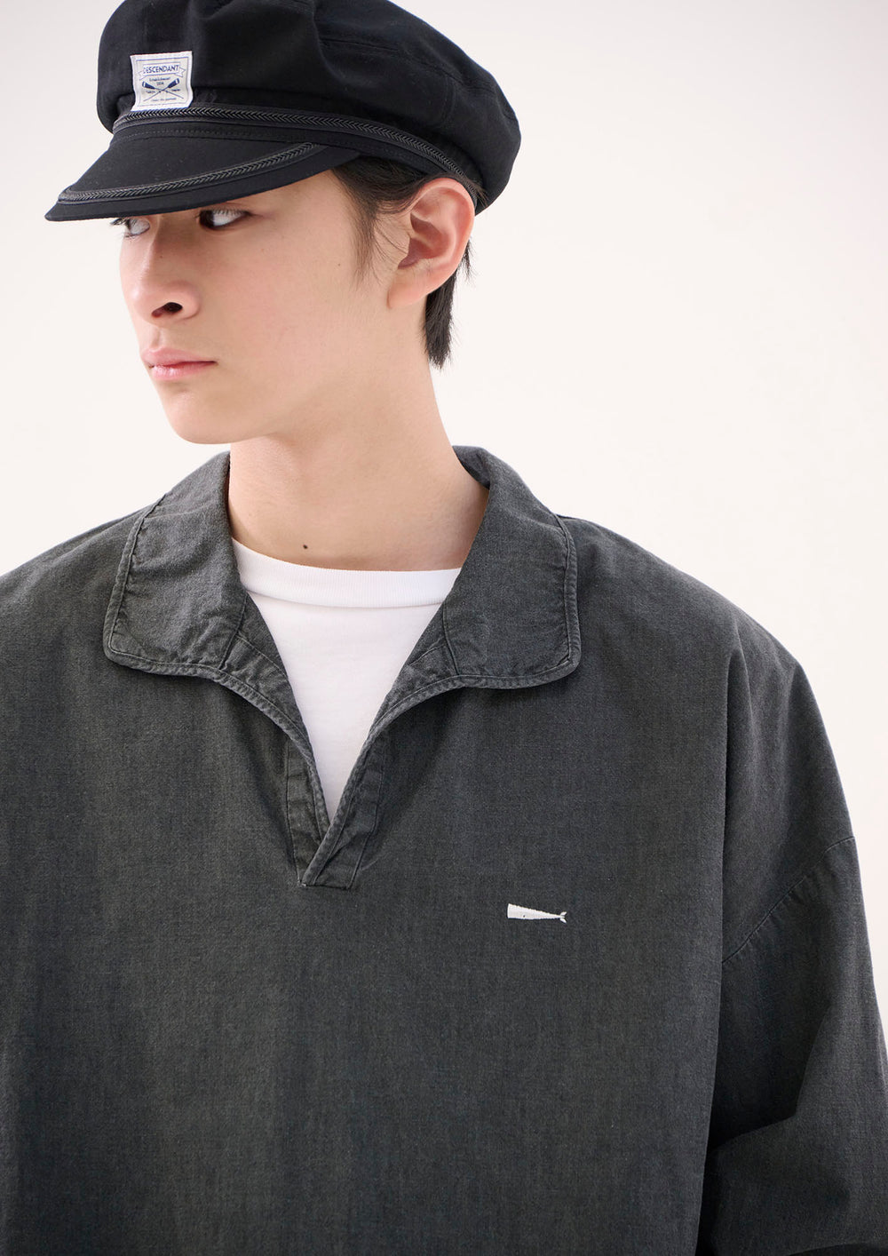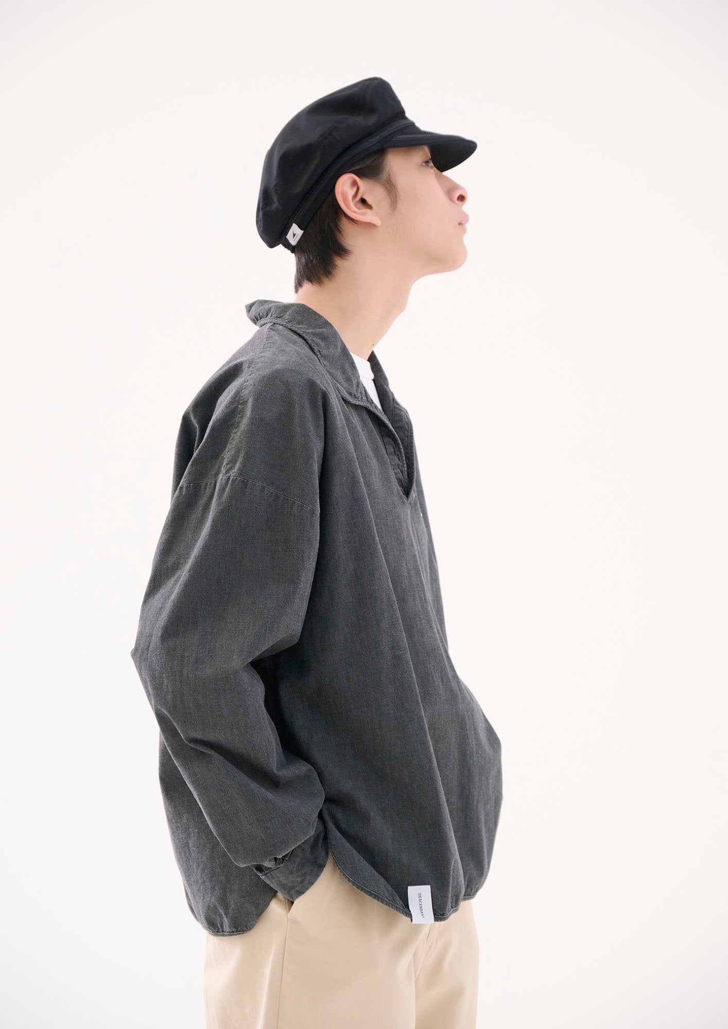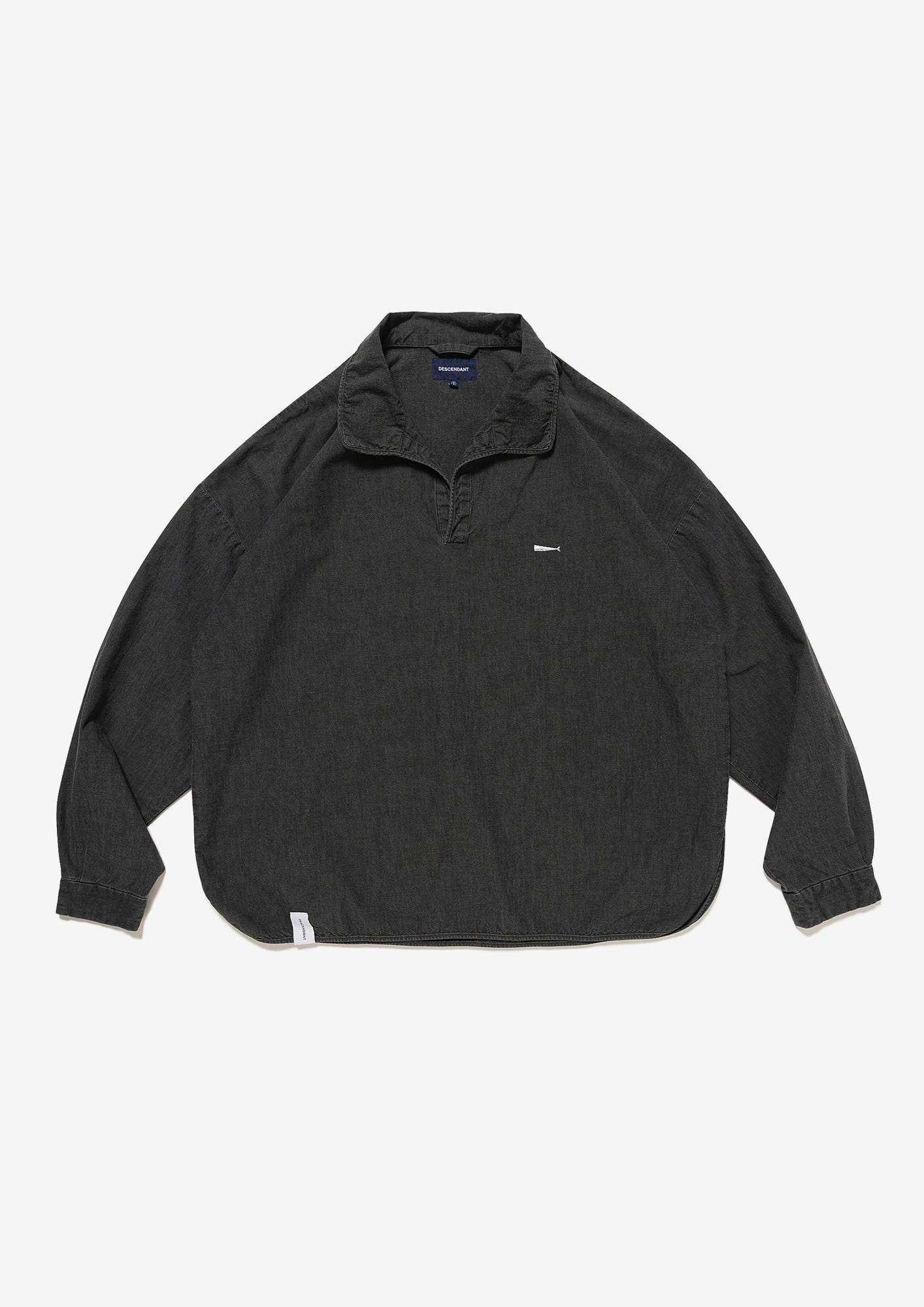 ウォッシュ加工を施したコットンシャンブレー製プルオーバーシャツ。ゆったりとした身幅とハーフプラケット仕様が特徴。裾はラウンドボトムにサイドスリットを入れ、前身頃の左胸にはCACHALOTの刺繍ロゴ。