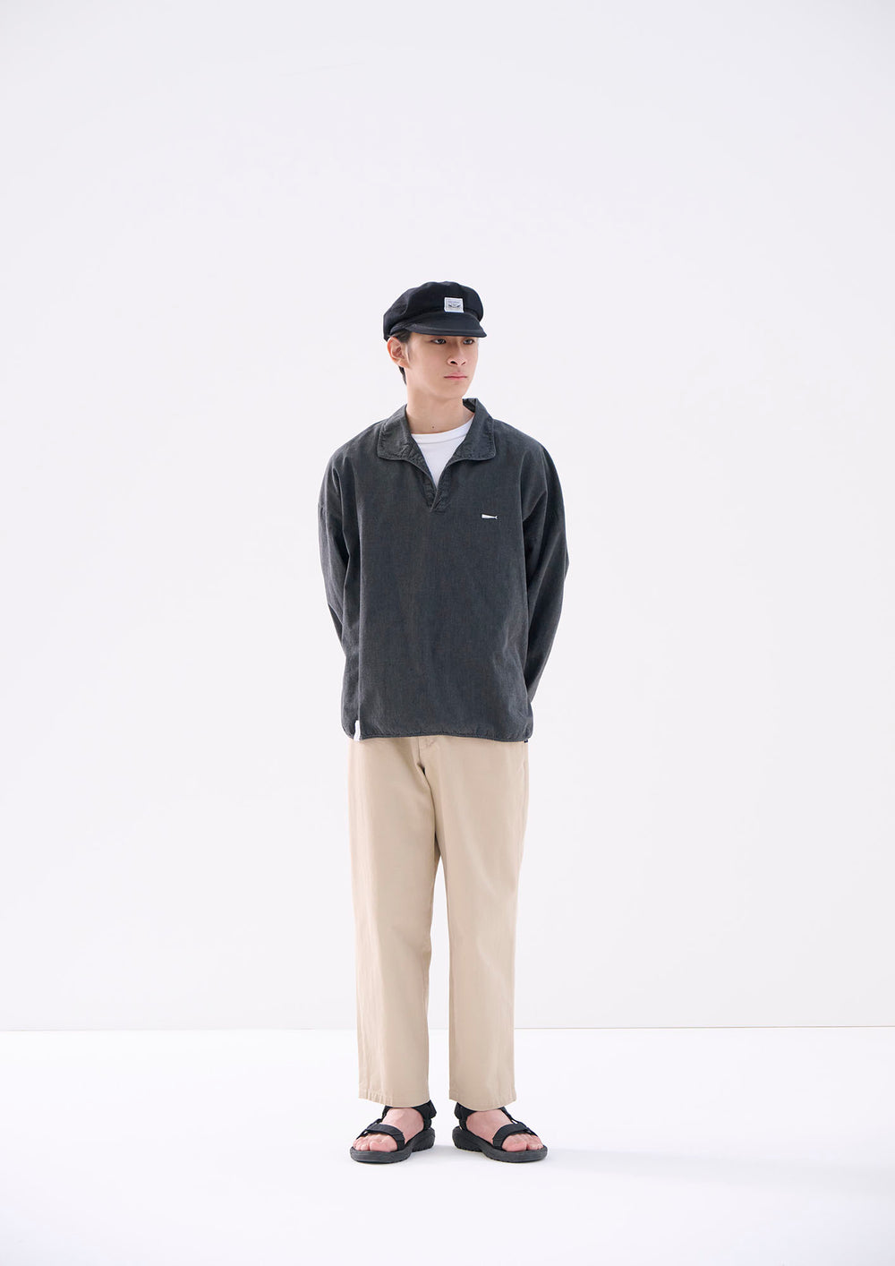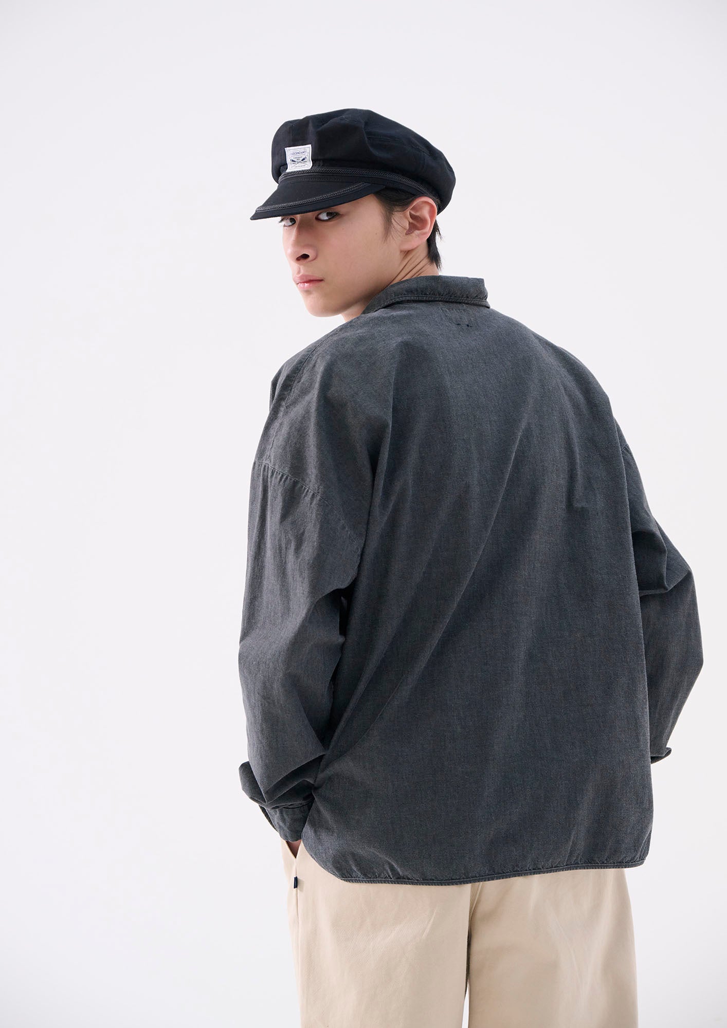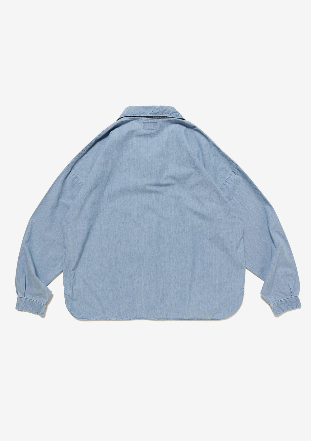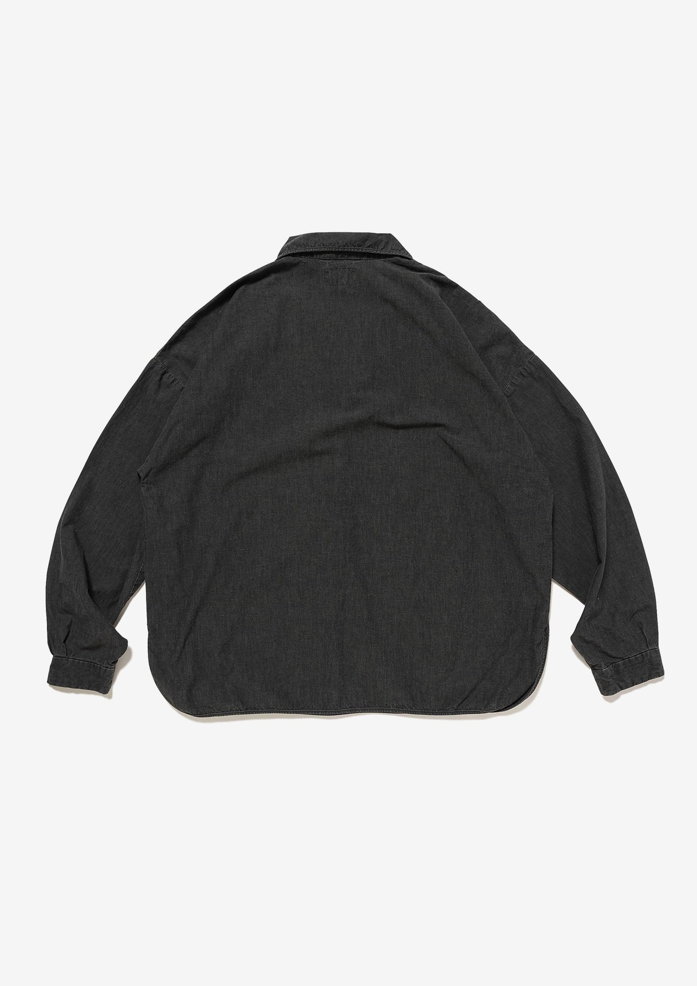 ウォッシュ加工を施したコットンシャンブレー製プルオーバーシャツ。ゆったりとした身幅とハーフプラケット仕様が特徴。裾はラウンドボトムにサイドスリットを入れ、前身頃の左胸にはCACHALOTの刺繍ロゴ。