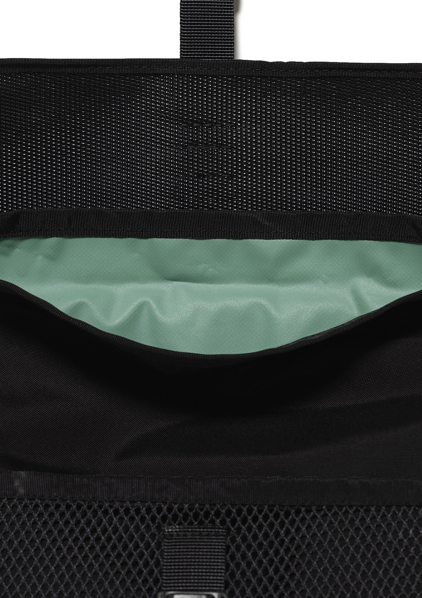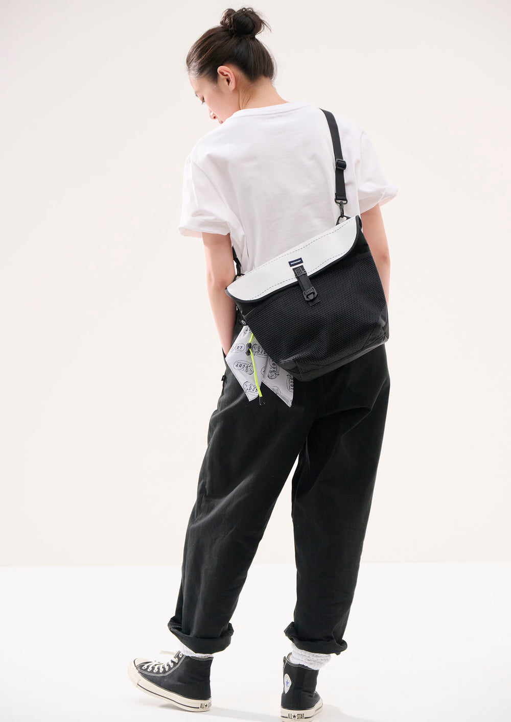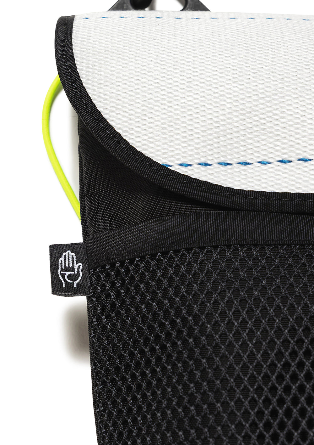 フラップに廃棄予定の消防ホースをリサイクルしたTAKE HANDS共同製作のパニエバッグ。自転車のキャリアに対応するフックとストラップを裏面に配し、ショルダーバッグとしても使用可能なストラップを備えた2WAY仕様。TAKE HANDSのピスネーム付き。