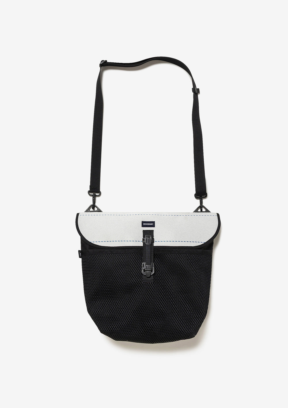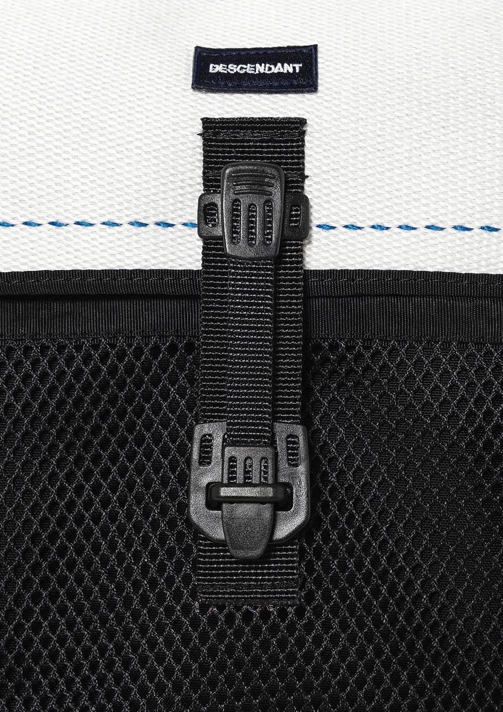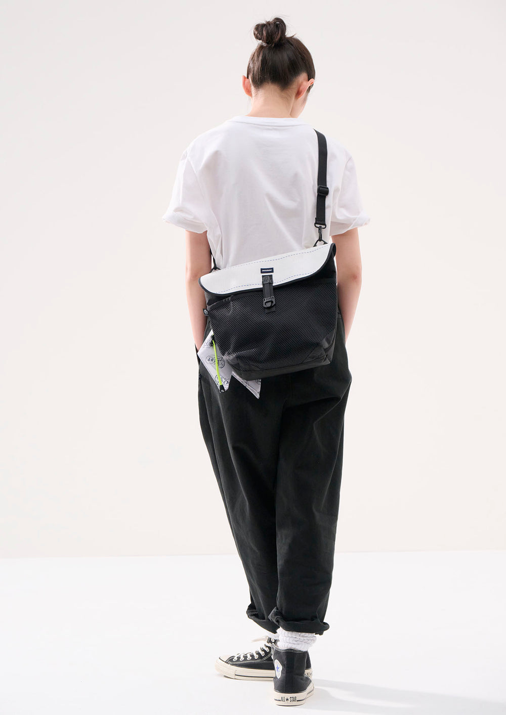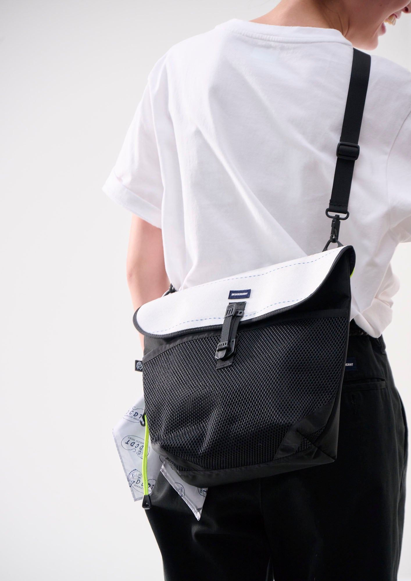 フラップに廃棄予定の消防ホースをリサイクルしたTAKE HANDS共同製作のパニエバッグ。自転車のキャリアに対応するフックとストラップを裏面に配し、ショルダーバッグとしても使用可能なストラップを備えた2WAY仕様。TAKE HANDSのピスネーム付き。