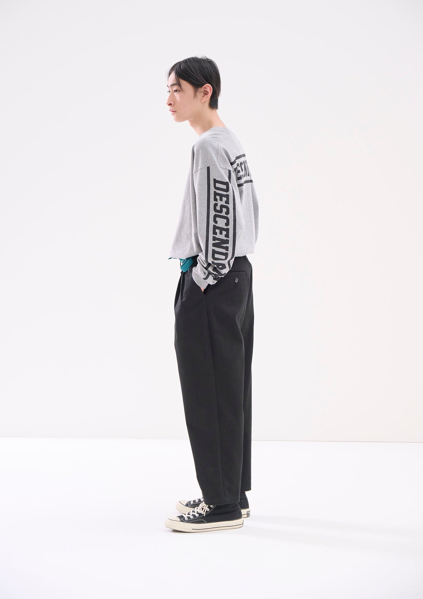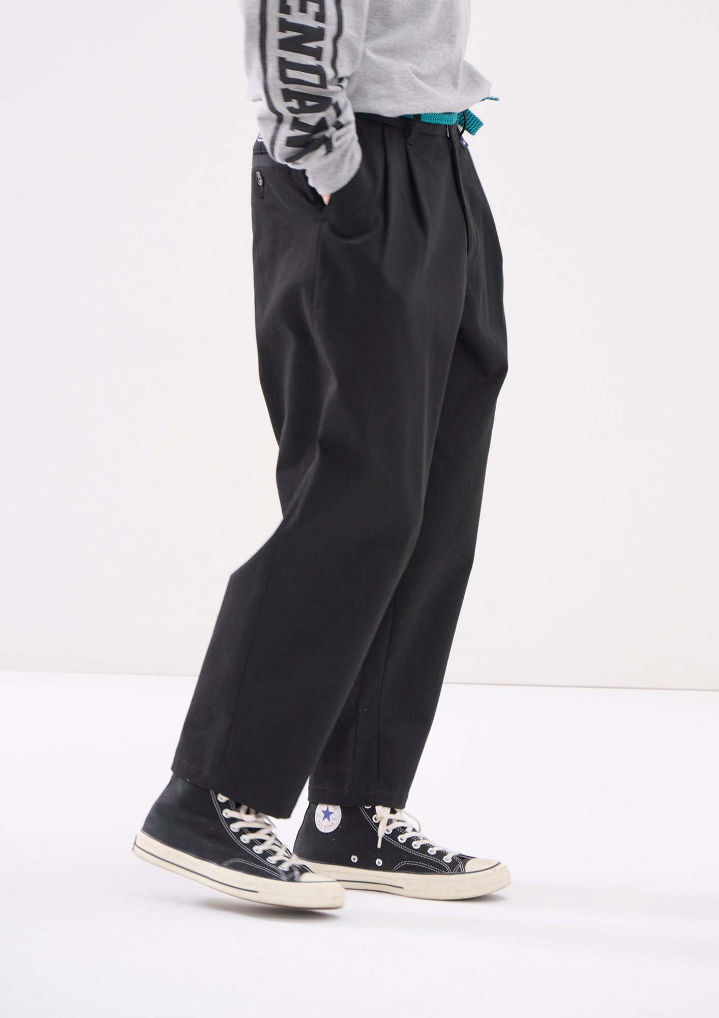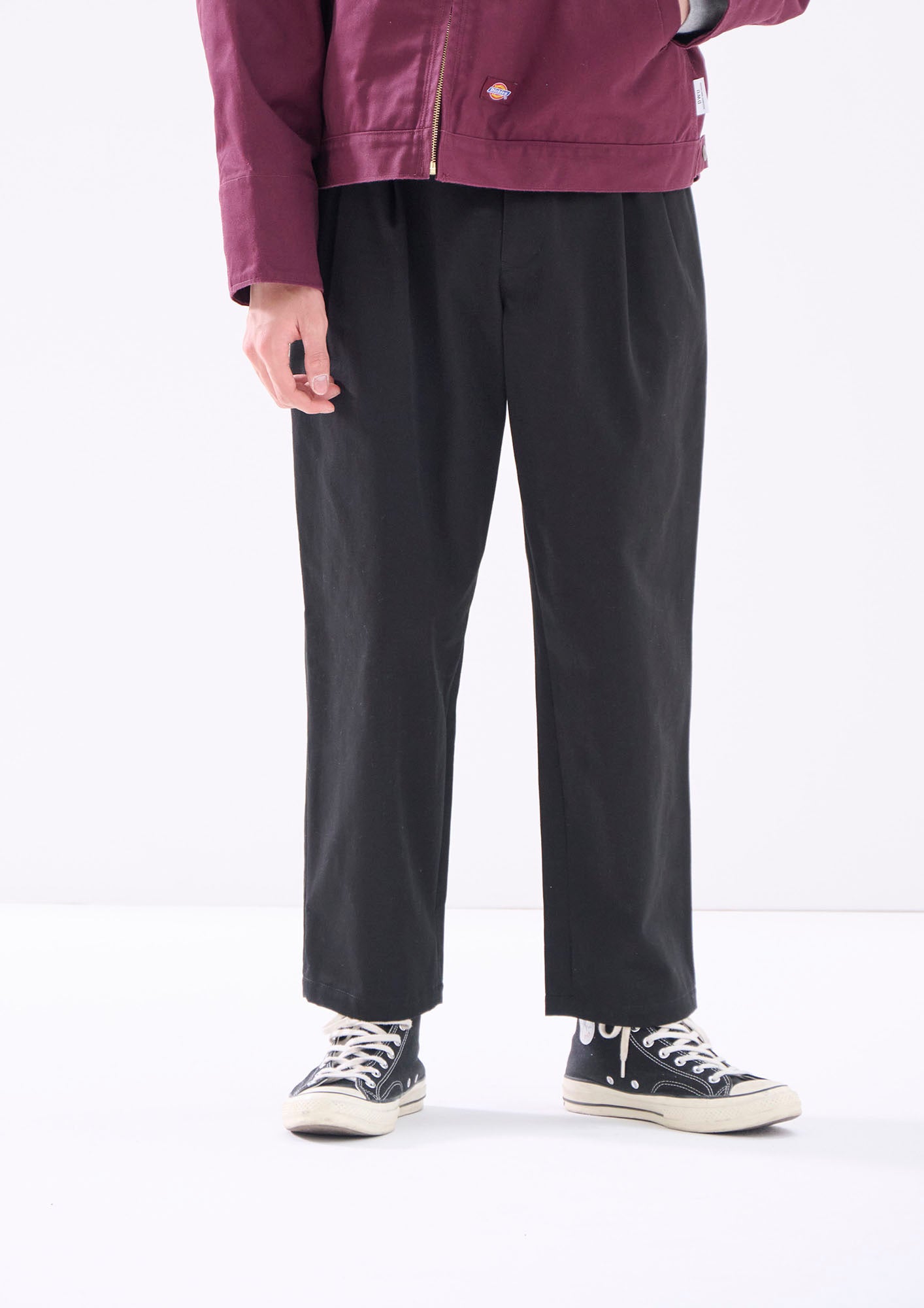 生地目の詰まったオーガニックコットンカツラギを使用したDC-3ツイルトラウザーズ。ツータックの腰回りから裾口へゆったりテーパードしたシルエット、斜め間口のサイドポケット及び片玉縁のヒップポケットを配し、背面にSPYHOPのパッチ、ベージュのみKhaKeeのピスネーム付き。腰帯のスレキには「DC-3 | Wide」及びベージュのみ「KhaKee」のプリント。