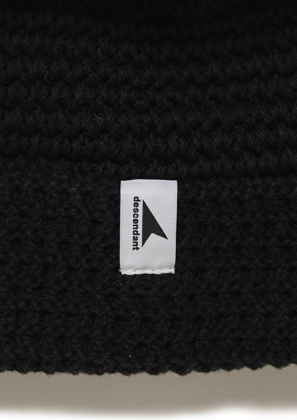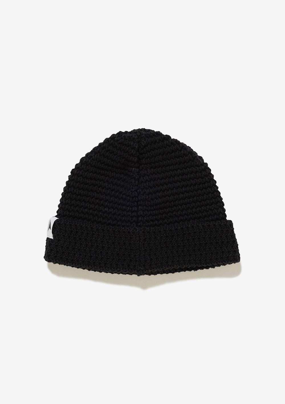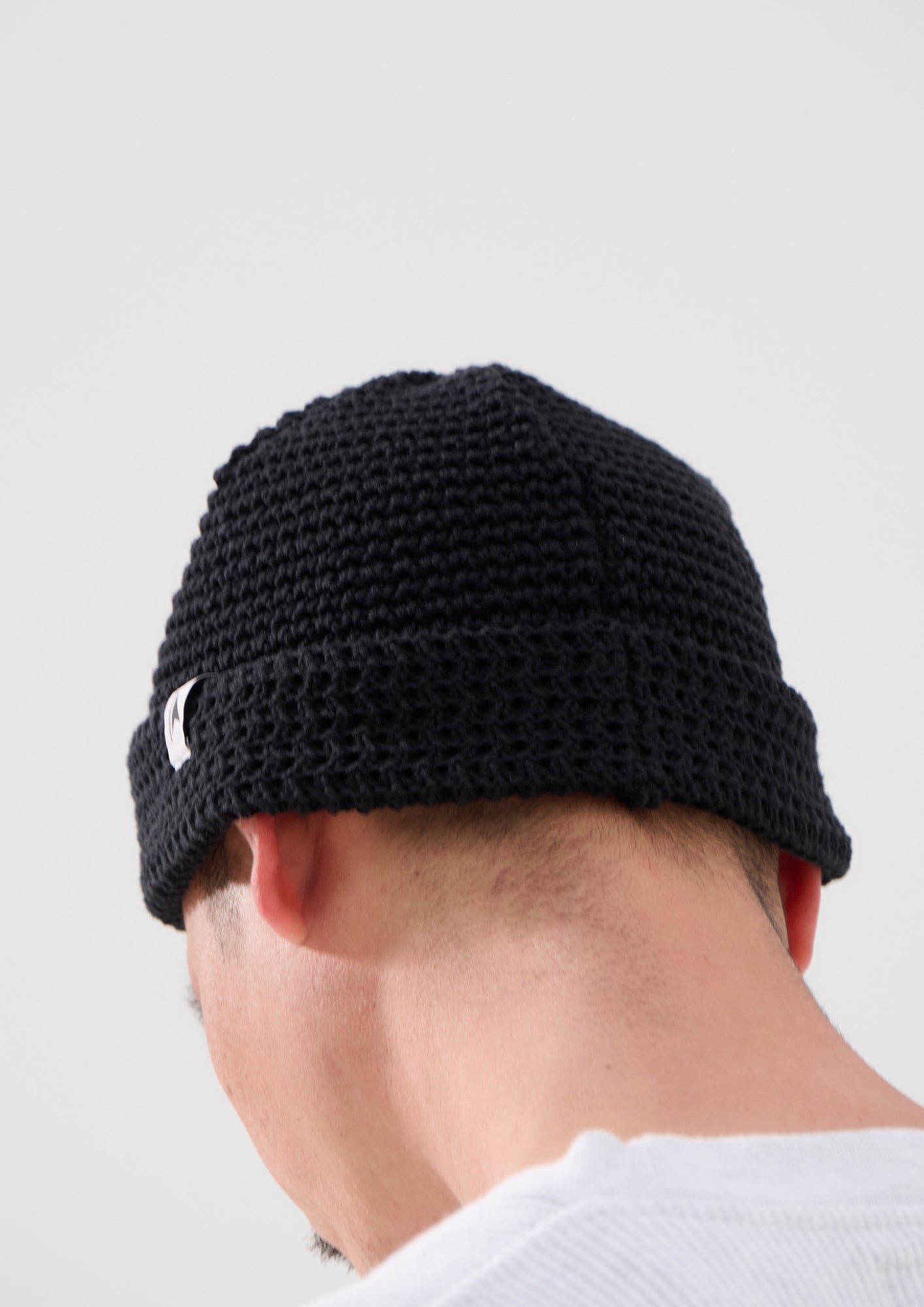 コットン糸をローゲージの畦編みしたニットビーニー。カフの側面にCETUSの織りネームを配したシンプルなデザイン。ブラックのみ展開。