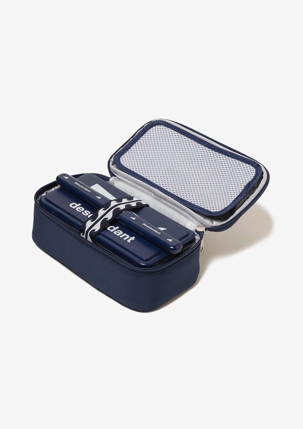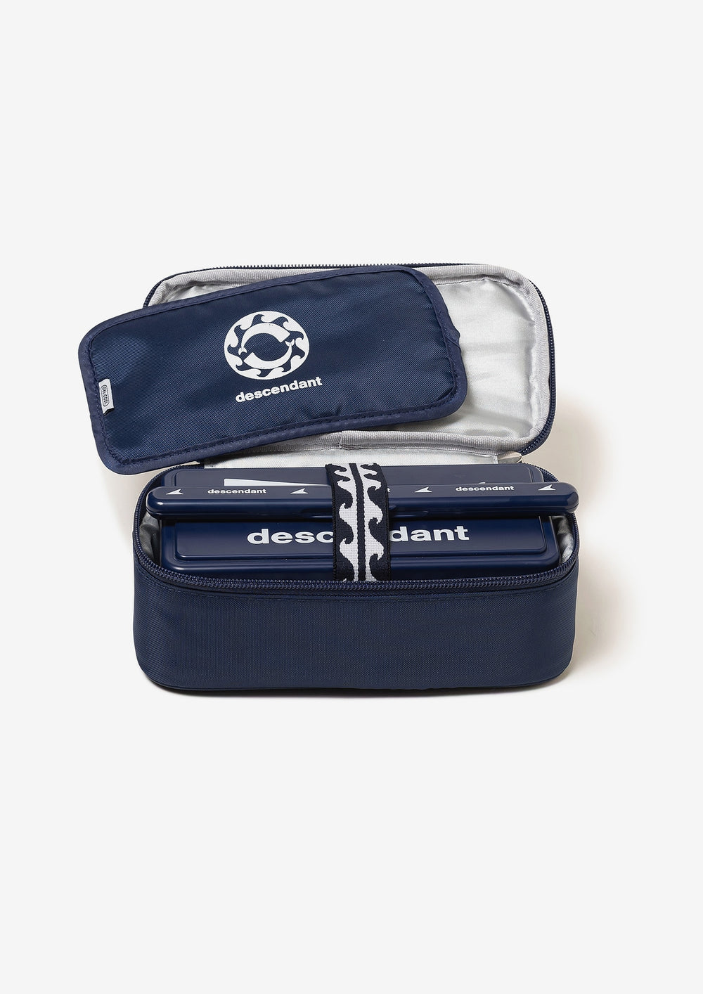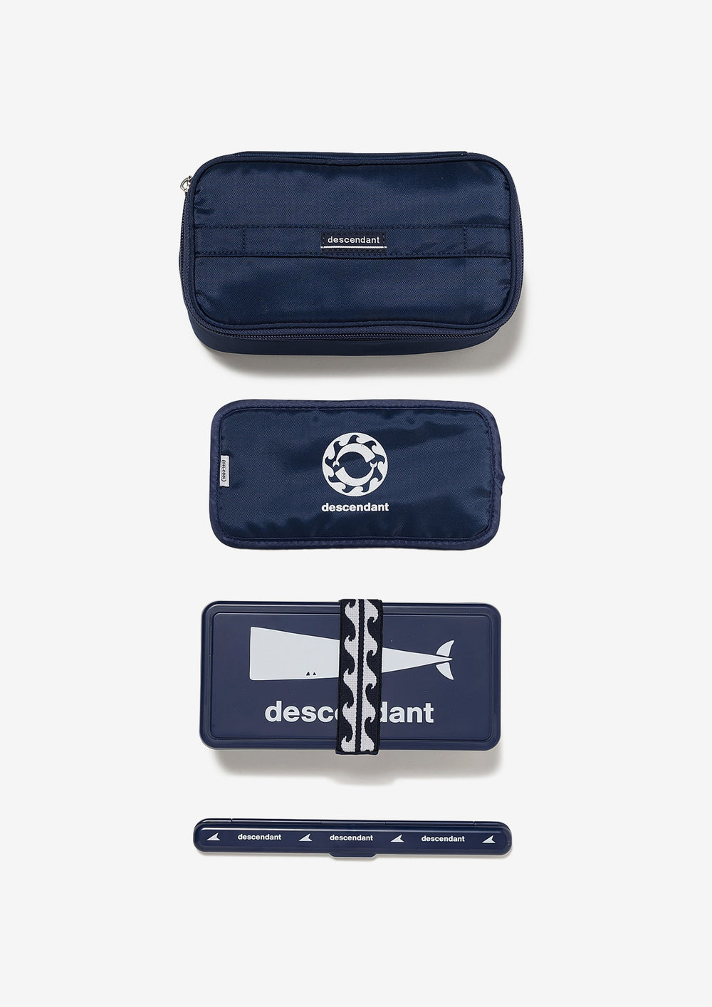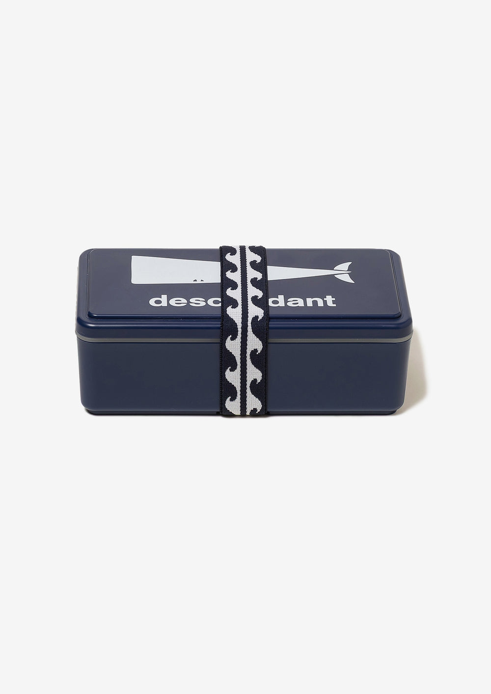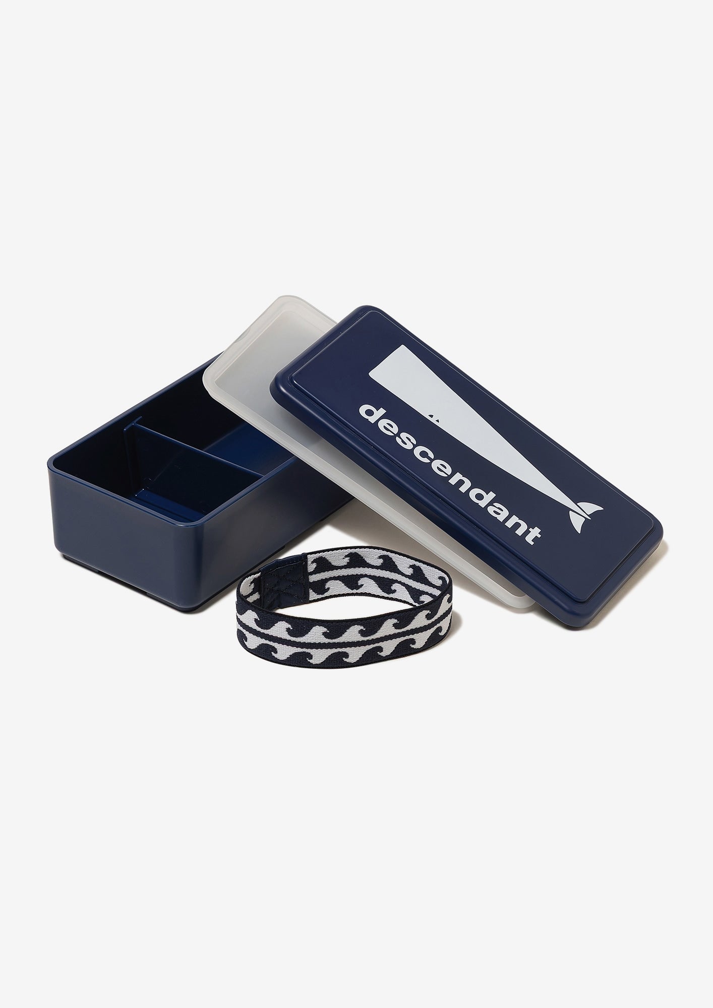 フタ裏に保冷剤を内蔵したGEL-COOL共同製作のランチボックスキット。フタの面にCACHALOTのグラフィック、ゴムバンドに波の模様のグラフィックをデザイン。HORIZONの織りネーム付き収納ケース、ケース入りの箸付き。